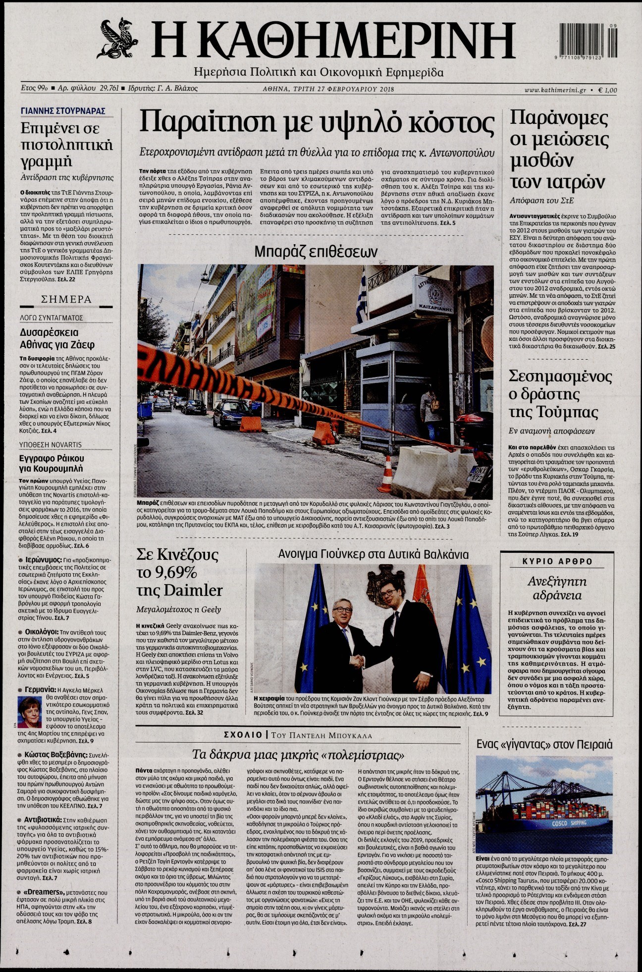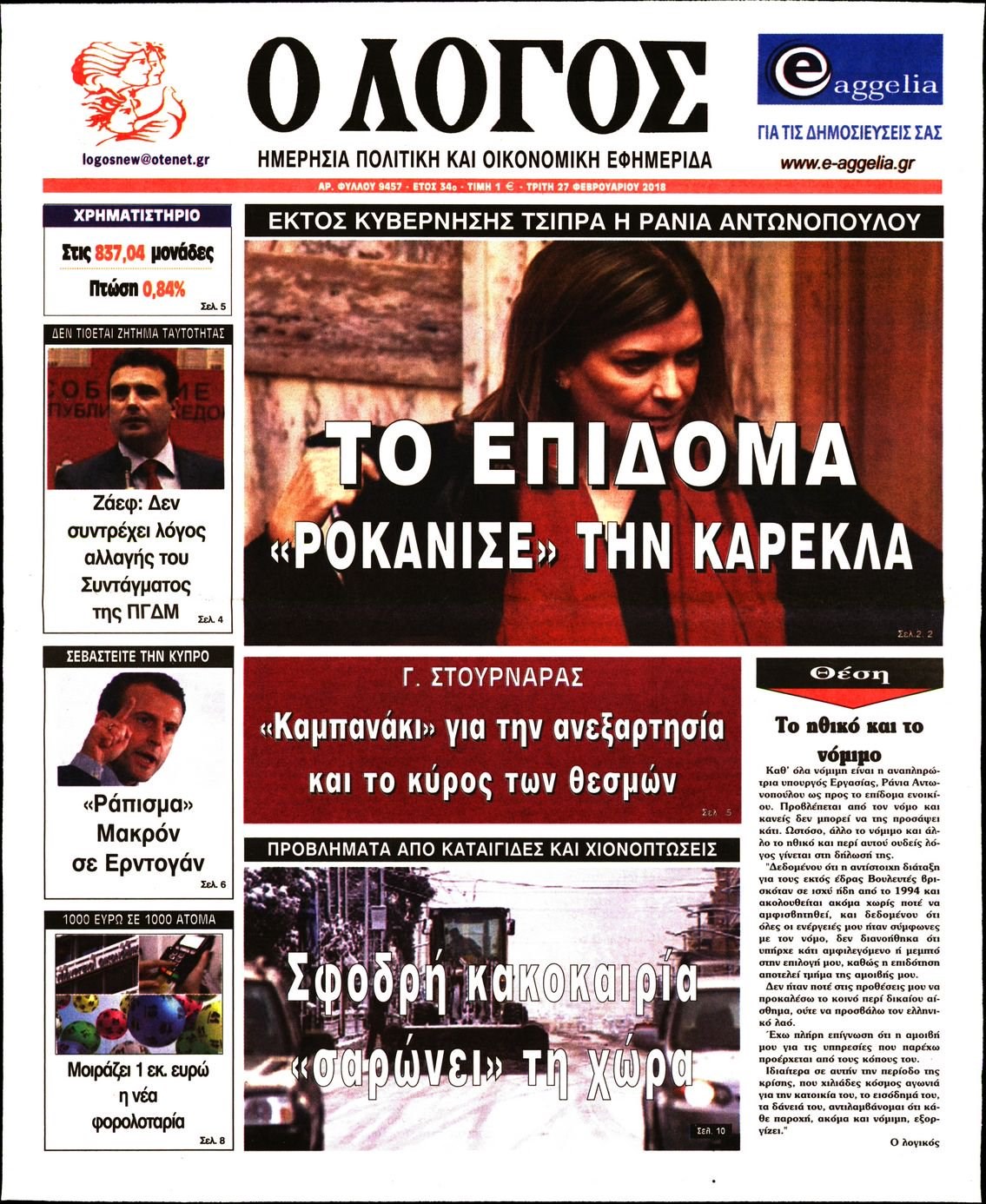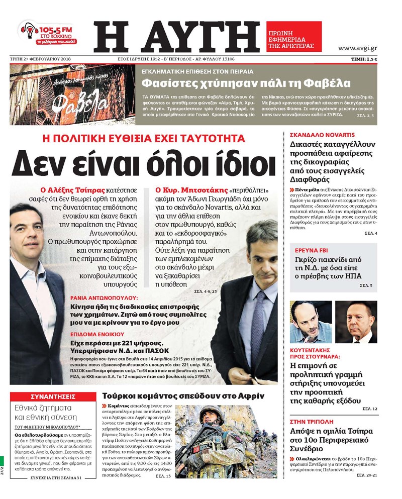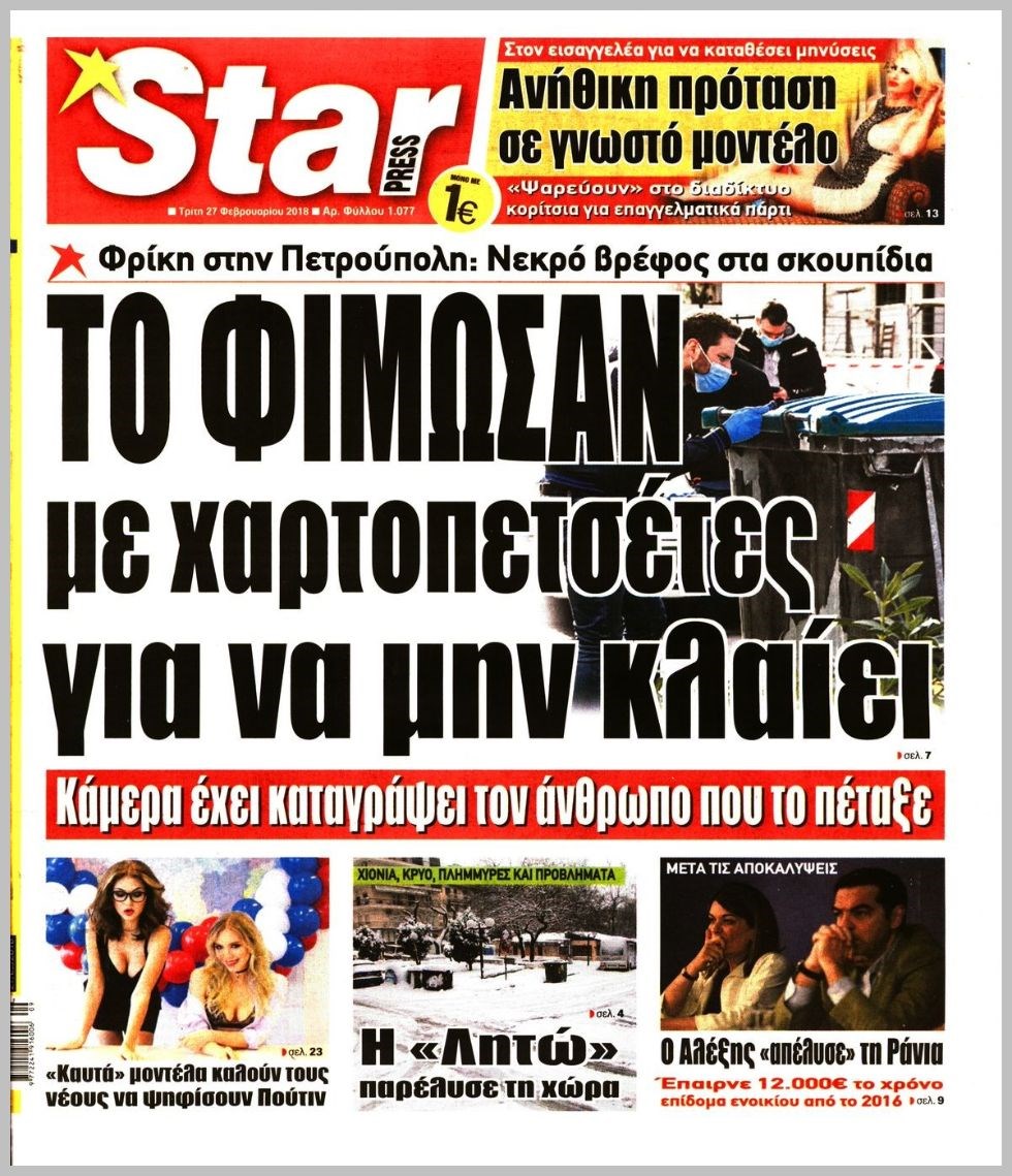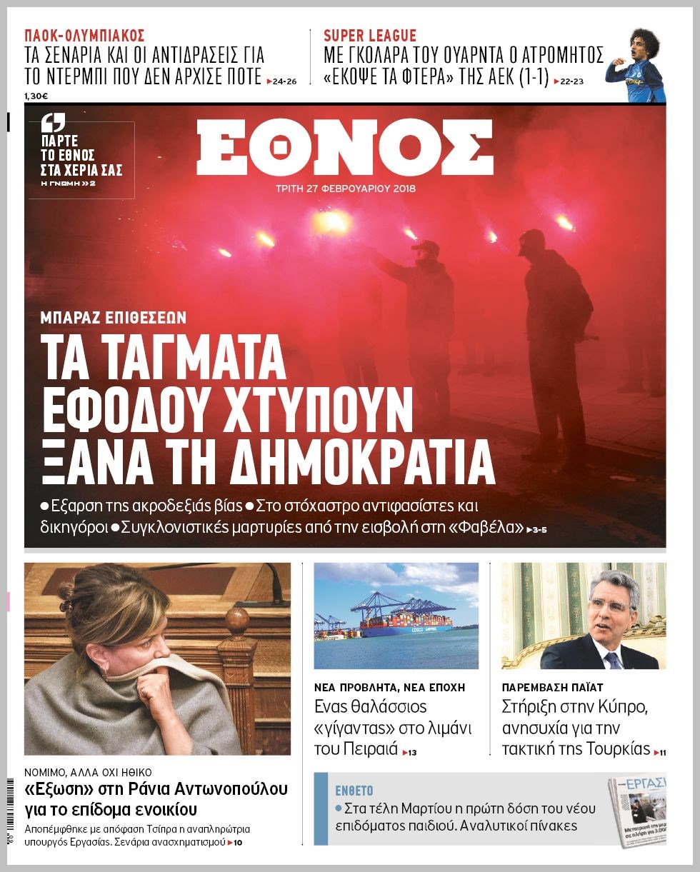 Οι πολιτικές εφημερίδες 27/2/2018 Κώστας Τεό 06:21, Τρίτη 27 Φεβρουαρίου 2018 Media Διαβάστε τα σημερινά πρωτοσέλιδα των πολιτικών εφημερίδων: ΠΟΛΙΤΙΚΕΣ ΕΦΗΜΕΡΙΔΕΣ ΠΡΩΤΟΣΕΛΙΔΑ Μοιράσου το: σχολίασε κι εσύ (0 σχόλια) Ακολουθήστε το enikos.gr στο Google News και μάθετε πρώτοι όλες τις ειδήσεις Δείτε όλες τις τελευταίες ειδήσεις από την Ελλάδα και τον Κόσμο στο enikos.gr Ειδήσεις Ροή Ειδήσεων 2 ώρες πριν Μπλόκα: Οι αγρότες σηκώνουν τις μπάρες σε διόδια για τους εκδρομείς των Χριστουγέννων και μοιράζουν προϊόντα – Βίντεο 2 ώρες πριν Τσιάρας προς αγρότες: Τα μπλόκα και τα πείσματα δεν ωφελούν – Οι λύσεις περνούν μέσα από τον διάλογο 3 ώρες πριν Αρχεία Έπσταϊν: Οι συγκλονιστικές φωτογραφίες – Ο Μάικλ Τζάκσον, ο Μικ Τζάγκερ και ο Κέβιν Σπέισι ανάμεσα στους διάσημους που απεικονίζονται 54 λεπτά πριν Μαθητές διακινούσαν κοκαΐνη και χασίς σε σχολείο της Αττικής – 12 συλλήψεις 60 λεπτά πριν Βέλγιο: Άγνωστοι έριξαν κόκκινη μπογιά στο προξενείο της Πολωνίας στις Βρυξέλλες 5 ώρες πριν Μία νέα «χρυσή» περίοδος αρχίζει για 3 ζώδια από σήμερα – «Μία αναπάντεχη ευκαιρία οδηγεί στην επιτυχία» 3 ώρες πριν Διαιτολόγος αποκαλύπτει 9 πρωινές συνήθειες που «λιώνουν» το κοιλιακό λίπος – «Υποστηρίζουν την υγιεινή απώλεια βάρους» 4 ώρες πριν Οι 7 φράσεις που δεν λένε ποτέ οι συναισθηματικά έξυπνοι άνθρωποι κατά τη διάρκεια ενός καβγά 6 ώρες πριν Enerwave: Το νέο «ρεύμα» στη λιανική ενέργειας που αλλάζει την εμπειρία του καταναλωτή 3 λεπτά πριν Μαρινάκης στον Realfm 97,8: Η κυβέρνηση σέβεται κάθε λογική διεκδίκηση των αγροτών, αλλά και το αίτημα των πολιτών να μην ταλαιπωρούνται 9 λεπτά πριν O Πάντερ MVP της 17ης αγωνιστικής στην Euroleague 18 λεπτά πριν Πέθανε η τραγουδίστρια Κλαούντια Ντελμέρ 25 λεπτά πριν Μία ανεκμετάλλευτη πηγή θα μπορούσε να προσφέρει ανεξάντλητη ενέργεια – Οι επιστήμονες ίσως γνωρίζουν πώς να την ξεκλειδώσουν 34 λεπτά πριν Θεσσαλονίκη: Ανήλικος που είχε εξαφανιστεί βρέθηκε στο σπίτι Τούρκων μετά από αστυνομική επιχείρηση ENIKOS NETWORK Η αποχή από την αναπαραγωγή παρατείνει τη ζωή στα ζώα, σύμφωνα με μελέτη – Τι ισχύει για τους ανθρώπους; Σημαντικές επαφές στις ΗΠΑ είχε ο υπουργός Υγείας Άδωνις Γεωργιάδης Ευλογιά αιγοπροβάτων: Παρατεταμένη επιζωοτία, αυστηρά μέτρα – Τι ισχύει για τον εμβολιασμό και την ανασύσταση του ζωικού κε... Τσιάρας προς αγρότες: Έχει ικανοποιηθεί το 74% των αιτημάτων – Τα μπλόκα και τα πείσματα δεν ωφελούν Χαρτογραφώντας το «σημείο χωρίς επιστροφή»: Για πρώτη φορά αποκαλύπτεται με λεπτομέρεια το ακανθώδες όριο της ατμόσφαιρας τ... Η Google καταργεί τη λειτουργία «dark web report» – Πώς θα μπορούν οι χρήστες να διαγράφουν τα δεδομένα τους περισσότερα 14:04 , Σάββατο 20 Δεκεμβρίου 2025 Η Realnews αυτής της Κυριακής (21/12/2025) Με τίτλο: «Ασπίδα προστασίας για την Ελλάδα» κυκλοφορεί, αυτήν την Κυριακή, η Realnews. Σημαντ... 12:53 , Σάββατο 20 Δεκεμβρίου 2025 Να μ’ αγαπάς: Το παρελθόν έρχεται στο φως – Καταιγιστικές εξελίξεις στα τελευταία επεισόδια του 2025 Ο Άγγελος αποκαλύπτεται, η Φωτεινή ανησυχεί για τον Λευτέρη και η Ζωή έρχεται αντιμέτωπη με το... 11:41 , Σάββατο 20 Δεκεμβρίου 2025 «Η αγάπη δεν χάνεται ποτέ»: Η μικρού μήκους ταινία κινουμένων σχεδίων που θέτει ερωτήματα για τη ζωή και τον θάνατο Ο θάνατος είναι ένα από τα πιο σκληρά θέματα που καλείται να διαχειριστεί κάποιος στη διάρκεια... 09:30 , Σάββατο 20 Δεκεμβρίου 2025 «Porto Leone: Στη γειτονιά με τα κόκκινα φανάρια» – Ο Χρόνης αποκαλύπτει στην Αλεξάνδρα το μυ