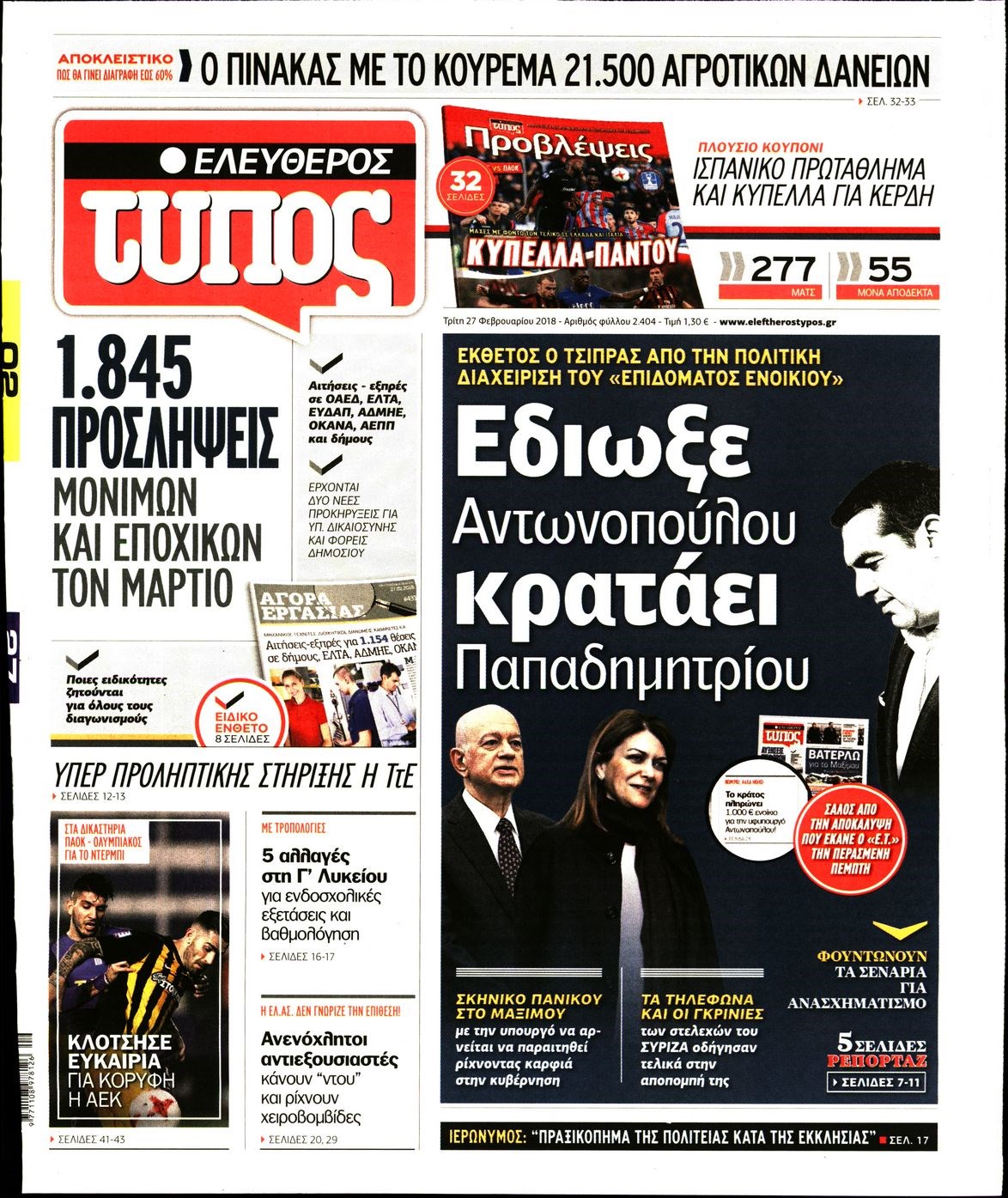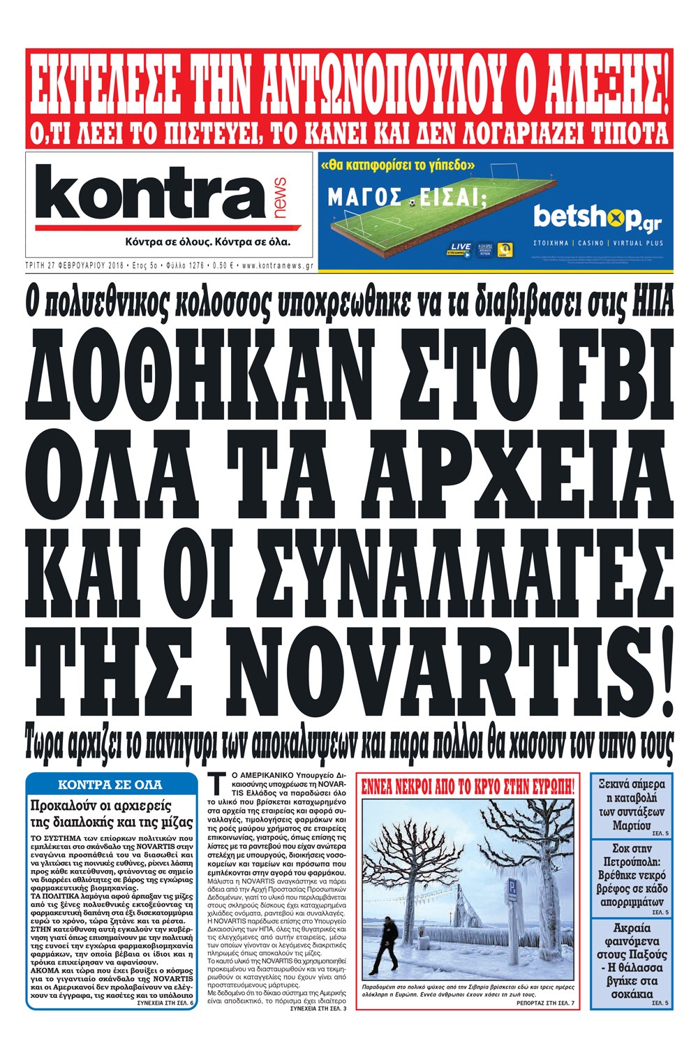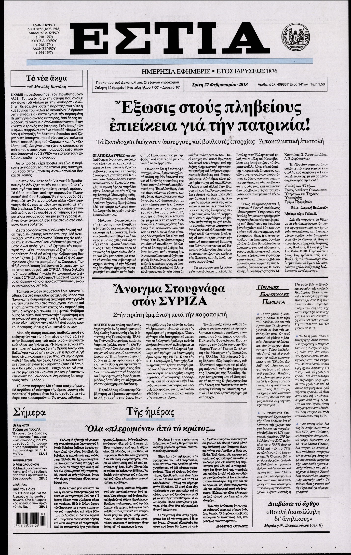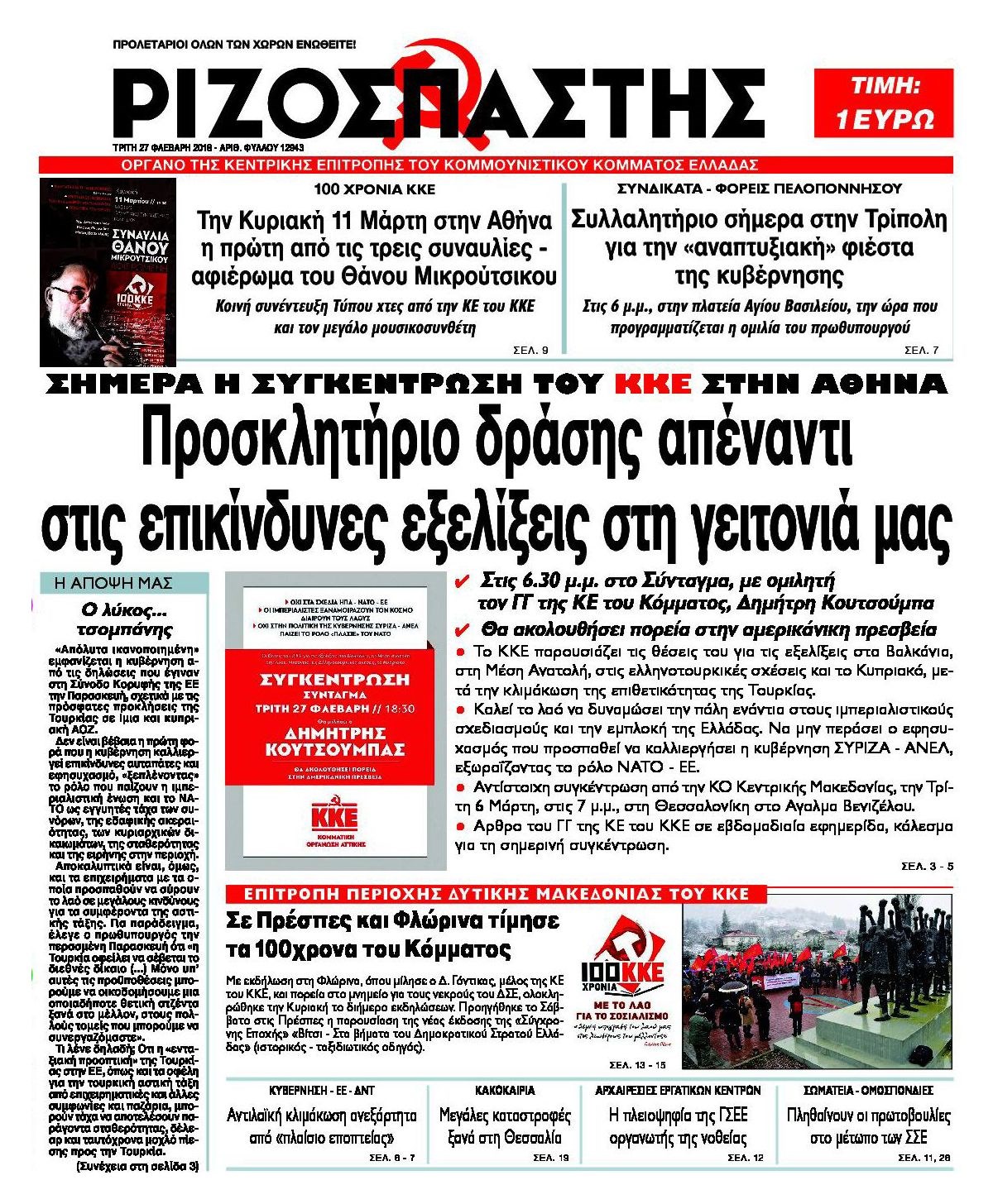 Οι πολιτικές εφημερίδες 27/2/2018 Κώστας Τεό 06:21, Τρίτη 27 Φεβρουαρίου 2018 Media Διαβάστε τα σημερινά πρωτοσέλιδα των πολιτικών εφημερίδων: ΠΟΛΙΤΙΚΕΣ ΕΦΗΜΕΡΙΔΕΣ ΠΡΩΤΟΣΕΛΙΔΑ Μοιράσου το: σχολίασε κι εσύ (0 σχόλια) Ακολουθήστε το enikos.gr στο Google News και μάθετε πρώτοι όλες τις ειδήσεις Δείτε όλες τις τελευταίες ειδήσεις από την Ελλάδα και τον Κόσμο στο enikos.gr Ειδήσεις Ροή Ειδήσεων 2 ώρες πριν Μπλόκα: Οι αγρότες σηκώνουν τις μπάρες σε διόδια για τους εκδρομείς των Χριστουγέννων και μοιράζουν προϊόντα – Βίντεο 2 ώρες πριν Τσιάρας προς αγρότες: Τα μπλόκα και τα πείσματα δεν ωφελούν – Οι λύσεις περνούν μέσα από τον διάλογο 3 ώρες πριν Αρχεία Έπσταϊν: Οι συγκλονιστικές φωτογραφίες – Ο Μάικλ Τζάκσον, ο Μικ Τζάγκερ και ο Κέβιν Σπέισι ανάμεσα στους διάσημους που απεικονίζονται 54 λεπτά πριν Μαθητές διακινούσαν κοκαΐνη και χασίς σε σχολείο της Αττικής – 12 συλλήψεις 60 λεπτά πριν Βέλγιο: Άγνωστοι έριξαν κόκκινη μπογιά στο προξενείο της Πολωνίας στις Βρυξέλλες 5 ώρες πριν Μία νέα «χρυσή» περίοδος αρχίζει για 3 ζώδια από σήμερα – «Μία αναπάντεχη ευκαιρία οδηγεί στην επιτυχία» 3 ώρες πριν Διαιτολόγος αποκαλύπτει 9 πρωινές συνήθειες που «λιώνουν» το κοιλιακό λίπος – «Υποστηρίζουν την υγιεινή απώλεια βάρους» 4 ώρες πριν Οι 7 φράσεις που δεν λένε ποτέ οι συναισθηματικά έξυπνοι άνθρωποι κατά τη διάρκεια ενός καβγά 6 ώρες πριν Enerwave: Το νέο «ρεύμα» στη λιανική ενέργειας που αλλάζει την εμπειρία του καταναλωτή 3 λεπτά πριν Μαρινάκης στον Realfm 97,8: Η κυβέρνηση σέβεται κάθε λογική διεκδίκηση των αγροτών, αλλά και το αίτημα των πολιτών να μην ταλαιπωρούνται 9 λεπτά πριν O Πάντερ MVP της 17ης αγωνιστικής στην Euroleague 18 λεπτά πριν Πέθανε η τραγουδίστρια Κλαούντια Ντελμέρ 25 λεπτά πριν Μία ανεκμετάλλευτη πηγή θα μπορούσε να προσφέρει ανεξάντλητη ενέργεια – Οι επιστήμονες ίσως γνωρίζουν πώς να την ξεκλειδώσουν 34 λεπτά πριν Θεσσαλονίκη: Ανήλικος που είχε εξαφανιστεί βρέθηκε στο σπίτι Τούρκων μετά από αστυνομική επιχείρηση ENIKOS NETWORK Η αποχή από την αναπαραγωγή παρατείνει τη ζωή στα ζώα, σύμφωνα με μελέτη – Τι ισχύει για τους ανθρώπους; Σημαντικές επαφές στις ΗΠΑ είχε ο υπουργός Υγείας Άδωνις Γεωργιάδης Ευλογιά αιγοπροβάτων: Παρατεταμένη επιζωοτία, αυστηρά μέτρα – Τι ισχύει για τον εμβολιασμό και την ανασύσταση του ζωικού κε... Τσιάρας προς αγρότες: Έχει ικανοποιηθεί το 74% των αιτημάτων – Τα μπλόκα και τα πείσματα δεν ωφελούν Χαρτογραφώντας το «σημείο χωρίς επιστροφή»: Για πρώτη φορά αποκαλύπτεται με λεπτομέρεια το ακανθώδες όριο της ατμόσφαιρας τ... Η Google καταργεί τη λειτουργία «dark web report» – Πώς θα μπορούν οι χρήστες να διαγράφουν τα δεδομένα τους περισσότερα 14:04 , Σάββατο 20 Δεκεμβρίου 2025 Η Realnews αυτής της Κυριακής (21/12/2025) Με τίτλο: «Ασπίδα προστασίας για την Ελλάδα» κυκλοφορεί, αυτήν την Κυριακή, η Realnews. Σημαντ... 12:53 , Σάββατο 20 Δεκεμβρίου 2025 Να μ’ αγαπάς: Το παρελθόν έρχεται στο φως – Καταιγιστικές εξελίξεις στα τελευταία επεισόδια του 2025 Ο Άγγελος αποκαλύπτεται, η Φωτεινή ανησυχεί για τον Λευτέρη και η Ζωή έρχεται αντιμέτωπη με το... 11:41 , Σάββατο 20 Δεκεμβρίου 2025 «Η αγάπη δεν χάνεται ποτέ»: Η μικρού μήκους ταινία κινουμένων σχεδίων που θέτει ερωτήματα για τη ζωή και τον θάνατο Ο θάνατος είναι ένα από τα πιο σκληρά θέματα που καλείται να διαχειριστεί κάποιος στη διάρκεια... 09:30 , Σάββατο 20 Δεκεμβρίου 2025 «Porto Leone: Στη γειτονιά με τα κόκκινα φανάρια» – Ο Χρόνης αποκαλύπτει στην Αλεξάνδρα το μυ
