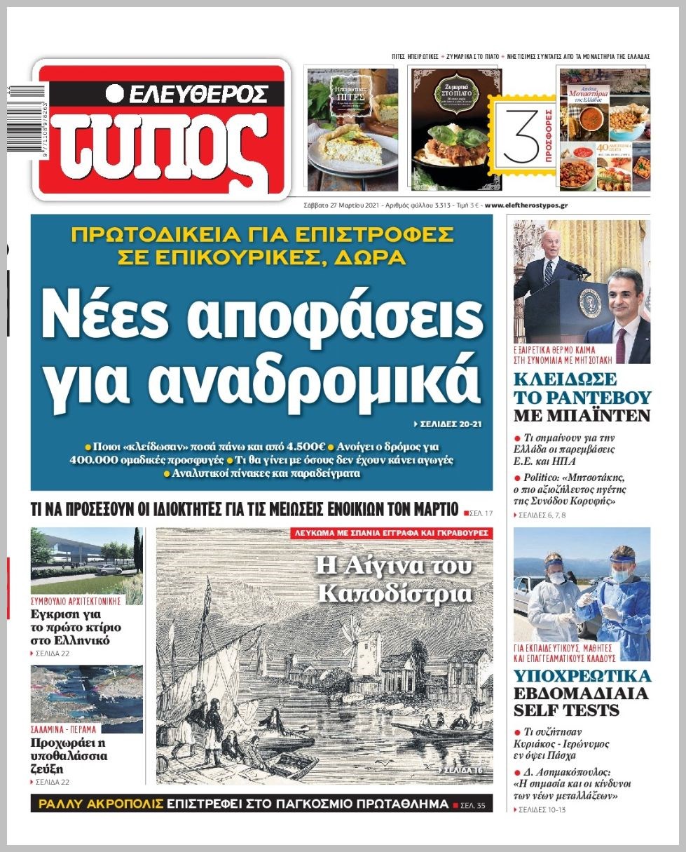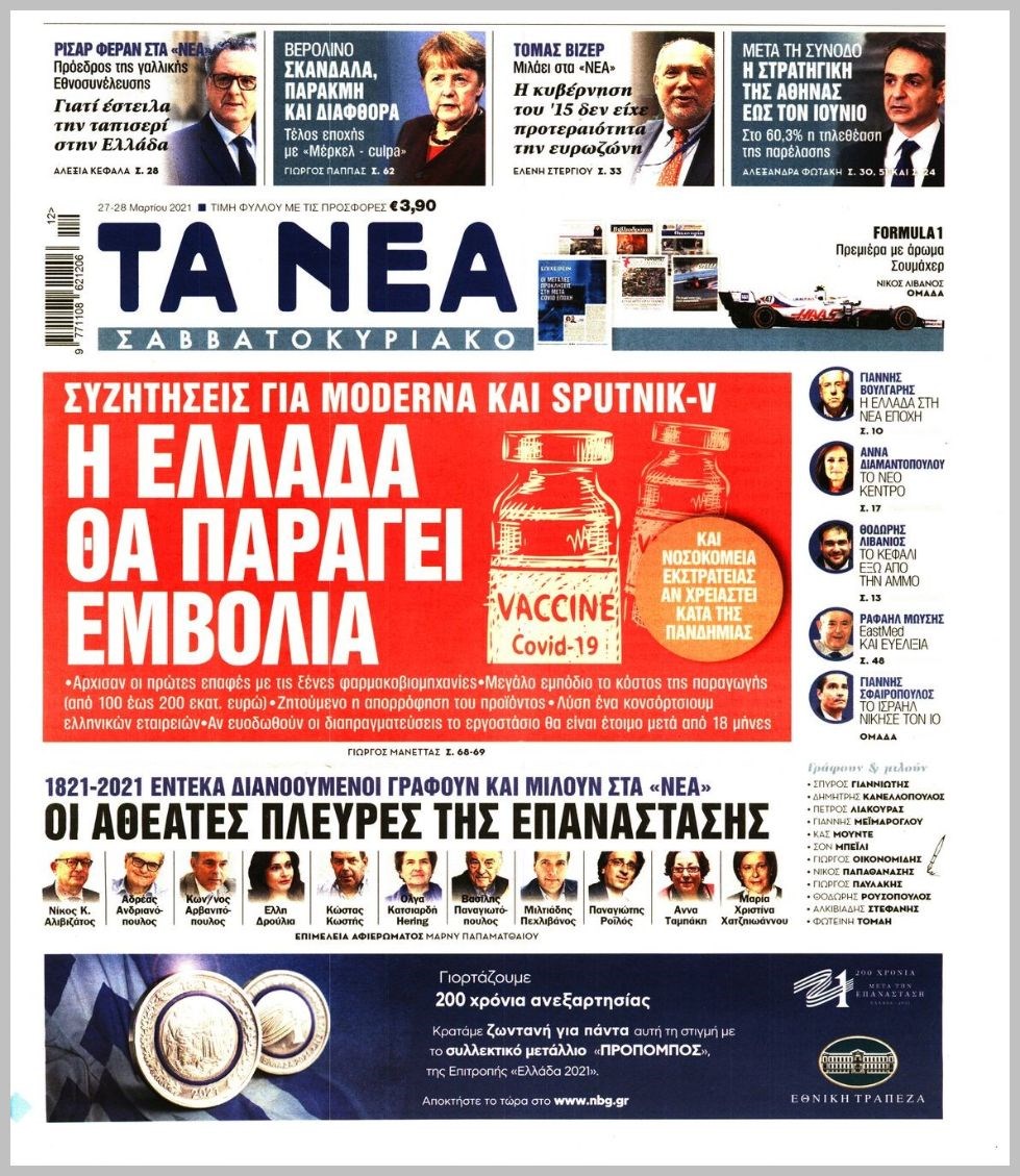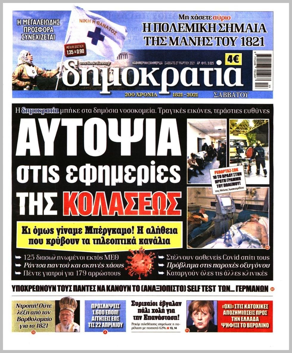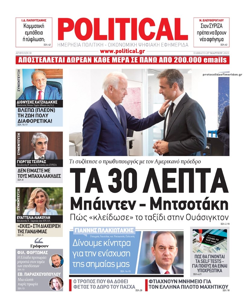 Οι πολιτικές εφημερίδες 27/3/2021 Διονύσης Νίκκας 07:13, Σάββατο 27 Μαρτίου 2021 Media Διαβάστε τα πρωτοσέλιδα των πολιτικών εφημερίδων… ΕΦΗΜΕΡΙΔΕΣ ΠΡΩΤΟΣΕΛΙΔΑ Μοιράσου το: σχολίασε κι εσύ (0 σχόλια) Ακολουθήστε το enikos.gr στο Google News και μάθετε πρώτοι όλες τις ειδήσεις Δείτε όλες τις τελευταίες ειδήσεις από την Ελλάδα και τον Κόσμο στο enikos.gr Ειδήσεις Ροή Ειδήσεων 4 ώρες πριν Υπόθεση Έπσταϊν: Το Υπουργείο Δικαιοσύνης δημοσιοποίησε μια σειρά από εξαιρετικά επεξεργασμένα αρχεία – «Λείπουν τα πιο σημαντικά έγγραφα», λένε οι Δημοκρατικοί 49 λεπτά πριν Γιορτές με μπλόκα για τους αγρότες: Ανοίγουν διόδια και μοιράζουν προϊόντα στους ταξιδιώτες 1 ώρα πριν Εξαφάνιση 33χρονου γιατρού στην Κρήτη: «Άναψα τα φώτα, τρόμαξε και άρχισε να τρέχει στα χωράφια» – Η τελευταία διαδρομή και η μαρτυρία «κλειδί» 3 ώρες πριν Ο «χάρτης» με τις αυξήσεις και τις φοροελαφρύνσεις του 2026 – Ποιοι και πόσα κερδίζουν 1 ώρα πριν Τα αρχεία του Έπσταϊν αποκαλύπτουν φωτογραφία του έκπτωτου πρίγκιπα Άντριου – Είναι ξαπλωμένος στην αγκαλιά 5 γυναικών 1 ώρα πριν Μία νέα «χρυσή» περίοδος αρχίζει για 3 ζώδια από σήμερα – «Μία αναπάντεχη ευκαιρία οδηγεί στην επιτυχία» 5 ώρες πριν Αυγά: Πόσα μπορείτε να τρώτε την ημέρα με ασφάλεια για μέγιστη πρόσληψη πρωτεΐνης 3 ώρες πριν Αρχαιολόγοι ανακάλυψαν σε χωράφι απεικόνιση 600 ετών ενός Αγίου – Τα στοιχεία που δείχνουν ότι μαρτύρησε 2 ώρες πριν Αγχώνεται για το χριστουγεννιάτικο δώρο που πήρε στην πλούσια σύντροφό του – «Φοβάμαι πως θα το βρει φθηνιάρικο, φοράει βραχιόλια Cartier» 7 λεπτά πριν Τα Labubu «μετακομίζουν» στο Χόλιγουντ: Η Sony Pictures ετοιμάζει live-action ταινία με τον σκηνοθέτη του «Wonka» 14 λεπτά πριν Νέες ταυτότητες: Μεγάλη αναμονή για ραντεβού στην Αττική – Τέλος τα ταξίδια εκτός Ελλάδος από τον Αύγουστο για όσους δεν έχουν αλλάξει 23 λεπτά πριν Οι 7 φράσεις που δεν λένε ποτέ οι συναισθηματικά έξυπνοι άνθρωποι κατά τη διάρκεια ενός καβγά 26 λεπτά πριν Τηλεθέαση (19/12): Ανατροπές και πρωτιές στην πρωινή ζώνη 34 λεπτά πριν Πώς η κλιματική αλλαγή επηρεάζει εγκύους και βρέφη – Οι επιπτώσεις των υψηλών θερμοκρασιών ENIKOS NETWORK Είστε μόνιμα απρόσεκτοι; 3 σημάδια που δείχνουν ότι μπορεί να είναι σύμπτωμα πάθησης Πόσα κιλά παίρνουμε πραγματικά τα Χριστούγεννα, σύμφωνα με την επιστήμη – Πώς να το αποτρέψουμε; e-ΕΦΚΑ και ΔΥΠΑ: Έρχονται νέες πληρωμές έως τις 24 Δεκεμβρίου – Ποιοι πάνε ταμείο Επίδομα παιδιού: Τι αλλάζει από το 2026 – Το όφελος από τις φορολογικές ελαφρύνσεις Χαρτογραφώντας το «σημείο χωρίς επιστροφή»: Για πρώτη φορά αποκαλύπτεται με λεπτομέρεια το ακανθώδες όριο της ατμόσφαιρας τ... Η Google καταργεί τη λειτουργία «dark web report» – Πώς θα μπορούν οι χρήστες να διαγράφουν τα δεδομένα τους περισσότερα 09:30 , Σάββατο 20 Δεκεμβρίου 2025 «Porto Leone: Στη γειτονιά με τα κόκκινα φανάρια» – Ο Χρόνης αποκαλύπτει στην Αλεξάνδρα το μυστικό για το παιδί της Λένας Η μεγάλη δραματική σειρά του Apha «Porto Leone: Στη γειτονιά με τα κόκκινα φανάρια» μας μεταφέ... 08:14 , Σάββατο 20 Δεκεμβρίου 2025 Τρομεροί γονείς: Η Μαρία Καβογιάννη εισβάλλει στο σπίτι της οικογένειας Στεφανίδη Όσα θα δούμε στο νέο διπλό επεισόδιο της σειράς «Τρομεροί γονείς», σήμερα Σάββατο 20 Δεκεμβρίο... 05:48 , Σάββατο 20 Δεκεμβρίου 2025 Οι οικονομικές εφημερίδες 20/12/2025 Διαβάστε τα πρωτοσέλιδα από τις οικονομικές εφημερίδες, σήμερα 20/12/2025. 05:43 , Σάββατο 20 Δεκεμβρίου 2025 Οι αθλητικές εφημερίδες 20/12/2025 Διαβάστε τα πρωτοσέλιδα από τις αθλητι