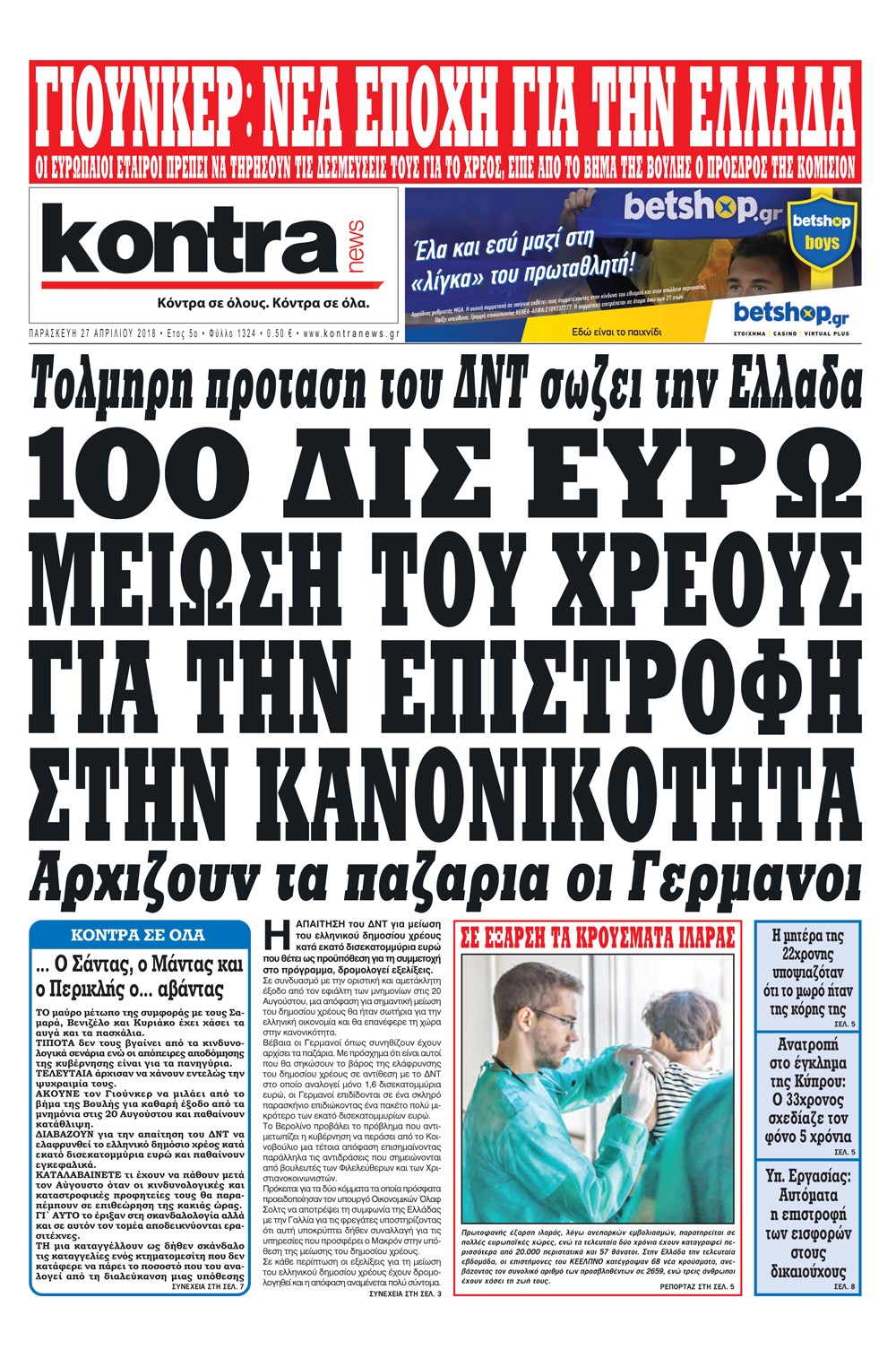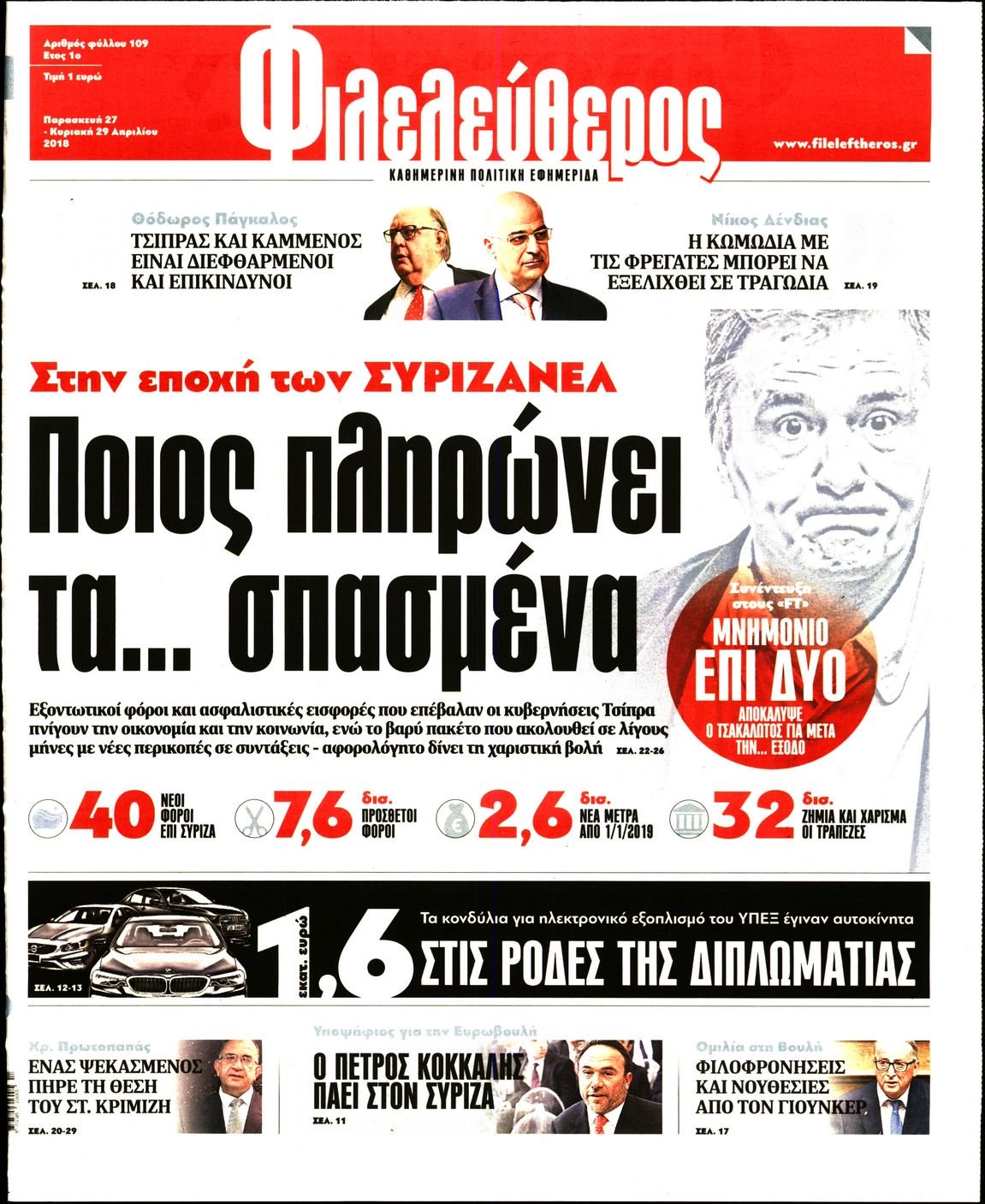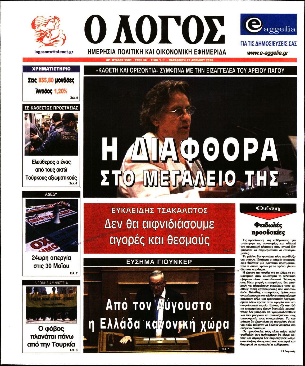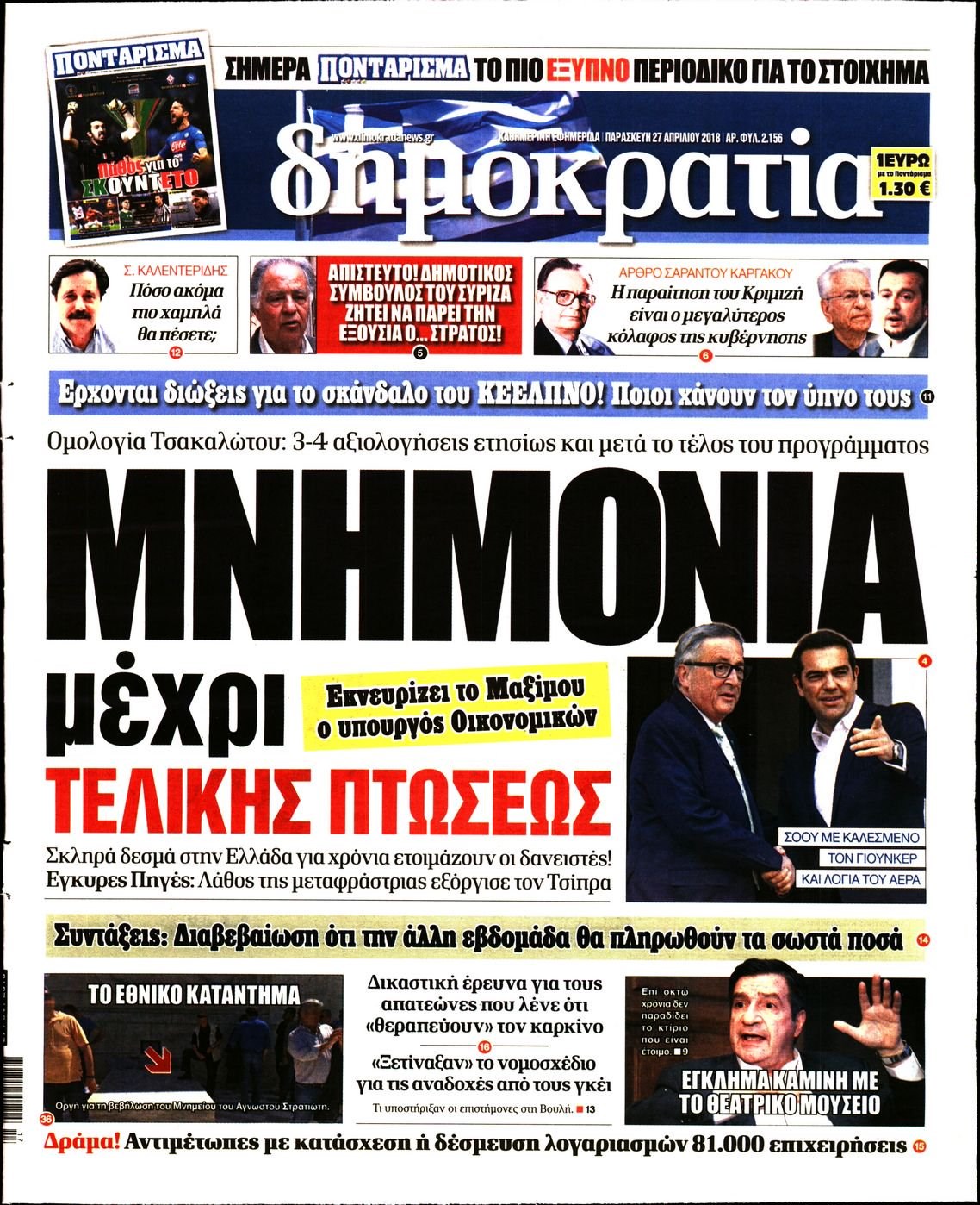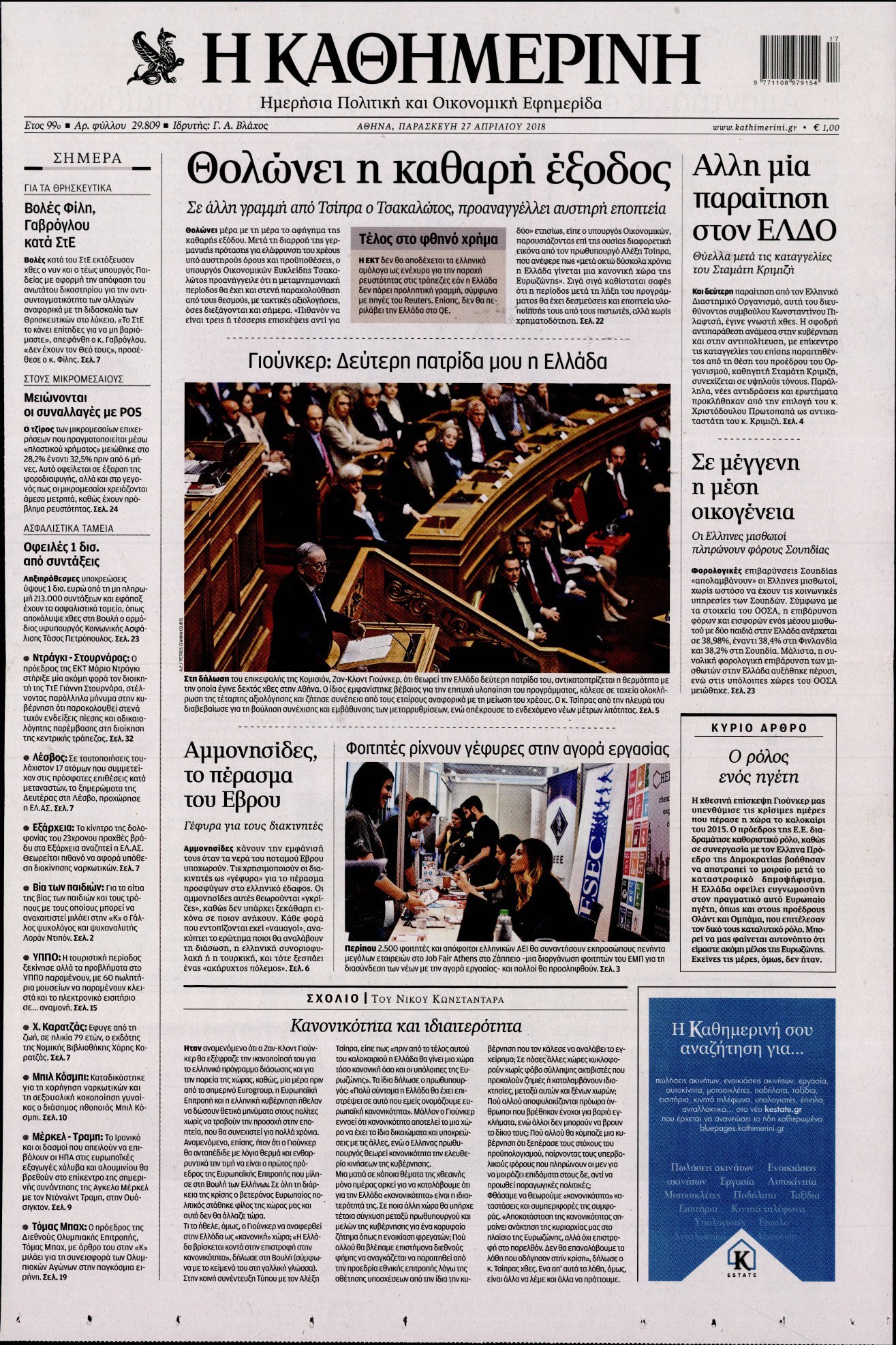 Οι πολιτικές εφημερίδες 27/4/2018 Enikos Newsroom 07:32, Παρασκευή 27 Απριλίου 2018 Media Διαβάστε τα σημερινά πρωτοσέλιδα των πολιτικών εφημερίδων: ΠΟΛΙΤΙΚΕΣ ΕΦΗΜΕΡΙΔΕΣ ΠΡΩΤΟΣΕΛΙΔΑ Μοιράσου το: σχολίασε κι εσύ (0 σχόλια) Ακολουθήστε το enikos.gr στο Google News και μάθετε πρώτοι όλες τις ειδήσεις Δείτε όλες τις τελευταίες ειδήσεις από την Ελλάδα και τον Κόσμο στο enikos.gr Ειδήσεις Ροή Ειδήσεων 1 ώρα πριν Πώς δρούσε το κύκλωμα που διακινούσε ναρκωτικά σε σχολεία – Υπέβαλαν σε βασανιστήρια όσους δεν τηρούσαν τους «κανόνες πειθαρχίας» 2 ώρες πριν Αγρότες: Γιορτές στα μπλόκα με ανοιχτά διόδια – Δικογραφία στα Ιωάννινα για το σήκωμα των μπαρών 6 ώρες πριν Αρχεία Έπσταϊν: Οι συγκλονιστικές φωτογραφίες – Ο Μάικλ Τζάκσον, ο Μικ Τζάγκερ και ο Κέβιν Σπέισι ανάμεσα στους διάσημους που απεικονίζονται 40 λεπτά πριν NBC: Ο Νετανιάχου σχεδιάζει να ενημερώσει τον Τραμπ για πιθανά νέα πλήγματα εναντίον του Ιράν 49 λεπτά πριν Αττική: Εξαρθρώθηκε εγκληματική οργάνωση που έκλεβε οχήματα, τα παραποιούσε και τα μεταπωλούσε σε πολίτες – Πώς δρούσε το κύκλωμα 2 ώρες πριν Η τύχη χαμογελά σε 3 ζώδια έως τις 28 Δεκεμβρίου – «Προσέξτε τις επιλογές σας και η επιμονή σας θα ανταμειφθεί» 6 ώρες πριν Διαιτολόγος αποκαλύπτει 9 πρωινές συνήθειες που «λιώνουν» το κοιλιακό λίπος – «Υποστηρίζουν την υγιεινή απώλεια βάρους» 3 ώρες πριν Μία ανεκμετάλλευτη πηγή θα μπορούσε να προσφέρει ανεξάντλητη ενέργεια – Οι επιστήμονες ίσως γνωρίζουν πώς να την ξεκλειδώσουν 9 ώρες πριν Enerwave: Το νέο «ρεύμα» στη λιανική ενέργειας που αλλάζει την εμπειρία του καταναλωτή 4 λεπτά πριν Ερντογάν: «Δεν έχουμε βλέψεις στα εδάφη κανενός, αλλά δεν θα επιτρέψουμε να παραβιαστούν τα δικαιώματά μας» 13 λεπτά πριν Η Realnews στο www.pressreader.com 21 λεπτά πριν Νιούκαστλ – Τσέλσι 2-2: Αλύγιστοι οι Λονδρέζοι 31 λεπτά πριν Μικαέλα Μπέντχαους: Ο πρώτος άνθρωπος σε αναπηρικό αμαξίδιο που ταξίδεψε στο διάστημα – ΒΙΝΤΕΟ 40 λεπτά πριν NBC: Ο Νετανιάχου σχεδιάζει να ενημερώσει τον Τραμπ για πιθανά νέα πλήγματα εναντίον του Ιράν ENIKOS NETWORK Γιατί πρέπει να ζητάμε χάρες; Ποιο είναι το φαινόμενο Ben Franklin που κάνει τους άλλους να μας συμπαθούν Η αποχή από την αναπαραγωγή παρατείνει τη ζωή στα ζώα, σύμφωνα με μελέτη – Τι ισχύει για τους ανθρώπους; Τράπεζες: Πόσες ημέρες θα είναι κλειστές μέσα στις γιορτές Στα ύψη ο χρυσός – Νέο ρεκόρ στην τιμή της λίρας, πόσο πωλείται Χαρτογραφώντας το «σημείο χωρίς επιστροφή»: Για πρώτη φορά αποκαλύπτεται με λεπτομέρεια το ακανθώδες όριο της ατμόσφαιρας τ... Η Google καταργεί τη λειτουργία «dark web report» – Πώς θα μπορούν οι χρήστες να διαγράφουν τα δεδομένα τους περισσότερα 14:04 , Σάββατο 20 Δεκεμβρίου 2025 Η Realnews αυτής της Κυριακής (21/12/2025) Με τίτλο: «Ασπίδα προστασίας για την Ελλάδα» κυκλοφορεί, αυτήν την Κυριακή, η Realnews. Σημαντ... 12:53 , Σάββατο 20 Δεκεμβρίου 2025 Να μ’ αγαπάς: Το παρελθόν έρχεται στο φως – Καταιγιστικές εξελίξεις στα τελευταία επεισόδια του 2025 Ο Άγγελος αποκαλύπτεται, η Φωτεινή ανησυχεί για τον Λευτέρη και η Ζωή έρχεται αντιμέτωπη με το... 11:41 , Σάββατο 20 Δεκεμβρίου 2025 «Η αγάπη δεν χάνεται ποτέ»: Η μικρού μήκους ταινία κινουμένων σχεδίων που θέτει ερωτήματα για τη ζωή και τον θάνατο Ο θάνατος είναι ένα από τα πιο σκληρά θέματα που καλείται να διαχειριστεί κάποιος στη διάρκεια... 09:30 , Σάββατο 20 Δεκεμβρίου 2025 «Porto Leone: Στη γειτονιά με τα κόκκινα φανάρια» – Ο Χρόνης αποκαλύπτει στην Αλεξάνδρα το μυστικό για το παιδί της Λένας Η μεγάλη δραμ