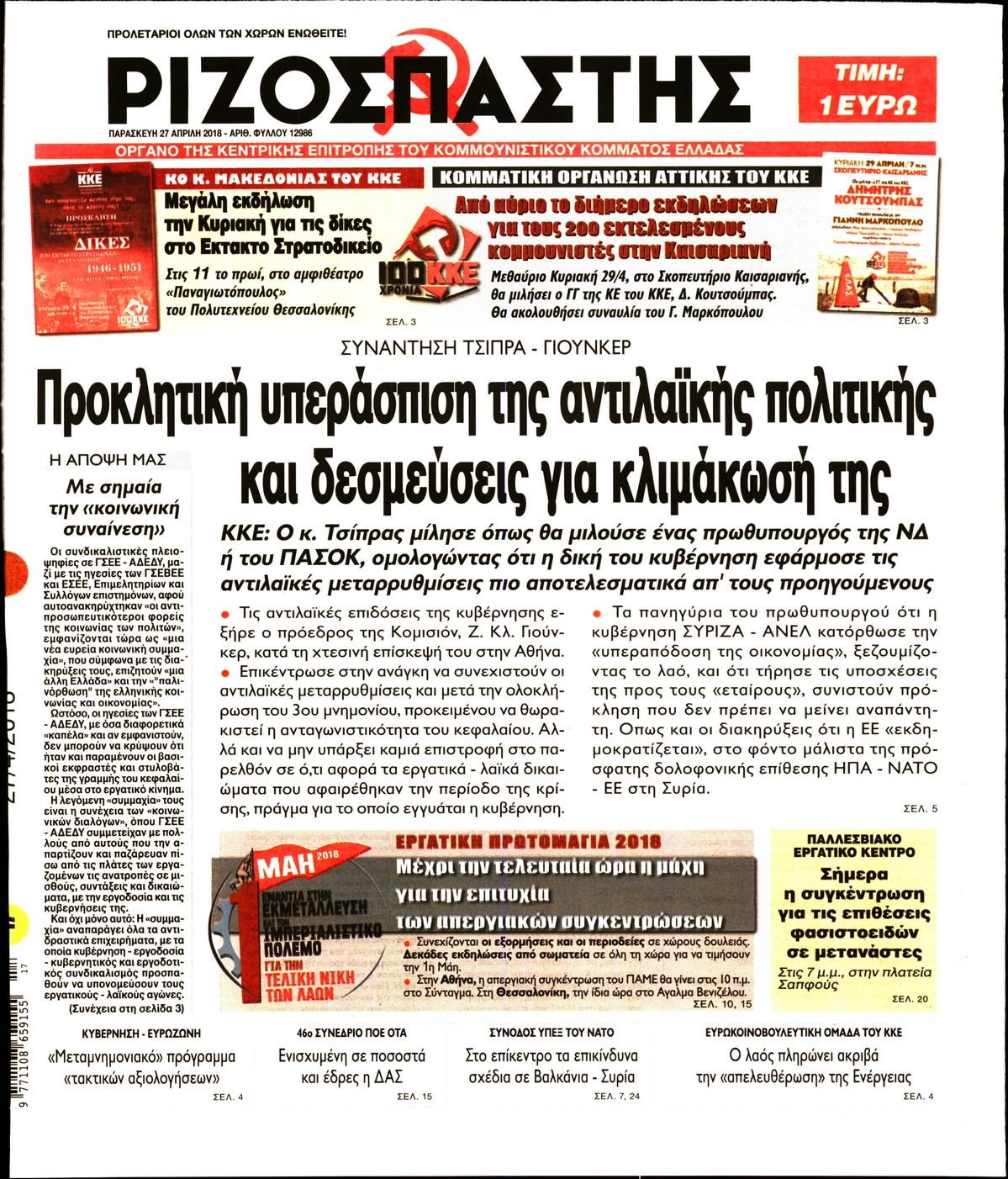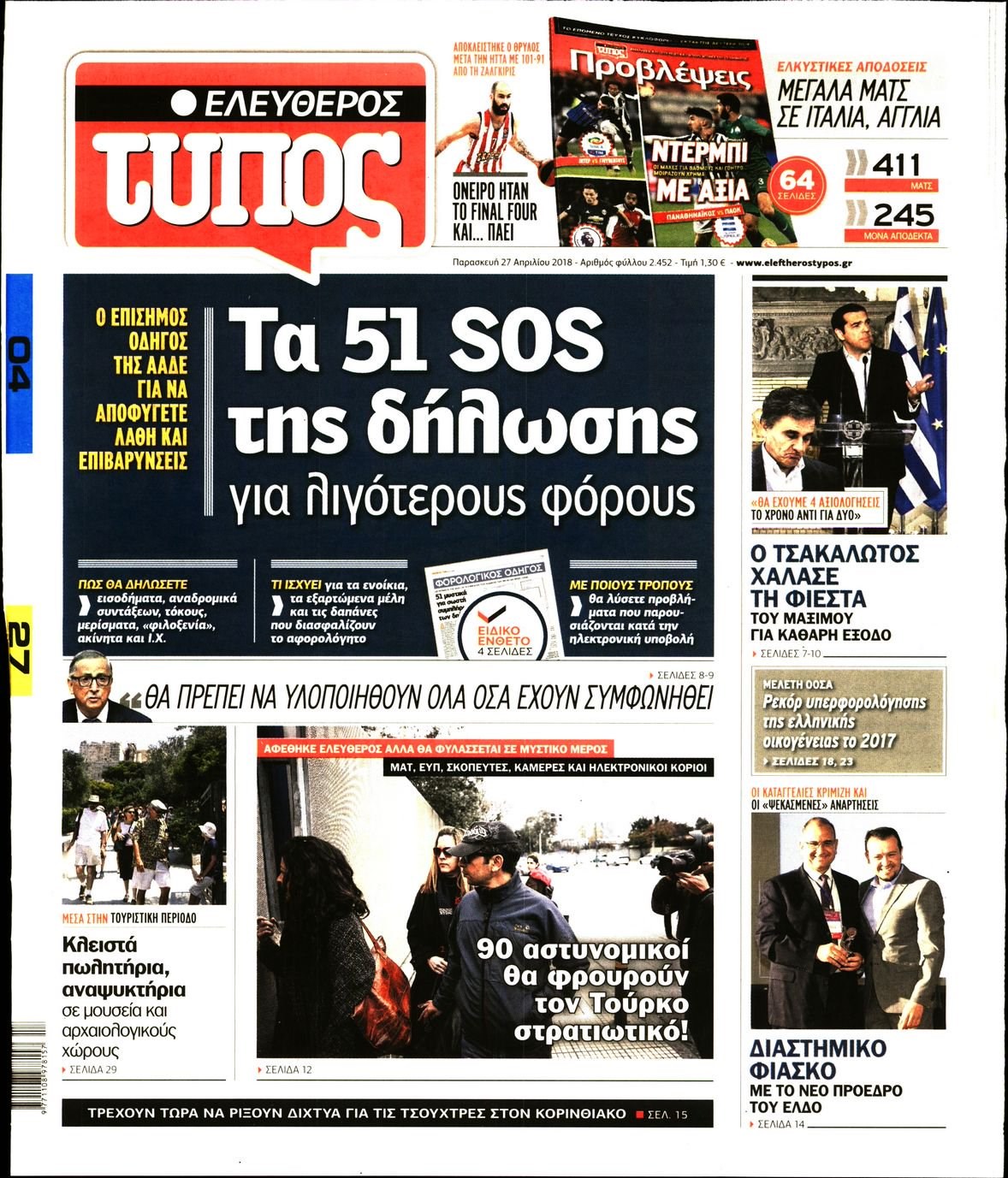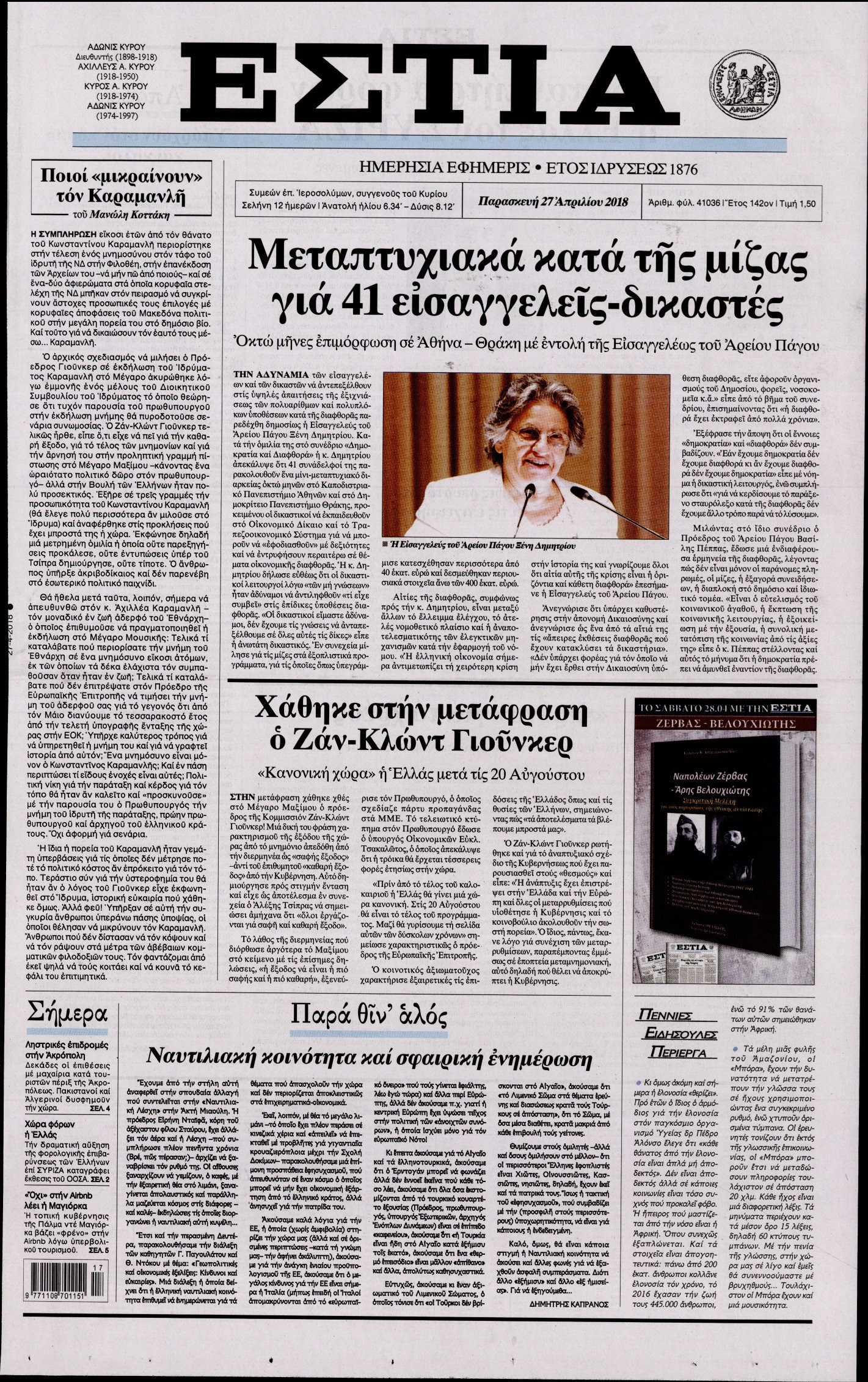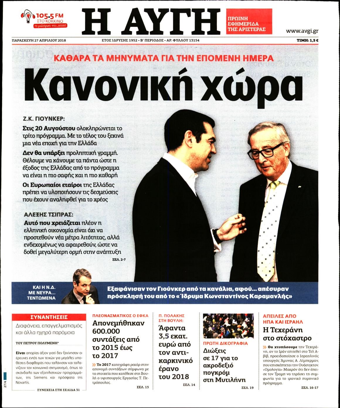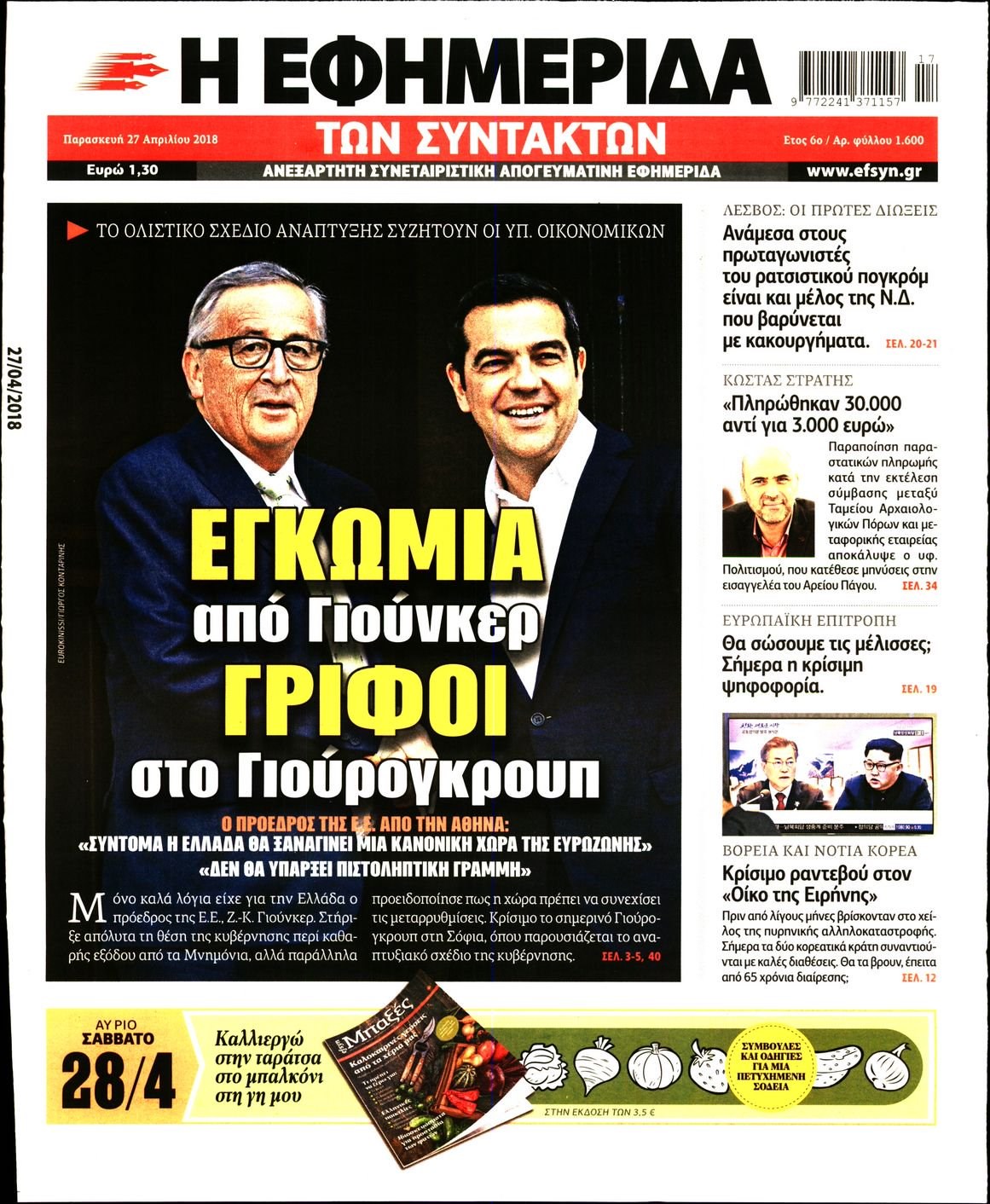 Οι πολιτικές εφημερίδες 27/4/2018 Enikos Newsroom 07:32, Παρασκευή 27 Απριλίου 2018 Media Διαβάστε τα σημερινά πρωτοσέλιδα των πολιτικών εφημερίδων: ΠΟΛΙΤΙΚΕΣ ΕΦΗΜΕΡΙΔΕΣ ΠΡΩΤΟΣΕΛΙΔΑ Μοιράσου το: σχολίασε κι εσύ (0 σχόλια) Ακολουθήστε το enikos.gr στο Google News και μάθετε πρώτοι όλες τις ειδήσεις Δείτε όλες τις τελευταίες ειδήσεις από την Ελλάδα και τον Κόσμο στο enikos.gr Ειδήσεις Ροή Ειδήσεων 1 ώρα πριν Πώς δρούσε το κύκλωμα που διακινούσε ναρκωτικά σε σχολεία – Υπέβαλαν σε βασανιστήρια όσους δεν τηρούσαν τους «κανόνες πειθαρχίας» 2 ώρες πριν Αγρότες: Γιορτές στα μπλόκα με ανοιχτά διόδια – Δικογραφία στα Ιωάννινα για το σήκωμα των μπαρών 6 ώρες πριν Αρχεία Έπσταϊν: Οι συγκλονιστικές φωτογραφίες – Ο Μάικλ Τζάκσον, ο Μικ Τζάγκερ και ο Κέβιν Σπέισι ανάμεσα στους διάσημους που απεικονίζονται 40 λεπτά πριν NBC: Ο Νετανιάχου σχεδιάζει να ενημερώσει τον Τραμπ για πιθανά νέα πλήγματα εναντίον του Ιράν 49 λεπτά πριν Αττική: Εξαρθρώθηκε εγκληματική οργάνωση που έκλεβε οχήματα, τα παραποιούσε και τα μεταπωλούσε σε πολίτες – Πώς δρούσε το κύκλωμα 2 ώρες πριν Η τύχη χαμογελά σε 3 ζώδια έως τις 28 Δεκεμβρίου – «Προσέξτε τις επιλογές σας και η επιμονή σας θα ανταμειφθεί» 6 ώρες πριν Διαιτολόγος αποκαλύπτει 9 πρωινές συνήθειες που «λιώνουν» το κοιλιακό λίπος – «Υποστηρίζουν την υγιεινή απώλεια βάρους» 3 ώρες πριν Μία ανεκμετάλλευτη πηγή θα μπορούσε να προσφέρει ανεξάντλητη ενέργεια – Οι επιστήμονες ίσως γνωρίζουν πώς να την ξεκλειδώσουν 9 ώρες πριν Enerwave: Το νέο «ρεύμα» στη λιανική ενέργειας που αλλάζει την εμπειρία του καταναλωτή 4 λεπτά πριν Ερντογάν: «Δεν έχουμε βλέψεις στα εδάφη κανενός, αλλά δεν θα επιτρέψουμε να παραβιαστούν τα δικαιώματά μας» 13 λεπτά πριν Η Realnews στο www.pressreader.com 21 λεπτά πριν Νιούκαστλ – Τσέλσι 2-2: Αλύγιστοι οι Λονδρέζοι 31 λεπτά πριν Μικαέλα Μπέντχαους: Ο πρώτος άνθρωπος σε αναπηρικό αμαξίδιο που ταξίδεψε στο διάστημα – ΒΙΝΤΕΟ 40 λεπτά πριν NBC: Ο Νετανιάχου σχεδιάζει να ενημερώσει τον Τραμπ για πιθανά νέα πλήγματα εναντίον του Ιράν ENIKOS NETWORK Γιατί πρέπει να ζητάμε χάρες; Ποιο είναι το φαινόμενο Ben Franklin που κάνει τους άλλους να μας συμπαθούν Η αποχή από την αναπαραγωγή παρατείνει τη ζωή στα ζώα, σύμφωνα με μελέτη – Τι ισχύει για τους ανθρώπους; Τράπεζες: Πόσες ημέρες θα είναι κλειστές μέσα στις γιορτές Στα ύψη ο χρυσός – Νέο ρεκόρ στην τιμή της λίρας, πόσο πωλείται Χαρτογραφώντας το «σημείο χωρίς επιστροφή»: Για πρώτη φορά αποκαλύπτεται με λεπτομέρεια το ακανθώδες όριο της ατμόσφαιρας τ... Η Google καταργεί τη λειτουργία «dark web report» – Πώς θα μπορούν οι χρήστες να διαγράφουν τα δεδομένα τους περισσότερα 14:04 , Σάββατο 20 Δεκεμβρίου 2025 Η Realnews αυτής της Κυριακής (21/12/2025) Με τίτλο: «Ασπίδα προστασίας για την Ελλάδα» κυκλοφορεί, αυτήν την Κυριακή, η Realnews. Σημαντ... 12:53 , Σάββατο 20 Δεκεμβρίου 2025 Να μ’ αγαπάς: Το παρελθόν έρχεται στο φως – Καταιγιστικές εξελίξεις στα τελευταία επεισόδια του 2025 Ο Άγγελος αποκαλύπτεται, η Φωτεινή ανησυχεί για τον Λευτέρη και η Ζωή έρχεται αντιμέτωπη με το... 11:41 , Σάββατο 20 Δεκεμβρίου 2025 «Η αγάπη δεν χάνεται ποτέ»: Η μικρού μήκους ταινία κινουμένων σχεδίων που θέτει ερωτήματα για τη ζωή και τον θάνατο Ο θάνατος είναι ένα από τα πιο σκληρά θέματα που καλείται να διαχειριστεί κάποιος στη διάρκεια... 09:30 , Σάββατο 20 Δεκεμβρίου 2025 «Porto Leone: Στη γειτονιά με τα κόκκινα φανάρια» – Ο Χρόνης αποκαλύπτει στην Αλεξάνδρα το μυστικό για το παιδί της Λένας Η μεγάλη δραμ
