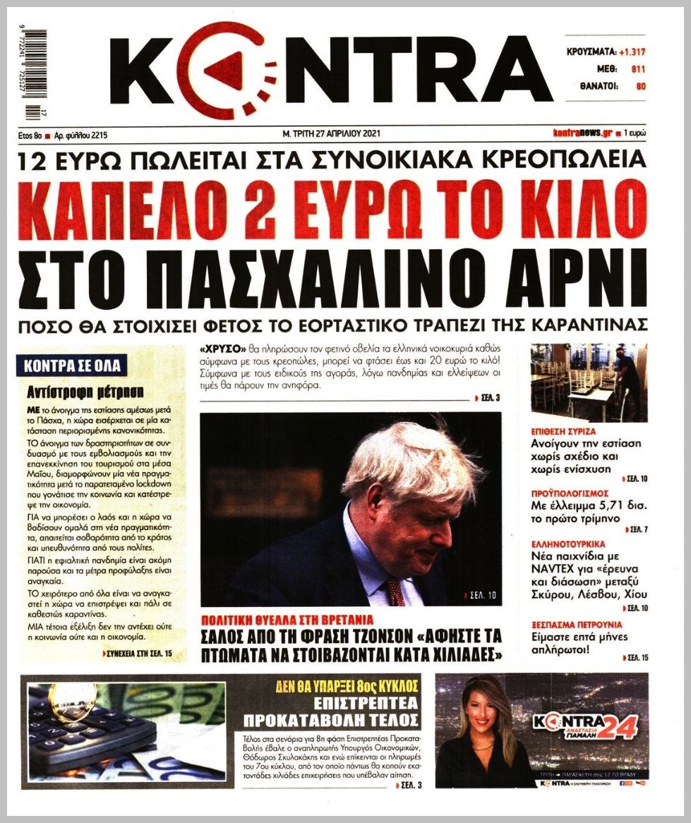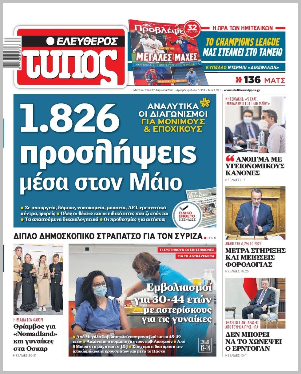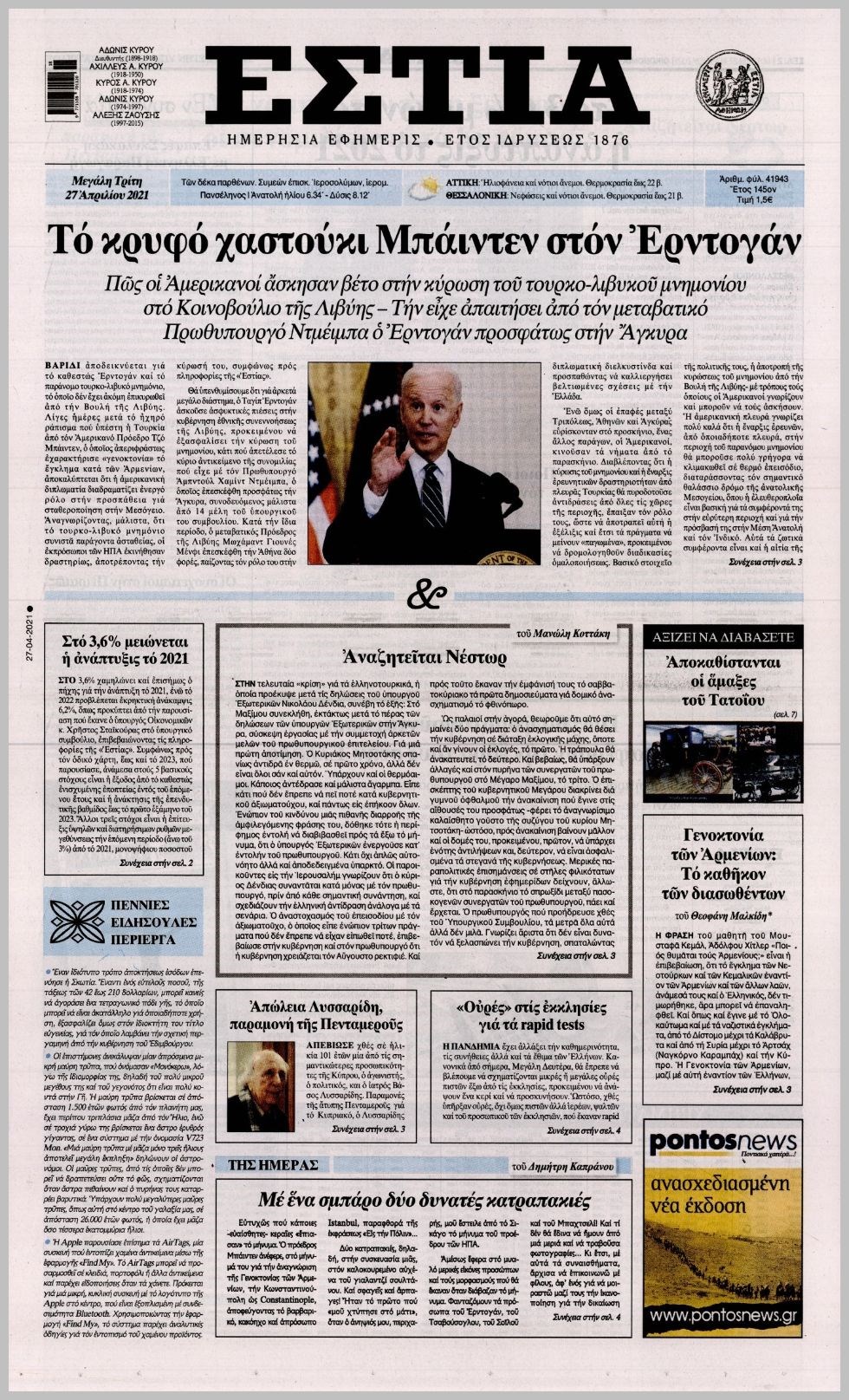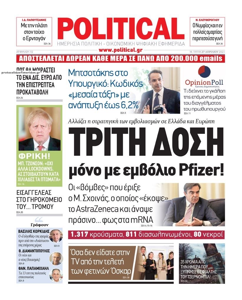 Οι πολιτικές εφημερίδες 27/4/2021 Διονύσης Νίκκας 06:12, Τρίτη 27 Απριλίου 2021 Media Διαβάστε τα πρωτοσέλιδα των πολιτικών εφημερίδων… ΕΦΗΜΕΡΙΔΕΣ ΠΡΩΤΟΣΕΛΙΔΑ Μοιράσου το: σχολίασε κι εσύ (0 σχόλια) Ακολουθήστε το enikos.gr στο Google News και μάθετε πρώτοι όλες τις ειδήσεις Δείτε όλες τις τελευταίες ειδήσεις από την Ελλάδα και τον Κόσμο στο enikos.gr Ειδήσεις Ροή Ειδήσεων 2 ώρες πριν Γιορτές με μπλόκα για τους αγρότες: Ανοίγουν διόδια και μοιράζουν προϊόντα στους ταξιδιώτες 8 λεπτά πριν Τσιάρας για αγρότες: Ικανοποιείται το αίτημα για αφορολόγητο πετρέλαιο στη μάνικα, πρόθεσή μας να μειωθεί ακόμη περισσότερο η τιμή στο ρεύμα 23 λεπτά πριν Αρχεία Έπσταϊν: Οι συγκλονιστικές φωτογραφίες – Ο Μάικλ Τζάκσον, ο Μικ Τζάγκερ και ο Κέβιν Σπέισι ανάμεσα στους διάσημους που απεικονίζονται 2 ώρες πριν Νέες ταυτότητες: Μεγάλη αναμονή για ραντεβού στην Αττική – Τέλος τα ταξίδια εκτός Ελλάδος από τον Αύγουστο για όσους δεν έχουν αλλάξει 54 λεπτά πριν Ινδία: Επτά ελέφαντες σκοτώθηκαν κατά τη σύγκρουση επιβατικού τρένου με κοπάδι 3 ώρες πριν Μία νέα «χρυσή» περίοδος αρχίζει για 3 ζώδια από σήμερα – «Μία αναπάντεχη ευκαιρία οδηγεί στην επιτυχία» 5 ώρες πριν Αρχαιολόγοι ανακάλυψαν σε χωράφι απεικόνιση 600 ετών ενός Αγίου – Τα στοιχεία που δείχνουν ότι μαρτύρησε 4 ώρες πριν Αγχώνεται για το χριστουγεννιάτικο δώρο που πήρε στην πλούσια σύντροφό του – «Φοβάμαι πως θα το βρει φθηνιάρικο, φοράει βραχιόλια Cartier» 52 λεπτά πριν Διαιτολόγος αποκαλύπτει 9 πρωινές συνήθειες που «λιώνουν» το κοιλιακό λίπος – «Υποστηρίζουν την υγιεινή απώλεια βάρους» 8 λεπτά πριν Τσιάρας για αγρότες: Ικανοποιείται το αίτημα για αφορολόγητο πετρέλαιο στη μάνικα, πρόθεσή μας να μειωθεί ακόμη περισσότερο η τιμή στο ρεύμα 15 λεπτά πριν Η Ζιζέλ Μπούντχεν παντρεύτηκε τον δάσκαλο ζίου-ζίτσου, Χοακίμ Βαλέντε 23 λεπτά πριν Αρχεία Έπσταϊν: Οι συγκλονιστικές φωτογραφίες – Ο Μάικλ Τζάκσον, ο Μικ Τζάγκερ και ο Κέβιν Σπέισι ανάμεσα στους διάσημους που απεικονίζονται 31 λεπτά πριν Χρήστος Μάντακας: «Θα μπορούσα να είχα φύγει από τη ζωή, δεν μπορούσα να περπατήσω…» 38 λεπτά πριν Εντυπωσιακό βίντεο από «τσουνάμι» πάγου στη Σιβηρία – Πώς προκαλείται το σπάνιο φαινόμενο ENIKOS NETWORK Είστε μόνιμα απρόσεκτοι; 3 σημάδια που δείχνουν ότι μπορεί να είναι σύμπτωμα πάθησης Πόσα κιλά παίρνουμε πραγματικά τα Χριστούγεννα, σύμφωνα με την επιστήμη – Πώς να το αποτρέψουμε; Χρήστος Δήμας: Στα 2,5 εκατ. ευρώ την ημέρα το κόστος από το άνοιγμα των διοδίων από τους αγρότες – Θα αξιώσουν αποζημίωση ... Χριστούγεννα και Πρωτοχρονιά: Πώς αμείβονται όσοι εργαστούν Χαρτογραφώντας το «σημείο χωρίς επιστροφή»: Για πρώτη φορά αποκαλύπτεται με λεπτομέρεια το ακανθώδες όριο της ατμόσφαιρας τ... Η Google καταργεί τη λειτουργία «dark web report» – Πώς θα μπορούν οι χρήστες να διαγράφουν τα δεδομένα τους περισσότερα 11:41 , Σάββατο 20 Δεκεμβρίου 2025 «Η αγάπη δεν χάνεται ποτέ»: Η μικρού μήκους ταινία κινουμένων σχεδίων που θέτει ερωτήματα για τη ζωή και τον θάνατο Ο θάνατος είναι ένα από τα πιο σκληρά θέματα που καλείται να διαχειριστεί κάποιος στη διάρκεια... 09:30 , Σάββατο 20 Δεκεμβρίου 2025 «Porto Leone: Στη γειτονιά με τα κόκκινα φανάρια» – Ο Χρόνης αποκαλύπτει στην Αλεξάνδρα το μυστικό για το παιδί της Λένας Η μεγάλη δραματική σειρά του Apha «Porto Leone: Στη γειτονιά με τα κόκκινα φανάρια» μας μεταφέ... 08:14 , Σάββατο 20 Δεκεμβρίου 2025 Τρομεροί γονείς: Η Μαρία Καβογιάννη εισβάλλει στο σπίτι