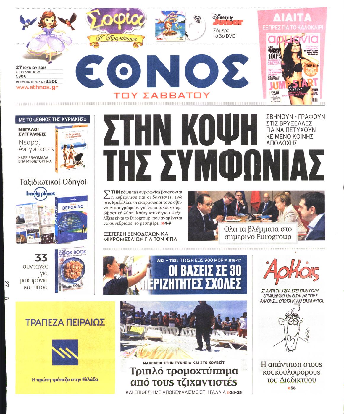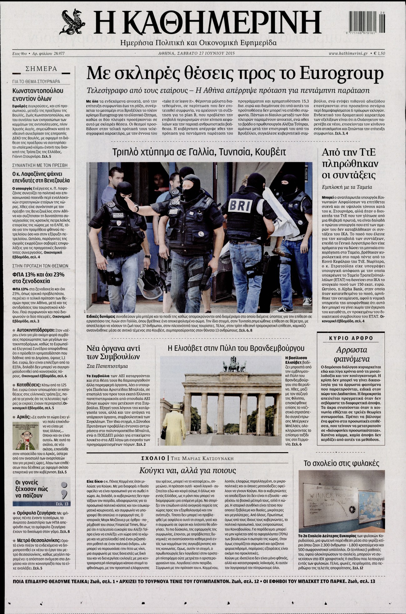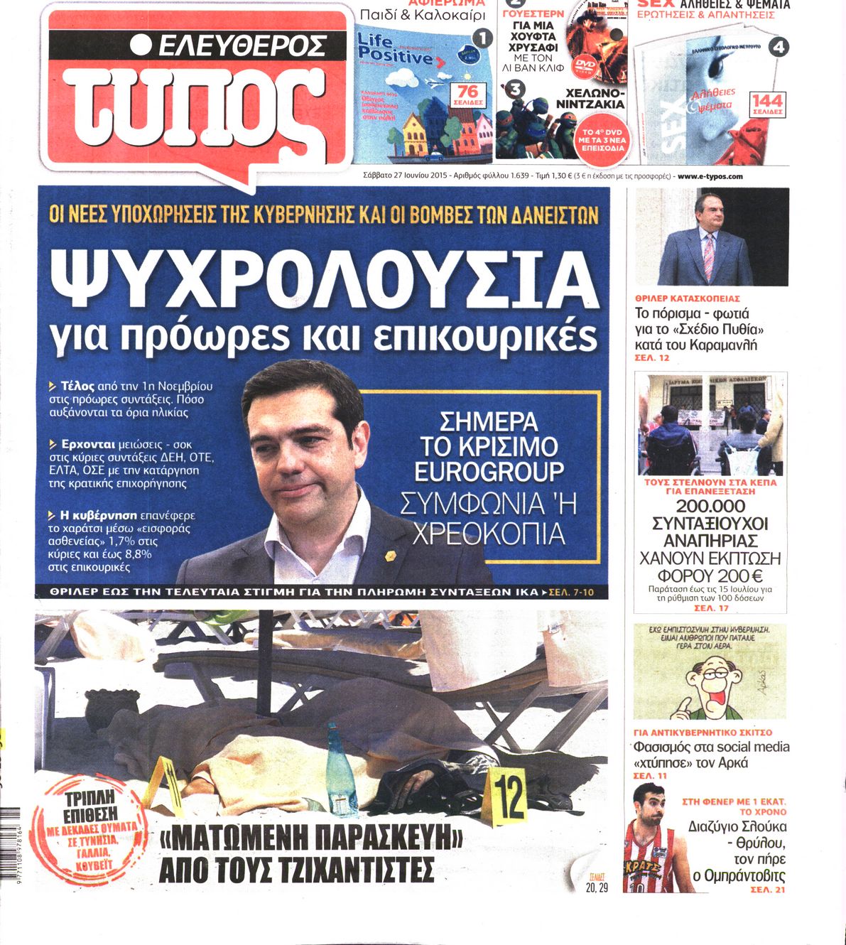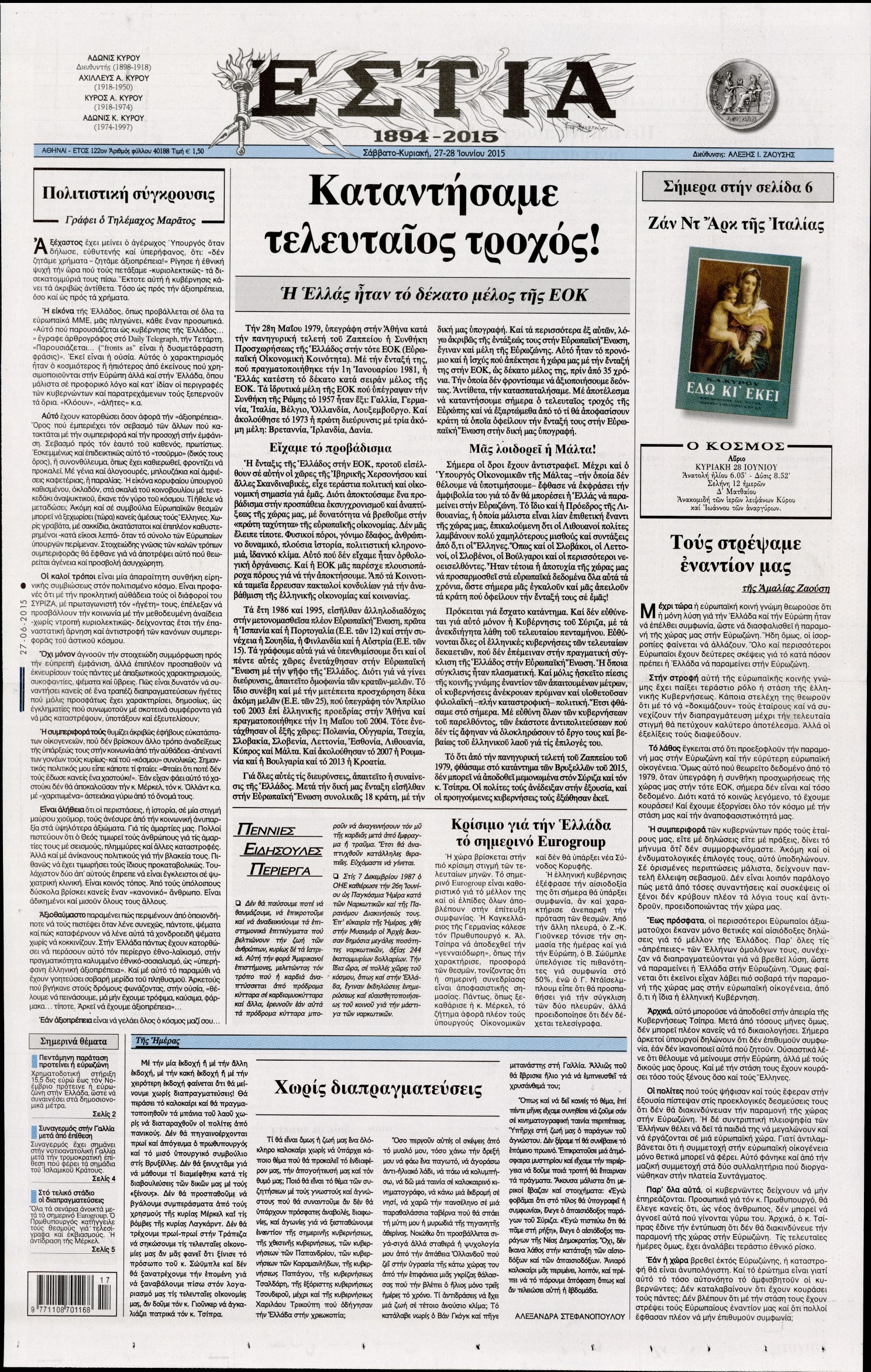 Oι πολιτικές εφημερίδες 27/6/2015 Enikos Newsroom 07:51, Σάββατο 27 Ιουνίου 2015 Media Διαβάστε τα σημερινά πρωτοσέλιδα των πολιτικών εφημερίδων: ΠΟΛΙΤΙΚΕΣ ΕΦΗΜΕΡΙΔΕΣ ΠΡΩΤΟΣΕΛΙΔΑ Μοιράσου το: σχολίασε κι εσύ (0 σχόλια) Ακολουθήστε το enikos.gr στο Google News και μάθετε πρώτοι όλες τις ειδήσεις Δείτε όλες τις τελευταίες ειδήσεις από την Ελλάδα και τον Κόσμο στο enikos.gr Ειδήσεις Ροή Ειδήσεων 4 ώρες πριν Χριστούγεννα στα μπλόκα: Επιμένουν στις κινητοποιήσεις τους οι αγρότες – Ανοίγουν τα διόδια το Σαββατοκύριακο 4 ώρες πριν Ουκρανία: Η άνευ προηγουμένου επίθεση σε ρωσικό τάνκερ στη Μεσόγειο και το μήνυμα προς στον Πούτιν – Το «μακρύ χέρι» του Κιέβου 3 ώρες πριν Πούτιν: Τα μηνύματα σε Ευρώπη και ΝΑΤΟ από το μαραθώνιο «σόου» του – Η απαίτηση για «σεβασμό» και η ειρήνη «με τους όρους» της Μόσχας 4 ώρες πριν Τραμπ: Δεν αποκλείει την πιθανότητα ενός πολέμου στη Βενεζουέλα – «Ο Μαδούρο ξέρει καλύτερα από τον καθένα τι ακριβώς θέλω» 5 ώρες πριν Συνεχίζει να προκαλεί ο Μίτσκοσκι: «Για μένα το όνομα Μακεδονία είναι ιερό» 4 ώρες πριν Ανακαλύφθηκαν αρχαία χρυσά νομίσματα 2.200 ετών που απεικονίζουν τον θεό Απόλλωνα – Η άγνωστη σύνδεση με τον Φίλιππο Β΄ της Μακεδονίας 5 ώρες πριν Ύπνος: Μια κρυφή κατάσταση του εγκεφάλου πριν από τον ύπνο μπορεί να είναι το “κλειδί” για υψηλή ευφυΐα και δημιουργικότητα 5 ώρες πριν Αριθμολογία: Οι άνθρωποι που έχουν γεννηθεί αυτές τις 4 ημερομηνίες, συχνά παρεξηγούνται – «Η καλοσύνη τους κρύβει τεράστια δύναμη» 6 ώρες πριν Ξεχάστε το καθάρισμα το Σαββατοκύριακο: Ο «κανόνας των 20 λεπτών» που θα σας λύσει τα χέρια 5 λεπτά πριν Ντόναλντ Τραμπ: «Πολύ βαριά αντίποινα» στη Συρία – «Πλήττουμε πολύ δυνατά οχυρά του Ισλαμικού Κράτους» 20 λεπτά πριν Εξάρχεια: Ένταση με μολότοφ, χημικά και κρότου λάμψης 36 λεπτά πριν ΗΠΑ: Τραγωδία στην Αλαμπάμα – Σκότωσε την δημοσιογράφο σύζυγό του και αυτοκτόνησε μπροστά στον 3χρονο γιο τους 50 λεπτά πριν Πρόταση γάμου στο ΣΕΦ κατά την διάρκεια του αγώνα Ολυμπιακός-Βιλερμπάν – Δείτε βίντεο 1 ώρα πριν Euroleague: Επέστρεψε στις νίκες ο Ολυμπιακός, πήρε την ματσάρα της χρονιάς η Μπάρτσα – Τα αποτελέσματα και η βαθμολογία ENIKOS NETWORK Το ΕΚΑΒ τιμήθηκε από την Ακαδημία Αθηνών για τα 40 χρόνια προσφοράς του Έχετε πραγματικά μεγάλη καρδιά; 10 χαρακτηριστικά όσων έχουν καλοσύνη Αναστολή μέτρων αναγκαστικής εκτέλεσης για κτηνοτρόφους που πλήττονται από την ευλογιά των αιγοπροβάτων Πλήρης επάρκεια προϊόντων στις λαϊκές της Αττικής, παρά τις αγροτικές κινητοποιήσεις – Τι απαντούν οι πωλητές Χαρτογραφώντας το «σημείο χωρίς επιστροφή»: Για πρώτη φορά αποκαλύπτεται με λεπτομέρεια το ακανθώδες όριο της ατμόσφαιρας τ... Η Google καταργεί τη λειτουργία «dark web report» – Πώς θα μπορούν οι χρήστες να διαγράφουν τα δεδομένα τους περισσότερα 22:42 , Παρασκευή 19 Δεκεμβρίου 2025 Γιώργος Γιαννόπουλος για “Το σόι σου”: “Είναι ευτυχία και ευλογία αυτή η σειρά” «Είναι ευτυχία και ευλογία η συγκυρία αυτής της σειράς», θα πει ο Γιώργος Γιαννόπουλος -ο αγαπ... 20:37 , Παρασκευή 19 Δεκεμβρίου 2025 Don’t Forget The Lyrics: Η Έλλη Κοκκίνου υποδέχεται 4 παίκτες που θα κάνουν τα πάντα για να μη χάσουν ούτε… μισή λέξη από τους στίχους Το «Don’t Forget The Lyrics» επιστρέφει απόψε, Παρασκευή 19 Δεκεμβρίου, στις 21:00 με νέο επει... 19:31 , Παρασκευή 19 Δεκεμβρίου 2025 GNTM: Απόψε ο μεγάλος τελικός για τους 4 φιναλίστ Έπειτα από μήνες γεμάτους μόδα, δημιουργία και έντονες αναμετρήσεις, το GNTM 2025 κορυφώνεται,... 18:11 , Παρασκε