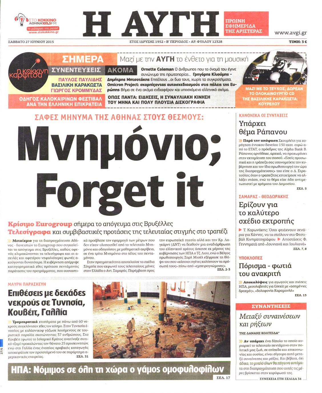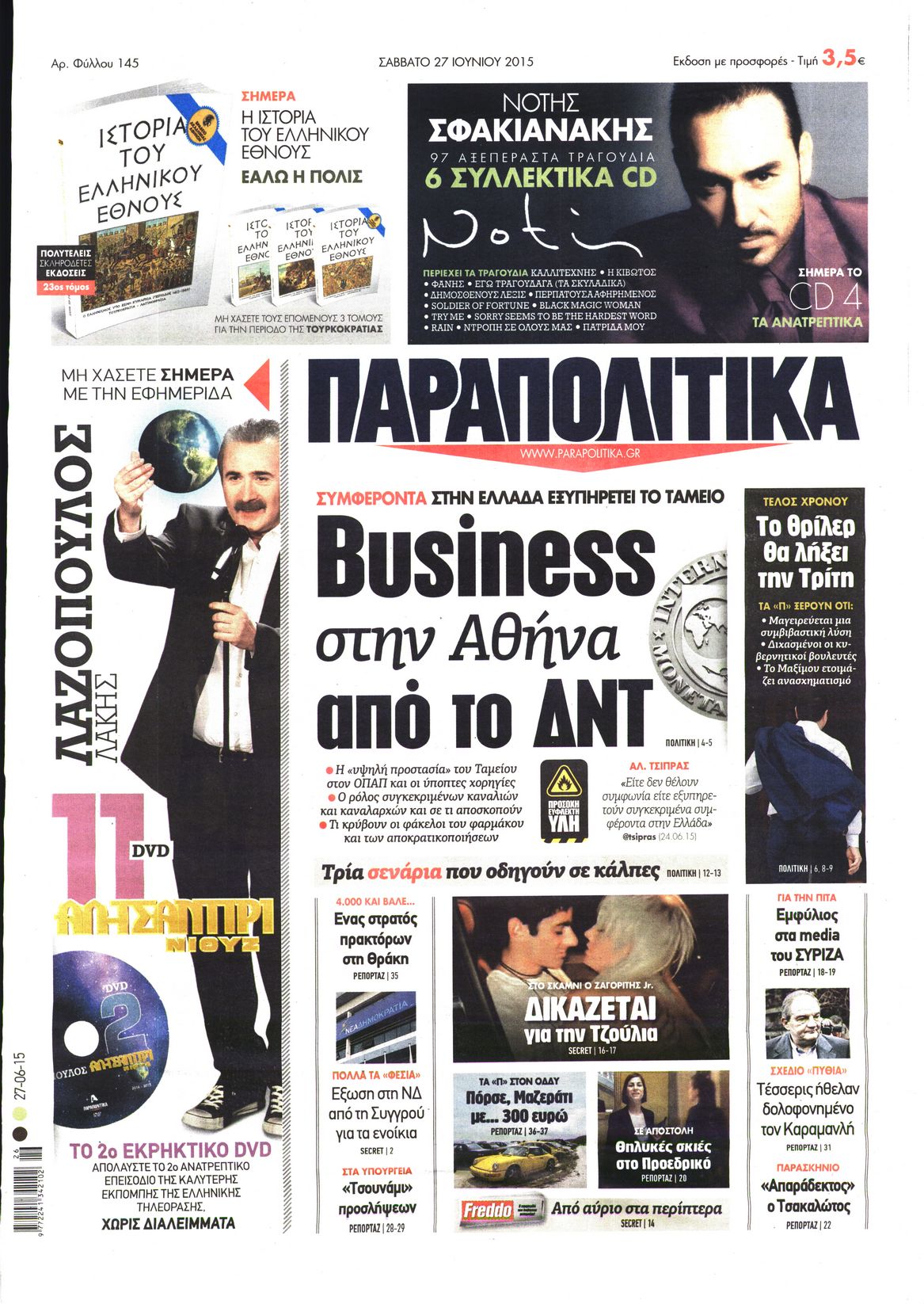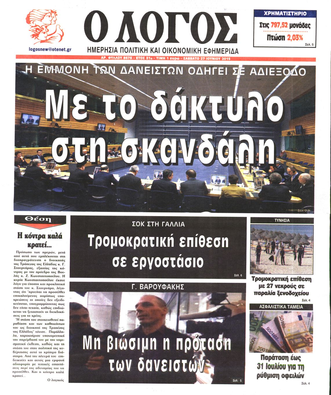Oι πολιτικές εφημερίδες 27/6/2015 Enikos Newsroom 07:51, Σάββατο 27 Ιουνίου 2015 Media Διαβάστε τα σημερινά πρωτοσέλιδα των πολιτικών εφημερίδων: ΠΟΛΙΤΙΚΕΣ ΕΦΗΜΕΡΙΔΕΣ ΠΡΩΤΟΣΕΛΙΔΑ Μοιράσου το: σχολίασε κι εσύ (0 σχόλια) Ακολουθήστε το enikos.gr στο Google News και μάθετε πρώτοι όλες τις ειδήσεις Δείτε όλες τις τελευταίες ειδήσεις από την Ελλάδα και τον Κόσμο στο enikos.gr Ειδήσεις Ροή Ειδήσεων 4 ώρες πριν Χριστούγεννα στα μπλόκα: Επιμένουν στις κινητοποιήσεις τους οι αγρότες – Ανοίγουν τα διόδια το Σαββατοκύριακο 4 ώρες πριν Ουκρανία: Η άνευ προηγουμένου επίθεση σε ρωσικό τάνκερ στη Μεσόγειο και το μήνυμα προς στον Πούτιν – Το «μακρύ χέρι» του Κιέβου 3 ώρες πριν Πούτιν: Τα μηνύματα σε Ευρώπη και ΝΑΤΟ από το μαραθώνιο «σόου» του – Η απαίτηση για «σεβασμό» και η ειρήνη «με τους όρους» της Μόσχας 4 ώρες πριν Τραμπ: Δεν αποκλείει την πιθανότητα ενός πολέμου στη Βενεζουέλα – «Ο Μαδούρο ξέρει καλύτερα από τον καθένα τι ακριβώς θέλω» 5 ώρες πριν Συνεχίζει να προκαλεί ο Μίτσκοσκι: «Για μένα το όνομα Μακεδονία είναι ιερό» 4 ώρες πριν Ανακαλύφθηκαν αρχαία χρυσά νομίσματα 2.200 ετών που απεικονίζουν τον θεό Απόλλωνα – Η άγνωστη σύνδεση με τον Φίλιππο Β΄ της Μακεδονίας 5 ώρες πριν Ύπνος: Μια κρυφή κατάσταση του εγκεφάλου πριν από τον ύπνο μπορεί να είναι το “κλειδί” για υψηλή ευφυΐα και δημιουργικότητα 5 ώρες πριν Αριθμολογία: Οι άνθρωποι που έχουν γεννηθεί αυτές τις 4 ημερομηνίες, συχνά παρεξηγούνται – «Η καλοσύνη τους κρύβει τεράστια δύναμη» 6 ώρες πριν Ξεχάστε το καθάρισμα το Σαββατοκύριακο: Ο «κανόνας των 20 λεπτών» που θα σας λύσει τα χέρια 5 λεπτά πριν Ντόναλντ Τραμπ: «Πολύ βαριά αντίποινα» στη Συρία – «Πλήττουμε πολύ δυνατά οχυρά του Ισλαμικού Κράτους» 20 λεπτά πριν Εξάρχεια: Ένταση με μολότοφ, χημικά και κρότου λάμψης 36 λεπτά πριν ΗΠΑ: Τραγωδία στην Αλαμπάμα – Σκότωσε την δημοσιογράφο σύζυγό του και αυτοκτόνησε μπροστά στον 3χρονο γιο τους 50 λεπτά πριν Πρόταση γάμου στο ΣΕΦ κατά την διάρκεια του αγώνα Ολυμπιακός-Βιλερμπάν – Δείτε βίντεο 1 ώρα πριν Euroleague: Επέστρεψε στις νίκες ο Ολυμπιακός, πήρε την ματσάρα της χρονιάς η Μπάρτσα – Τα αποτελέσματα και η βαθμολογία ENIKOS NETWORK Το ΕΚΑΒ τιμήθηκε από την Ακαδημία Αθηνών για τα 40 χρόνια προσφοράς του Έχετε πραγματικά μεγάλη καρδιά; 10 χαρακτηριστικά όσων έχουν καλοσύνη Αναστολή μέτρων αναγκαστικής εκτέλεσης για κτηνοτρόφους που πλήττονται από την ευλογιά των αιγοπροβάτων Πλήρης επάρκεια προϊόντων στις λαϊκές της Αττικής, παρά τις αγροτικές κινητοποιήσεις – Τι απαντούν οι πωλητές Χαρτογραφώντας το «σημείο χωρίς επιστροφή»: Για πρώτη φορά αποκαλύπτεται με λεπτομέρεια το ακανθώδες όριο της ατμόσφαιρας τ... Η Google καταργεί τη λειτουργία «dark web report» – Πώς θα μπορούν οι χρήστες να διαγράφουν τα δεδομένα τους περισσότερα 22:42 , Παρασκευή 19 Δεκεμβρίου 2025 Γιώργος Γιαννόπουλος για “Το σόι σου”: “Είναι ευτυχία και ευλογία αυτή η σειρά” «Είναι ευτυχία και ευλογία η συγκυρία αυτής της σειράς», θα πει ο Γιώργος Γιαννόπουλος -ο αγαπ... 20:37 , Παρασκευή 19 Δεκεμβρίου 2025 Don’t Forget The Lyrics: Η Έλλη Κοκκίνου υποδέχεται 4 παίκτες που θα κάνουν τα πάντα για να μη χάσουν ούτε… μισή λέξη από τους στίχους Το «Don’t Forget The Lyrics» επιστρέφει απόψε, Παρασκευή 19 Δεκεμβρίου, στις 21:00 με νέο επει... 19:31 , Παρασκευή 19 Δεκεμβρίου 2025 GNTM: Απόψε ο μεγάλος τελικός για τους 4 φιναλίστ Έπειτα από μήνες γεμάτους μόδα, δημιουργία και έντονες αναμετρήσεις, το GNTM 2025 κορυφώνεται,... 18:11 , Παρασκε