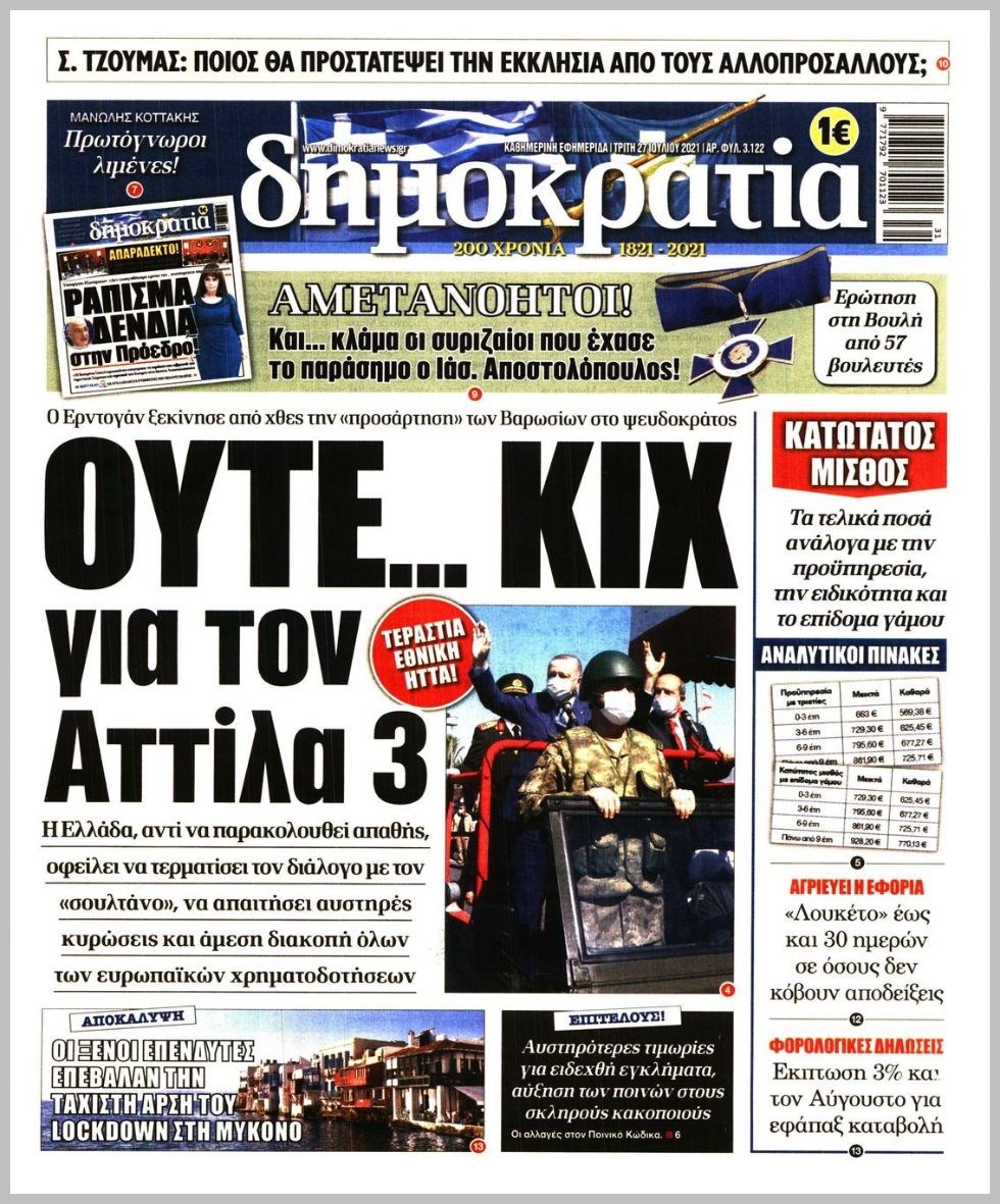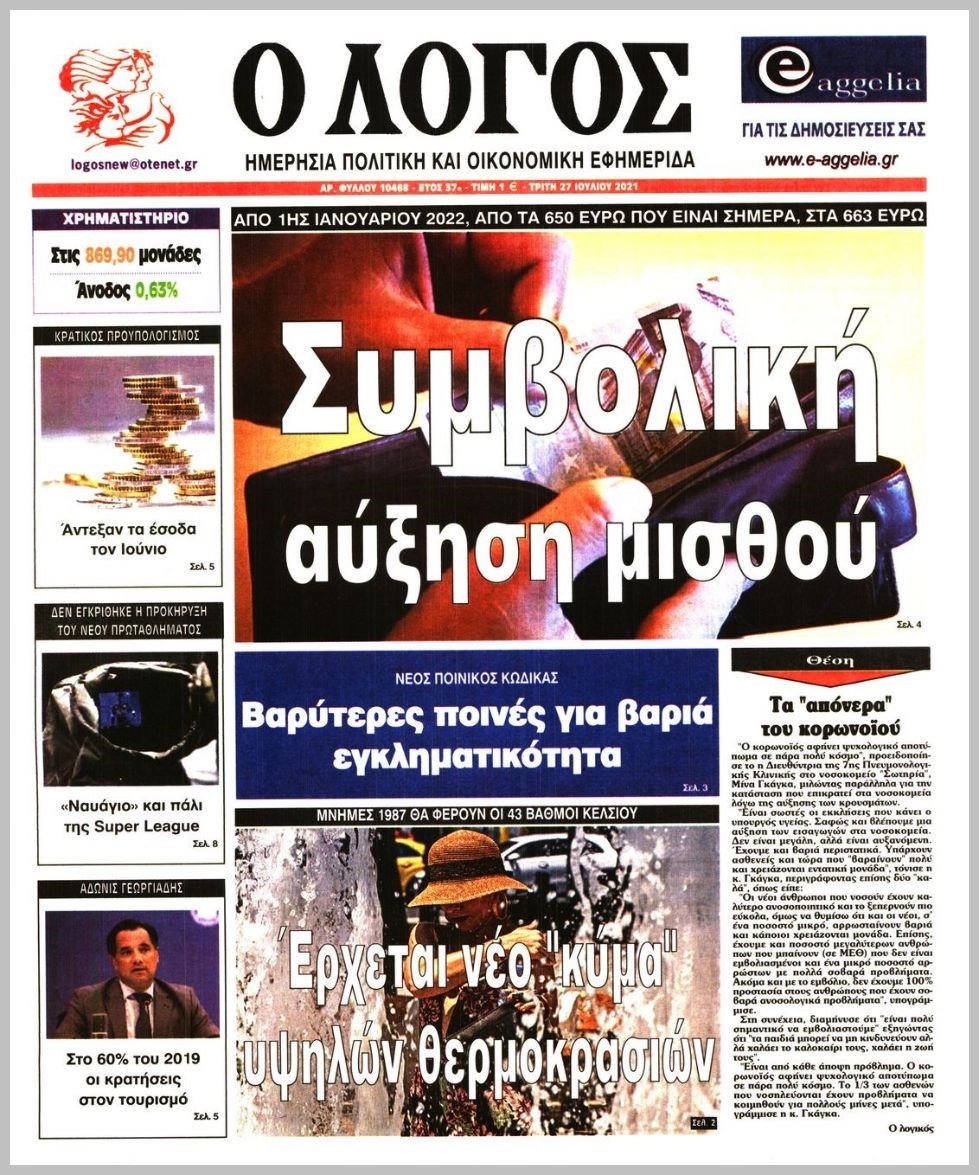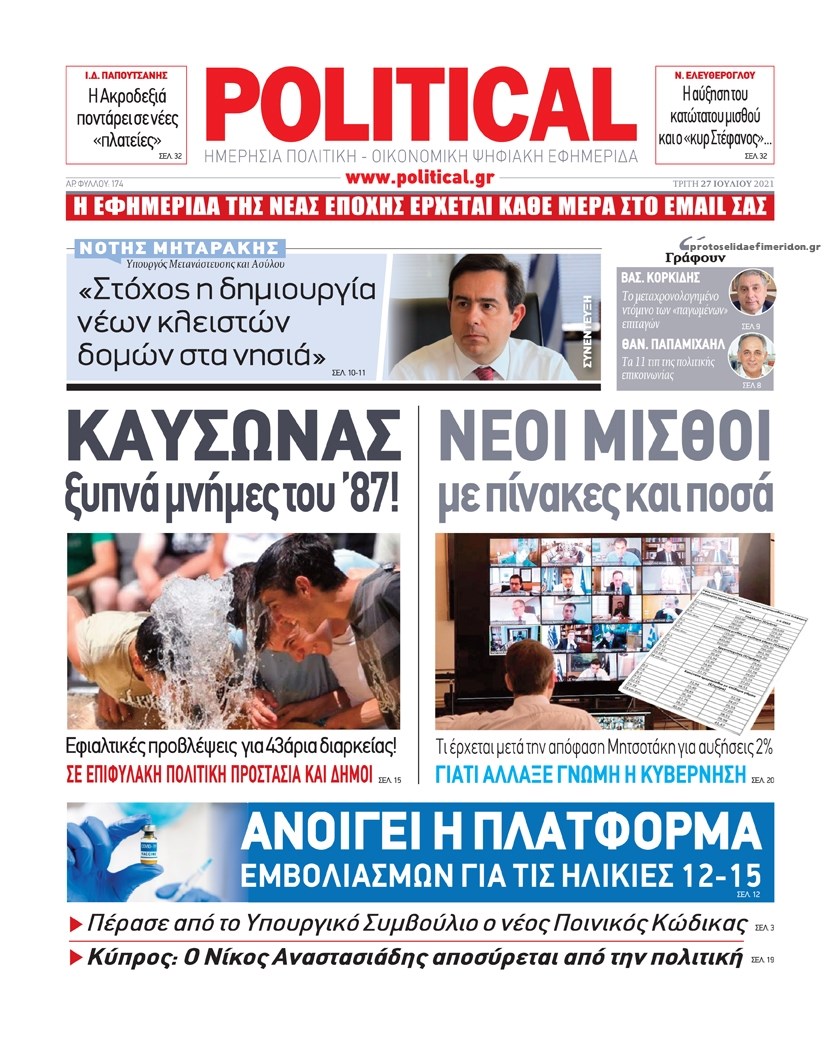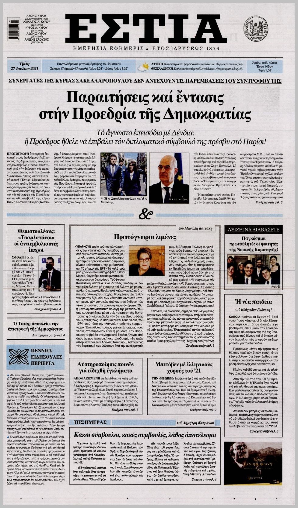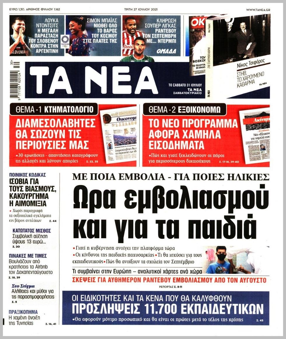 Οι πολιτικές εφημερίδες 27/7/2021 Διονύσης Νίκκας 06:24, Τρίτη 27 Ιουλίου 2021 Media Διαβάστε τα πρωτοσέλιδα των πολιτικών εφημερίδων… ΕΦΗΜΕΡΙΔΕΣ ΠΡΩΤΟΣΕΛΙΔΑ Μοιράσου το: σχολίασε κι εσύ (0 σχόλια) Ακολουθήστε το enikos.gr στο Google News και μάθετε πρώτοι όλες τις ειδήσεις Δείτε όλες τις τελευταίες ειδήσεις από την Ελλάδα και τον Κόσμο στο enikos.gr Ειδήσεις Ροή Ειδήσεων 3 ώρες πριν Υπόθεση Έπσταϊν: Το Υπουργείο Δικαιοσύνης δημοσιοποίησε μια σειρά από εξαιρετικά επεξεργασμένα αρχεία – «Λείπουν τα πιο σημαντικά έγγραφα», λένε οι Δημοκρατικοί 35 λεπτά πριν Γιορτές με μπλόκα για τους αγρότες: Ανοίγουν διόδια και μοιράζουν προϊόντα στους ταξιδιώτες 1 ώρα πριν Εξαφάνιση 33χρονου γιατρού στην Κρήτη: «Άναψα τα φώτα, τρόμαξε και άρχισε να τρέχει στα χωράφια» – Η τελευταία διαδρομή και η μαρτυρία «κλειδί» 3 ώρες πριν Ο «χάρτης» με τις αυξήσεις και τις φοροελαφρύνσεις του 2026 – Ποιοι και πόσα κερδίζουν 51 λεπτά πριν Τα αρχεία του Έπσταϊν αποκαλύπτουν φωτογραφία του έκπτωτου πρίγκιπα Άντριου – Είναι ξαπλωμένος στην αγκαλιά 5 γυναικών 58 λεπτά πριν Μία νέα «χρυσή» περίοδος αρχίζει για 3 ζώδια από σήμερα – «Μία αναπάντεχη ευκαιρία οδηγεί στην επιτυχία» 5 ώρες πριν Αυγά: Πόσα μπορείτε να τρώτε την ημέρα με ασφάλεια για μέγιστη πρόσληψη πρωτεΐνης 3 ώρες πριν Αρχαιολόγοι ανακάλυψαν σε χωράφι απεικόνιση 600 ετών ενός Αγίου – Τα στοιχεία που δείχνουν ότι μαρτύρησε 2 ώρες πριν Αγχώνεται για το χριστουγεννιάτικο δώρο που πήρε στην πλούσια σύντροφό του – «Φοβάμαι πως θα το βρει φθηνιάρικο, φοράει βραχιόλια Cartier» 8 λεπτά πριν Οι 7 φράσεις που δεν λένε ποτέ οι συναισθηματικά έξυπνοι άνθρωποι κατά τη διάρκεια ενός καβγά 12 λεπτά πριν Τηλεθέαση (19/12): Ανατροπές και πρωτιές στην πρωινή ζώνη 19 λεπτά πριν Πώς η κλιματική αλλαγή επηρεάζει εγκύους και βρέφη – Οι επιπτώσεις των υψηλών θερμοκρασιών 27 λεπτά πριν e-ΕΦΚΑ και ΔΥΠΑ: Οι πληρωμές από 22 έως 24 Δεκεμβρίου – Ποιοι θα δουν χρήματα στους λογαριασμούς τους 35 λεπτά πριν Συνελήφθη οδηγός μηχανής που έτρεχε με 161 χλμ στη Συγγρού – Τον έπιασε το ραντάρ της Τροχαίας ENIKOS NETWORK Είστε μόνιμα απρόσεκτοι; 3 σημάδια που δείχνουν ότι μπορεί να είναι σύμπτωμα πάθησης Πόσα κιλά παίρνουμε πραγματικά τα Χριστούγεννα, σύμφωνα με την επιστήμη – Πώς να το αποτρέψουμε; Επίδομα παιδιού: Τι αλλάζει από το 2026 – Το όφελος από τις φορολογικές ελαφρύνσεις Mega χριστουγεννιάτικη φορολοταρία: «Κλείδωσε» η ημερομηνία για την κλήρωση – Ερωτήσεις και απαντήσεις Χαρτογραφώντας το «σημείο χωρίς επιστροφή»: Για πρώτη φορά αποκαλύπτεται με λεπτομέρεια το ακανθώδες όριο της ατμόσφαιρας τ... Η Google καταργεί τη λειτουργία «dark web report» – Πώς θα μπορούν οι χρήστες να διαγράφουν τα δεδομένα τους περισσότερα 09:30 , Σάββατο 20 Δεκεμβρίου 2025 «Porto Leone: Στη γειτονιά με τα κόκκινα φανάρια» – Ο Χρόνης αποκαλύπτει στην Αλεξάνδρα το μυστικό για το παιδί της Λένας Η μεγάλη δραματική σειρά του Apha «Porto Leone: Στη γειτονιά με τα κόκκινα φανάρια» μας μεταφέ... 08:14 , Σάββατο 20 Δεκεμβρίου 2025 Τρομεροί γονείς: Η Μαρία Καβογιάννη εισβάλλει στο σπίτι της οικογένειας Στεφανίδη Όσα θα δούμε στο νέο διπλό επεισόδιο της σειράς «Τρομεροί γονείς», σήμερα Σάββατο 20 Δεκεμβρίο... 05:48 , Σάββατο 20 Δεκεμβρίου 2025 Οι οικονομικές εφημερίδες 20/12/2025 Διαβάστε τα πρωτοσέλιδα από τις οικονομικές εφημερίδες, σήμερα 20/12/2025. 05:43 , Σάββατο 20 Δεκεμβρίου 2025 Οι αθλητικές εφημερίδες 20/12/2025 Διαβάστε τα πρωτοσέλιδα από τις αθλητικές εφημερίδε