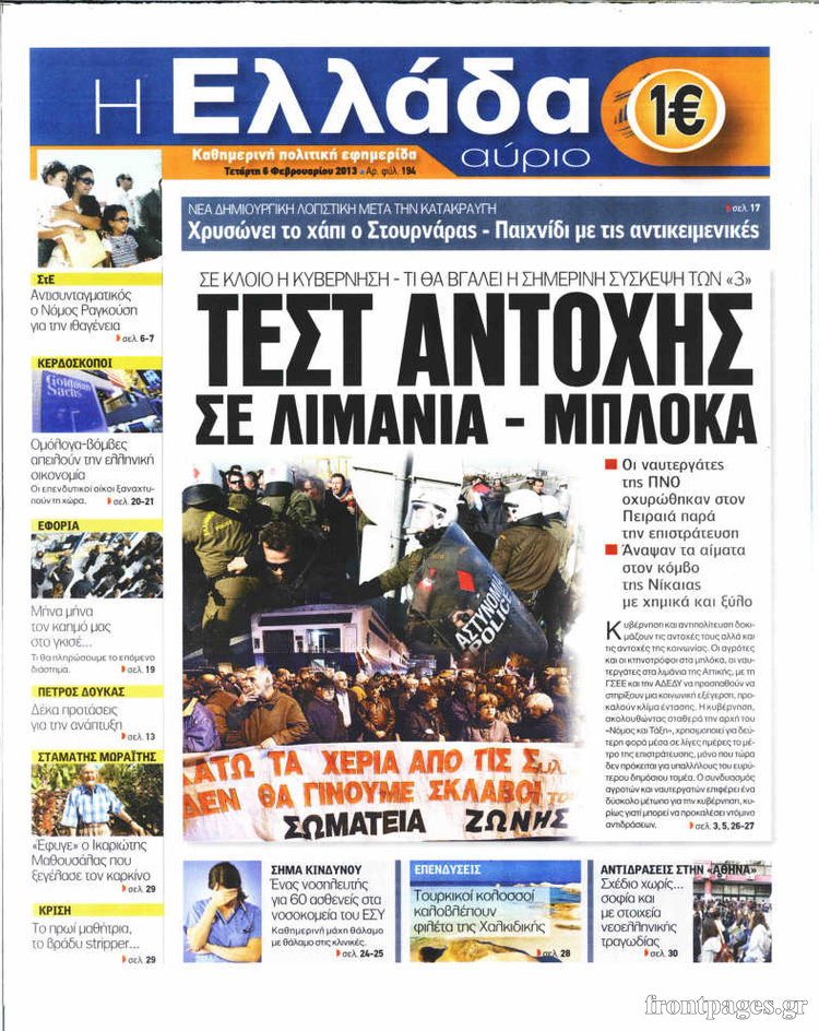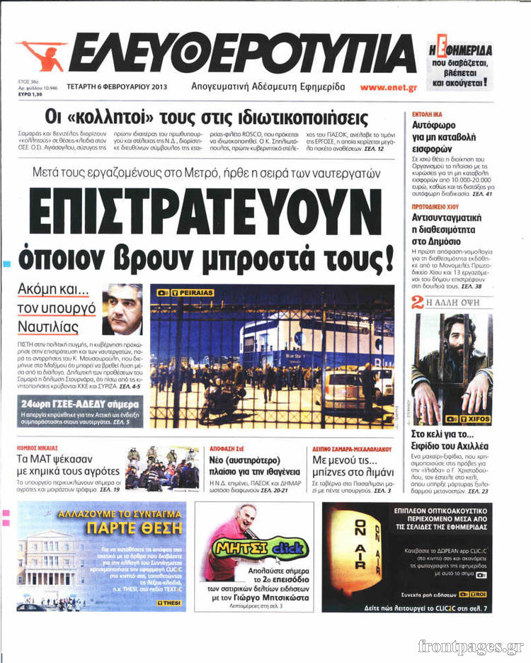 Οι πολιτικές εφημερίδες Enikos Newsroom 08:55, Τετάρτη 06 Φεβρουαρίου 2013 Media Οι πολιτικές εφημερίδες ΕΦΗΜΕΡΙΔΕΣ ΠΟΛΙΤΙΚΕΣ ΕΦΗΜΕΡΙΔΕΣ ΠΡΩΤΟΣΕΛΙΔΑ Μοιράσου το: σχολίασε κι εσύ (0 σχόλια) Ακολουθήστε το enikos.gr στο Google News και μάθετε πρώτοι όλες τις ειδήσεις Δείτε όλες τις τελευταίες ειδήσεις από την Ελλάδα και τον Κόσμο στο enikos.gr Ειδήσεις Ροή Ειδήσεων 2 ώρες πριν Συνεχίζουν τις κινητοποιήσεις οι αγρότες: Κλείνουν τις σήραγγες των Τεμπών για τα φορτηγά – Τι θα γίνει τα Χριστούγεννα 52 λεπτά πριν Μόσχα: Σκοτώθηκε Ρώσος στρατηγός έπειτα από έκρηξη μηχανισμού στο αυτοκίνητό του 3 ώρες πριν Νέες εστίες ακρίβειας «ροκανίζουν» τα εισοδήματα – Πού καταγράφονται οι μεγαλύτερες αυξήσεις 1 ώρα πριν Νέες δηλώσεις του αγροτοσυνδικαλιστή Ανεστίδη: Όσα λέγονται είναι λάσπη στον ανεμιστήρα για να σπάσουν τα μπλόκα 3 ώρες πριν «Έπιασαν δουλειά» οι 8 κάμερες που λειτουργούν πιλοτικά – Περισσότερες από 1.000 παραβάσεις σε 4 ημέρες 32 λεπτά πριν Τα 4 ζώδια που παίρνουν επιτέλους την αναγνώριση που τους αξίζει – «Απρόσμενες ευκαιρίες, που μοιάζουν με δώρα από το σύμπαν» 2 ώρες πριν Ο άνδρας της απαιτεί να κάνει όλες τις δουλειές του σπιτιού από τότε που παραιτήθηκε – «Εξακολουθώ να συνδράμω οικονομικά στο σπίτι» 2 ώρες πριν Ανακαλύφθηκε βραχογράφημα που παραπέμπει στον Ηρακλή και την Ύδρα από ελληνικά νομίσματα του 325 π.Χ. 2 ημέρες πριν Enerwave: Το νέο «ρεύμα» στη λιανική ενέργειας που αλλάζει την εμπειρία του καταναλωτή 6 λεπτά πριν Τσακ Νόρις: Πέθανε η πρώην σύζυγός του, Νταϊάν Χόλετσεκ – Ήταν η πρώτη εφηβική αγάπη του 11 λεπτά πριν Θεσσαλονίκη: Γρονθοκόπησαν 13χρονο σε αγώνα βόλεϊ γιατί τους… ενοχλούσε το τύμπανο 17 λεπτά πριν Πρωτοχρονιάτικο δώρο της ΕΡΤ η «Μεγάλη χίμαιρα» – Διπλή πρεμιέρα για την ακριβότερη ελληνική σειρά 21 λεπτά πριν Επίδομα παιδιού: Άνοιξε η πλατφόρμα για τις αιτήσεις – Ερωτήσεις και απαντήσεις 26 λεπτά πριν Οχάιο: Ύποπτος για κλοπή τράβηξε όπλο κατά αστυνομικού και προσπάθησε να τον πυροβολήσει – Δείτε το βίντεο ENIKOS NETWORK Χοληστερίνη: Το σημάδι στο δέρμα που μπορεί να δείχνει ότι είναι υπερβολικά υψηλή Ποιο γλυκό φρούτο ρυθμίζει το σάκχαρο και μπορούν να φάνε οι διαβητικοί, σύμφωνα με μελέτη Οχήματα: Σε ποιους επιστρέφει από σήμερα η Δημοτική Αστυνομία τις πινακίδες Νέες εστίες ακρίβειας «ροκανίζουν» τα εισοδήματα – Πού καταγράφονται οι μεγαλύτερες αυξήσεις Χαρτογραφώντας το «σημείο χωρίς επιστροφή»: Για πρώτη φορά αποκαλύπτεται με λεπτομέρεια το ακανθώδες όριο της ατμόσφαιρας τ... Η Google καταργεί τη λειτουργία «dark web report» – Πώς θα μπορούν οι χρήστες να διαγράφουν τα δεδομένα τους περισσότερα 10:15 , Δευτέρα 22 Δεκεμβρίου 2025 Πρωτοχρονιάτικο δώρο της ΕΡΤ η «Μεγάλη χίμαιρα» – Διπλή πρεμιέρα για την ακριβότερη ελληνική σειρά Με πρωτότυπο τρόπο και σπαστή πρεμιέρα σε ΕΡΤflix και ΕΡΤ1 θα κάνει η δημόσια τηλεόραση το λαν... 09:45 , Δευτέρα 22 Δεκεμβρίου 2025 Ο χριστουγεννιάτικος τηλεμαραθώνιος αλληλεγγύης του ANT1 για τα παιδιά Ο ANT1 διοργανώνει Χριστουγεννιάτικο Τηλεμαραθώνιο για τα Παιδιά την 22η Δεκεμβρίου 2025, με σ... 09:30 , Δευτέρα 22 Δεκεμβρίου 2025 Eurovision 2026: Φαβορί η Μπέττυ Μαγγίρα Στην τελική ευθεία μπαίνει ο σχεδιασμός της ΕΡΤ για τους δύο ημιτελικούς και τον εθνικό τελικό... 07:02 , Δευτέρα 22 Δεκεμβρίου 2025 Αυτή την Κυριακή με τη Realnews: Το μυστήριο των Χριστουγέννων της Vicki Delany – Μαζί αστυνομικά μυθιστορήματα Αυτή την Κυριακή με τη Realnews: Το μυστήριο των Χριστουγέννων της Vick