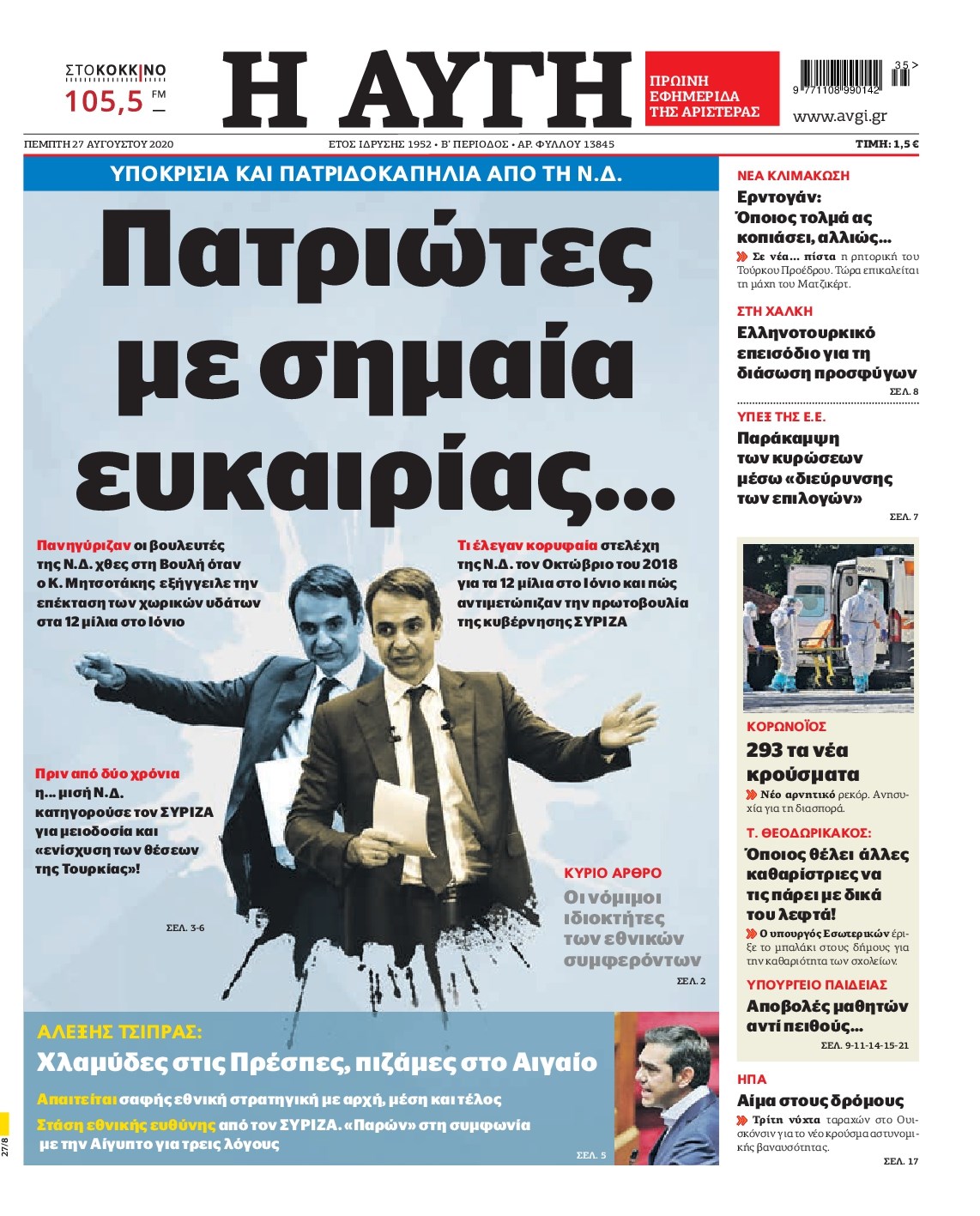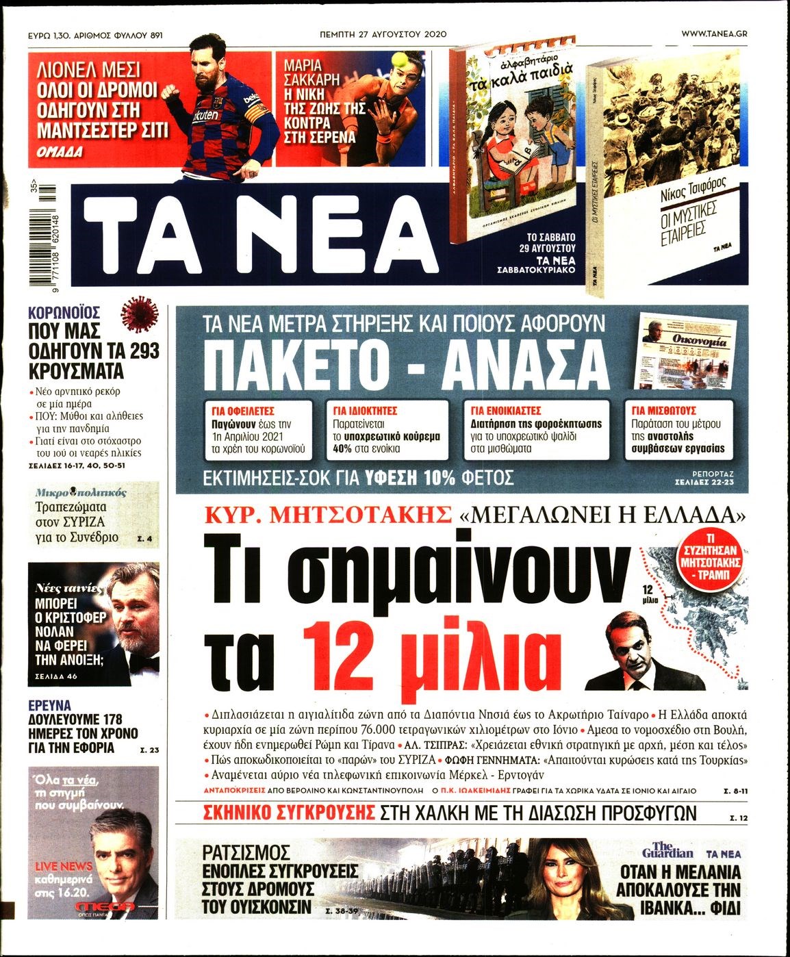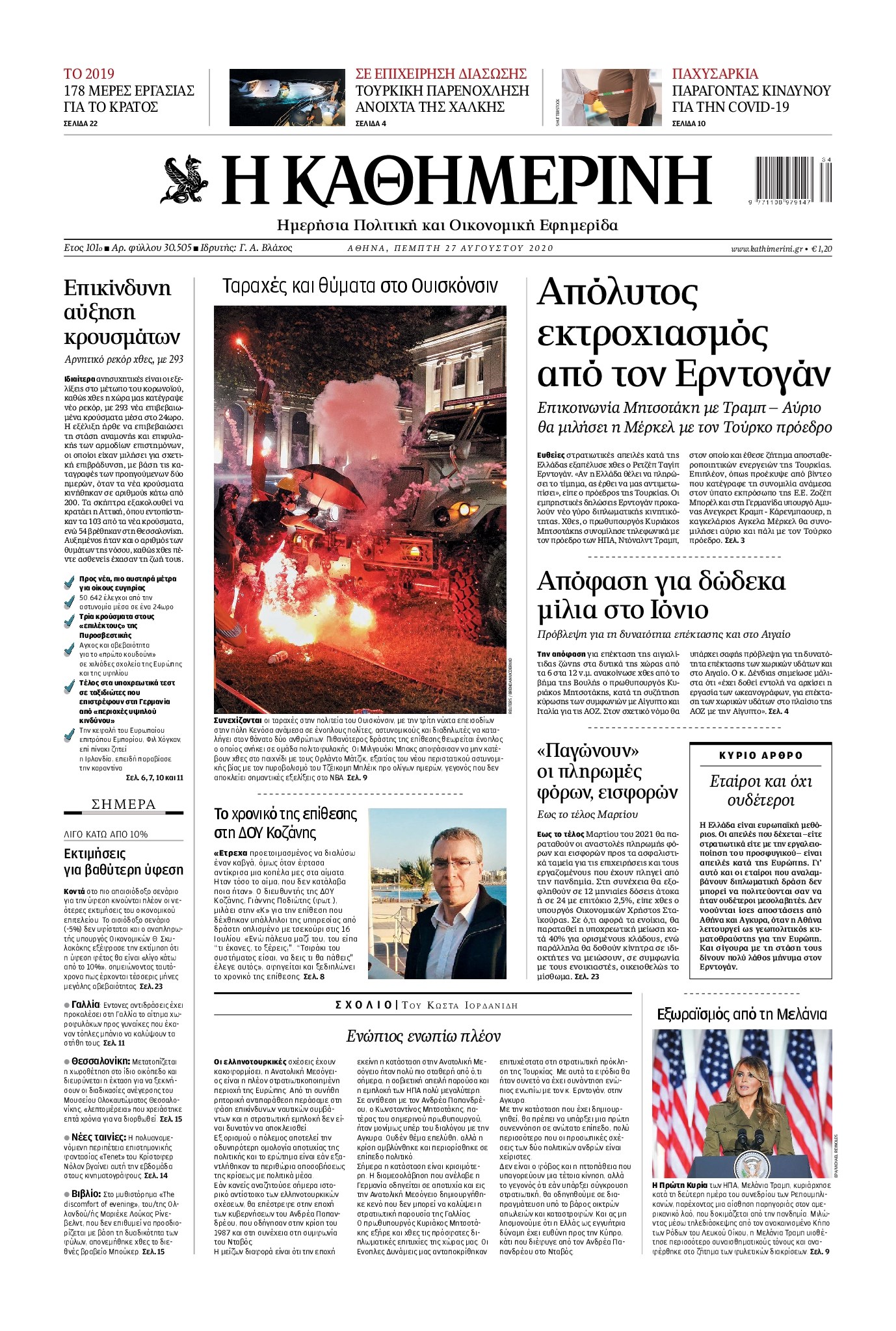 Οι πολιτικές εφημερίδες 27/8/2020 Διονύσης Νίκκας 06:13, Πέμπτη 27 Αυγούστου 2020 Media Διαβάστε τα πρωτοσέλιδα των πολιτικών εφημερίδων… ΠΟΛΙΤΙΚΕΣ ΕΦΗΜΕΡΙΔΕΣ ΠΡΩΤΟΣΕΛΙΔΑ Μοιράσου το: σχολίασε κι εσύ (0 σχόλια) Ακολουθήστε το enikos.gr στο Google News και μάθετε πρώτοι όλες τις ειδήσεις Δείτε όλες τις τελευταίες ειδήσεις από την Ελλάδα και τον Κόσμο στο enikos.gr Ειδήσεις Ροή Ειδήσεων 3 ώρες πριν Χριστούγεννα στα μπλόκα: Επιμένουν στις κινητοποιήσεις τους οι αγρότες – Ανοίγουν τα διόδια το Σαββατοκύριακο 3 ώρες πριν Ουκρανία: Η άνευ προηγουμένου επίθεση σε ρωσικό τάνκερ στη Μεσόγειο και το μήνυμα προς στον Πούτιν – Το «μακρύ χέρι» του Κιέβου 2 ώρες πριν Πούτιν: Τα μηνύματα σε Ευρώπη και ΝΑΤΟ από το μαραθώνιο «σόου» του – Η απαίτηση για «σεβασμό» και η ειρήνη «με τους όρους» της Μόσχας 3 ώρες πριν Τραμπ: Δεν αποκλείει την πιθανότητα ενός πολέμου στη Βενεζουέλα – «Ο Μαδούρο ξέρει καλύτερα από τον καθένα τι ακριβώς θέλω» 4 ώρες πριν Συνεχίζει να προκαλεί ο Μίτσκοσκι: «Για μένα το όνομα Μακεδονία είναι ιερό» 2 ώρες πριν Ανακαλύφθηκαν αρχαία χρυσά νομίσματα 2.200 ετών που απεικονίζουν τον θεό Απόλλωνα – Η άγνωστη σύνδεση με τον Φίλιππο Β΄ της Μακεδονίας 3 ώρες πριν Ύπνος: Μια κρυφή κατάσταση του εγκεφάλου πριν από τον ύπνο μπορεί να είναι το “κλειδί” για υψηλή ευφυΐα και δημιουργικότητα 4 ώρες πριν Αριθμολογία: Οι άνθρωποι που έχουν γεννηθεί αυτές τις 4 ημερομηνίες, συχνά παρεξηγούνται – «Η καλοσύνη τους κρύβει τεράστια δύναμη» 5 ώρες πριν Ξεχάστε το καθάρισμα το Σαββατοκύριακο: Ο «κανόνας των 20 λεπτών» που θα σας λύσει τα χέρια 6 λεπτά πριν Συρία: Μαζικά πλήγματα των ΗΠΑ σε θέσεις του Ισλαμικού Κράτους – Χέγκσεθ: «Δεν είναι αρχή πολέμου, είναι μια δήλωση εκδίκησης» για το θάνατο των στρατιωτών μας 19 λεπτά πριν Ουκρανία: Ολοκληρώθηκαν οι συνομιλίες με τους Αμερικανούς κι Ευρωπαίους διαπραγματευτές 34 λεπτά πριν Μπαρτσελόνα – Μπασκόνια 134-124: Οι «μπλαουγκράνα» πήραν το ματς της χρονιάς ύστερα από τρεις παρατάσεις 49 λεπτά πριν Φαίη Σκορδά: «Παλιότερα τα κομπλιμέντα τα προσπερνούσα, τώρα τα έχω ανάγκη» 1 ώρα πριν Βασίλης Σπανούλης: Δεν εμφανίστηκε ούτε ένας δημοσιογράφος στην συνέντευξη Τύπου – «Καλησπέρα στον… κανέναν», δείτε βίντεο ENIKOS NETWORK Το ΕΚΑΒ τιμήθηκε από την Ακαδημία Αθηνών για τα 40 χρόνια προσφοράς του Έχετε πραγματικά μεγάλη καρδιά; 10 χαρακτηριστικά όσων έχουν καλοσύνη Αναστολή μέτρων αναγκαστικής εκτέλεσης για κτηνοτρόφους που πλήττονται από την ευλογιά των αιγοπροβάτων Πλήρης επάρκεια προϊόντων στις λαϊκές της Αττικής, παρά τις αγροτικές κινητοποιήσεις – Τι απαντούν οι πωλητές Χαρτογραφώντας το «σημείο χωρίς επιστροφή»: Για πρώτη φορά αποκαλύπτεται με λεπτομέρεια το ακανθώδες όριο της ατμόσφαιρας τ... Η Google καταργεί τη λειτουργία «dark web report» – Πώς θα μπορούν οι χρήστες να διαγράφουν τα δεδομένα τους περισσότερα 22:42 , Παρασκευή 19 Δεκεμβρίου 2025 Γιώργος Γιαννόπουλος για “Το σόι σου”: “Είναι ευτυχία και ευλογία αυτή η σειρά” «Είναι ευτυχία και ευλογία η συγκυρία αυτής της σειράς», θα πει ο Γιώργος Γιαννόπουλος -ο αγαπ... 20:37 , Παρασκευή 19 Δεκεμβρίου 2025 Don’t Forget The Lyrics: Η Έλλη Κοκκίνου υποδέχεται 4 παίκτες που θα κάνουν τα πάντα για να μη χάσουν ούτε… μισή λέξη από τους στίχους Το «Don’t Forget The Lyrics» επιστρέφει απόψε, Παρασκευή 19 Δεκεμβρίου, στις 21:00 με νέο επει... 19:31 , Παρασκευή 19 Δεκεμβρίου 2025 GNTM: Απόψε ο μεγάλος τελικός για τους 4 φιναλίστ Έπειτα από μήνες γεμά