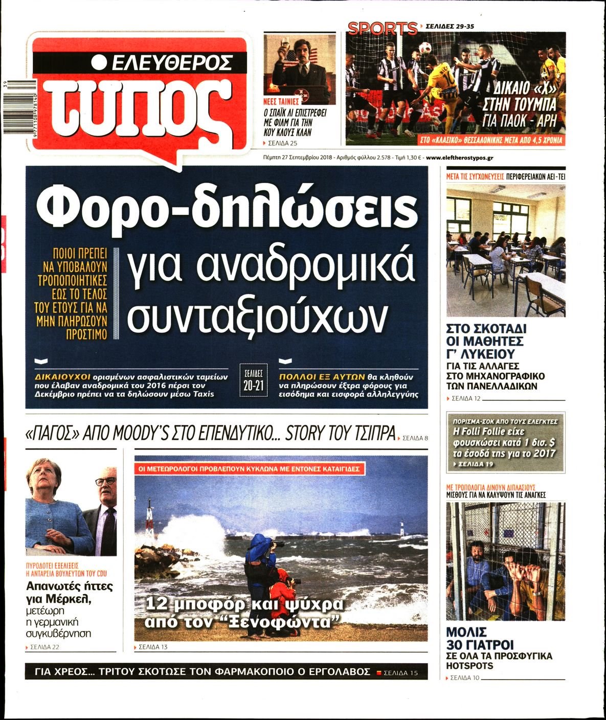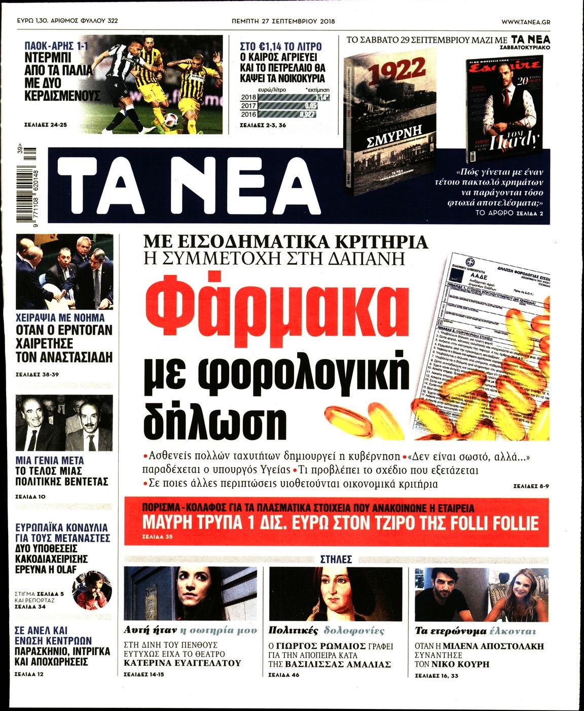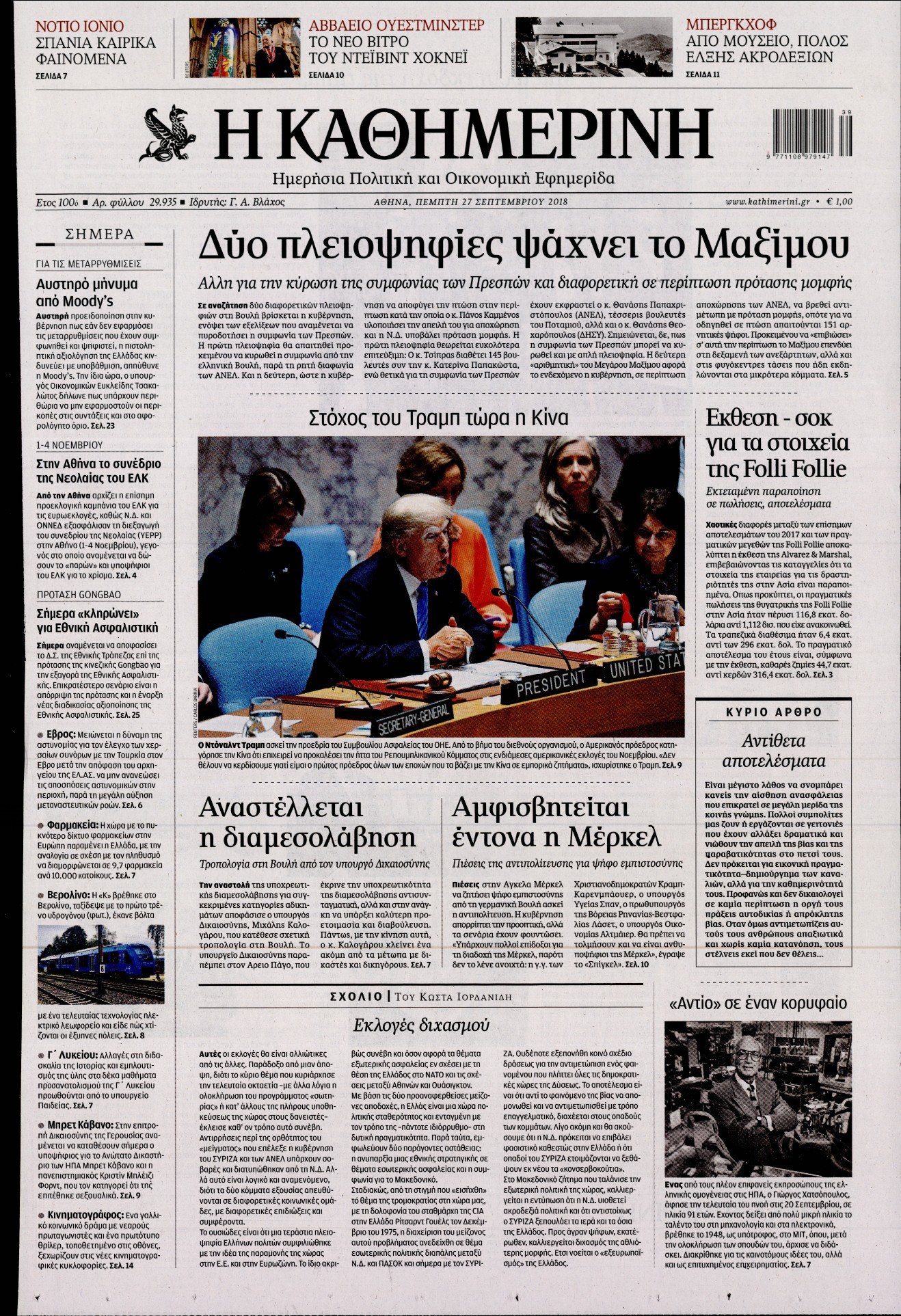 Οι πολιτικές εφημερίδες 27/9/2018 Enikos Newsroom 06:30, Πέμπτη 27 Σεπτεμβρίου 2018 Media Διαβάστε τα πρωτοσέλιδα: ΠΟΛΙΤΙΚΕΣ ΕΦΗΜΕΡΙΔΕΣ ΠΡΩΤΟΣΕΛΙΔΑ Μοιράσου το: σχολίασε κι εσύ (0 σχόλια) Ακολουθήστε το enikos.gr στο Google News και μάθετε πρώτοι όλες τις ειδήσεις Δείτε όλες τις τελευταίες ειδήσεις από την Ελλάδα και τον Κόσμο στο enikos.gr Ειδήσεις Ροή Ειδήσεων 40 λεπτά πριν Χριστούγεννα στα μπλόκα οι αγρότες: Άνοιξαν στα διόδια και μοίρασαν προϊόντα στους πολίτες – Νέα σύσκεψη την Κυριακή στη Νίκαια 1 ώρα πριν Κύκλωμα διακίνησης ναρκωτικών σε σχολεία: Τηλεφωνούσαν στους ανηλίκους την ώρα του μαθήματος – Οι διάλογοι-σοκ, τα «ψευδώνυμα» και τα βασανιστήρια 29 λεπτά πριν Αρχεία Επστάιν: Οι 500 σελίδες που λείπουν, τα αναπάντητα ερωτήματα και οι επώνυμοι – Τι έπεται 2 ώρες πριν Ζελένσκι: Μόνο οι ΗΠΑ και ο Τραμπ μπορούν να πιέσουν τη Ρωσία να βάλει τέλος στον πόλεμο 3 ώρες πριν Φοινικούντα: Προφυλακιστέος ο 30χρονος για συνέργεια στη διπλή δολοφονία – Και άλλα πρόσωπα στο «μικροσκόπιο» 2 ώρες πριν Αριθμολογία: Ο αριθμός του φύλακα αγγέλου σας, με βάση τον μήνα γέννησής σας – «Έτσι σας στέλνει σημάδια το σύμπαν» 3 ώρες πριν Πώς να απαλλαγείτε από τη μυρωδιά του τηγανητού φαγητού: Το μυστικό βρίσκεται στην κουζίνα σας 14 ώρες πριν Enerwave: Το νέο «ρεύμα» στη λιανική ενέργειας που αλλάζει την εμπειρία του καταναλωτή 1 ώρα πριν Ύπνος: Η διατροφή που μπορεί να σας βοηθήσει να κοιμάστε καλύτερα και να ζήσετε περισσότερο 10 λεπτά πριν Super League: Η βαθμολογία, μετά την ισοπαλία του Ολυμπιακού 26 λεπτά πριν Αποκαλύφθηκε το άγνωστο «GPS» της αρχαιότητας – Πώς οι ναοί «φώτιζαν» τον δρόμο των ναυτικών πριν από την εφεύρεση των φάρων 29 λεπτά πριν Αρχεία Επστάιν: Οι 500 σελίδες που λείπουν, τα αναπάντητα ερωτήματα και οι επώνυμοι – Τι έπεται 40 λεπτά πριν Χριστούγεννα στα μπλόκα οι αγρότες: Άνοιξαν στα διόδια και μοίρασαν προϊόντα στους πολίτες – Νέα σύσκεψη την Κυριακή στη Νίκαια 50 λεπτά πριν Ολυμπιακός – Κηφισιά 1-1: Δεύτερη σερί ισοπαλία για τους Ερυθρόλευκους – Υπό… αμφισβήτηση η κορυφή της Super League ENIKOS NETWORK Οι γυναίκες αποκαλύπτουν το πιο ελκυστικό πράγμα που μπορεί να κάνει ένας άνδρας Ομορφιά και αντιγήρανση: Ειδικοί μιλούν για συσκευές περιποίησης του δέρματος «Πολεμική» προετοιμασία από την ευρωπαϊκή βιομηχανία ενέργειας – Η Eurelectric ζητεί «ομπρέλα» προστασίας για τις υποδομές Ακύρωση ΑΦΜ για απάτες – Ποιους βάζει στο στόχαστρο η ΑΑΔΕ Χαρτογραφώντας το «σημείο χωρίς επιστροφή»: Για πρώτη φορά αποκαλύπτεται με λεπτομέρεια το ακανθώδες όριο της ατμόσφαιρας τ... Η Google καταργεί τη λειτουργία «dark web report» – Πώς θα μπορούν οι χρήστες να διαγράφουν τα δεδομένα τους περισσότερα 20:30 , Σάββατο 20 Δεκεμβρίου 2025 Αυτή την Κυριακή με τη Realnews: Instyle, μαζί Drive και Realnews Geopolitics Αυτή την Κυριακή με τη Realnews: Instyle, μαζί Drive και Realnews Geopolitics Instyle Η Άννα Ρ... 20:28 , Σάββατο 20 Δεκεμβρίου 2025 Ο ΑΝΤ1 γεμίζει τις γιορτές με μουσική – Ποιους καλλιτέχνες θα απολαύσουμε Φέτος στον ΑΝΤ1 γιορτάζουμε τις νύχτες μας παρέα με αγαπημένους καλλιτέχνες και μεγάλες μουσι... 18:19 , Σάββατο 20 Δεκεμβρίου 2025 HOTΕΛ ΕΛVIRA: Η Ελβίρα μαθαίνει πως ο Χάρι μένει κρυφά στο ξενοδοχείο του Παντελή Συνεχίζονται οι εκλογές για πρόεδρο, στο νέο επεισόδιο της κωμικής σειράς του MEGA, HOTΕΛ ΕΛVI... 14:04 , Σάββατο 20 Δεκεμβρίου 2025 Η Realnews αυτής της Κυριακής (21/12/2025) Με τίτλο: «Ασπίδα προστασίας για την Ελλάδα» κυκλοφορεί, αυτήν την Κυριακή, η Realnews. Σημαντ... ΤΕΛΕΥΤΑΙΕΣ ΕΙΔΗΣΕΙΣ 10 λεπτά