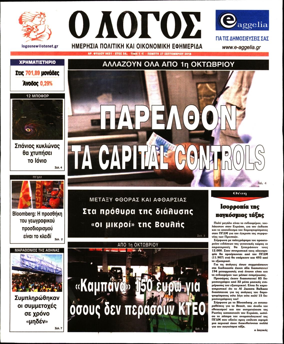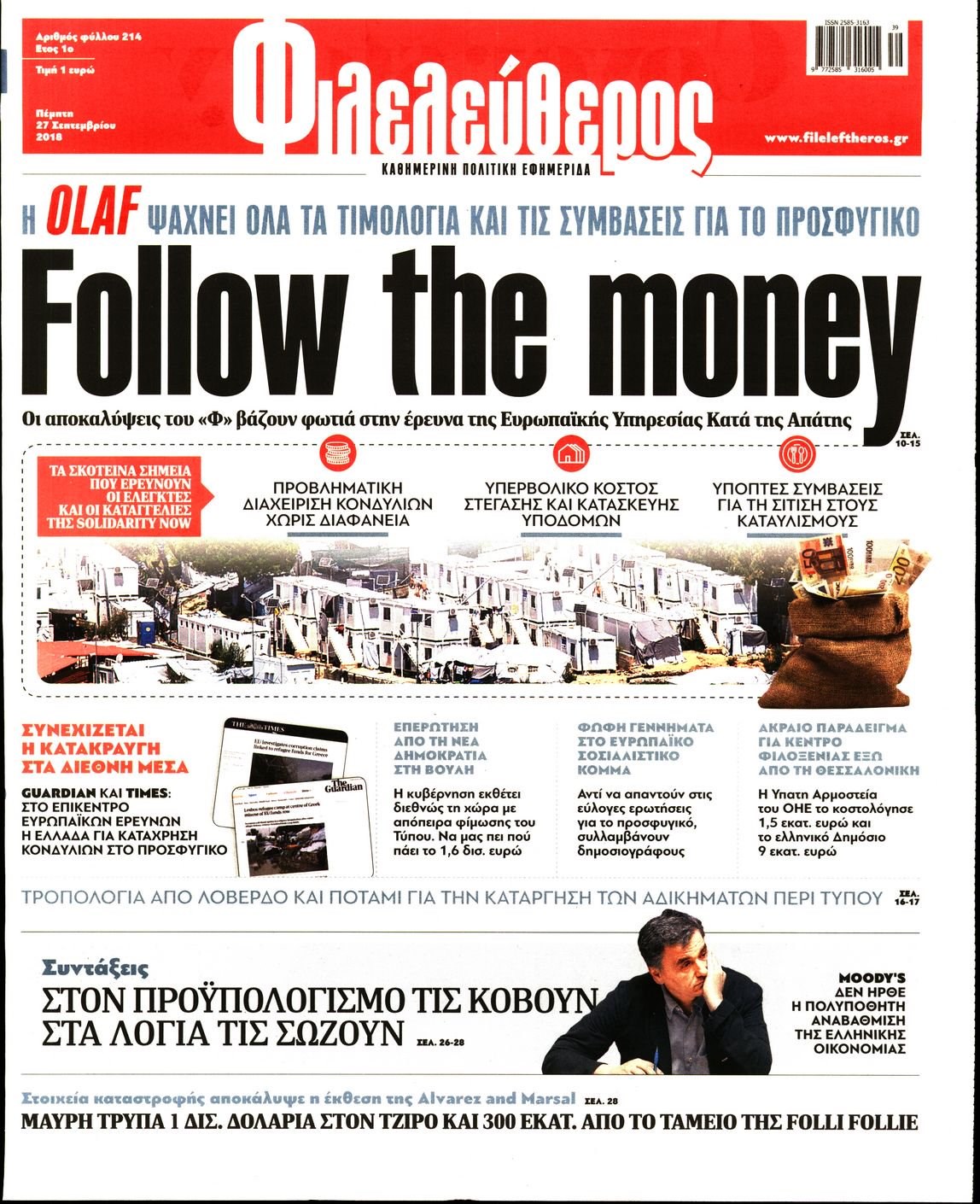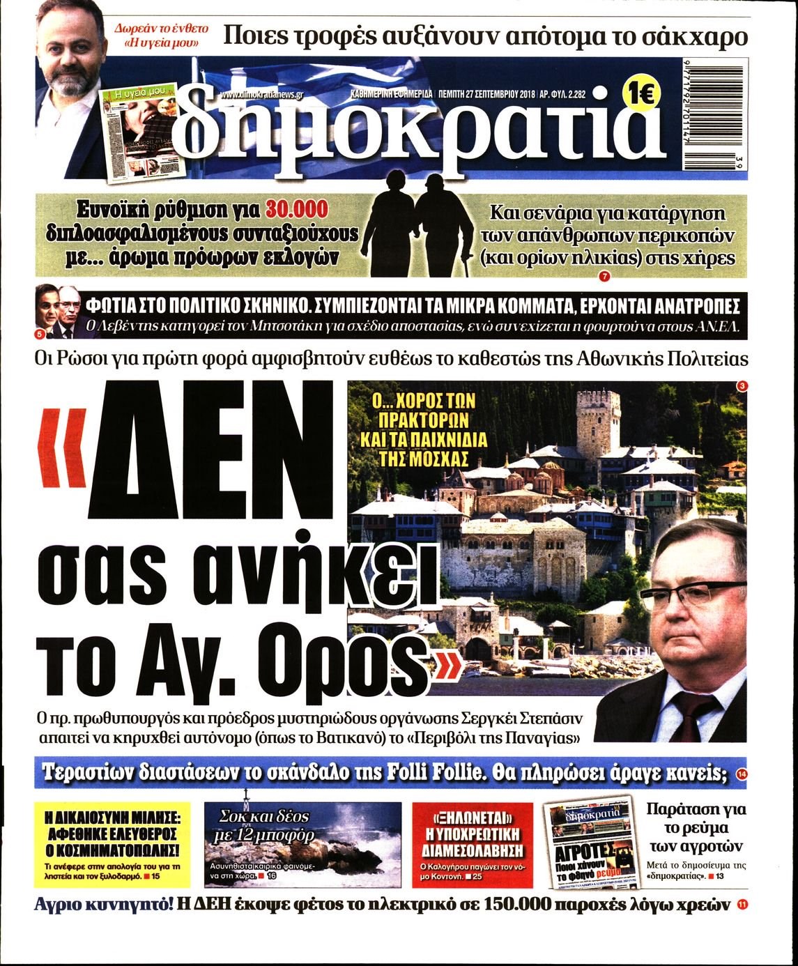 Οι πολιτικές εφημερίδες 27/9/2018 Enikos Newsroom 06:30, Πέμπτη 27 Σεπτεμβρίου 2018 Media Διαβάστε τα πρωτοσέλιδα: ΠΟΛΙΤΙΚΕΣ ΕΦΗΜΕΡΙΔΕΣ ΠΡΩΤΟΣΕΛΙΔΑ Μοιράσου το: σχολίασε κι εσύ (0 σχόλια) Ακολουθήστε το enikos.gr στο Google News και μάθετε πρώτοι όλες τις ειδήσεις Δείτε όλες τις τελευταίες ειδήσεις από την Ελλάδα και τον Κόσμο στο enikos.gr Ειδήσεις Ροή Ειδήσεων 40 λεπτά πριν Χριστούγεννα στα μπλόκα οι αγρότες: Άνοιξαν στα διόδια και μοίρασαν προϊόντα στους πολίτες – Νέα σύσκεψη την Κυριακή στη Νίκαια 1 ώρα πριν Κύκλωμα διακίνησης ναρκωτικών σε σχολεία: Τηλεφωνούσαν στους ανηλίκους την ώρα του μαθήματος – Οι διάλογοι-σοκ, τα «ψευδώνυμα» και τα βασανιστήρια 29 λεπτά πριν Αρχεία Επστάιν: Οι 500 σελίδες που λείπουν, τα αναπάντητα ερωτήματα και οι επώνυμοι – Τι έπεται 2 ώρες πριν Ζελένσκι: Μόνο οι ΗΠΑ και ο Τραμπ μπορούν να πιέσουν τη Ρωσία να βάλει τέλος στον πόλεμο 3 ώρες πριν Φοινικούντα: Προφυλακιστέος ο 30χρονος για συνέργεια στη διπλή δολοφονία – Και άλλα πρόσωπα στο «μικροσκόπιο» 2 ώρες πριν Αριθμολογία: Ο αριθμός του φύλακα αγγέλου σας, με βάση τον μήνα γέννησής σας – «Έτσι σας στέλνει σημάδια το σύμπαν» 3 ώρες πριν Πώς να απαλλαγείτε από τη μυρωδιά του τηγανητού φαγητού: Το μυστικό βρίσκεται στην κουζίνα σας 14 ώρες πριν Enerwave: Το νέο «ρεύμα» στη λιανική ενέργειας που αλλάζει την εμπειρία του καταναλωτή 1 ώρα πριν Ύπνος: Η διατροφή που μπορεί να σας βοηθήσει να κοιμάστε καλύτερα και να ζήσετε περισσότερο 10 λεπτά πριν Super League: Η βαθμολογία, μετά την ισοπαλία του Ολυμπιακού 26 λεπτά πριν Αποκαλύφθηκε το άγνωστο «GPS» της αρχαιότητας – Πώς οι ναοί «φώτιζαν» τον δρόμο των ναυτικών πριν από την εφεύρεση των φάρων 29 λεπτά πριν Αρχεία Επστάιν: Οι 500 σελίδες που λείπουν, τα αναπάντητα ερωτήματα και οι επώνυμοι – Τι έπεται 40 λεπτά πριν Χριστούγεννα στα μπλόκα οι αγρότες: Άνοιξαν στα διόδια και μοίρασαν προϊόντα στους πολίτες – Νέα σύσκεψη την Κυριακή στη Νίκαια 50 λεπτά πριν Ολυμπιακός – Κηφισιά 1-1: Δεύτερη σερί ισοπαλία για τους Ερυθρόλευκους – Υπό… αμφισβήτηση η κορυφή της Super League ENIKOS NETWORK Οι γυναίκες αποκαλύπτουν το πιο ελκυστικό πράγμα που μπορεί να κάνει ένας άνδρας Ομορφιά και αντιγήρανση: Ειδικοί μιλούν για συσκευές περιποίησης του δέρματος «Πολεμική» προετοιμασία από την ευρωπαϊκή βιομηχανία ενέργειας – Η Eurelectric ζητεί «ομπρέλα» προστασίας για τις υποδομές Ακύρωση ΑΦΜ για απάτες – Ποιους βάζει στο στόχαστρο η ΑΑΔΕ Χαρτογραφώντας το «σημείο χωρίς επιστροφή»: Για πρώτη φορά αποκαλύπτεται με λεπτομέρεια το ακανθώδες όριο της ατμόσφαιρας τ... Η Google καταργεί τη λειτουργία «dark web report» – Πώς θα μπορούν οι χρήστες να διαγράφουν τα δεδομένα τους περισσότερα 20:30 , Σάββατο 20 Δεκεμβρίου 2025 Αυτή την Κυριακή με τη Realnews: Instyle, μαζί Drive και Realnews Geopolitics Αυτή την Κυριακή με τη Realnews: Instyle, μαζί Drive και Realnews Geopolitics Instyle Η Άννα Ρ... 20:28 , Σάββατο 20 Δεκεμβρίου 2025 Ο ΑΝΤ1 γεμίζει τις γιορτές με μουσική – Ποιους καλλιτέχνες θα απολαύσουμε Φέτος στον ΑΝΤ1 γιορτάζουμε τις νύχτες μας παρέα με αγαπημένους καλλιτέχνες και μεγάλες μουσι... 18:19 , Σάββατο 20 Δεκεμβρίου 2025 HOTΕΛ ΕΛVIRA: Η Ελβίρα μαθαίνει πως ο Χάρι μένει κρυφά στο ξενοδοχείο του Παντελή Συνεχίζονται οι εκλογές για πρόεδρο, στο νέο επεισόδιο της κωμικής σειράς του MEGA, HOTΕΛ ΕΛVI... 14:04 , Σάββατο 20 Δεκεμβρίου 2025 Η Realnews αυτής της Κυριακής (21/12/2025) Με τίτλο: «Ασπίδα προστασίας για την Ελλάδα» κυκλοφορεί, αυτήν την Κυριακή, η Realnews. Σημαντ... ΤΕΛΕΥΤΑΙΕΣ ΕΙΔΗΣΕΙΣ 10 λεπτά