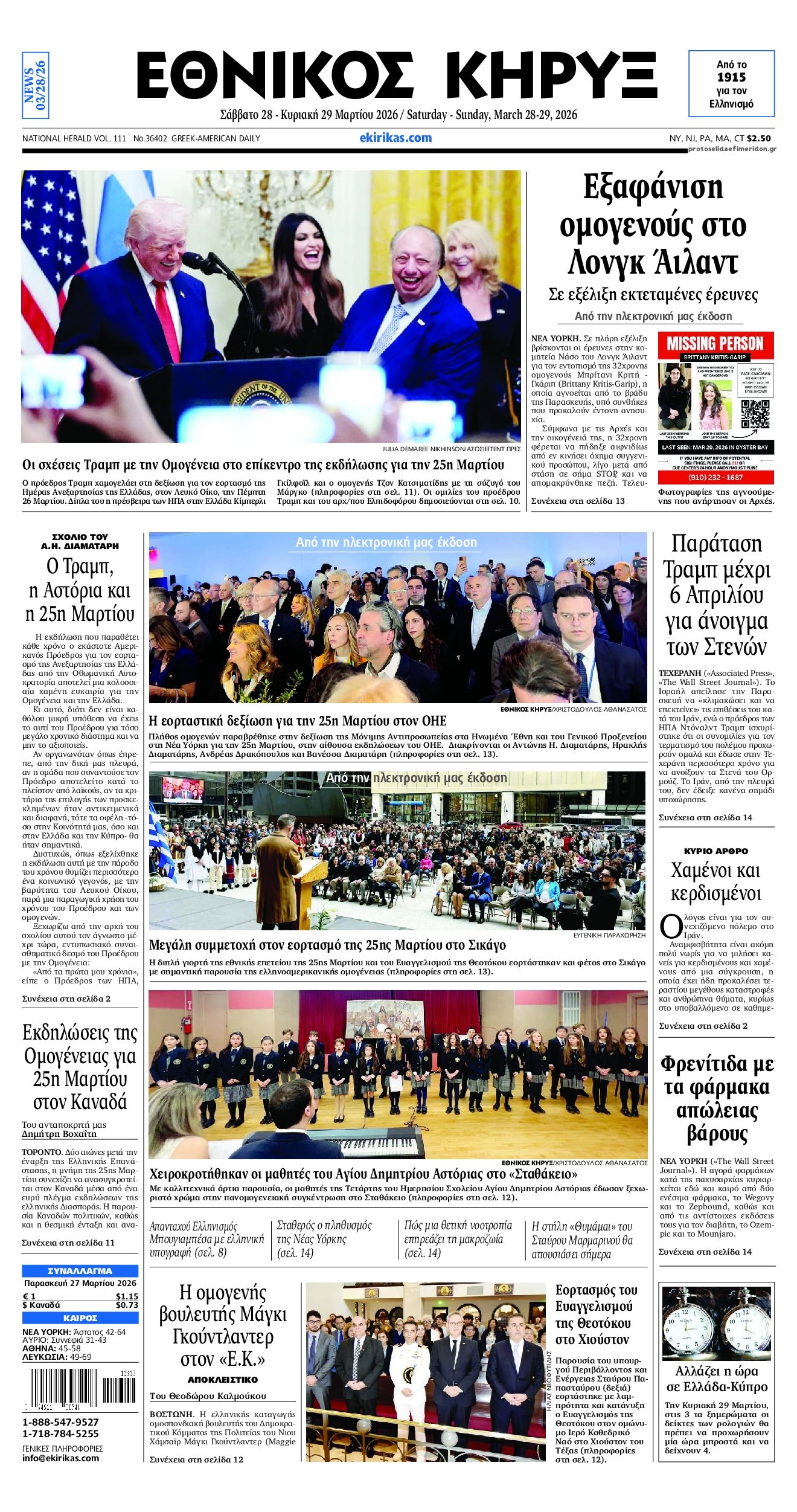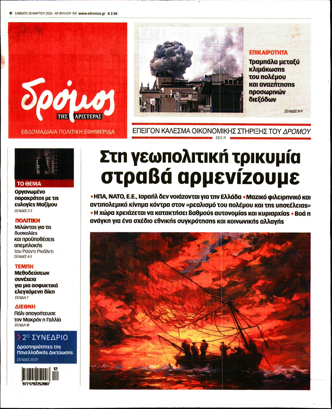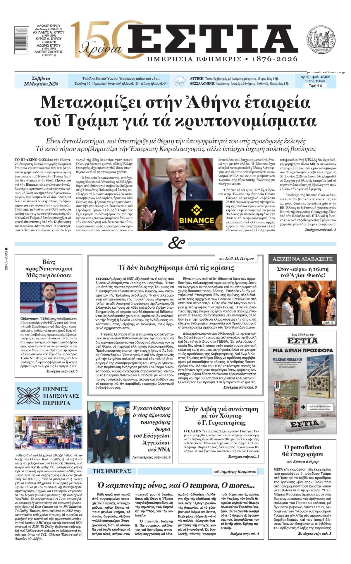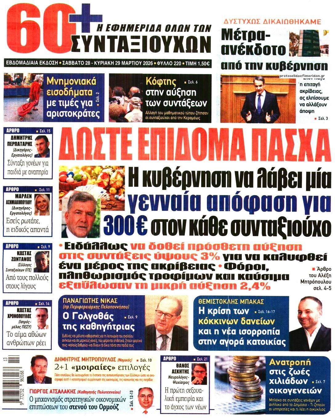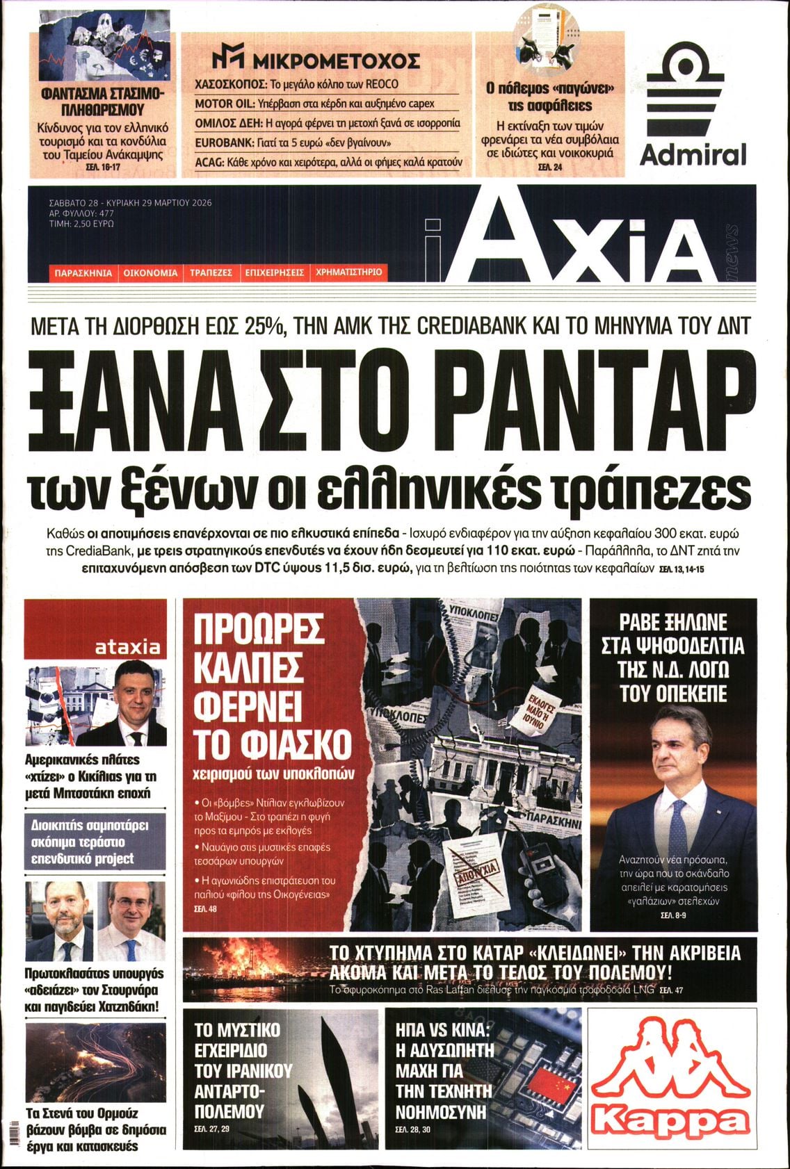 Οι πολιτικές εφημερίδες 28/3/2026 Γιωργος Λαμπρόπουλος 05:38, Σάββατο 28 Μαρτίου 2026 Media Διαβάστε τα πρωτοσέλιδα από τις πολιτικές εφημερίδες, σήμερα 28/3/2026. ΕΦΗΜΕΡΙΔΕΣ ΠΟΛΙΤΙΚΕΣ ΕΦΗΜΕΡΙΔΕΣ Μοιράσου το: Ο Στιβ Γουίτκοφ λέει ότι οι ΗΠΑ ελπίζουν σε συναντήσεις με το Ιράν «σύντομα» – «Έχουμε συμφωνία 15 σημείων στο τραπέζι, αναμένουμε απάντηση» Συνεχίζει να αυξάνεται ο αριθμός των νεκρών στη Μέση Ανατολή – Ξεπέρασαν τους 3.000 σύμφωνα με το CNN Ο στρατός του Ισραήλ αναφέρει νέους βομβαρδισμούς στην πρωτεύουσα του Ιράν σχολίασε κι εσύ (0 σχόλια) Ακολουθήστε το Enikos στο Google News και μάθετε πρώτοι όλες τις ειδήσεις Δείτε όλες τις τελευταίες ειδήσεις από την Ελλάδα και τον Κόσμο στο enikos.gr Ειδήσεις Ροή Ειδήσεων 12 λεπτά πριν LIVE – 29η ημέρα πολέμου ΗΠΑ – Ισραήλ με Ιράν – Οι εξελίξεις στη Μέση Ανατολή 51 λεπτά πριν Eπίθεση με βαλλιστικούς πυραύλους στο νότιο Ισραήλ από την Υεμένη πιθανότατα από τους Χούθι 9 ώρες πριν Πάτρα: Αρνείται να μιλήσει η μητέρα του βρέφους που νοσηλεύεται με κατάγματα και εγκαύματα – «Κλειδί» το πόρισμα του ιατροδικαστή 8 ώρες πριν Νεκρός κρατούμενος στο Α.Τ. Ομόνοιας, τι αναφέρει η Αστυνομία 10 ώρες πριν 4ο Συνέδριο ΠΑΣΟΚ – Ανδρουλάκης: «Έφτασε η ώρα για μια νέα πολιτική αλλαγή – Δεν υπάρχει σενάριο συνεργασίας με τη ΝΔ» 1 ώρα πριν Οπτική ψευδαίσθηση: Μόνο όσοι έχουν τέλεια όραση μπορούν να εντοπίσουν τη γάτα μέσα σε 13 δευτερόλεπτα 1 ώρα πριν Κρασί vs μπύρα: Τι δείχνει νέα μελέτη για την υγεία της καρδιάς και τη μακροζωία 4 ώρες πριν Ζώδια 28/3: Ημερήσιες προβλέψεις – Υδροχόοι, προσέξτε τι θα πείτε και πώς θα το πείτε 8 ώρες πριν Η άγνωστη μονομάχος που πάλευε με θηρία στην αρχαιότητα – Ένα ξεχασμένο ψηφιδωτό αποκάλυψε κάτι μοναδικό 1 λεπτό πριν Ανταπόκριση από Ισραήλ: Ολονύχτιο σφυροκόπημα του Ισραήλ στον νότιο Λίβανο 9 λεπτά πριν Οι αθλητικές μεταδόσεις του Σαββάτου (28/3) 12 λεπτά πριν LIVE – 29η ημέρα πολέμου ΗΠΑ – Ισραήλ με Ιράν – Οι εξελίξεις στη Μέση Ανατολή 25 λεπτά πριν Διεθνής Υπηρεσία Ατομικής Ενέργειας: «Βαθιά ανησυχία» για την 3η επίθεση σε 10 μέρες σε ιρανικό πυρηνικό σταθμό 44 λεπτά πριν ΔΕΔΔΗΕ: Διακοπές ρεύματος σήμερα (28/3) στην Αθήνα και σε άλλες 8 περιοχές της Αττικής ENIKOS NETWORK Φυτά: Το δοκιμασμένο κόλπο με το καλσόν που τα προστατεύει από το σπάσιμο και τον αέρα – Πώς να το εφαρμόσετε Το όσπριο των κινέζικων φεστιβάλ που μπορεί να ρυθμίσει το σάκχαρο και να έχει αντιφλεγμονώδη δράση ΕΛΕΤΑΕΝ: Τι δείχνουν τα νέα στοιχεία για την ανάπτυξη της αιολικής ενέργειας στην Ευρώπη «Νταντάδες της Γειτονιάς»: Νέες πληροφορίες για το πρόγραμμα – Τι είπε η Μιχαηλίδου για την Κοινωνική Αντιπαροχή και τους Κ... Jessica Adams: Πρόβλεψη σοκ από τη γνωστή αστρολόγο – Ο παγκόσμιος χάρτης θα ξαναγραφτεί το 2026 Τεστ παρατηρητικότητας: Μπορείτε να βρείτε τις 3 διαφορές στις εικόνες με ένα κοάλα σε 13 δευτερόλεπτα περισσότερα 07:09 , Σάββατο 28 Μαρτίου 2026 Οι αθλητικές μεταδόσεις του Σαββάτου (28/3) Ματς ποδοσφαίρου, μπάσκετ, βόλεϊ και πόλο περιλαμβάνει το πρόγραμμα με τις αθλητικές μεταδόσει... 05:48 , Σάββατο 28 Μαρτίου 2026 Οι οικονομικές εφημερίδες 28/3/2026 Διαβάστε τα πρωτοσέλιδα από τις οικονομικές εφημερίδες, σήμερα 28/3/2026. 17:50 , Παρασκευή 27 Μαρτίου 2026 Μάνος Νιφλής: «Καμία συζήτηση για την επόμενη τηλεοπτική σεζόν – Συνεχίζουμε με τον Γιάννη στο OPEN» Για τη φετινή τηλεοπτική σεζόν, την επόμενη χρονιά και τα νούμερα τηλεθέασης μίλησε στην εκπομ... 15:15 , Παρασκευή 27 Μαρτίου 2026 Την Κυριακ