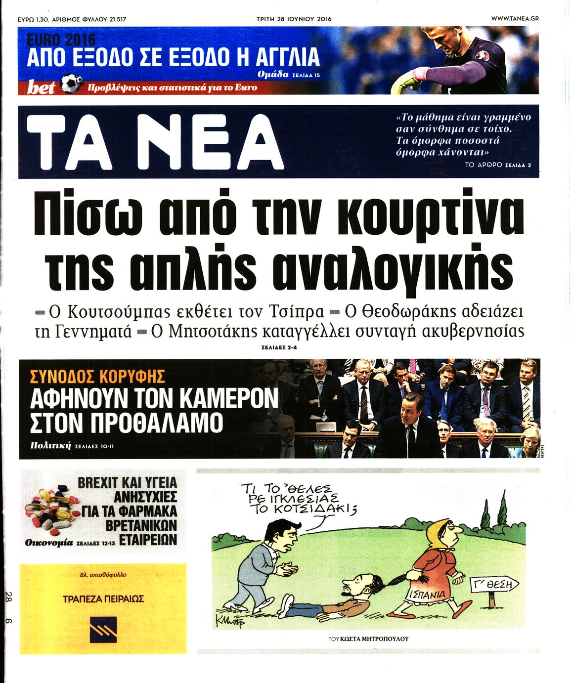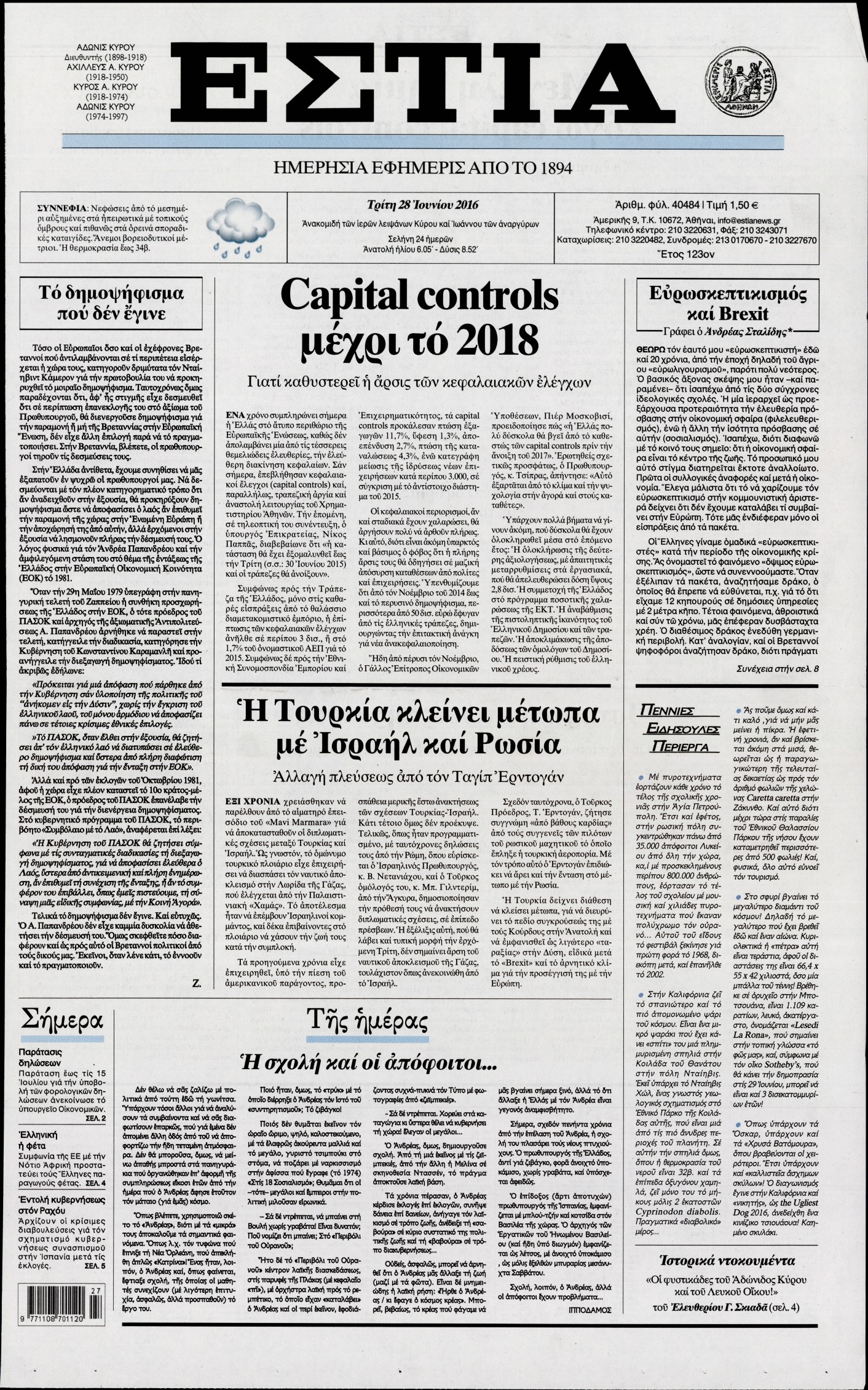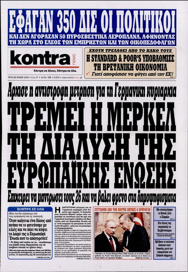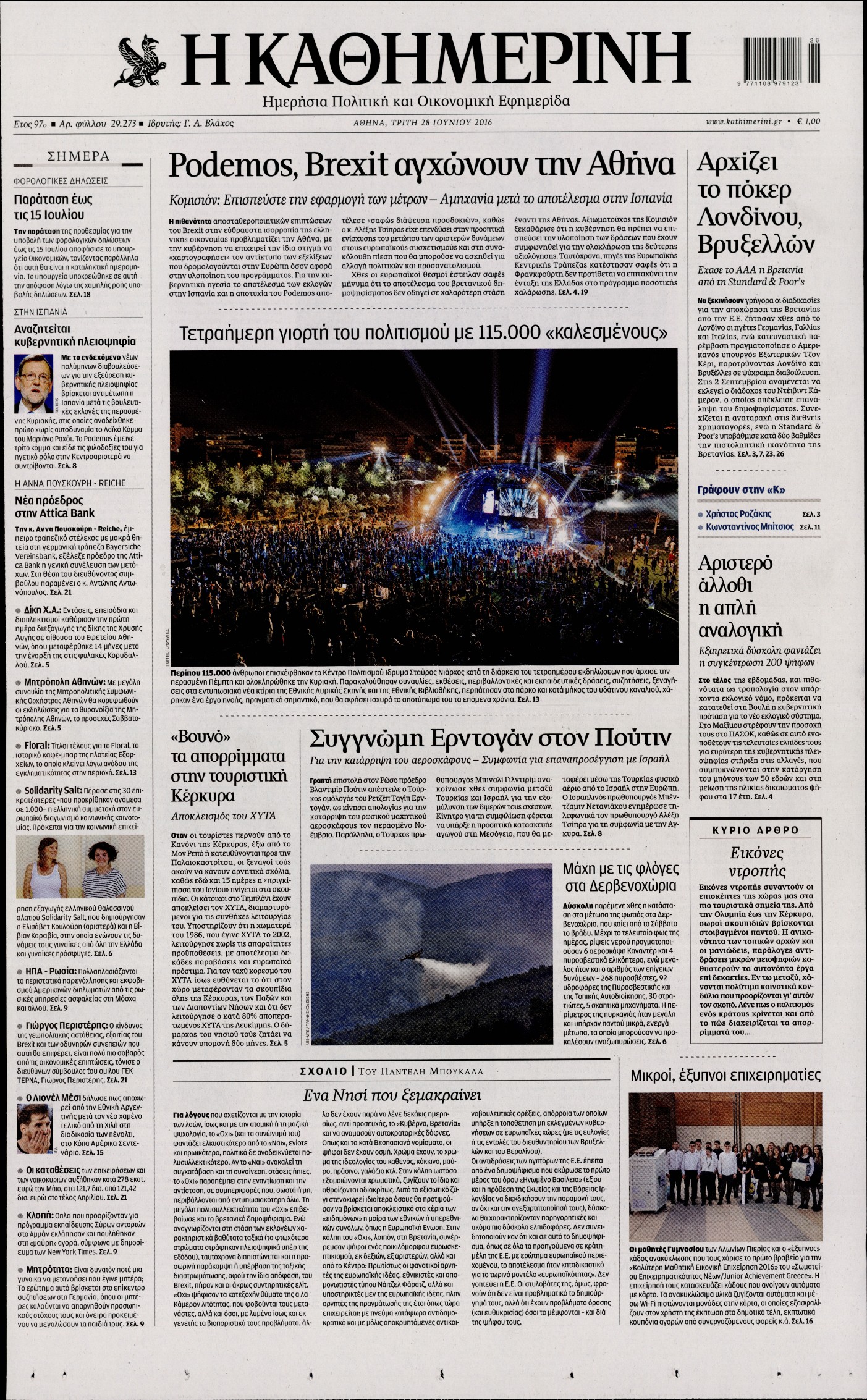 Oι πολιτικές εφημερίδες 28-6-2016 Enikos Newsroom 05:04, Τρίτη 28 Ιουνίου 2016 Media Διαβάστε τα σημερινά πρωτοσέλιδα των πολιτικών εφημερίδων: ΠΟΛΙΤΙΚΕΣ ΕΦΗΜΕΡΙΔΕΣ ΠΡΩΤΟΣΕΛΙΔΑ Μοιράσου το: σχολίασε κι εσύ (0 σχόλια) Ακολουθήστε το enikos.gr στο Google News και μάθετε πρώτοι όλες τις ειδήσεις Δείτε όλες τις τελευταίες ειδήσεις από την Ελλάδα και τον Κόσμο στο enikos.gr Ειδήσεις Ροή Ειδήσεων 2 ώρες πριν Άνοιξαν οι σήραγγες των Τεμπών – Οι επόμενες κινήσεις των αγροτών πριν από τα Χριστούγεννα 5 ώρες πριν Χριστουγεννιάτικο «θαύμα» στη Φουρνά Ευρυτανίας: Πώς γέμισε ξανά με παιδικά χαμόγελα – «Νιώθω περήφανη» λέει η δασκάλα που «ανέστησε» το ορεινό χωριό 2 ώρες πριν Κώστας Ανεστίδης: Πληροφορίες ότι εστάλη εισαγγελική διάταξη για δέσμευση των περιουσιακών στοιχείων του 2 ώρες πριν Νέα Δημοκρατία: Ανακοινώθηκαν 6 ονόματα για τα ψηφοδέλτια των εκλογών του 2027 2 ώρες πριν Πέθανε ο τραγουδιστής Chris Rea σε ηλικία 74 ετών 3 ώρες πριν Αυτό το ζώδιο θα ξαναγεννηθεί το 2026 – «Αφήνετε τις δυσκολίες στο παρελθόν και κάνετε restart» 8 ώρες πριν Έχετε κρατήσει αυτά 8 αντικείμενα από την παιδική ηλικία σας; Δείτε τι αποκαλύπτει για τον χαρακτήρα σας 2 ημέρες πριν Enerwave: Το νέο «ρεύμα» στη λιανική ενέργειας που αλλάζει την εμπειρία του καταναλωτή 4 ώρες πριν Ιστορική ανακάλυψη στη Φυσική – Επιβεβαιώθηκε η ύπαρξη του «δεύτερου ήχου» 5 λεπτά πριν Μάριος Ηλιόπουλος: «Πόσα γκολ πρέπει να πετύχει μια ομάδα για να μετρήσουν τα μισά ή και λιγότερα;» 6 λεπτά πριν LIVE η κίνηση: Κυκλοφοριακή συμφόρηση σε Κηφισό, Κηφισίας και στο κέντρο της Αθήνας – Μεγάλες καθυστερήσεις και στην Αττική Οδό 11 λεπτά πριν Αγρότες άδειασαν 4 τόνους κοπριάς έξω από το κτίριο της Περιφέρειας Δυτικής Μακεδονίας – Δείτε βίντεο 17 λεπτά πριν Όλγα Βλαχοπούλου για τη μάχη της με τον καρκίνο: «Το λέω τώρα και συγκινούμαι γιατί ήταν μια δύσκολη διαδικασία…» 23 λεπτά πριν Κατ’ ιδίαν συνάντηση Μητσοτάκη – Νετανιάχου στην Ιερουσαλήμ ENIKOS NETWORK ΕΟΦ: Ανάκληση παρτίδων καλλυντικών προϊόντων Ο ΙΣΑ στηρίζει την έγκυρη ενημέρωση για τα μυοσκελετικά νοσήματα Ευλογιά αιγοπροβάτων: Πόσα χρήματα δίνει το υπουργείο Αγροτικής Ανάπτυξης στις Περιφέρειες για λειτουργικές δαπάνες Τουρισμός: Στα 22,38 δισ. ευρώ τα έσοδα στο 10μηνο – Δείτε αναλυτικά τα στοιχεία της Τράπεζας της Ελλάδας Ο Google Assistant θα παραμείνει λίγο περισσότερο για ορισμένους χρήστες Android Τεστ προσωπικότητας: Το βάζο που θα επιλέξετε αποκαλύπτει πώς λύνετε προβλήματα στη ζωή σας περισσότερα 17:48 , Δευτέρα 22 Δεκεμβρίου 2025 Βελτιωτικές κινήσεις με νέους συνεργάτες Στοχευμένες κινήσεις για την ενίσχυση του «Καλημέρα Ελλάδα» κάνει ο ΑΝΤ1 ενόψει της νέας χρονι... 16:56 , Δευτέρα 22 Δεκεμβρίου 2025 ALPHA: Θα επιμείνει στο μοντέλο της οικογενειακής κωμωδίας – Η νέα σειρά που έρχεται Στο μοντέλο της οικογενειακής κωμωδίας με εναλλαγή σειρών θα επιμείνει ο Alpha, σύμφωνα με την... 16:25 , Δευτέρα 22 Δεκεμβρίου 2025 Μελίνα Τσαμπάνη – Πέτρος Καλκόβαλης: Eπιστρέφουν το 2026, μέσα από τη συχνότητα του Mega Μέσα από τη συχνότητα του Mega θα επιστρέψουν το 2026 η Μελίνα Τσαμπάνη και ο Πέτρος Καλκόβαλη... 15:40 , Δευτέρα 22 Δεκεμβρίου 2025 Το «Grand Hotel» πάει «Rouk Zouk» Το «Grand Hotel» πάει… «Rouk Zouk». Με τη λάμψη του «Grand Hotel» και την παιχνιδιάρικη διάθεσ... ΤΕΛΕΥΤΑΙΕΣ ΕΙΔΗΣΕΙΣ 5 λεπτά πριν Μάριος Ηλιόπουλος: «Πόσα γκολ πρέπει να πετύχει μια... 6 λεπτά πριν LIVE η κίνηση: Κυκλοφοριακή συμφόρηση σε Κηφισό,... 11 λεπτά πριν Αγρότες άδειασαν 4 τόνους κοπριάς έξω από 