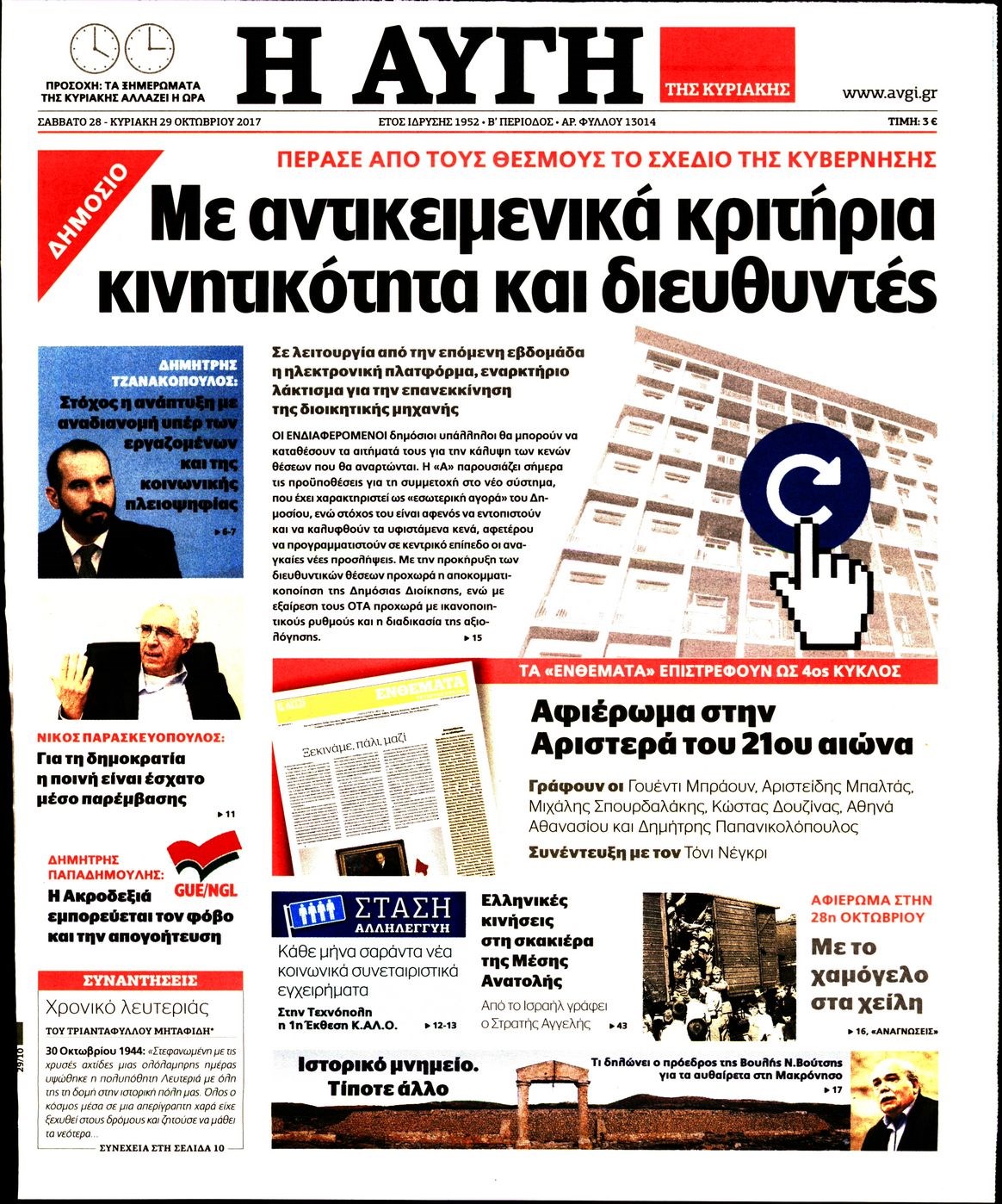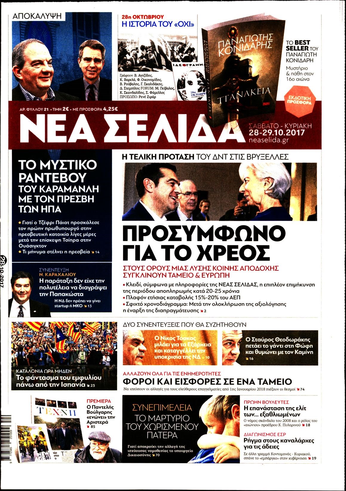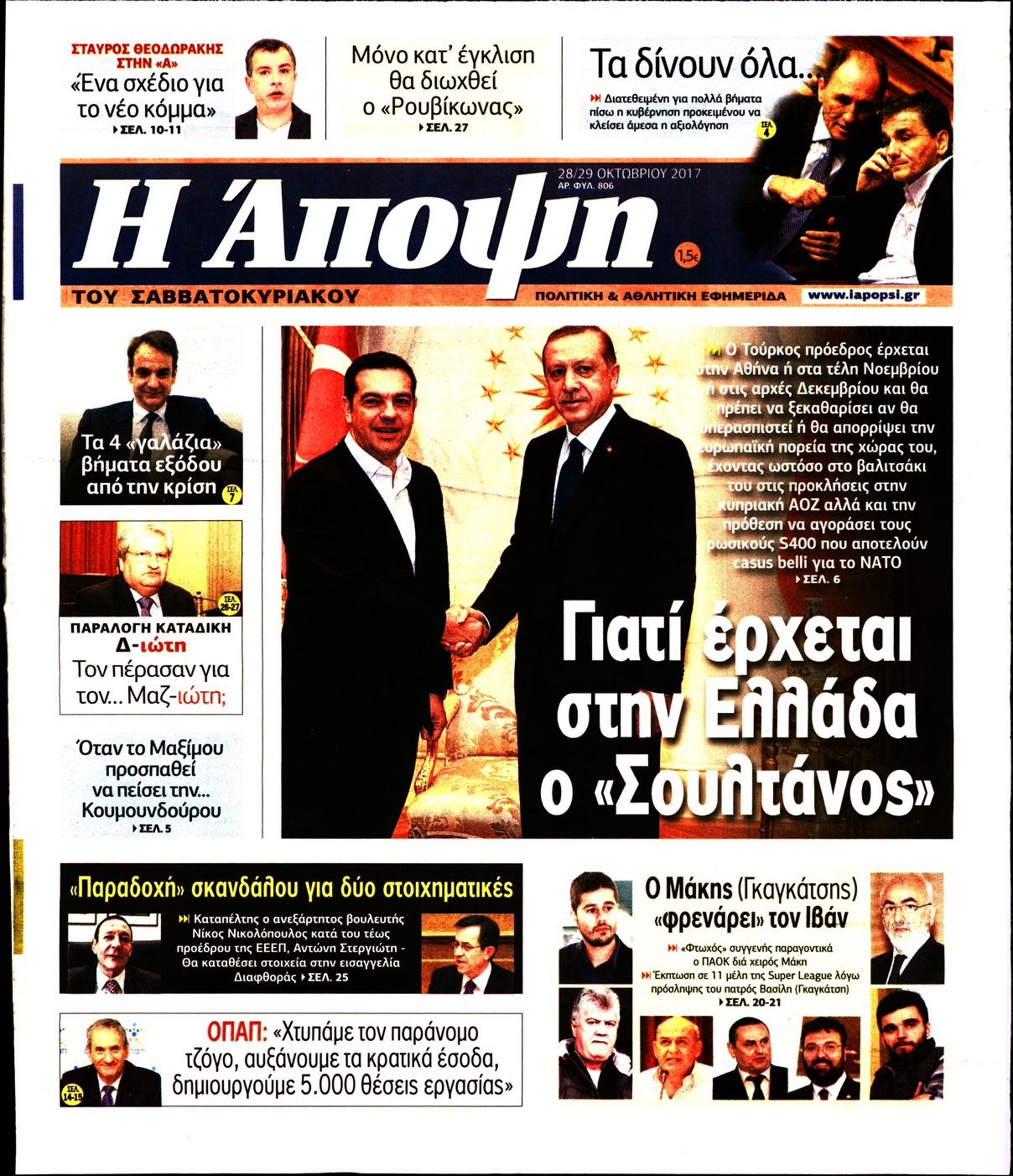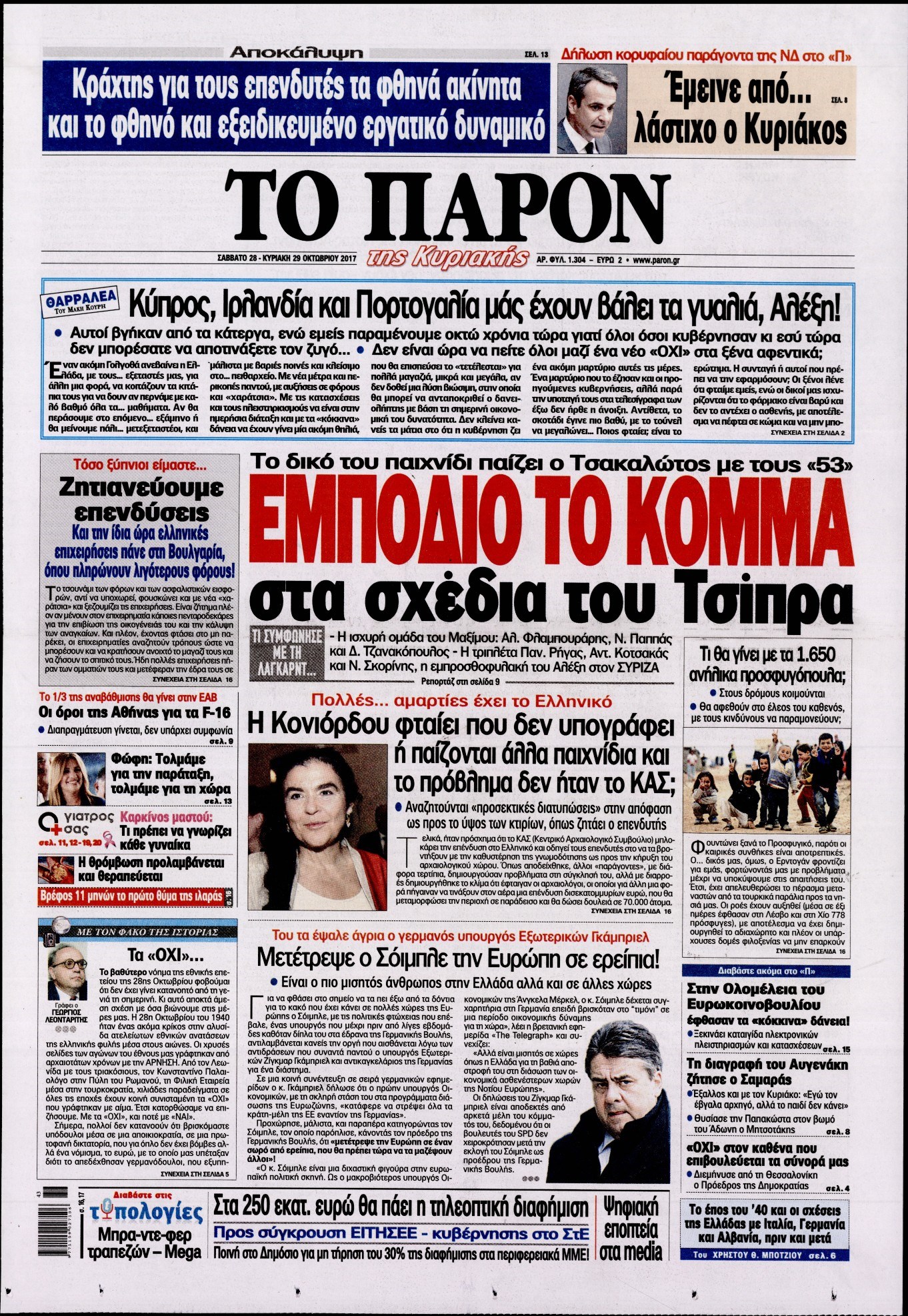 Οι πολιτικές εφημερίδες 28/10/2017 Enikos Newsroom 07:30, Σάββατο 28 Οκτωβρίου 2017 Media Διαβάστε τα σημερινά πρωτοσέλιδα των πολιτικών εφημερίδων: ΠΟΛΙΤΙΚΕΣ ΕΦΗΜΕΡΙΔΕΣ ΠΡΩΤΟΣΕΛΙΔΑ Μοιράσου το: σχολίασε κι εσύ (0 σχόλια) Ακολουθήστε το enikos.gr στο Google News και μάθετε πρώτοι όλες τις ειδήσεις Δείτε όλες τις τελευταίες ειδήσεις από την Ελλάδα και τον Κόσμο στο enikos.gr Ειδήσεις Ροή Ειδήσεων 4 ώρες πριν Χριστούγεννα στα μπλόκα: Επιμένουν στις κινητοποιήσεις τους οι αγρότες – Ανοίγουν τα διόδια το Σαββατοκύριακο 5 ώρες πριν Ουκρανία: Η άνευ προηγουμένου επίθεση σε ρωσικό τάνκερ στη Μεσόγειο και το μήνυμα προς στον Πούτιν – Το «μακρύ χέρι» του Κιέβου 4 ώρες πριν Πούτιν: Τα μηνύματα σε Ευρώπη και ΝΑΤΟ από το μαραθώνιο «σόου» του – Η απαίτηση για «σεβασμό» και η ειρήνη «με τους όρους» της Μόσχας 5 ώρες πριν Τραμπ: Δεν αποκλείει την πιθανότητα ενός πολέμου στη Βενεζουέλα – «Ο Μαδούρο ξέρει καλύτερα από τον καθένα τι ακριβώς θέλω» 5 ώρες πριν Συνεχίζει να προκαλεί ο Μίτσκοσκι: «Για μένα το όνομα Μακεδονία είναι ιερό» 4 ώρες πριν Ανακαλύφθηκαν αρχαία χρυσά νομίσματα 2.200 ετών που απεικονίζουν τον θεό Απόλλωνα – Η άγνωστη σύνδεση με τον Φίλιππο Β΄ της Μακεδονίας 5 ώρες πριν Ύπνος: Μια κρυφή κατάσταση του εγκεφάλου πριν από τον ύπνο μπορεί να είναι το “κλειδί” για υψηλή ευφυΐα και δημιουργικότητα 6 ώρες πριν Αριθμολογία: Οι άνθρωποι που έχουν γεννηθεί αυτές τις 4 ημερομηνίες, συχνά παρεξηγούνται – «Η καλοσύνη τους κρύβει τεράστια δύναμη» 7 ώρες πριν Ξεχάστε το καθάρισμα το Σαββατοκύριακο: Ο «κανόνας των 20 λεπτών» που θα σας λύσει τα χέρια 23 λεπτά πριν Θεσσαλονίκη: Εξαφανίστηκε 13χρονος από χώρο φιλοξενίας ασυνόδευτων ανηλίκων στο Ωραιόκαστρο 33 λεπτά πριν Ντόναλντ Τραμπ: «Πολύ βαριά αντίποινα» στη Συρία – «Πλήττουμε πολύ δυνατά οχυρά του Ισλαμικού Κράτους» 48 λεπτά πριν Εξάρχεια: Ένταση με μολότοφ, χημικά και κρότου λάμψης 1 ώρα πριν ΗΠΑ: Τραγωδία στην Αλαμπάμα – Σκότωσε την δημοσιογράφο σύζυγό του και αυτοκτόνησε μπροστά στον 3χρονο γιο τους 1 ώρα πριν Πρόταση γάμου στο ΣΕΦ κατά την διάρκεια του αγώνα Ολυμπιακός-Βιλερμπάν – Δείτε βίντεο ENIKOS NETWORK Το ΕΚΑΒ τιμήθηκε από την Ακαδημία Αθηνών για τα 40 χρόνια προσφοράς του Έχετε πραγματικά μεγάλη καρδιά; 10 χαρακτηριστικά όσων έχουν καλοσύνη Αναστολή μέτρων αναγκαστικής εκτέλεσης για κτηνοτρόφους που πλήττονται από την ευλογιά των αιγοπροβάτων Πλήρης επάρκεια προϊόντων στις λαϊκές της Αττικής, παρά τις αγροτικές κινητοποιήσεις – Τι απαντούν οι πωλητές Χαρτογραφώντας το «σημείο χωρίς επιστροφή»: Για πρώτη φορά αποκαλύπτεται με λεπτομέρεια το ακανθώδες όριο της ατμόσφαιρας τ... Η Google καταργεί τη λειτουργία «dark web report» – Πώς θα μπορούν οι χρήστες να διαγράφουν τα δεδομένα τους περισσότερα 22:42 , Παρασκευή 19 Δεκεμβρίου 2025 Γιώργος Γιαννόπουλος για “Το σόι σου”: “Είναι ευτυχία και ευλογία αυτή η σειρά” «Είναι ευτυχία και ευλογία η συγκυρία αυτής της σειράς», θα πει ο Γιώργος Γιαννόπουλος -ο αγαπ... 20:37 , Παρασκευή 19 Δεκεμβρίου 2025 Don’t Forget The Lyrics: Η Έλλη Κοκκίνου υποδέχεται 4 παίκτες που θα κάνουν τα πάντα για να μη χάσουν ούτε… μισή λέξη από τους στίχους Το «Don’t Forget The Lyrics» επιστρέφει απόψε, Παρασκευή 19 Δεκεμβρίου, στις 21:00 με νέο επει... 19:31 , Παρασκευή 19 Δεκεμβρίου 2025 GNTM: Απόψε ο μεγάλος τελικός για τους 4 φιναλίστ Έπειτα από μήνες γεμάτους μόδα, δημιουργία και έντονες αναμετρήσεις, το GNTM 2025 κορυφώνεται,... 18:11 , Παρασκευή 19 Δεκεμβρίου 2025 Το 