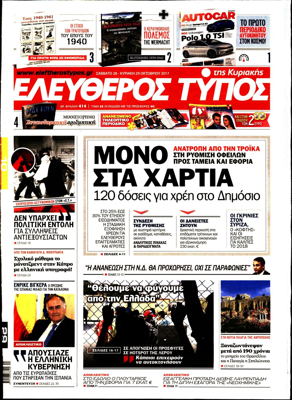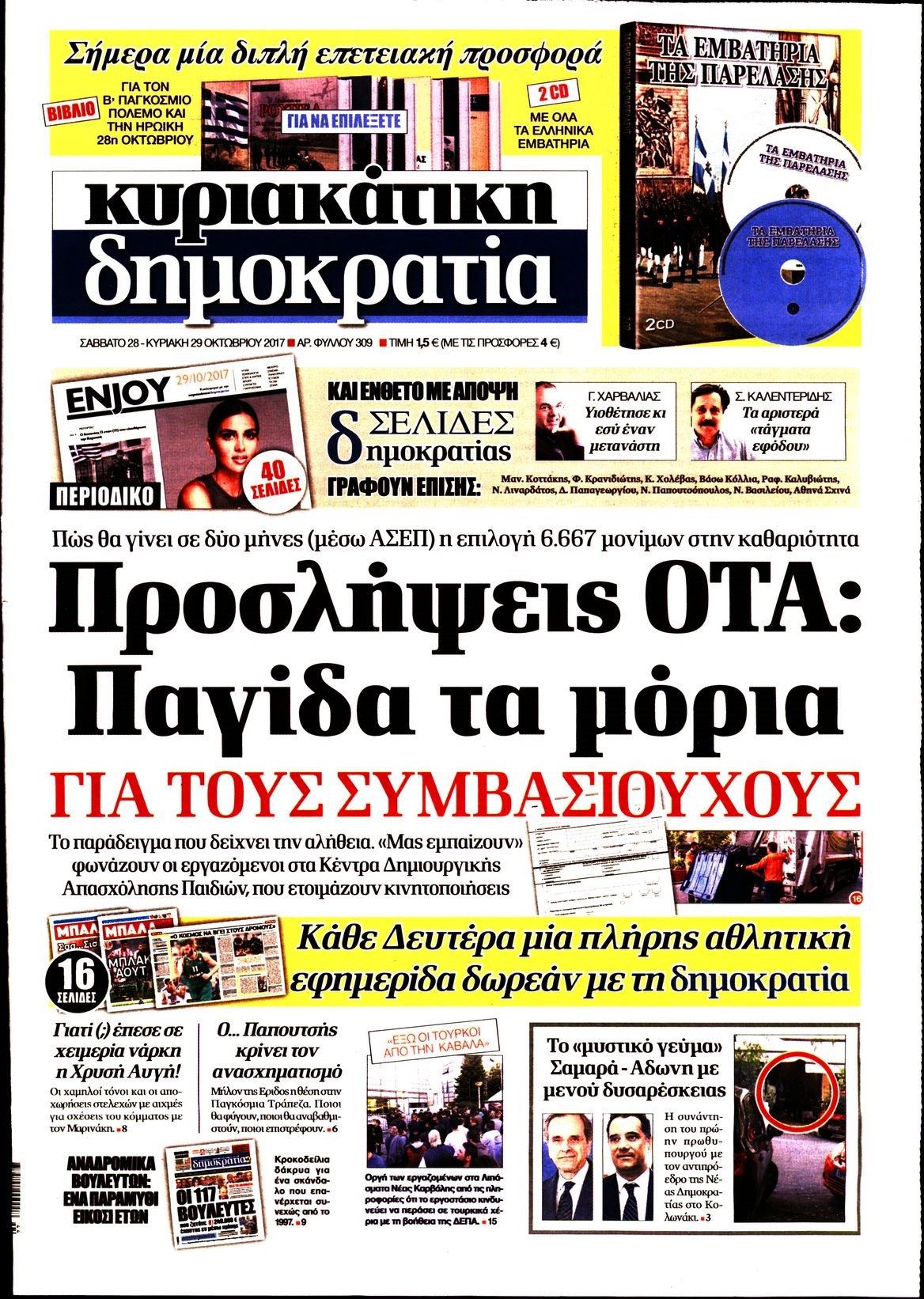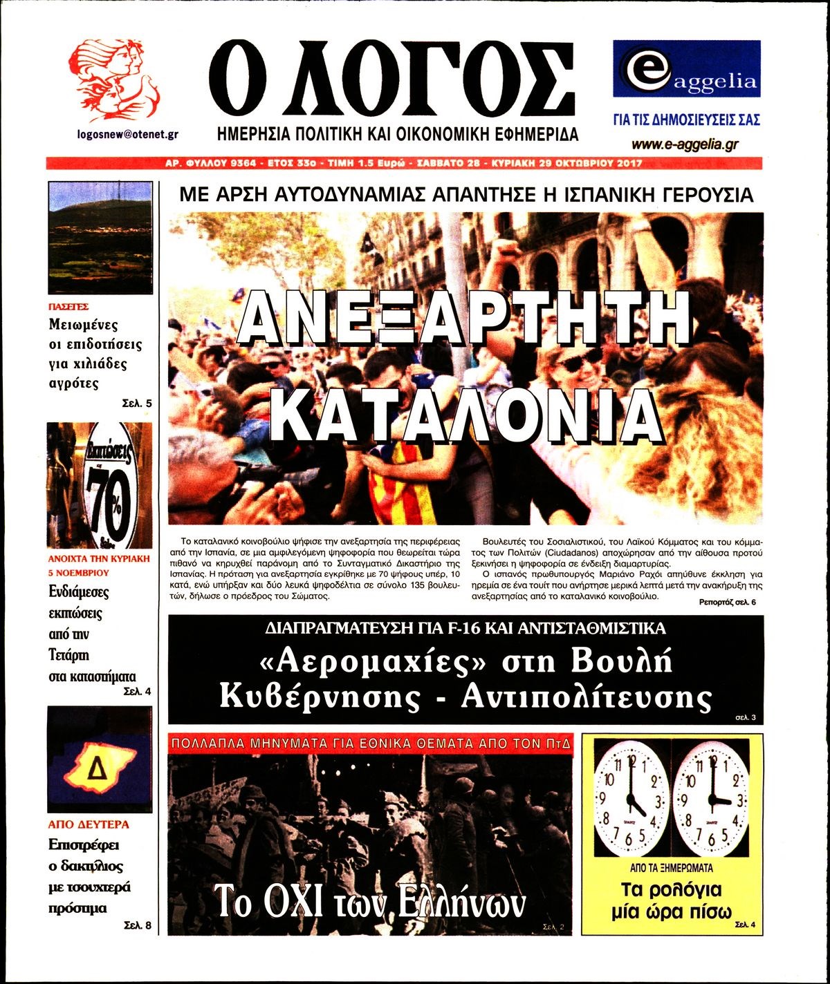 Οι πολιτικές εφημερίδες 28/10/2017 Enikos Newsroom 07:30, Σάββατο 28 Οκτωβρίου 2017 Media Διαβάστε τα σημερινά πρωτοσέλιδα των πολιτικών εφημερίδων: ΠΟΛΙΤΙΚΕΣ ΕΦΗΜΕΡΙΔΕΣ ΠΡΩΤΟΣΕΛΙΔΑ Μοιράσου το: σχολίασε κι εσύ (0 σχόλια) Ακολουθήστε το enikos.gr στο Google News και μάθετε πρώτοι όλες τις ειδήσεις Δείτε όλες τις τελευταίες ειδήσεις από την Ελλάδα και τον Κόσμο στο enikos.gr Ειδήσεις Ροή Ειδήσεων 4 ώρες πριν Χριστούγεννα στα μπλόκα: Επιμένουν στις κινητοποιήσεις τους οι αγρότες – Ανοίγουν τα διόδια το Σαββατοκύριακο 5 ώρες πριν Ουκρανία: Η άνευ προηγουμένου επίθεση σε ρωσικό τάνκερ στη Μεσόγειο και το μήνυμα προς στον Πούτιν – Το «μακρύ χέρι» του Κιέβου 4 ώρες πριν Πούτιν: Τα μηνύματα σε Ευρώπη και ΝΑΤΟ από το μαραθώνιο «σόου» του – Η απαίτηση για «σεβασμό» και η ειρήνη «με τους όρους» της Μόσχας 5 ώρες πριν Τραμπ: Δεν αποκλείει την πιθανότητα ενός πολέμου στη Βενεζουέλα – «Ο Μαδούρο ξέρει καλύτερα από τον καθένα τι ακριβώς θέλω» 5 ώρες πριν Συνεχίζει να προκαλεί ο Μίτσκοσκι: «Για μένα το όνομα Μακεδονία είναι ιερό» 4 ώρες πριν Ανακαλύφθηκαν αρχαία χρυσά νομίσματα 2.200 ετών που απεικονίζουν τον θεό Απόλλωνα – Η άγνωστη σύνδεση με τον Φίλιππο Β΄ της Μακεδονίας 5 ώρες πριν Ύπνος: Μια κρυφή κατάσταση του εγκεφάλου πριν από τον ύπνο μπορεί να είναι το “κλειδί” για υψηλή ευφυΐα και δημιουργικότητα 6 ώρες πριν Αριθμολογία: Οι άνθρωποι που έχουν γεννηθεί αυτές τις 4 ημερομηνίες, συχνά παρεξηγούνται – «Η καλοσύνη τους κρύβει τεράστια δύναμη» 7 ώρες πριν Ξεχάστε το καθάρισμα το Σαββατοκύριακο: Ο «κανόνας των 20 λεπτών» που θα σας λύσει τα χέρια 23 λεπτά πριν Θεσσαλονίκη: Εξαφανίστηκε 13χρονος από χώρο φιλοξενίας ασυνόδευτων ανηλίκων στο Ωραιόκαστρο 33 λεπτά πριν Ντόναλντ Τραμπ: «Πολύ βαριά αντίποινα» στη Συρία – «Πλήττουμε πολύ δυνατά οχυρά του Ισλαμικού Κράτους» 48 λεπτά πριν Εξάρχεια: Ένταση με μολότοφ, χημικά και κρότου λάμψης 1 ώρα πριν ΗΠΑ: Τραγωδία στην Αλαμπάμα – Σκότωσε την δημοσιογράφο σύζυγό του και αυτοκτόνησε μπροστά στον 3χρονο γιο τους 1 ώρα πριν Πρόταση γάμου στο ΣΕΦ κατά την διάρκεια του αγώνα Ολυμπιακός-Βιλερμπάν – Δείτε βίντεο ENIKOS NETWORK Το ΕΚΑΒ τιμήθηκε από την Ακαδημία Αθηνών για τα 40 χρόνια προσφοράς του Έχετε πραγματικά μεγάλη καρδιά; 10 χαρακτηριστικά όσων έχουν καλοσύνη Αναστολή μέτρων αναγκαστικής εκτέλεσης για κτηνοτρόφους που πλήττονται από την ευλογιά των αιγοπροβάτων Πλήρης επάρκεια προϊόντων στις λαϊκές της Αττικής, παρά τις αγροτικές κινητοποιήσεις – Τι απαντούν οι πωλητές Χαρτογραφώντας το «σημείο χωρίς επιστροφή»: Για πρώτη φορά αποκαλύπτεται με λεπτομέρεια το ακανθώδες όριο της ατμόσφαιρας τ... Η Google καταργεί τη λειτουργία «dark web report» – Πώς θα μπορούν οι χρήστες να διαγράφουν τα δεδομένα τους περισσότερα 22:42 , Παρασκευή 19 Δεκεμβρίου 2025 Γιώργος Γιαννόπουλος για “Το σόι σου”: “Είναι ευτυχία και ευλογία αυτή η σειρά” «Είναι ευτυχία και ευλογία η συγκυρία αυτής της σειράς», θα πει ο Γιώργος Γιαννόπουλος -ο αγαπ... 20:37 , Παρασκευή 19 Δεκεμβρίου 2025 Don’t Forget The Lyrics: Η Έλλη Κοκκίνου υποδέχεται 4 παίκτες που θα κάνουν τα πάντα για να μη χάσουν ούτε… μισή λέξη από τους στίχους Το «Don’t Forget The Lyrics» επιστρέφει απόψε, Παρασκευή 19 Δεκεμβρίου, στις 21:00 με νέο επει... 19:31 , Παρασκευή 19 Δεκεμβρίου 2025 GNTM: Απόψε ο μεγάλος τελικός για τους 4 φιναλίστ Έπειτα από μήνες γεμάτους μόδα, δημιουργία και έντονες αναμετρήσεις, το GNTM 2025 κορυφώνεται,... 18:11 , Παρασκευή 19 Δεκεμβρίου 2025 Το 