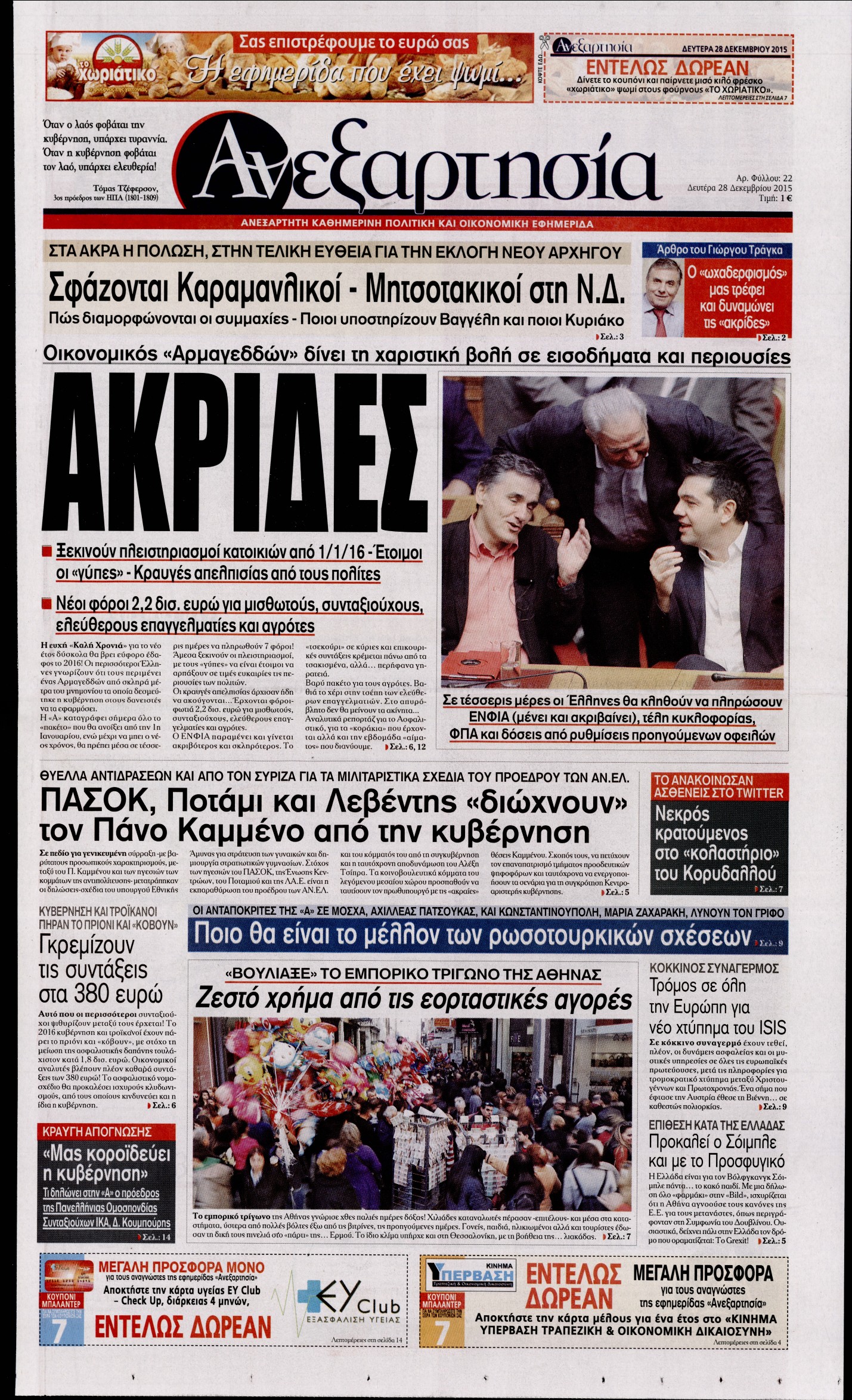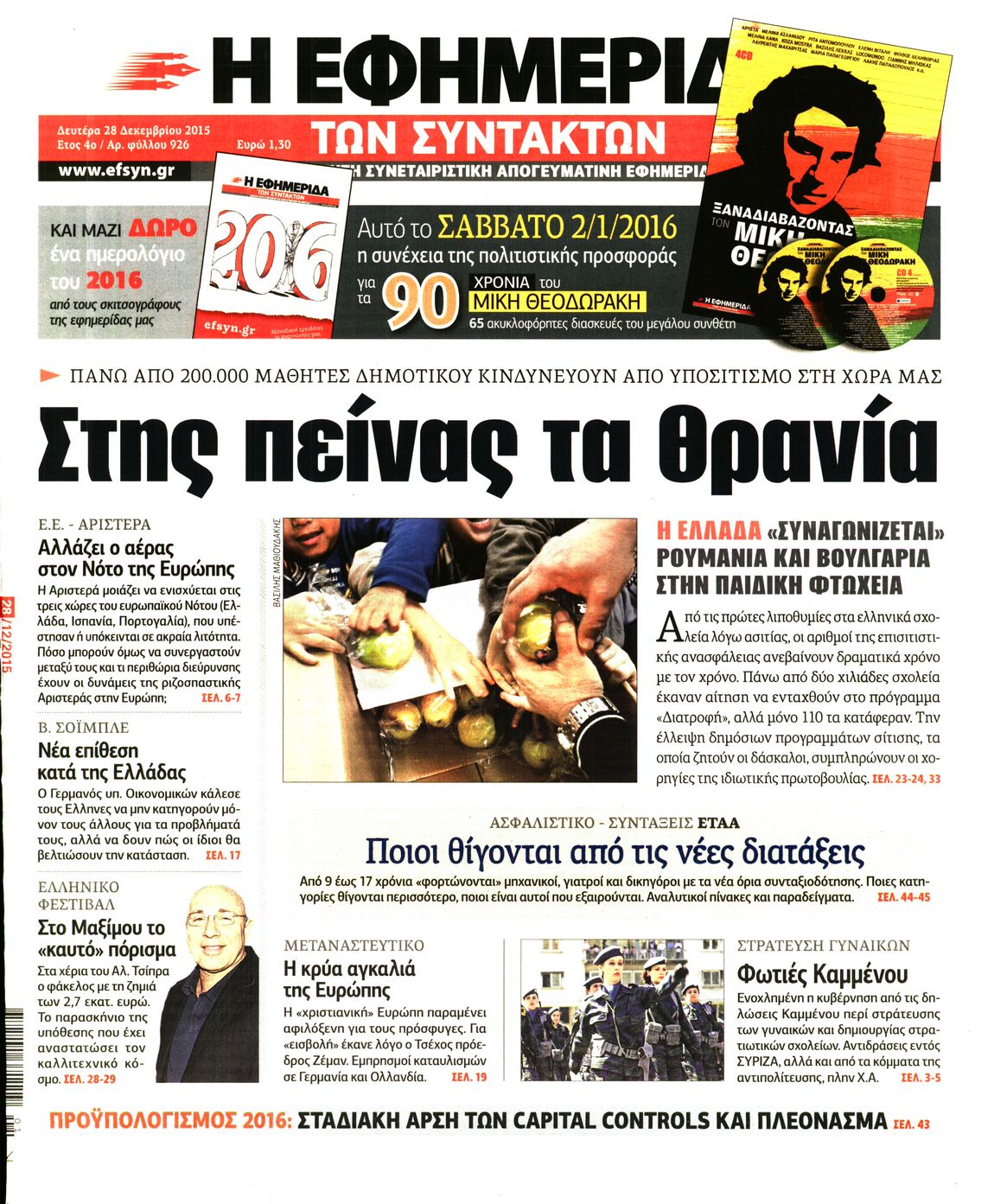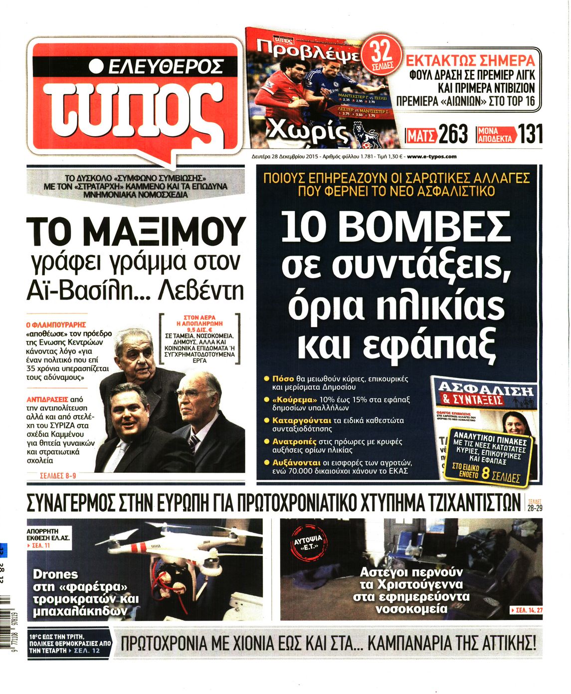 Οι πολιτικές εφημερίδες 28/12/2015 Enikos Newsroom 06:27, Δευτέρα 28 Δεκεμβρίου 2015 Media Διαβάστε τα σημερινά πρωτοσέλιδα των πολιτικών εφημερίδων: ΠΟΛΙΤΙΚΕΣ ΕΦΗΜΕΡΙΔΕΣ ΠΡΩΤΟΣΕΛΙΔΑ Μοιράσου το: σχολίασε κι εσύ (0 σχόλια) Ακολουθήστε το enikos.gr στο Google News και μάθετε πρώτοι όλες τις ειδήσεις Δείτε όλες τις τελευταίες ειδήσεις από την Ελλάδα και τον Κόσμο στο enikos.gr Ειδήσεις Ροή Ειδήσεων 2 ώρες πριν Υπόθεση Έπσταϊν: Το Υπουργείο Δικαιοσύνης δημοσιοποίησε μια σειρά από εξαιρετικά επεξεργασμένα αρχεία – «Λείπουν τα πιο σημαντικά έγγραφα», λένε οι Δημοκρατικοί 1 ώρα πριν Ο «χάρτης» με τις αυξήσεις και τις φοροελαφρύνσεις του 2026 – Ποιοι και πόσα κερδίζουν 11 ώρες πριν Χριστούγεννα στα μπλόκα: Επιμένουν στις κινητοποιήσεις τους οι αγρότες – Ανοίγουν τα διόδια το Σαββατοκύριακο 2 ώρες πριν ΟΝΕΧ – MEGATUGS: Ξεκίνησε η ναυπήγηση ρυμουλκών στην Ελλάδα – Προθάλαμος πολεμικών πλοίων – Δείτε φωτογραφίες και βίντεο 2 ώρες πριν Καιρός: Αλλαγή σκηνικού σήμερα με βροχές και πτώση της θερμοκρασίας – Οι προβλέψεις των μετεωρολόγων για τα Χριστούγεννα 4 ώρες πριν Αυγά: Πόσα μπορείτε να τρώτε την ημέρα με ασφάλεια για μέγιστη πρόσληψη πρωτεΐνης 4 ώρες πριν Οπτική ψευδαίσθηση: Μόνο αν είσαι ο Σέρλοκ Χολμς θα βρεις τον αριθμό «87» σε 7 δευτερόλεπτα 2 ώρες πριν Αρχαιολόγοι ανακάλυψαν σε χωράφι απεικόνιση 600 ετών ενός Αγίου – Τα στοιχεία που δείχνουν ότι μαρτύρησε 56 λεπτά πριν Αγχώνεται για το χριστουγεννιάτικο δώρο που πήρε στην πλούσια σύντροφό του – «Φοβάμαι πως θα το βρει φθηνιάρικο, φοράει βραχιόλια Cartier» 7 λεπτά πριν Κρήτη: «Πίεση διαρκείας» με νέες αφίξεις μεταναστών – Τρεις επιχειρήσεις διάσωσης νότια του νησιού 16 λεπτά πριν Η χήνα… που πέρασαν για κλέφτη: Έσπασε την πόρτα προκαλώντας πανικό 23 λεπτά πριν Θεσσαλονίκη: 24ωρη λειτουργία σήμερα σε μετρό και 6 λεωφορειακές γραμμές 31 λεπτά πριν «Porto Leone: Στη γειτονιά με τα κόκκινα φανάρια» – Ο Χρόνης αποκαλύπτει στην Αλεξάνδρα το μυστικό για το παιδί της Λένας 39 λεπτά πριν Νέες αιτήσεις για ίδρυση μη κρατικών πανεπιστημίων στο πρώτο δίμηνο του 2026 – Τι είπε η Ζαχαράκη ENIKOS NETWORK Είστε μόνιμα απρόσεκτοι; 3 σημάδια που δείχνουν ότι μπορεί να είναι σύμπτωμα πάθησης Πόσα κιλά παίρνουμε πραγματικά τα Χριστούγεννα, σύμφωνα με την επιστήμη – Πώς να το αποτρέψουμε; Mega χριστουγεννιάτικη φορολοταρία: «Κλείδωσε» η ημερομηνία για την κλήρωση – Ερωτήσεις και απαντήσεις Αναστολή μέτρων αναγκαστικής εκτέλεσης για κτηνοτρόφους που πλήττονται από την ευλογιά των αιγοπροβάτων Χαρτογραφώντας το «σημείο χωρίς επιστροφή»: Για πρώτη φορά αποκαλύπτεται με λεπτομέρεια το ακανθώδες όριο της ατμόσφαιρας τ... Η Google καταργεί τη λειτουργία «dark web report» – Πώς θα μπορούν οι χρήστες να διαγράφουν τα δεδομένα τους περισσότερα 09:30 , Σάββατο 20 Δεκεμβρίου 2025 «Porto Leone: Στη γειτονιά με τα κόκκινα φανάρια» – Ο Χρόνης αποκαλύπτει στην Αλεξάνδρα το μυστικό για το παιδί της Λένας Η μεγάλη δραματική σειρά του Apha «Porto Leone: Στη γειτονιά με τα κόκκινα φανάρια» μας μεταφέ... 08:14 , Σάββατο 20 Δεκεμβρίου 2025 Τρομεροί γονείς: Η Μαρία Καβογιάννη εισβάλλει στο σπίτι της οικογένειας Στεφανίδη Όσα θα δούμε στο νέο διπλό επεισόδιο της σειράς «Τρομεροί γονείς», σήμερα Σάββατο 20 Δεκεμβρίο... 05:48 , Σάββατο 20 Δεκεμβρίου 2025 Οι οικονομικές εφημερίδες 20/12/2025 Διαβάστε τα πρωτοσέλιδα από τις οικονομικές εφημερίδες, σήμερα 20/12/2025. 05:43 , Σάββατο 20 Δεκεμβρίου 2025 Οι αθλητικές εφημερίδες 20/12/2025 Διαβάστε τα 