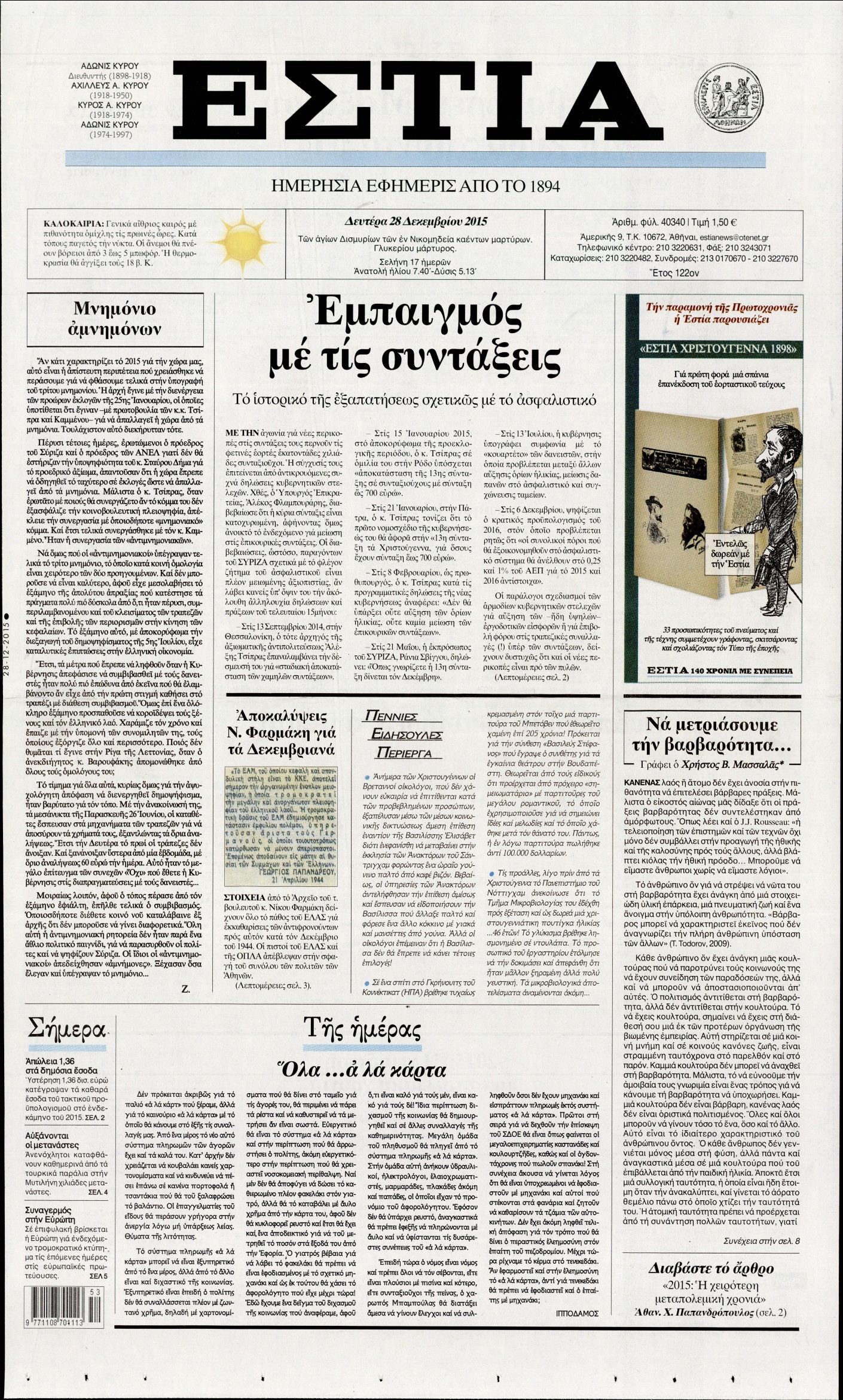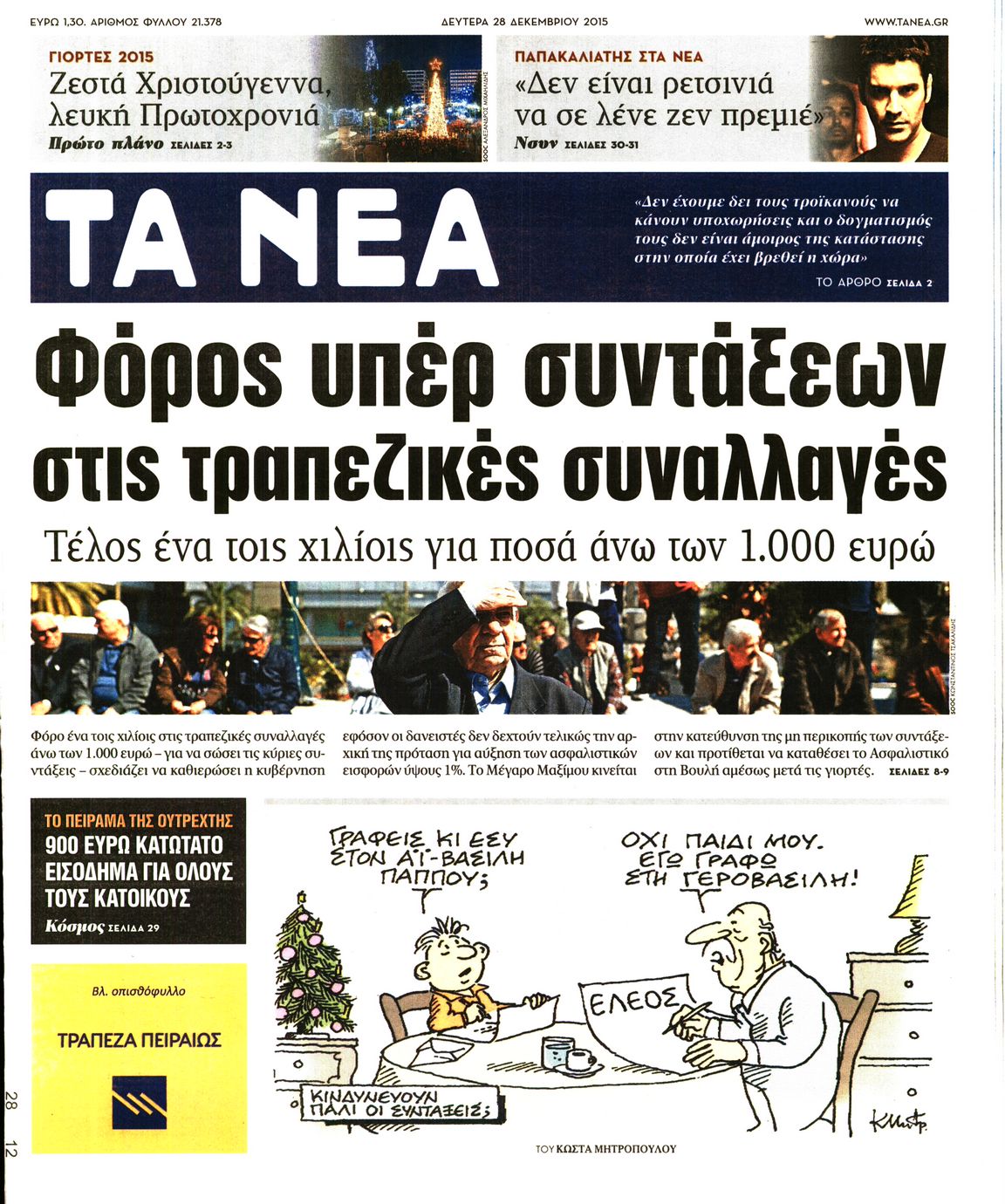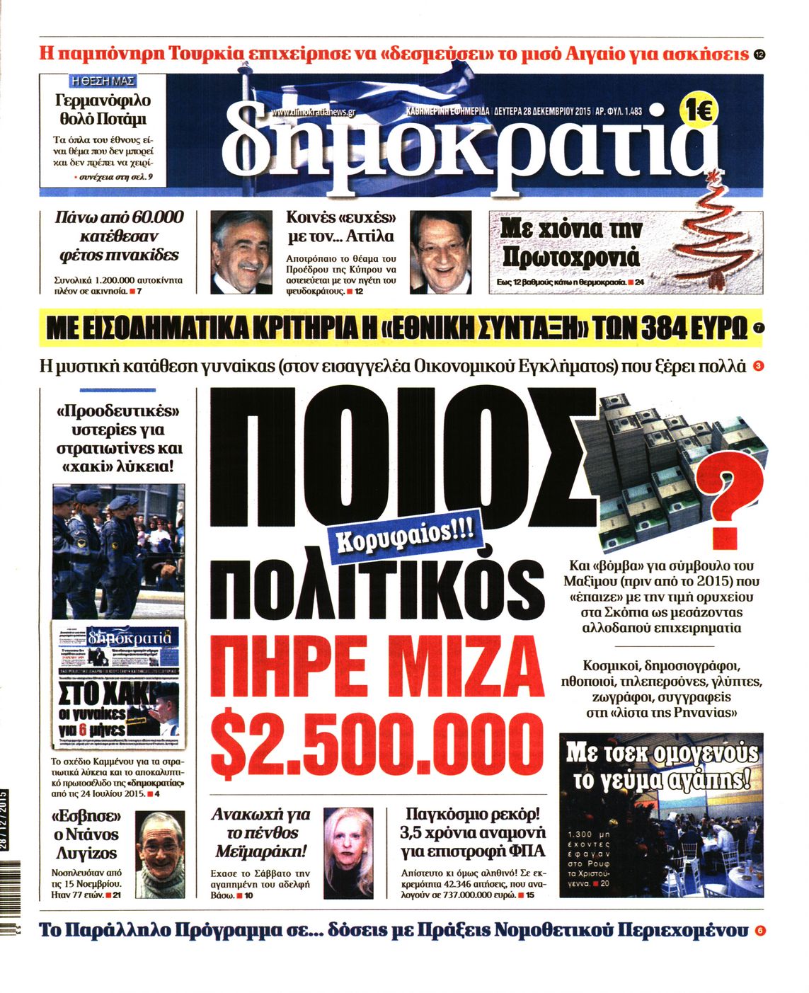 Οι πολιτικές εφημερίδες 28/12/2015 Enikos Newsroom 06:27, Δευτέρα 28 Δεκεμβρίου 2015 Media Διαβάστε τα σημερινά πρωτοσέλιδα των πολιτικών εφημερίδων: ΠΟΛΙΤΙΚΕΣ ΕΦΗΜΕΡΙΔΕΣ ΠΡΩΤΟΣΕΛΙΔΑ Μοιράσου το: σχολίασε κι εσύ (0 σχόλια) Ακολουθήστε το enikos.gr στο Google News και μάθετε πρώτοι όλες τις ειδήσεις Δείτε όλες τις τελευταίες ειδήσεις από την Ελλάδα και τον Κόσμο στο enikos.gr Ειδήσεις Ροή Ειδήσεων 2 ώρες πριν Υπόθεση Έπσταϊν: Το Υπουργείο Δικαιοσύνης δημοσιοποίησε μια σειρά από εξαιρετικά επεξεργασμένα αρχεία – «Λείπουν τα πιο σημαντικά έγγραφα», λένε οι Δημοκρατικοί 1 ώρα πριν Ο «χάρτης» με τις αυξήσεις και τις φοροελαφρύνσεις του 2026 – Ποιοι και πόσα κερδίζουν 11 ώρες πριν Χριστούγεννα στα μπλόκα: Επιμένουν στις κινητοποιήσεις τους οι αγρότες – Ανοίγουν τα διόδια το Σαββατοκύριακο 2 ώρες πριν ΟΝΕΧ – MEGATUGS: Ξεκίνησε η ναυπήγηση ρυμουλκών στην Ελλάδα – Προθάλαμος πολεμικών πλοίων – Δείτε φωτογραφίες και βίντεο 2 ώρες πριν Καιρός: Αλλαγή σκηνικού σήμερα με βροχές και πτώση της θερμοκρασίας – Οι προβλέψεις των μετεωρολόγων για τα Χριστούγεννα 4 ώρες πριν Αυγά: Πόσα μπορείτε να τρώτε την ημέρα με ασφάλεια για μέγιστη πρόσληψη πρωτεΐνης 4 ώρες πριν Οπτική ψευδαίσθηση: Μόνο αν είσαι ο Σέρλοκ Χολμς θα βρεις τον αριθμό «87» σε 7 δευτερόλεπτα 2 ώρες πριν Αρχαιολόγοι ανακάλυψαν σε χωράφι απεικόνιση 600 ετών ενός Αγίου – Τα στοιχεία που δείχνουν ότι μαρτύρησε 56 λεπτά πριν Αγχώνεται για το χριστουγεννιάτικο δώρο που πήρε στην πλούσια σύντροφό του – «Φοβάμαι πως θα το βρει φθηνιάρικο, φοράει βραχιόλια Cartier» 7 λεπτά πριν Κρήτη: «Πίεση διαρκείας» με νέες αφίξεις μεταναστών – Τρεις επιχειρήσεις διάσωσης νότια του νησιού 16 λεπτά πριν Η χήνα… που πέρασαν για κλέφτη: Έσπασε την πόρτα προκαλώντας πανικό 23 λεπτά πριν Θεσσαλονίκη: 24ωρη λειτουργία σήμερα σε μετρό και 6 λεωφορειακές γραμμές 31 λεπτά πριν «Porto Leone: Στη γειτονιά με τα κόκκινα φανάρια» – Ο Χρόνης αποκαλύπτει στην Αλεξάνδρα το μυστικό για το παιδί της Λένας 39 λεπτά πριν Νέες αιτήσεις για ίδρυση μη κρατικών πανεπιστημίων στο πρώτο δίμηνο του 2026 – Τι είπε η Ζαχαράκη ENIKOS NETWORK Είστε μόνιμα απρόσεκτοι; 3 σημάδια που δείχνουν ότι μπορεί να είναι σύμπτωμα πάθησης Πόσα κιλά παίρνουμε πραγματικά τα Χριστούγεννα, σύμφωνα με την επιστήμη – Πώς να το αποτρέψουμε; Mega χριστουγεννιάτικη φορολοταρία: «Κλείδωσε» η ημερομηνία για την κλήρωση – Ερωτήσεις και απαντήσεις Αναστολή μέτρων αναγκαστικής εκτέλεσης για κτηνοτρόφους που πλήττονται από την ευλογιά των αιγοπροβάτων Χαρτογραφώντας το «σημείο χωρίς επιστροφή»: Για πρώτη φορά αποκαλύπτεται με λεπτομέρεια το ακανθώδες όριο της ατμόσφαιρας τ... Η Google καταργεί τη λειτουργία «dark web report» – Πώς θα μπορούν οι χρήστες να διαγράφουν τα δεδομένα τους περισσότερα 09:30 , Σάββατο 20 Δεκεμβρίου 2025 «Porto Leone: Στη γειτονιά με τα κόκκινα φανάρια» – Ο Χρόνης αποκαλύπτει στην Αλεξάνδρα το μυστικό για το παιδί της Λένας Η μεγάλη δραματική σειρά του Apha «Porto Leone: Στη γειτονιά με τα κόκκινα φανάρια» μας μεταφέ... 08:14 , Σάββατο 20 Δεκεμβρίου 2025 Τρομεροί γονείς: Η Μαρία Καβογιάννη εισβάλλει στο σπίτι της οικογένειας Στεφανίδη Όσα θα δούμε στο νέο διπλό επεισόδιο της σειράς «Τρομεροί γονείς», σήμερα Σάββατο 20 Δεκεμβρίο... 05:48 , Σάββατο 20 Δεκεμβρίου 2025 Οι οικονομικές εφημερίδες 20/12/2025 Διαβάστε τα πρωτοσέλιδα από τις οικονομικές εφημερίδες, σήμερα 20/12/2025. 05:43 , Σάββατο 20 Δεκεμβρίου 2025 Οι αθλητικές εφημερίδες 20/12/2025 Διαβάστε τα 