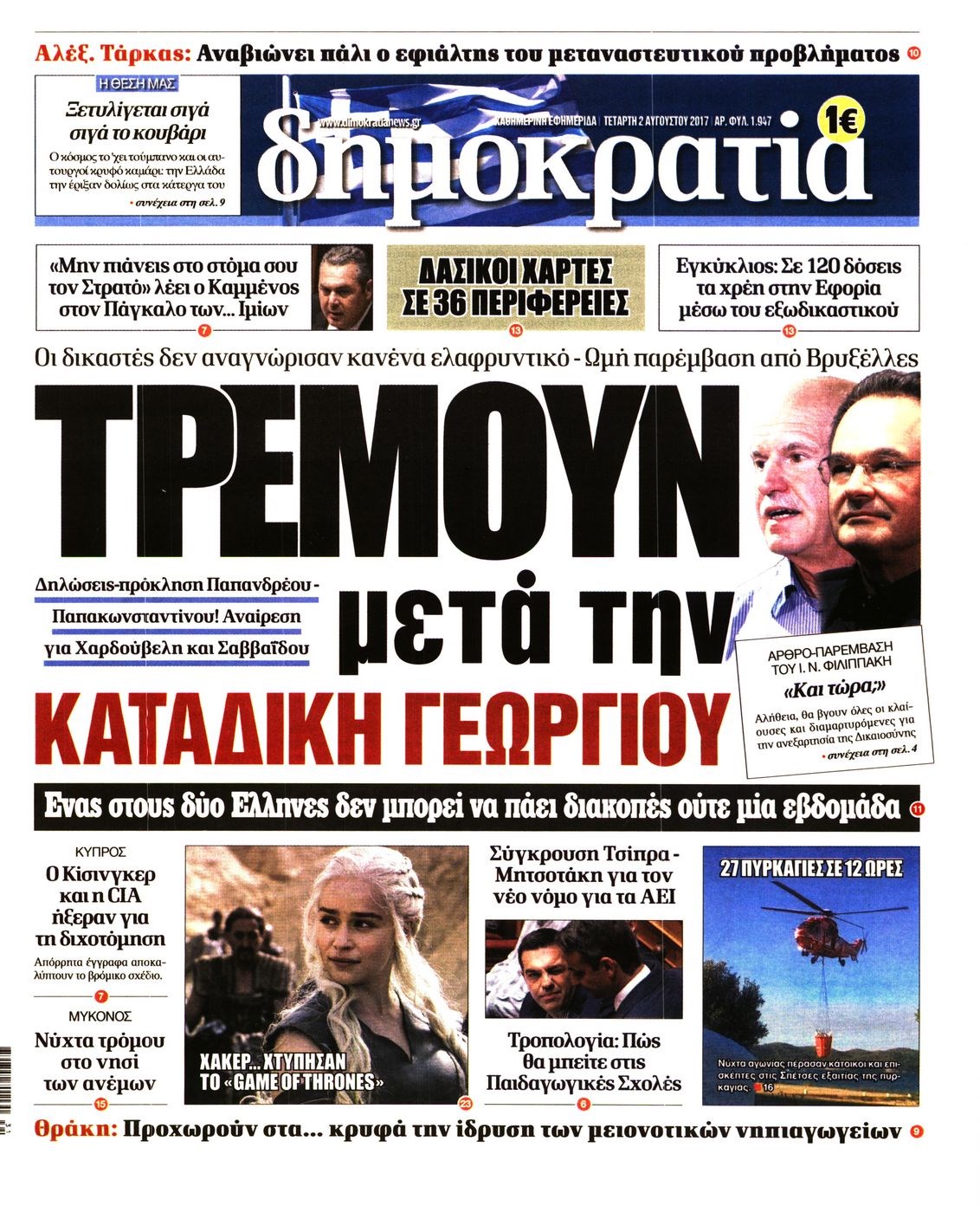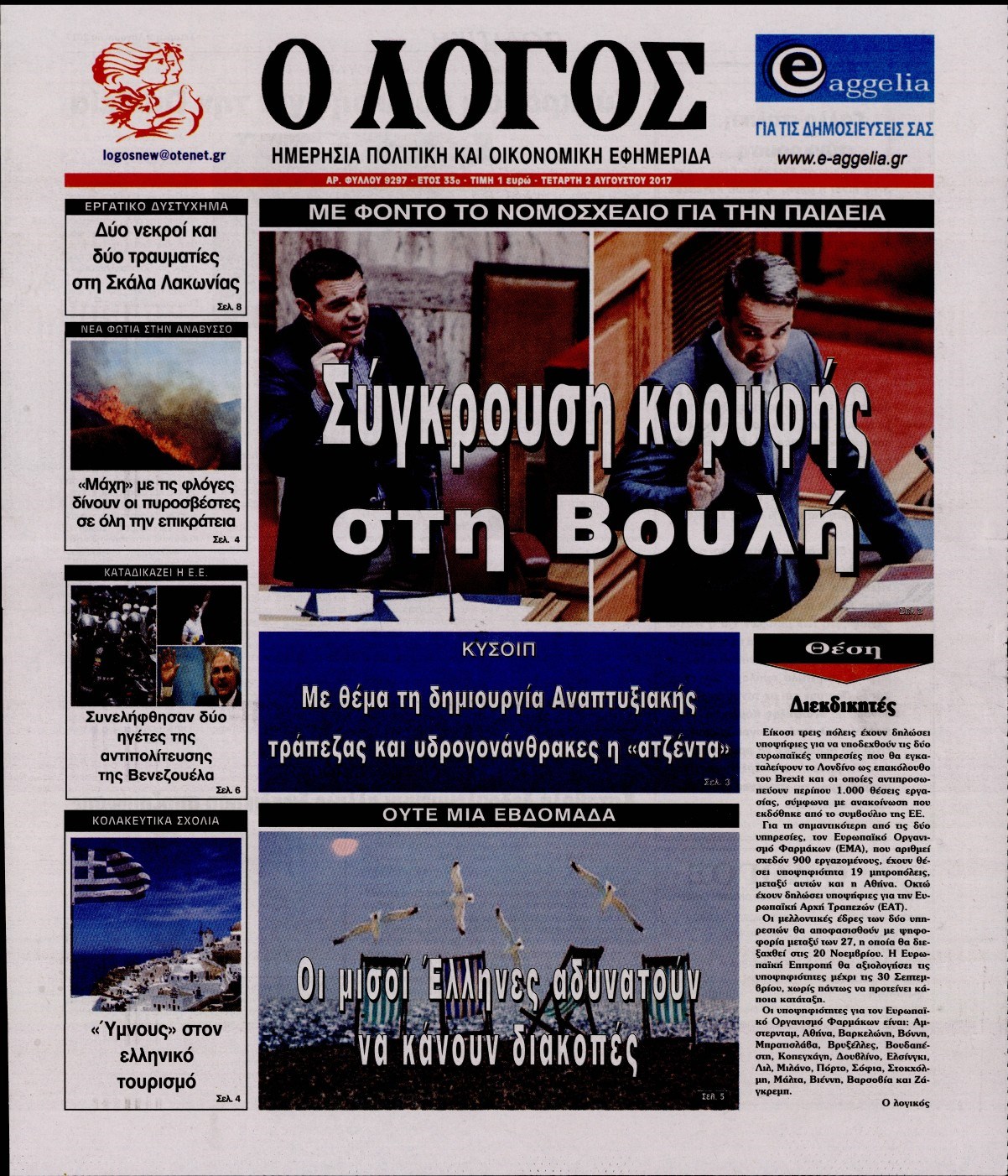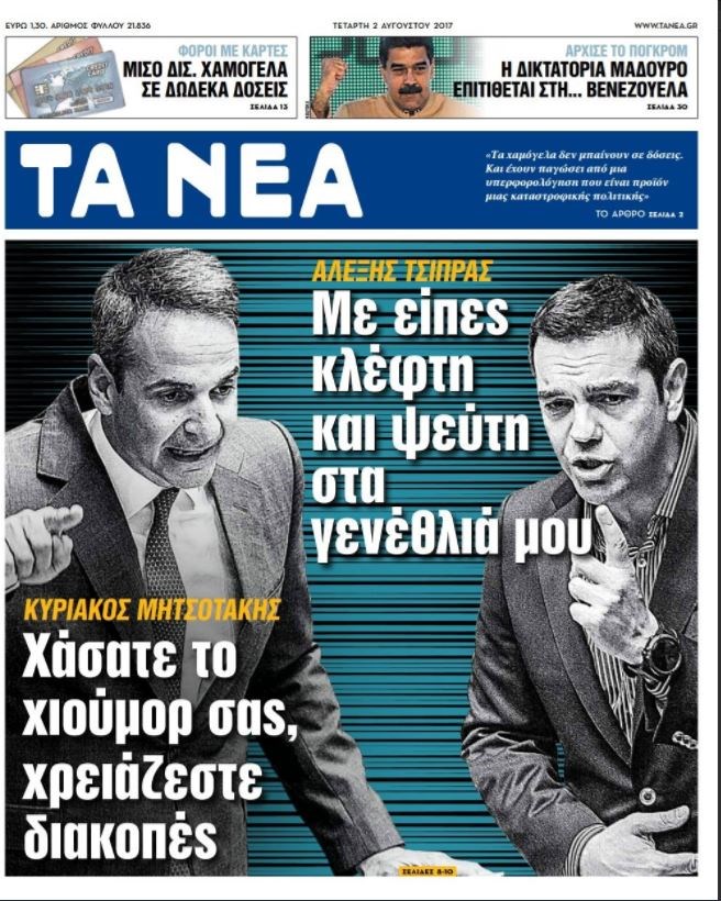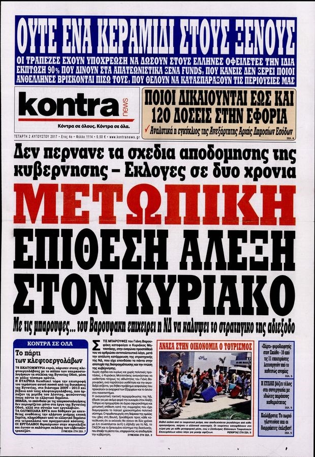 Οι πολιτικές εφημερίδες 2/8/2017 Κώστας Τεό 06:15, Τετάρτη 02 Αυγούστου 2017 Media Διαβάστε τα σημερινά πρωτοσέλιδα των πολιτικών εφημερίδων: ΠΟΛΙΤΙΚΕΣ ΕΦΗΜΕΡΙΔΕΣ ΠΡΩΤΟΣΕΛΙΔΑ Μοιράσου το: σχολίασε κι εσύ (0 σχόλια) Ακολουθήστε το enikos.gr στο Google News και μάθετε πρώτοι όλες τις ειδήσεις Δείτε όλες τις τελευταίες ειδήσεις από την Ελλάδα και τον Κόσμο στο enikos.gr Ειδήσεις Ροή Ειδήσεων 53 λεπτά πριν Χριστούγεννα στα μπλόκα: Επιμένουν στις κινητοποιήσεις τους οι αγρότες – Ανοίγουν τα διόδια το Σαββατοκύριακο 1 ώρα πριν Ουκρανία: Η άνευ προηγουμένου επίθεση σε ρωσικό τάνκερ στη Μεσόγειο και το μήνυμα προς στον Πούτιν – Το «μακρύ χέρι» του Κιέβου 31 λεπτά πριν Πούτιν: Τα μηνύματα σε Ευρώπη και ΝΑΤΟ από το μαραθώνιο «σόου» του – Η απαίτηση για «σεβασμό» και η ειρήνη «με τους όρους» της Μόσχας 1 ώρα πριν Τραμπ: Δεν αποκλείει την πιθανότητα ενός πολέμου στη Βενεζουέλα – «Ο Μαδούρο ξέρει καλύτερα από τον καθένα τι ακριβώς θέλω» 2 ώρες πριν Συνεχίζει να προκαλεί ο Μίτσκοσκι: «Για μένα το όνομα Μακεδονία είναι ιερό» 4 ώρες πριν Πούτιν: «Ναι, είμαι ερωτευμένος» – Βίντεο από τη σπάνια προσωπική παραδοχή του 3 ώρες πριν Αριθμολογία: Οι άνθρωποι που έχουν γεννηθεί αυτές τις 4 ημερομηνίες, συχνά παρεξηγούνται – «Η καλοσύνη τους κρύβει τεράστια δύναμη» 2 ώρες πριν Ύπνος: Μια κρυφή κατάσταση του εγκεφάλου πριν από τον ύπνο μπορεί να είναι το “κλειδί” για υψηλή ευφυΐα και δημιουργικότητα 4 ώρες πριν Ξεχάστε το καθάρισμα το Σαββατοκύριακο: Ο «κανόνας των 20 λεπτών» που θα σας λύσει τα χέρια 32 λεπτά πριν Ανακαλύφθηκαν αρχαία χρυσά νομίσματα 2.200 ετών που απεικονίζουν τον θεό Απόλλωνα – Η άγνωστη σύνδεση με τον Φίλιππο Β΄ της Μακεδονίας 1 λεπτό πριν Γάζα: Ισραηλινό πλήγμα σε σχολείο που είχαν καταφύγει εκτοπισμένοι – Τουλάχιστον έξι νεκροί 16 λεπτά πριν Ολυμπιακός – Βιλερμπάν 107-84: Επιστροφή στις νίκες με… προπόνηση 22 λεπτά πριν Νέος Κόσμος: Συνελήφθη 41χρονος με ένταλμα από την Τουρκία για εμπόριο ναρκωτικών και ληστεία 31 λεπτά πριν Πούτιν: Τα μηνύματα σε Ευρώπη και ΝΑΤΟ από το μαραθώνιο «σόου» του – Η απαίτηση για «σεβασμό» και η ειρήνη «με τους όρους» της Μόσχας 32 λεπτά πριν Ανακαλύφθηκαν αρχαία χρυσά νομίσματα 2.200 ετών που απεικονίζουν τον θεό Απόλλωνα – Η άγνωστη σύνδεση με τον Φίλιππο Β΄ της Μακεδονίας ENIKOS NETWORK Το ΕΚΑΒ τιμήθηκε από την Ακαδημία Αθηνών για τα 40 χρόνια προσφοράς του Έχετε πραγματικά μεγάλη καρδιά; 10 χαρακτηριστικά όσων έχουν καλοσύνη Αναστολή μέτρων αναγκαστικής εκτέλεσης για κτηνοτρόφους που πλήττονται από την ευλογιά των αιγοπροβάτων Πλήρης επάρκεια προϊόντων στις λαϊκές της Αττικής, παρά τις αγροτικές κινητοποιήσεις – Τι απαντούν οι πωλητές Χαρτογραφώντας το «σημείο χωρίς επιστροφή»: Για πρώτη φορά αποκαλύπτεται με λεπτομέρεια το ακανθώδες όριο της ατμόσφαιρας τ... Η Google καταργεί τη λειτουργία «dark web report» – Πώς θα μπορούν οι χρήστες να διαγράφουν τα δεδομένα τους περισσότερα 22:42 , Παρασκευή 19 Δεκεμβρίου 2025 Γιώργος Γιαννόπουλος για “Το σόι σου”: “Είναι ευτυχία και ευλογία αυτή η σειρά” «Είναι ευτυχία και ευλογία η συγκυρία αυτής της σειράς», θα πει ο Γιώργος Γιαννόπουλος -ο αγαπ... 20:37 , Παρασκευή 19 Δεκεμβρίου 2025 Don’t Forget The Lyrics: Η Έλλη Κοκκίνου υποδέχεται 4 παίκτες που θα κάνουν τα πάντα για να μη χάσουν ούτε… μισή λέξη από τους στίχους Το «Don’t Forget The Lyrics» επιστρέφει απόψε, Παρασκευή 19 Δεκεμβρίου, στις 21:00 με νέο επει... 19:31 , Παρασκευή 19 Δεκεμβρίου 2025 GNTM: Απ