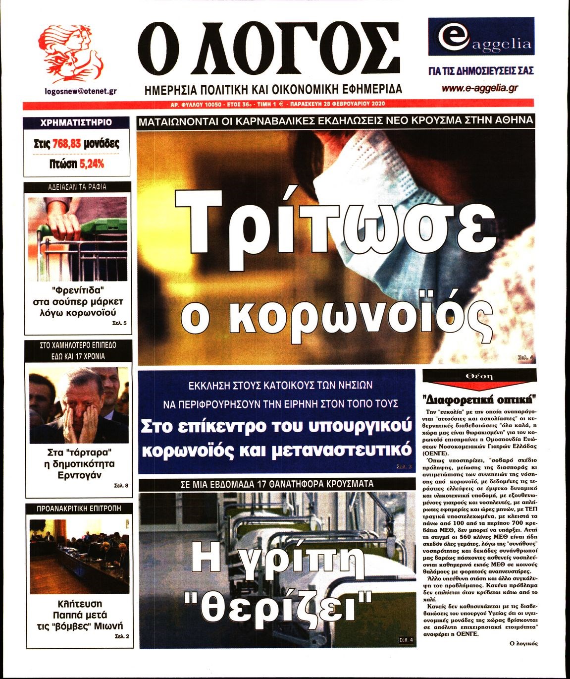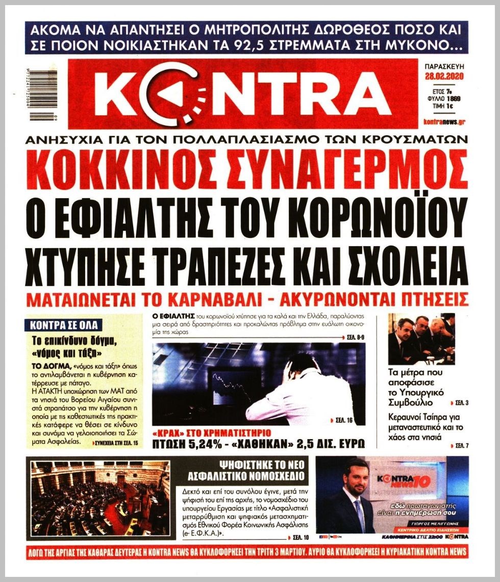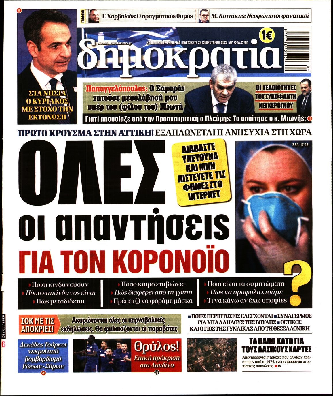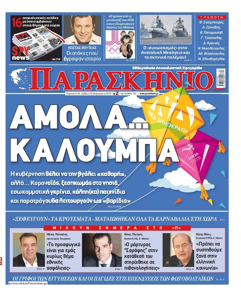 Οι πολιτικές εφημερίδες 28/2/2020 Διονύσης Νίκκας 06:05, Παρασκευή 28 Φεβρουαρίου 2020 Media Διαβάστε τα πρωτοσέλιδα των πολιτικών εφημερίδων… ΠΟΛΙΤΙΚΕΣ ΕΦΗΜΕΡΙΔΕΣ ΠΡΩΤΟΣΕΛΙΔΑ Μοιράσου το: σχολίασε κι εσύ (0 σχόλια) Ακολουθήστε το enikos.gr στο Google News και μάθετε πρώτοι όλες τις ειδήσεις Δείτε όλες τις τελευταίες ειδήσεις από την Ελλάδα και τον Κόσμο στο enikos.gr Ειδήσεις Ροή Ειδήσεων 4 ώρες πριν Χριστούγεννα στα μπλόκα: Επιμένουν στις κινητοποιήσεις τους οι αγρότες – Ανοίγουν τα διόδια το Σαββατοκύριακο 4 ώρες πριν Ουκρανία: Η άνευ προηγουμένου επίθεση σε ρωσικό τάνκερ στη Μεσόγειο και το μήνυμα προς στον Πούτιν – Το «μακρύ χέρι» του Κιέβου 3 ώρες πριν Πούτιν: Τα μηνύματα σε Ευρώπη και ΝΑΤΟ από το μαραθώνιο «σόου» του – Η απαίτηση για «σεβασμό» και η ειρήνη «με τους όρους» της Μόσχας 4 ώρες πριν Τραμπ: Δεν αποκλείει την πιθανότητα ενός πολέμου στη Βενεζουέλα – «Ο Μαδούρο ξέρει καλύτερα από τον καθένα τι ακριβώς θέλω» 5 ώρες πριν Συνεχίζει να προκαλεί ο Μίτσκοσκι: «Για μένα το όνομα Μακεδονία είναι ιερό» 3 ώρες πριν Ανακαλύφθηκαν αρχαία χρυσά νομίσματα 2.200 ετών που απεικονίζουν τον θεό Απόλλωνα – Η άγνωστη σύνδεση με τον Φίλιππο Β΄ της Μακεδονίας 4 ώρες πριν Ύπνος: Μια κρυφή κατάσταση του εγκεφάλου πριν από τον ύπνο μπορεί να είναι το “κλειδί” για υψηλή ευφυΐα και δημιουργικότητα 5 ώρες πριν Αριθμολογία: Οι άνθρωποι που έχουν γεννηθεί αυτές τις 4 ημερομηνίες, συχνά παρεξηγούνται – «Η καλοσύνη τους κρύβει τεράστια δύναμη» 6 ώρες πριν Ξεχάστε το καθάρισμα το Σαββατοκύριακο: Ο «κανόνας των 20 λεπτών» που θα σας λύσει τα χέρια 14 λεπτά πριν ΗΠΑ: Τραγωδία στην Αλαμπάμα – Σκότωσε την δημοσιογράφο σύζυγό του και αυτοκτόνησε μπροστά στον 3χρονο γιο τους 29 λεπτά πριν Πρόταση γάμου στο ΣΕΦ κατά την διάρκεια του αγώνα Ολυμπιακός-Βιλερμπάν – Δείτε βίντεο 44 λεπτά πριν Euroleague: Επέστρεψε στις νίκες ο Ολυμπιακός, πήρε την ματσάρα της χρονιάς η Μπάρτσα – Τα αποτελέσματα και η βαθμολογία 59 λεπτά πριν Συρία: Μαζικά πλήγματα των ΗΠΑ σε θέσεις του Ισλαμικού Κράτους – Χέγκσεθ: «Δεν είναι αρχή πολέμου, είναι μια δήλωση εκδίκησης» για το θάνατο των στρατιωτών μας 1 ώρα πριν Ουκρανία: Ολοκληρώθηκαν οι συνομιλίες με τους Αμερικανούς κι Ευρωπαίους διαπραγματευτές ENIKOS NETWORK Το ΕΚΑΒ τιμήθηκε από την Ακαδημία Αθηνών για τα 40 χρόνια προσφοράς του Έχετε πραγματικά μεγάλη καρδιά; 10 χαρακτηριστικά όσων έχουν καλοσύνη Αναστολή μέτρων αναγκαστικής εκτέλεσης για κτηνοτρόφους που πλήττονται από την ευλογιά των αιγοπροβάτων Πλήρης επάρκεια προϊόντων στις λαϊκές της Αττικής, παρά τις αγροτικές κινητοποιήσεις – Τι απαντούν οι πωλητές Χαρτογραφώντας το «σημείο χωρίς επιστροφή»: Για πρώτη φορά αποκαλύπτεται με λεπτομέρεια το ακανθώδες όριο της ατμόσφαιρας τ... Η Google καταργεί τη λειτουργία «dark web report» – Πώς θα μπορούν οι χρήστες να διαγράφουν τα δεδομένα τους περισσότερα 22:42 , Παρασκευή 19 Δεκεμβρίου 2025 Γιώργος Γιαννόπουλος για “Το σόι σου”: “Είναι ευτυχία και ευλογία αυτή η σειρά” «Είναι ευτυχία και ευλογία η συγκυρία αυτής της σειράς», θα πει ο Γιώργος Γιαννόπουλος -ο αγαπ... 20:37 , Παρασκευή 19 Δεκεμβρίου 2025 Don’t Forget The Lyrics: Η Έλλη Κοκκίνου υποδέχεται 4 παίκτες που θα κάνουν τα πάντα για να μη χάσουν ούτε… μισή λέξη από τους στίχους Το «Don’t Forget The Lyrics» επιστρέφει απόψε, Παρασκευή 19 Δεκεμβρίου, στις 21:00 με νέο επει... 19:31 , Παρασκευή 19 Δεκεμβρίου 2025 GNTM: Απόψε ο μεγάλος τελικός για τους 4 φιναλίστ Έπειτ