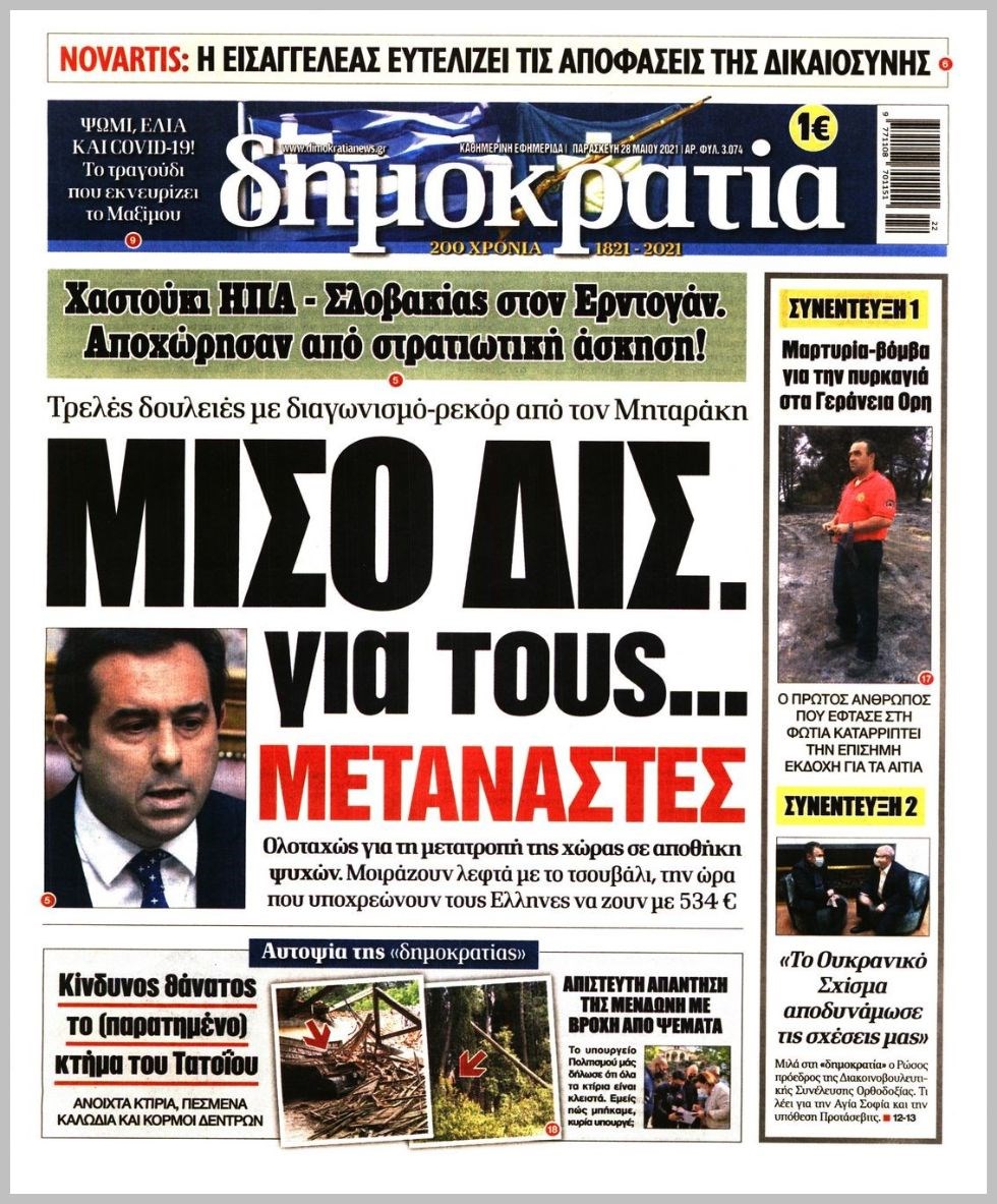Οι πολιτικές εφημερίδες 28/5/2021 Διονύσης Νίκκας 06:13, Παρασκευή 28 Μαΐου 2021 Media Διαβάστε τα πρωτοσέλιδα των πολιτικών εφημερίδων… ΕΦΗΜΕΡΙΔΕΣ ΠΡΩΤΟΣΕΛΙΔΑ Μοιράσου το: σχολίασε κι εσύ (0 σχόλια) Ακολουθήστε το enikos.gr στο Google News και μάθετε πρώτοι όλες τις ειδήσεις Δείτε όλες τις τελευταίες ειδήσεις από την Ελλάδα και τον Κόσμο στο enikos.gr Ειδήσεις Ροή Ειδήσεων 1 ώρα πριν Ελβετία: Οι περισσότεροι νεκροί στο υπόγειο του μπαρ Le Costellation – Τι είναι το flashover που πολλαπλασίασε τις φλόγες και τον κίνδυνο 2 ώρες πριν ΕΛ.ΑΣ.: Συστήνει την σταδιακή επιστροφή των εκδρομέων – Οι κυκλοφοριακές ρυθμίσεις λόγω των αγροτικών μπλόκων 33 λεπτά πριν Τέλη κυκλοφορίας 2026: Στο 88% η εμπρόθεσμη πληρωμή τους – Πρόστιμα σε σχεδόν 800.000 ιδιοκτήτες οχημάτων 3 ώρες πριν Βίντεο: Ισχυρός σεισμός 6,5 Ρίχτερ στο Μεξικό – Η στιγμή που η πρόεδρος Σεϊνμπάουμ διέκοψε συνέντευξη Τύπου 4 ώρες πριν Τόμι Λι Τζόουνς: Μυστήριο γύρω από τον θάνατο της 34χρονης κόρης του – Την είχε «απολύσει» από ταινία του επειδή αρνήθηκε να ξυπνήσει 1 ώρα πριν Πώς θα καταλάβετε ότι είστε ερωτευμένοι: 7 «παράλογες» σκέψεις που ξαφνικά βγάζουν νόημα 4 ώρες πριν Αυτό το ζώδιο θα δοκιμαστεί από το σύμπαν το 2026 – «Η χρονιά θα είναι γεμάτη εκπλήξεις, αλλά θα ξεπεράσετε όλα τα εμπόδια» 5 ώρες πριν Το αναπάντεχο παράδοξο της εξέλιξης που ανακάλυψαν οι επιστήμονες – Μπορεί να γίνει ο νέος «νόμος» της Βιολογίας 9 ώρες πριν Σχέση μητέρας-κόρης: 8 μικρές συνήθειες που μπορούν να σας φέρουν πιο κοντά ή να δημιουργήσουν απόσταση 3 λεπτά πριν Πάτρα: Συνελήφθη 19χρονος που χτύπησε 12χρονο μέσα σε κατάστημα 10 λεπτά πριν Ολλανδία: Εκατοντάδες ακυρώσεις πτήσεων στο αεροδρόμιο του Άμστερνταμ εξαιτίας χιονιού και παγετού 17 λεπτά πριν Πώς να πλύνετε τα γάντια σας: Τα μυστικά για να προστατέψετε τα αγαπημένα σας χειμερινά αξεσουάρ από τη φθορά του χρόνου 24 λεπτά πριν Συναγερμός στη Ρουμανία: «Σήκωσε» δύο F-16 μετά την εμφάνιση ρωσικών drones κοντά στα σύνορα με την Ουκρανία 33 λεπτά πριν Τέλη κυκλοφορίας 2026: Στο 88% η εμπρόθεσμη πληρωμή τους – Πρόστιμα σε σχεδόν 800.000 ιδιοκτήτες οχημάτων ENIKOS NETWORK Ύπνος: Το κόλπο με τη θερμοκρασία που μπορεί να σας βοηθήσει να κοιμηθείτε πιο βαθιά Βάζετε την καρέκλα στη θέση της αφού τελειώσατε το φαγητό σας; Τι σημαίνει αυτό για την προσωπικότητά σας Νέα εποχή στον Προμαχώνα: Η είσοδος της Βουλγαρίας στο ευρώ και οι ανατιμήσεις Μείωση ΦΠΑ: Τι θα κερδίσουν 67.418 κάτοικοι 19 νησιών του Αιγαίου – Πόσο θα μειωθούν καύσιμα, προϊόντα και υπηρεσίες Ο Google Assistant θα παραμείνει λίγο περισσότερο για ορισμένους χρήστες Android Τεστ προσωπικότητας: Το βάζο που θα επιλέξετε αποκαλύπτει πώς λύνετε προβλήματα στη ζωή σας περισσότερα 10:06 , Παρασκευή 02 Ιανουαρίου 2026 Στο real taste & style που κυκλοφορεί με τη Realnews Σε μια ενδιαφέρουσα συνέντευξη, ο Στέφανος Σαράτσης ανοίγει την καρδιά του και μοιράζεται την ... 09:22 , Παρασκευή 02 Ιανουαρίου 2026 Στο real taste & style που κυκλοφορεί με τη Realnews Οταν ο χειμώνας ζητά παρηγοριά, η απάντηση βρίσκεται πάντα στην κατσαρόλα. Στο πρώτο τεύχος το... 08:38 , Παρασκευή 02 Ιανουαρίου 2026 Στο real taste & style που κυκλοφορεί με τη Realnews Λίγη φωτιά στην καρδιά του Ιανουαρίου; Στις 16/1, με αφορμή την Παγκόσμια Ημέρα Hot & Spic... 07:52 , Παρασκευή 02 Ιανουαρίου 2026 Την Κυριακή με τη Realnews: Ό,τι και αν αγοράσεις, σκανάρεις και κερδίζεις! Την Κυριακή με τη Realnews: Ό,τι και αν αγοράσεις, σκανάρεις και κερδίζεις! Με το PADU app, το... ΤΕΛΕΥΤΑΙΕΣ ΕΙΔΗΣΕΙΣ 3 λεπτά πριν Πάτρ
