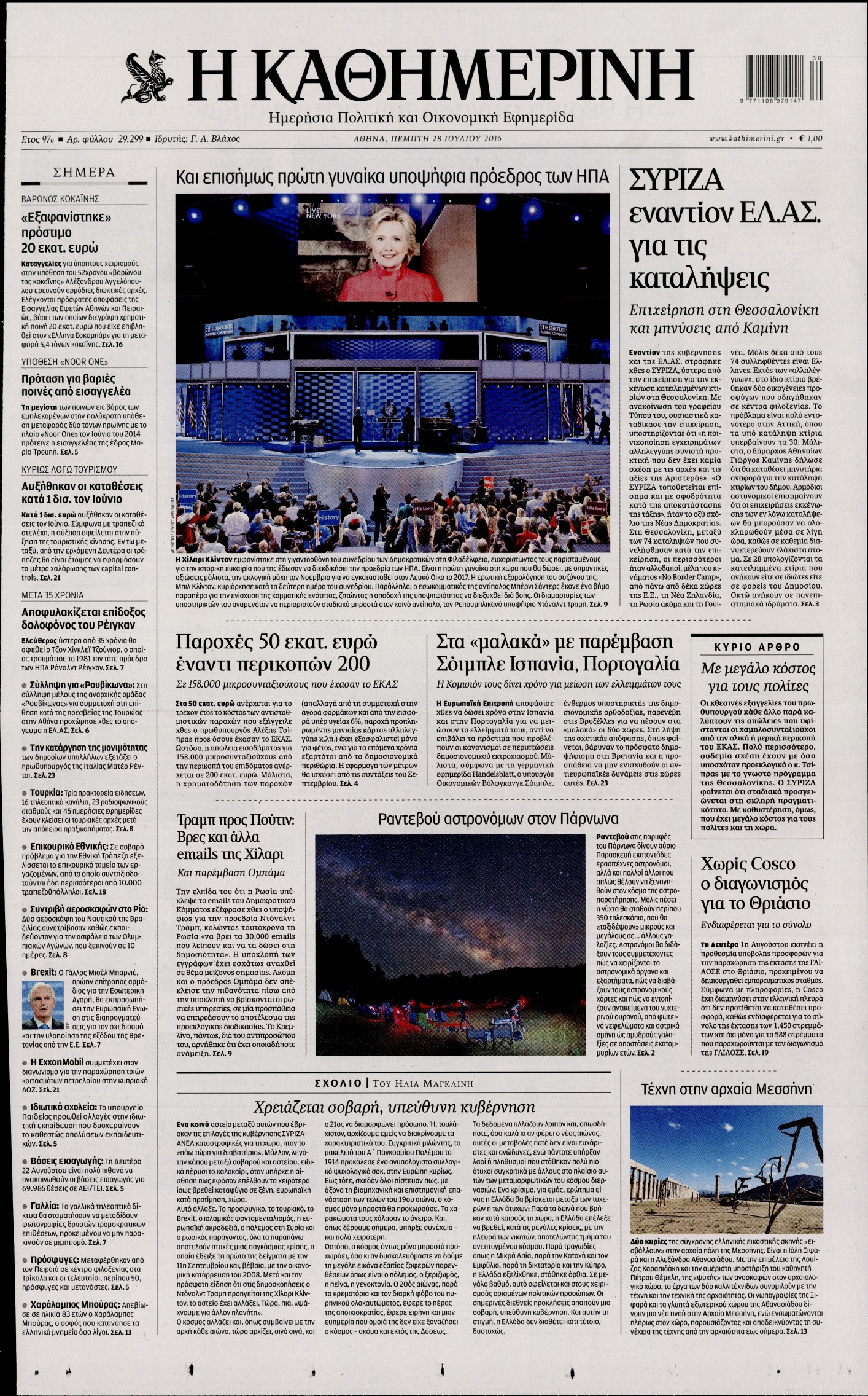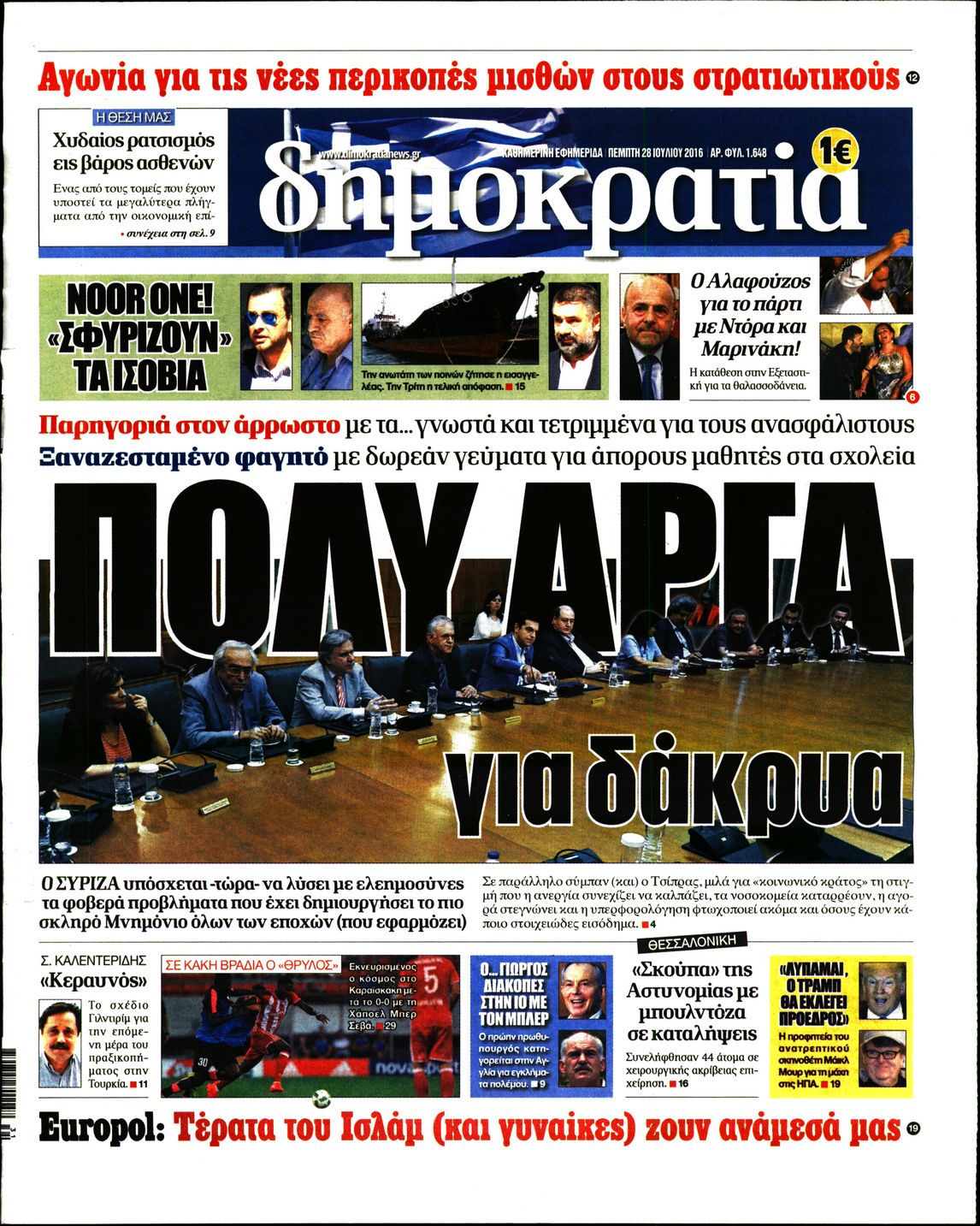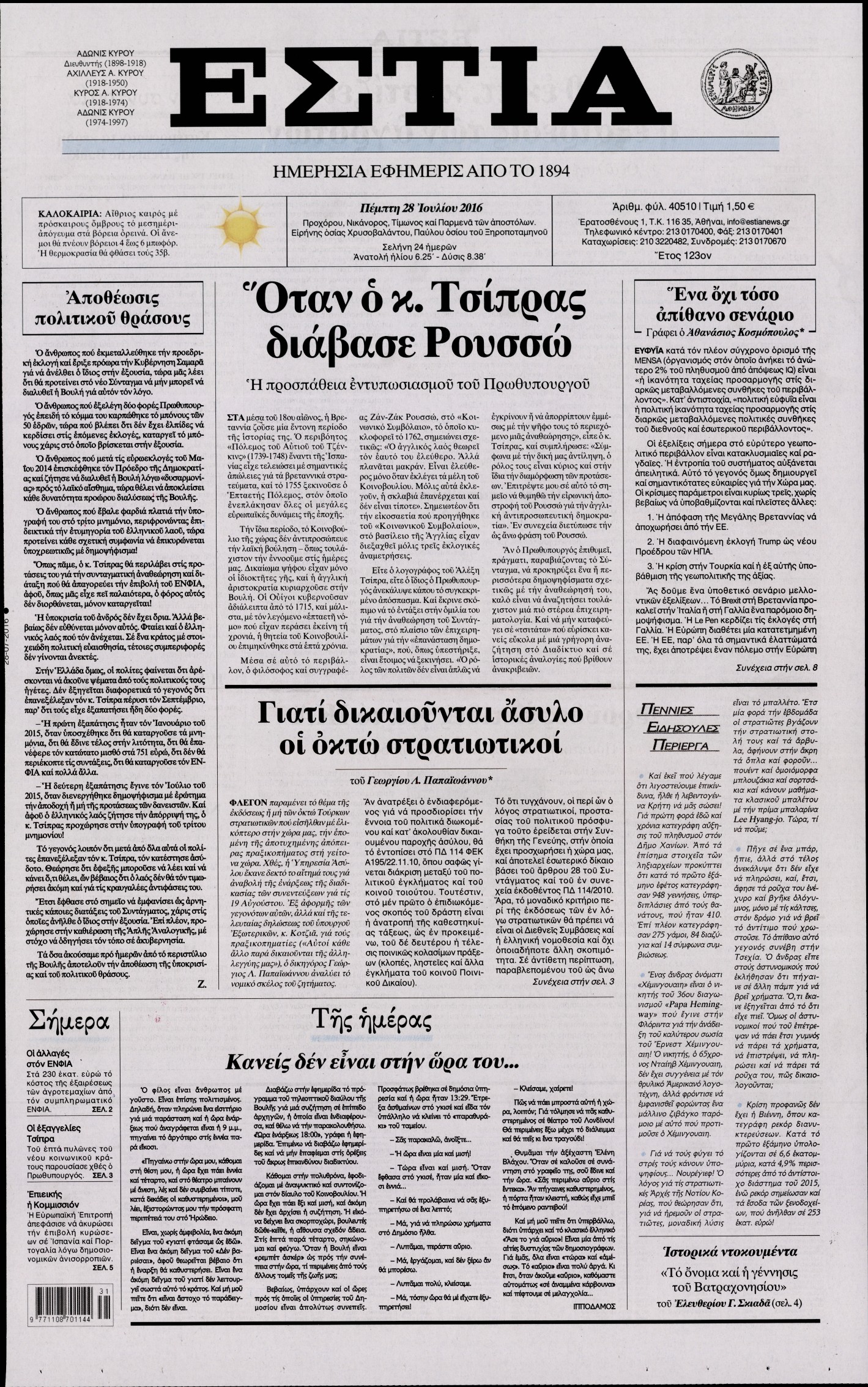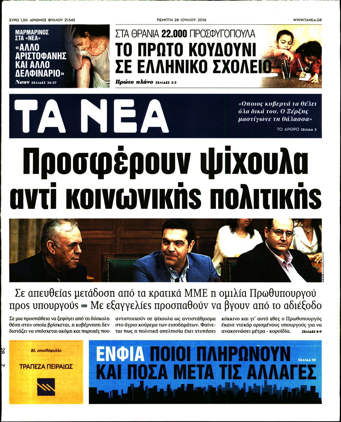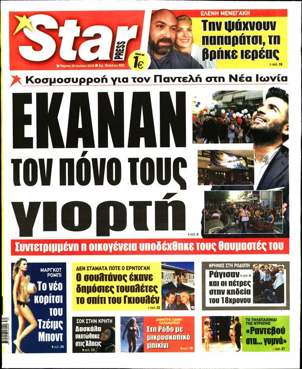 Οι πολιτικές εφημερίδες 28/7/2016 Enikos Newsroom 05:06, Πέμπτη 28 Ιουλίου 2016 Media Διαβάστε τα σημερινά πρωτοσέλιδα των πολιτικών εφημερίδων: ΠΟΛΙΤΙΚΕΣ ΕΦΗΜΕΡΙΔΕΣ ΠΡΩΤΟΣΕΛΙΔΑ Μοιράσου το: σχολίασε κι εσύ (0 σχόλια) Ακολουθήστε το enikos.gr στο Google News και μάθετε πρώτοι όλες τις ειδήσεις Δείτε όλες τις τελευταίες ειδήσεις από την Ελλάδα και τον Κόσμο στο enikos.gr Ειδήσεις Ροή Ειδήσεων 2 ώρες πριν Αγρότες: «Όχι στον διάλογο, μας εμπαίζει η κυβέρνηση» – Αποφάσισαν κλιμάκωση των κινητοποιήσεων, τι θα γίνει τα Χριστούγεννα 2 ώρες πριν Την πρώτη Belharra παρέλαβε η χώρα μας, υψώθηκε η ελληνική σημαία στη φρεγάτα «Κίμων» – Δένδιας: «Το ισχυρότερο Πολεμικό Ναυτικό που είχε ποτέ ο ελληνισμός» 8 λεπτά πριν Γιώργος Μαζωνάκης: «Έχει υποστεί ένα σωρό εκβιαστικές πρακτικές – Του είπαν ότι θα του βάλουν τον συγκεκριμένο άνθρωπο να τον καταγγείλει» 1 ώρα πριν Μιχάλης Χουρδάκης: «Είμαι διαθέσιμος να συμβάλω στην προσωρινή κάλυψη του ιατρείου της Ψερίμου» – Η επιστολή στον Άδωνι Γεωργιάδη 2 ώρες πριν Εξώδικο Γεωργιάδη στην Κωνσταντοπούλου – «Με κατηγόρησε ότι έχω καταδικαστεί για παιδεραστία» 3 ώρες πριν Τα 5 ζώδια που θα ευνοηθούν στα οικονομικά τους το 2026 – «Τραβούν το χρήμα σαν μαγνήτες» 8 ώρες πριν Αν κάνετε συνεχώς αυτά τα 8 πράγματα με τα κατοικίδιά σας, σας λείπει η ανθρώπινη επαφή 4 ώρες πριν Αυτό που κρύβεται κάτω από τη Γροιλανδία θα μπορούσε να ανατρέψει όσα γνωρίζουμε για την άνοδο της στάθμης των θαλασσών 1 ημέρα πριν 20 χρόνια τα Χριστούγεννα ξεκινούν στα Public με μεγάλη ποικιλία σε δώρα! 8 λεπτά πριν Γιώργος Μαζωνάκης: «Έχει υποστεί ένα σωρό εκβιαστικές πρακτικές – Του είπαν ότι θα του βάλουν τον συγκεκριμένο άνθρωπο να τον καταγγείλει» 14 λεπτά πριν Μητσοτάκης: Η φρεγάτα «Κίμων» είναι η καλύτερη απόδειξη ότι οι Ένοπλες Δυνάμεις μας περνούν πια σε μια νέα εποχή – ΒΙΝΤΕΟ 19 λεπτά πριν Πάμε Στοίχημα: Περισσότερα από 29 εκατομμύρια ευρώ σε κέρδη μοίρασε την προηγούμενη εβδομάδα 24 λεπτά πριν Το Ισλαμικό Κράτος αποκαλεί τις δολοφονίες στην Αυστραλία «πηγή υπερηφάνειας» – Δεν αναλαμβάνει την ευθύνη για την επίθεση 28 λεπτά πριν Εύβοια: Πτώμα άνδρα εντοπίστηκε σε πυλωτή ENIKOS NETWORK ΕΟΔΥ: Δωρεάν τεστ για HIV, Ηπατίτιδες, Σύφιλη, Χλαμύδια, Γονόρροια 100 χρόνια ΠΙΣ: Ένας αιώνας προσφοράς στην Ιατρική και την κοινωνία Αμετάβλητα για τέταρτη συνεχόμενη φορά τα επιτόκια της ΕΚΤ – Ποιες είναι οι προβλέψεις για τον πληθωρισμό και την οικονομία... Χριστούγεννα και Πρωτοχρονιά: Δείτε πόσα χρήματα θα πάρουν ως αμοιβή όσοι εργαστούν Χαρτογραφώντας το «σημείο χωρίς επιστροφή»: Για πρώτη φορά αποκαλύπτεται με λεπτομέρεια το ακανθώδες όριο της ατμόσφαιρας τ... Η Google καταργεί τη λειτουργία «dark web report» – Πώς θα μπορούν οι χρήστες να διαγράφουν τα δεδομένα τους περισσότερα 17:45 , Πέμπτη 18 Δεκεμβρίου 2025 ROUK ZOUK: Εορταστικό επεισόδιο με καλεσμένους τους πρωταγωνιστές του «Γιατί ρε πατέρα» Το Σάββατο 20 Δεκεμβρίου στις 21:00, η Ζέτα Μακρυπούλια υποδέχεται εκλεκτούς ηθοποιούς που όλο... 17:20 , Πέμπτη 18 Δεκεμβρίου 2025 Άγιος έρωτας: Η Χριστίνα εξομολογείται στον πατέρα Νικόλαο, απόψε στις 21:00 στον Alpha Η Νότα αποφασίζει να εκδικηθεί τον Πέτρο και τον Στέφανο, για χάρη του Λούη, όμως τα πράγματα ... 16:50 , Πέμπτη 18 Δεκεμβρίου 2025 Να μ’ αγαπάς: Ζωή και Φωτεινή συμφιλιώνονται ως μάνα με κόρη, απόψε στις 20:00 Η ταυτότητα του Άγγελου αποκαλύπτεται στο νέο επεισόδιο της σειράς “Να μ’ αγαπάς... 15:52 , Πέμπτη 18 Δεκεμβρίου 2025 Το Σπίτι Δί