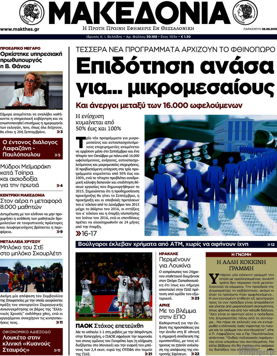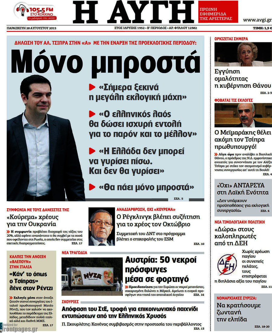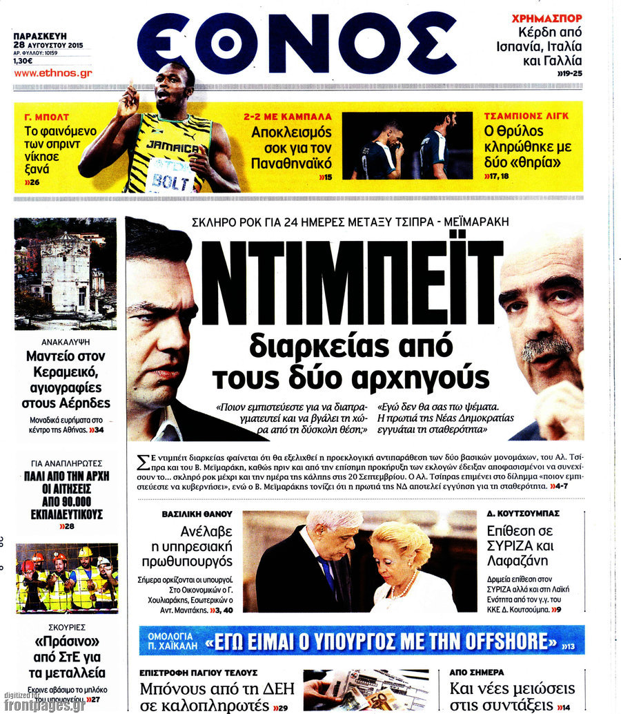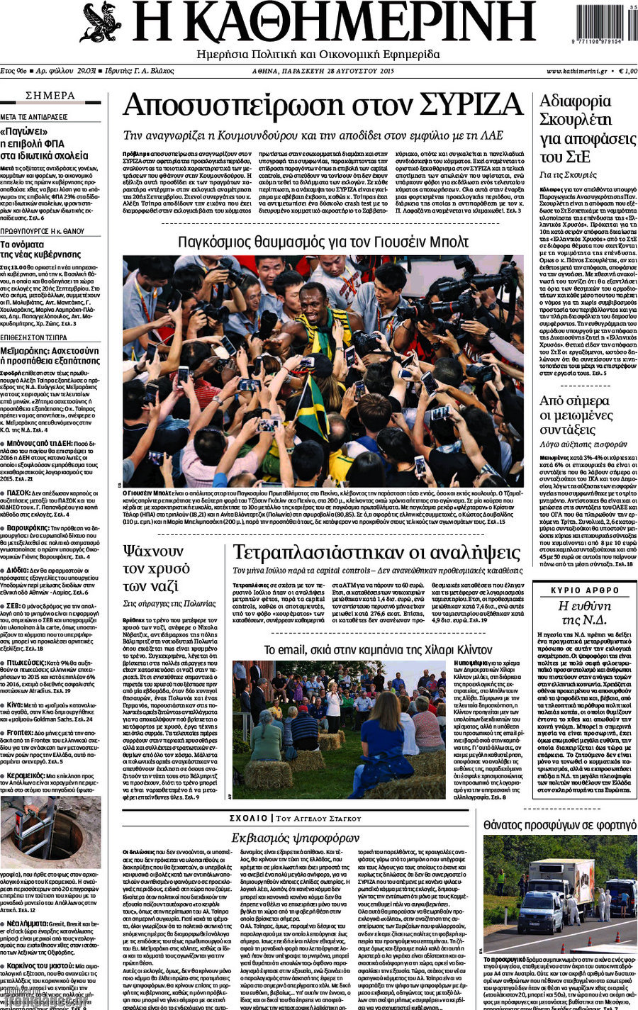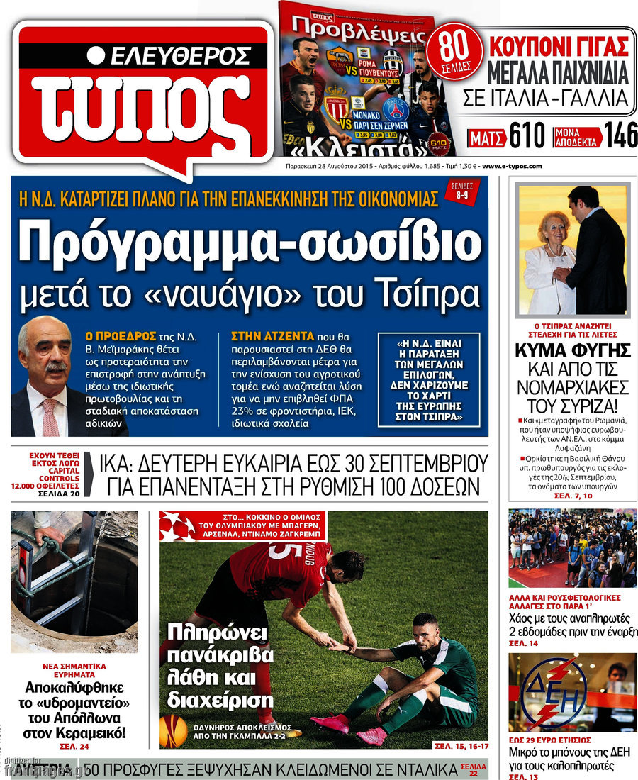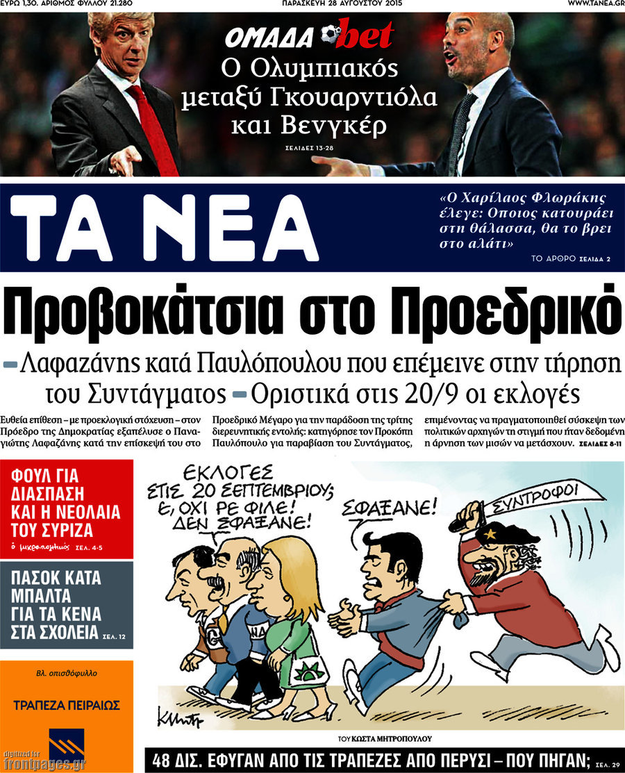 Οι πολιτικές εφημερίδες 28/8/2015 Enikos Newsroom 08:18, Παρασκευή 28 Αυγούστου 2015 Media Διαβάστε τα σημερινά πρωτοσέλιδα των πολιτικών εφημερίδων: ΠΟΛΙΤΙΚΕΣ ΕΦΗΜΕΡΙΔΕΣ ΠΡΩΤΟΣΕΛΙΔΑ Μοιράσου το: σχολίασε κι εσύ (0 σχόλια) Ακολουθήστε το enikos.gr στο Google News και μάθετε πρώτοι όλες τις ειδήσεις Δείτε όλες τις τελευταίες ειδήσεις από την Ελλάδα και τον Κόσμο στο enikos.gr Ειδήσεις Ροή Ειδήσεων 3 ώρες πριν Υπόθεση Έπσταϊν: Το Υπουργείο Δικαιοσύνης δημοσιοποίησε μια σειρά από εξαιρετικά επεξεργασμένα αρχεία – «Λείπουν τα πιο σημαντικά έγγραφα», λένε οι Δημοκρατικοί 13 λεπτά πριν Γιορτές με μπλόκα για τους αγρότες: Ανοίγουν διόδια και μοιράζουν προϊόντα στους ταξιδιώτες 46 λεπτά πριν Εξαφάνιση 33χρονου γιατρού στην Κρήτη: «Άναψα τα φώτα, τρόμαξε και άρχισε να τρέχει στα χωράφια» – Η τελευταία διαδρομή και η μαρτυρία «κλειδί» 2 ώρες πριν Ο «χάρτης» με τις αυξήσεις και τις φοροελαφρύνσεις του 2026 – Ποιοι και πόσα κερδίζουν 29 λεπτά πριν Τα αρχεία του Έπσταϊν αποκαλύπτουν φωτογραφία του έκπτωτου πρίγκιπα Άντριου – Είναι ξαπλωμένος στην αγκαλιά 5 γυναικών 37 λεπτά πριν Μία νέα «χρυσή» περίοδος αρχίζει για 3 ζώδια από σήμερα – «Μία αναπάντεχη ευκαιρία οδηγεί στην επιτυχία» 5 ώρες πριν Αυγά: Πόσα μπορείτε να τρώτε την ημέρα με ασφάλεια για μέγιστη πρόσληψη πρωτεΐνης 3 ώρες πριν Αρχαιολόγοι ανακάλυψαν σε χωράφι απεικόνιση 600 ετών ενός Αγίου – Τα στοιχεία που δείχνουν ότι μαρτύρησε 2 ώρες πριν Αγχώνεται για το χριστουγεννιάτικο δώρο που πήρε στην πλούσια σύντροφό του – «Φοβάμαι πως θα το βρει φθηνιάρικο, φοράει βραχιόλια Cartier» 5 λεπτά πριν e-ΕΦΚΑ και ΔΥΠΑ: Οι πληρωμές από 22 έως 24 Δεκεμβρίου – Ποιοι θα δουν χρήματα στους λογαριασμούς τους 13 λεπτά πριν Συνελήφθη οδηγός μηχανής που έτρεχε με 161 χλμ στη Συγγρού – Τον έπιασε το ραντάρ της Τροχαίας 13 λεπτά πριν Γιορτές με μπλόκα για τους αγρότες: Ανοίγουν διόδια και μοιράζουν προϊόντα στους ταξιδιώτες 22 λεπτά πριν Τηλεθέαση (19/12): Κυριάρχησε η σειρά «Το σόι σου» – Τι νούμερα έκανε ο τελικός του GNTM 29 λεπτά πριν Τα αρχεία του Έπσταϊν αποκαλύπτουν φωτογραφία του έκπτωτου πρίγκιπα Άντριου – Είναι ξαπλωμένος στην αγκαλιά 5 γυναικών ENIKOS NETWORK Είστε μόνιμα απρόσεκτοι; 3 σημάδια που δείχνουν ότι μπορεί να είναι σύμπτωμα πάθησης Πόσα κιλά παίρνουμε πραγματικά τα Χριστούγεννα, σύμφωνα με την επιστήμη – Πώς να το αποτρέψουμε; Επίδομα παιδιού: Τι αλλάζει από το 2026 – Το όφελος από τις φορολογικές ελαφρύνσεις Mega χριστουγεννιάτικη φορολοταρία: «Κλείδωσε» η ημερομηνία για την κλήρωση – Ερωτήσεις και απαντήσεις Χαρτογραφώντας το «σημείο χωρίς επιστροφή»: Για πρώτη φορά αποκαλύπτεται με λεπτομέρεια το ακανθώδες όριο της ατμόσφαιρας τ... Η Google καταργεί τη λειτουργία «dark web report» – Πώς θα μπορούν οι χρήστες να διαγράφουν τα δεδομένα τους περισσότερα 09:30 , Σάββατο 20 Δεκεμβρίου 2025 «Porto Leone: Στη γειτονιά με τα κόκκινα φανάρια» – Ο Χρόνης αποκαλύπτει στην Αλεξάνδρα το μυστικό για το παιδί της Λένας Η μεγάλη δραματική σειρά του Apha «Porto Leone: Στη γειτονιά με τα κόκκινα φανάρια» μας μεταφέ... 08:14 , Σάββατο 20 Δεκεμβρίου 2025 Τρομεροί γονείς: Η Μαρία Καβογιάννη εισβάλλει στο σπίτι της οικογένειας Στεφανίδη Όσα θα δούμε στο νέο διπλό επεισόδιο της σειράς «Τρομεροί γονείς», σήμερα Σάββατο 20 Δεκεμβρίο... 05:48 , Σάββατο 20 Δεκεμβρίου 2025 Οι οικονομικές εφημερίδες 20/12/2025 Διαβάστε τα πρωτοσέλιδα από τις οικονομικές εφημερίδες, σήμερα 20/12/2025. 05:43 , Σάββατο 20 Δεκεμβρίου 2025 Οι αθλη