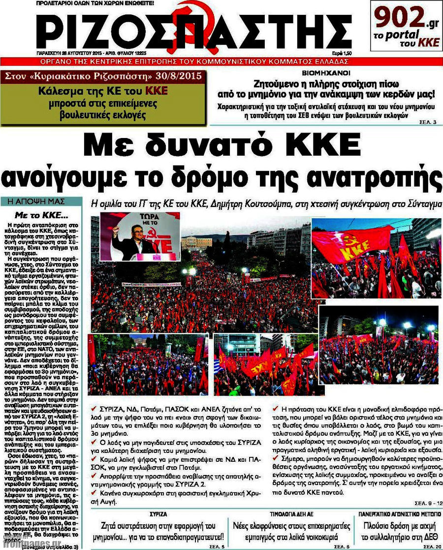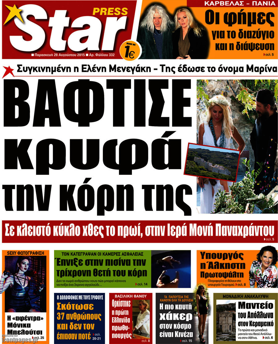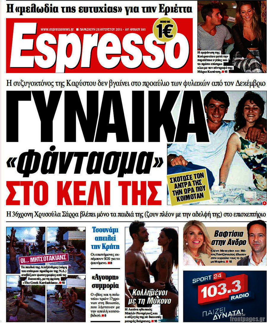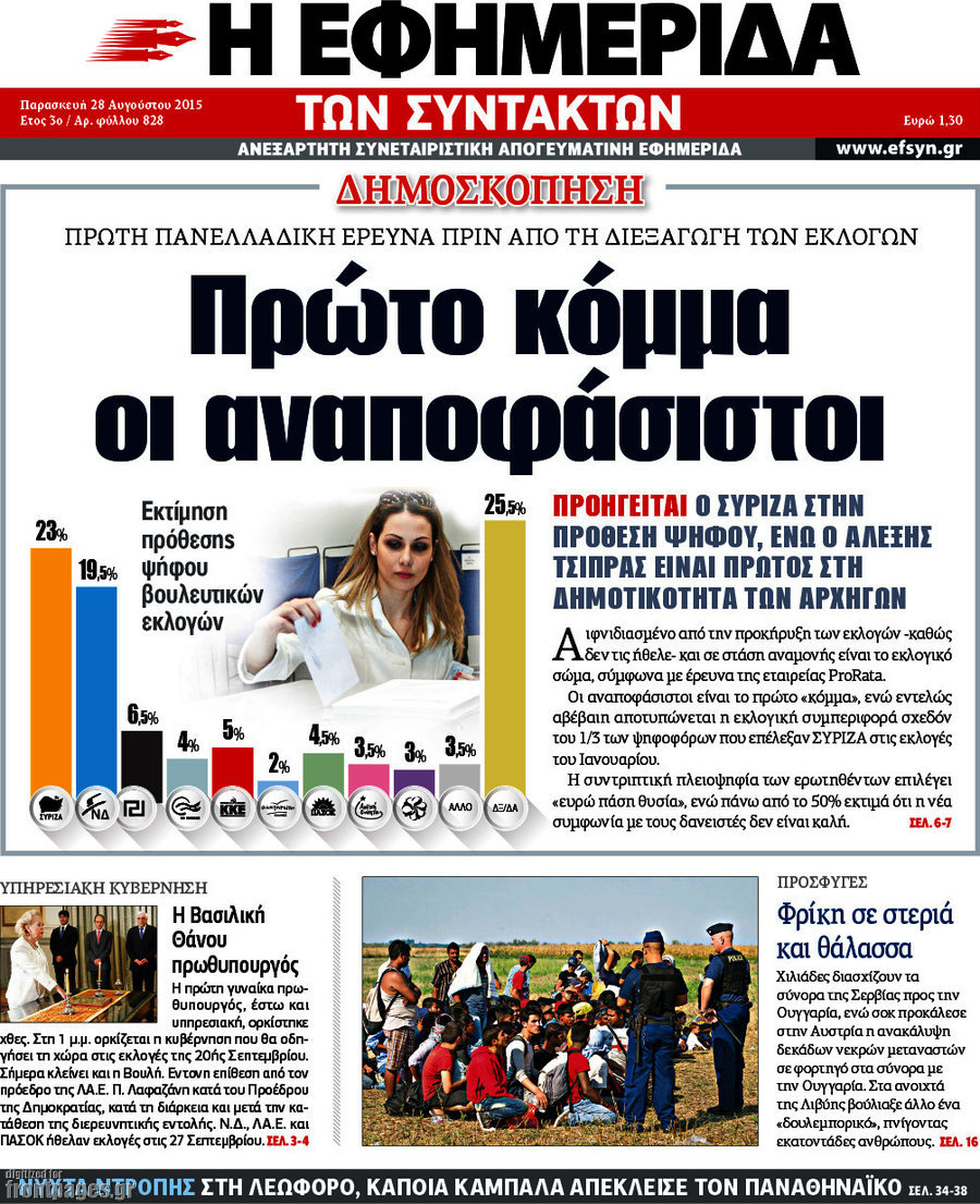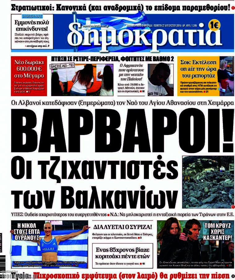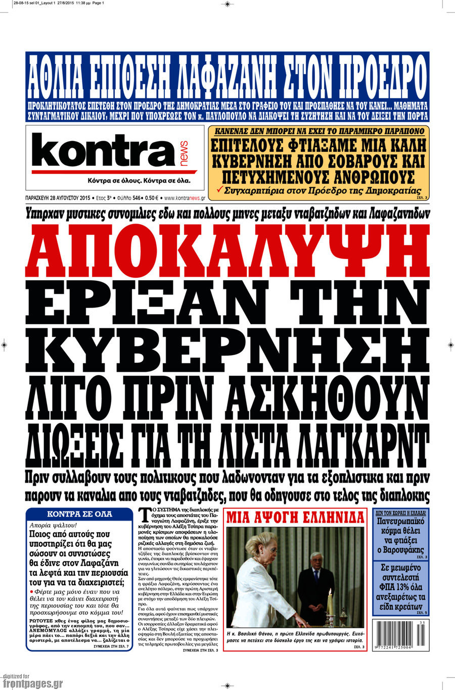 Οι πολιτικές εφημερίδες 28/8/2015 Enikos Newsroom 08:18, Παρασκευή 28 Αυγούστου 2015 Media Διαβάστε τα σημερινά πρωτοσέλιδα των πολιτικών εφημερίδων: ΠΟΛΙΤΙΚΕΣ ΕΦΗΜΕΡΙΔΕΣ ΠΡΩΤΟΣΕΛΙΔΑ Μοιράσου το: σχολίασε κι εσύ (0 σχόλια) Ακολουθήστε το enikos.gr στο Google News και μάθετε πρώτοι όλες τις ειδήσεις Δείτε όλες τις τελευταίες ειδήσεις από την Ελλάδα και τον Κόσμο στο enikos.gr Ειδήσεις Ροή Ειδήσεων 3 ώρες πριν Υπόθεση Έπσταϊν: Το Υπουργείο Δικαιοσύνης δημοσιοποίησε μια σειρά από εξαιρετικά επεξεργασμένα αρχεία – «Λείπουν τα πιο σημαντικά έγγραφα», λένε οι Δημοκρατικοί 13 λεπτά πριν Γιορτές με μπλόκα για τους αγρότες: Ανοίγουν διόδια και μοιράζουν προϊόντα στους ταξιδιώτες 46 λεπτά πριν Εξαφάνιση 33χρονου γιατρού στην Κρήτη: «Άναψα τα φώτα, τρόμαξε και άρχισε να τρέχει στα χωράφια» – Η τελευταία διαδρομή και η μαρτυρία «κλειδί» 2 ώρες πριν Ο «χάρτης» με τις αυξήσεις και τις φοροελαφρύνσεις του 2026 – Ποιοι και πόσα κερδίζουν 29 λεπτά πριν Τα αρχεία του Έπσταϊν αποκαλύπτουν φωτογραφία του έκπτωτου πρίγκιπα Άντριου – Είναι ξαπλωμένος στην αγκαλιά 5 γυναικών 37 λεπτά πριν Μία νέα «χρυσή» περίοδος αρχίζει για 3 ζώδια από σήμερα – «Μία αναπάντεχη ευκαιρία οδηγεί στην επιτυχία» 5 ώρες πριν Αυγά: Πόσα μπορείτε να τρώτε την ημέρα με ασφάλεια για μέγιστη πρόσληψη πρωτεΐνης 3 ώρες πριν Αρχαιολόγοι ανακάλυψαν σε χωράφι απεικόνιση 600 ετών ενός Αγίου – Τα στοιχεία που δείχνουν ότι μαρτύρησε 2 ώρες πριν Αγχώνεται για το χριστουγεννιάτικο δώρο που πήρε στην πλούσια σύντροφό του – «Φοβάμαι πως θα το βρει φθηνιάρικο, φοράει βραχιόλια Cartier» 5 λεπτά πριν e-ΕΦΚΑ και ΔΥΠΑ: Οι πληρωμές από 22 έως 24 Δεκεμβρίου – Ποιοι θα δουν χρήματα στους λογαριασμούς τους 13 λεπτά πριν Συνελήφθη οδηγός μηχανής που έτρεχε με 161 χλμ στη Συγγρού – Τον έπιασε το ραντάρ της Τροχαίας 13 λεπτά πριν Γιορτές με μπλόκα για τους αγρότες: Ανοίγουν διόδια και μοιράζουν προϊόντα στους ταξιδιώτες 22 λεπτά πριν Τηλεθέαση (19/12): Κυριάρχησε η σειρά «Το σόι σου» – Τι νούμερα έκανε ο τελικός του GNTM 29 λεπτά πριν Τα αρχεία του Έπσταϊν αποκαλύπτουν φωτογραφία του έκπτωτου πρίγκιπα Άντριου – Είναι ξαπλωμένος στην αγκαλιά 5 γυναικών ENIKOS NETWORK Είστε μόνιμα απρόσεκτοι; 3 σημάδια που δείχνουν ότι μπορεί να είναι σύμπτωμα πάθησης Πόσα κιλά παίρνουμε πραγματικά τα Χριστούγεννα, σύμφωνα με την επιστήμη – Πώς να το αποτρέψουμε; Επίδομα παιδιού: Τι αλλάζει από το 2026 – Το όφελος από τις φορολογικές ελαφρύνσεις Mega χριστουγεννιάτικη φορολοταρία: «Κλείδωσε» η ημερομηνία για την κλήρωση – Ερωτήσεις και απαντήσεις Χαρτογραφώντας το «σημείο χωρίς επιστροφή»: Για πρώτη φορά αποκαλύπτεται με λεπτομέρεια το ακανθώδες όριο της ατμόσφαιρας τ... Η Google καταργεί τη λειτουργία «dark web report» – Πώς θα μπορούν οι χρήστες να διαγράφουν τα δεδομένα τους περισσότερα 09:30 , Σάββατο 20 Δεκεμβρίου 2025 «Porto Leone: Στη γειτονιά με τα κόκκινα φανάρια» – Ο Χρόνης αποκαλύπτει στην Αλεξάνδρα το μυστικό για το παιδί της Λένας Η μεγάλη δραματική σειρά του Apha «Porto Leone: Στη γειτονιά με τα κόκκινα φανάρια» μας μεταφέ... 08:14 , Σάββατο 20 Δεκεμβρίου 2025 Τρομεροί γονείς: Η Μαρία Καβογιάννη εισβάλλει στο σπίτι της οικογένειας Στεφανίδη Όσα θα δούμε στο νέο διπλό επεισόδιο της σειράς «Τρομεροί γονείς», σήμερα Σάββατο 20 Δεκεμβρίο... 05:48 , Σάββατο 20 Δεκεμβρίου 2025 Οι οικονομικές εφημερίδες 20/12/2025 Διαβάστε τα πρωτοσέλιδα από τις οικονομικές εφημερίδες, σήμερα 20/12/2025. 05:43 , Σάββατο 20 Δεκεμβρίου 2025 Οι αθλη