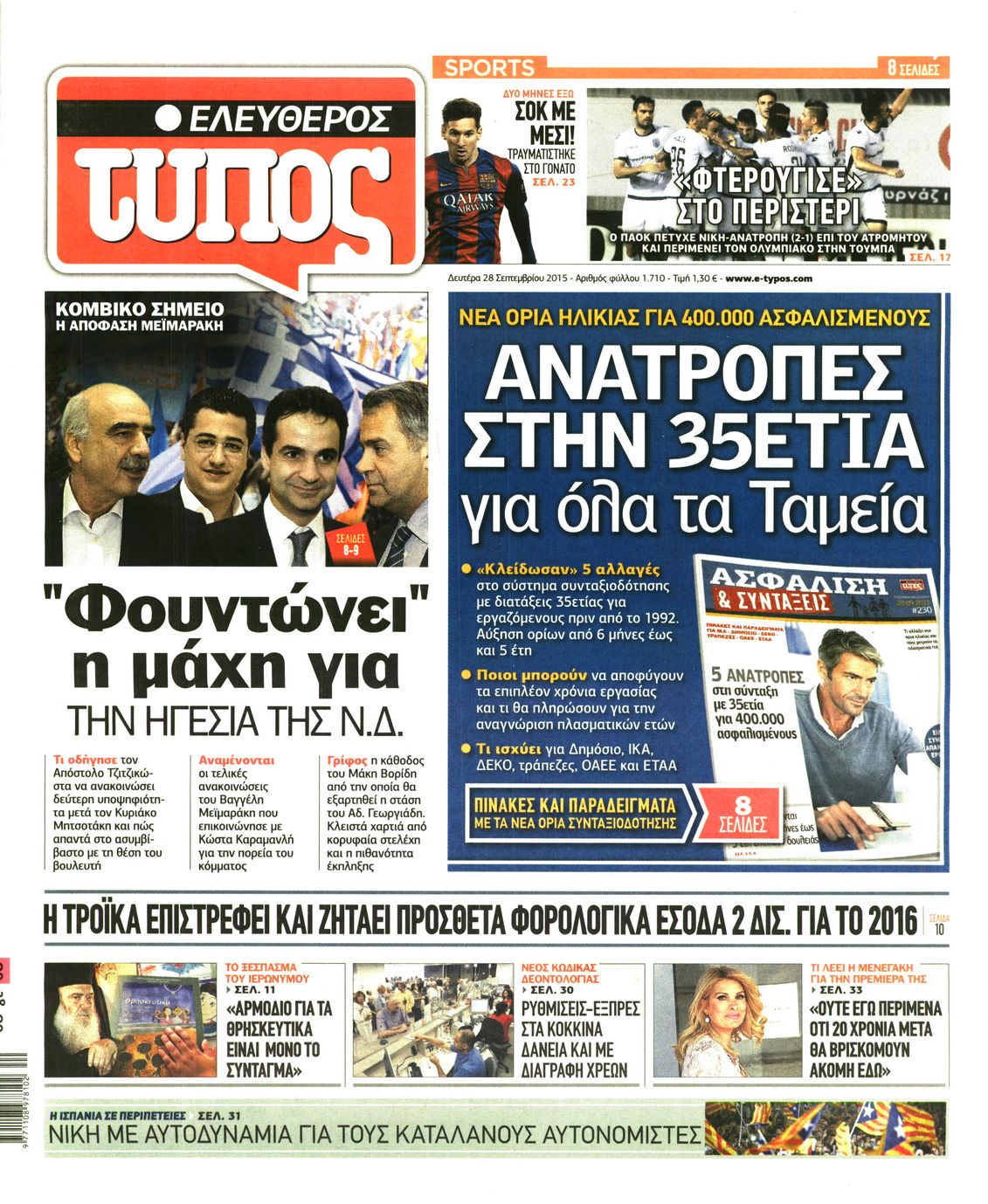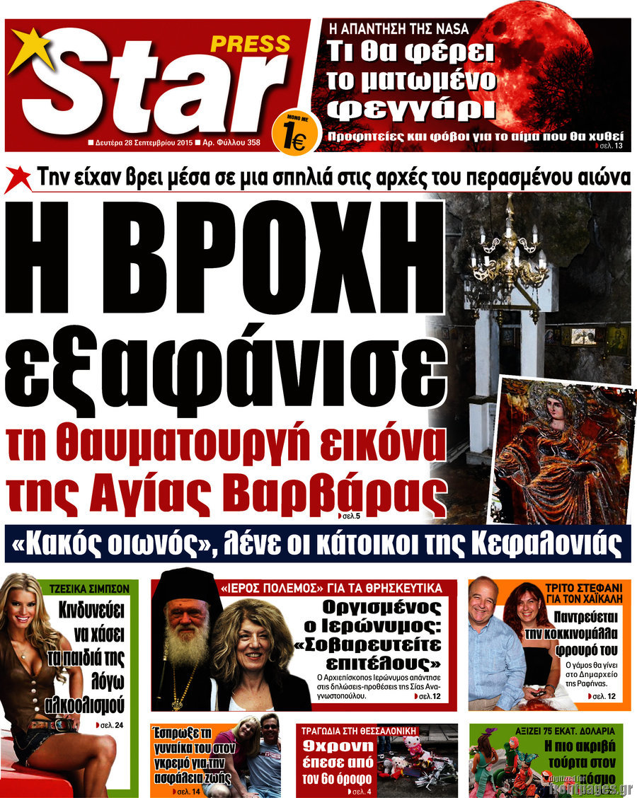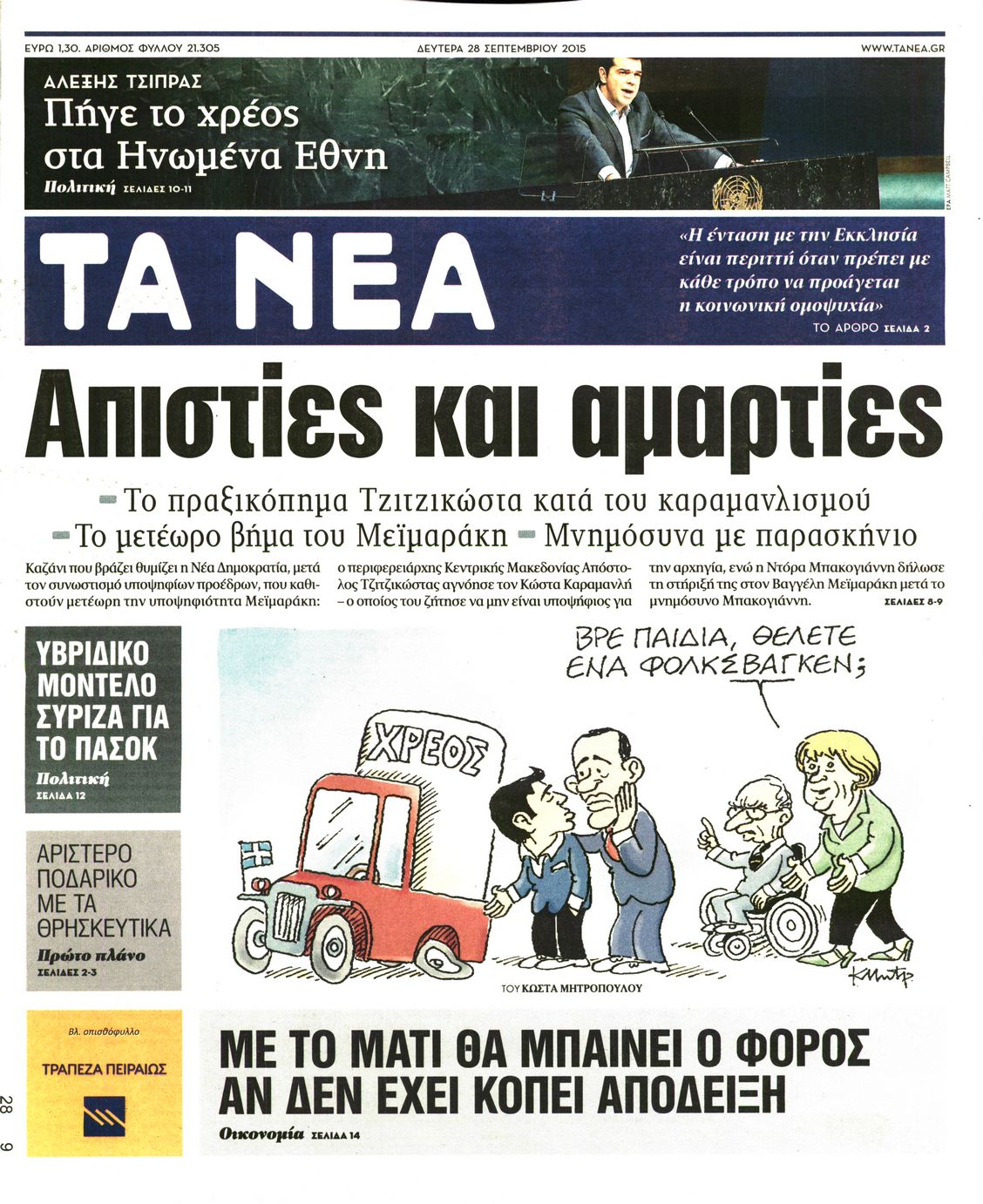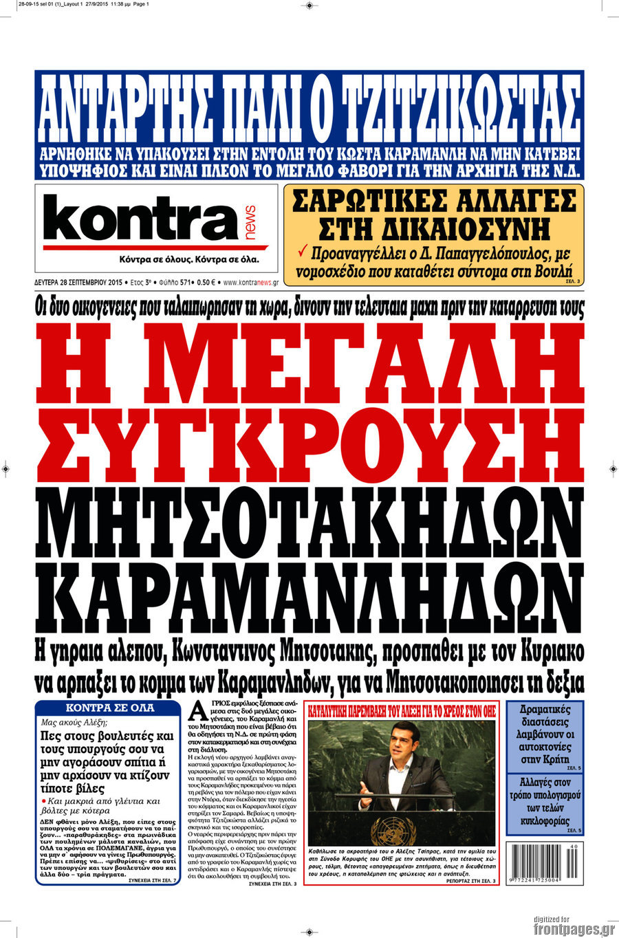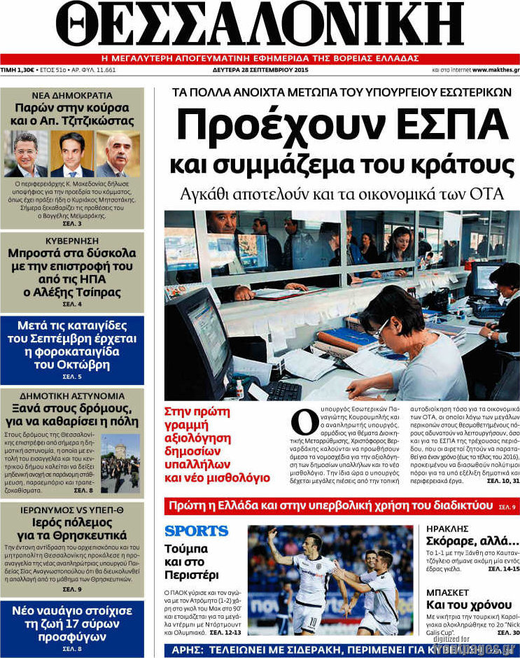 Οι πολιτικές εφημερίδες 28/9/2015 Enikos Newsroom 07:54, Δευτέρα 28 Σεπτεμβρίου 2015 Media Διαβάστε τα σημερινά πρωτοσέλιδα των πολιτικών εφημερίδων. ΕΦΗΜΕΡΙΔΕΣ ΟΙ ΠΟΛΙΤΙΚΕΣ ΕΦΗΜΕΡΙΔΕΣ ΠΡΩΤΟΣΕΛΙΔΑ Μοιράσου το: σχολίασε κι εσύ (0 σχόλια) Ακολουθήστε το enikos.gr στο Google News και μάθετε πρώτοι όλες τις ειδήσεις Δείτε όλες τις τελευταίες ειδήσεις από την Ελλάδα και τον Κόσμο στο enikos.gr Ειδήσεις Ροή Ειδήσεων 55 λεπτά πριν Αγρότες: Την Τρίτη η απόφαση για διάλογο ή κλιμάκωση των κινητοποιήσεών τους – Πώς χαρακτηρίζουν τις ανακοινώσεις Τσιάρα και οι επόμενες κινήσεις 31 λεπτά πριν Τραμπ για Ουκρανία: «Είμαστε πιο κοντά σε συμφωνία από ποτέ» – «Πολυεθνική δύναμη» προτείνουν οι Ευρωπαίοι 49 λεπτά πριν Κυψέλη: Η 16χρονη που μαχαίρωσε την 14χρονη είχε συλληφθεί 3 φορές στο παρελθόν – Έβριζε καθηγητές, έβαζε φωτιές σε κάδους και εκβίαζε συμμαθητές της 1 ώρα πριν Χαλκιδική: Πώς δρούσαν οι αστυνομικοί που συνελήφθησαν για κλήσεις που δεν έκοβαν – Η «ετήσια συνδρομή» για τα μπλόκα της Τροχαίας και οι «δωρεές» 14 λεπτά πριν Τρομοκρατική επίθεση στο Σίδνεϊ: Θλίψη για τα 15 θύματα – Οργή στην εβραϊκή κοινότητα που προειδοποιούσε επί δύο χρόνια 2 ώρες πριν Ύπνος: Η αρχαία μορφή άσκησης που αποδεικνύεται αποτελεσματική στην αντιμετώπιση της αϋπνίας, σύμφωνα με μελέτη 3 ώρες πριν Αριθμολογία: Ο τυχερός σας αριθμός, ανάλογα με τον μήνα γέννησής σας 4 ώρες πριν Πώς να μην μαραίνονται γρήγορα τα κομμένα λουλούδια: Το λάθος στην τοποθέτηση του βάζου που πρέπει να αποφεύγετε 34 λεπτά πριν Επιστήμονες ίσως έλυσαν το μυστήριο γύρω από τα Χόμπιτ – Νέα έρευνα αποκαλύπτει πώς εξαφανίστηκαν 7 λεπτά πριν ΚΚΕ: Το νομοσχέδιο – «λαιμητόμος» του υπουργείου Άμυνας δεν πρέπει να περάσει 14 λεπτά πριν Τρομοκρατική επίθεση στο Σίδνεϊ: Θλίψη για τα 15 θύματα – Οργή στην εβραϊκή κοινότητα που προειδοποιούσε επί δύο χρόνια 18 λεπτά πριν Ινστιτούτο Prolepsis: Κρίσιμα εμπόδια και βασικές προϋποθέσεις για την ενίσχυση της υγείας στα σωφρονιστικά ιδρύματα – Ευρήματα από το έργο PARTNER 24 λεπτά πριν Χανιά: Ηλικιωμένες μητέρες κρατουμένων προσπάθησαν να περάσουν ναρκωτικά στις φυλακές 31 λεπτά πριν Τραμπ για Ουκρανία: «Είμαστε πιο κοντά σε συμφωνία από ποτέ» – «Πολυεθνική δύναμη» προτείνουν οι Ευρωπαίοι ENIKOS NETWORK Πότε το χρόνιο ροχαλητό να αποτελέσει ένδειξη κινδύνου για την καρδιά; Τι λένε οι ειδικοί Μάριος Θεμιστοκλέους: Το ΕΣΥ ενισχύεται, εκσυγχρονίζεται, αλλάζει ΕΒΕΠ για αγροτικές κινητοποιήσεις: Κάθε επιπλέον εβδομάδα προσθέτει περίπου 200 εκατ. ευρώ ζημιά Τι προβλέπει το νομοσχέδιο του υπουργείου Εθνικής Άμυνας – Oι αλλαγές στους μισθούς Σύγχρονος Νοστράδαμος: Προειδοποιεί για «μεγάλο γεγονός» τους επόμενους μήνες που θα συγκλονίσει τη Βρετανία και τον κόσμο Τεστ παρατηρητικότητας: Μπορείτε να βρείτε τις 3 διαφορές στις εικόνες με έναν πιγκουίνο σε 14 δευτερόλεπτα περισσότερα 21:35 , Δευτέρα 15 Δεκεμβρίου 2025 Το Σπίτι Δίπλα Στο Ποτάμι: Η Ιουλία και ο Φωκάς μετακομίζουν στη Ρόδο – Δύο νέοι χαρακτήρες μπαίνουν στη σειρά Δύο νέοι, κομβικοί χαρακτήρες κάνουν την εμφάνισή τους αυτή την εβδομάδα στην αγαπημένη σειρά ... 19:46 , Δευτέρα 15 Δεκεμβρίου 2025 Άγιος έρωτας: Η Χριστίνα λέει την αλήθεια στον Αντρέα Ο Βασίλης δέχεται επίθεση από τους συμμαθητές του, η Αναστασία είναι συντετριμμένη με την απώλ... 18:45 , Δευτέρα 15 Δεκεμβρίου 2025 Συνέδριο «Ελληνικός Τουρισμός 2025, Μια εθνική υπόθεση!» – «Ο Θαλάσσιος Πυλώνας ως Ενιαία Στρατηγι