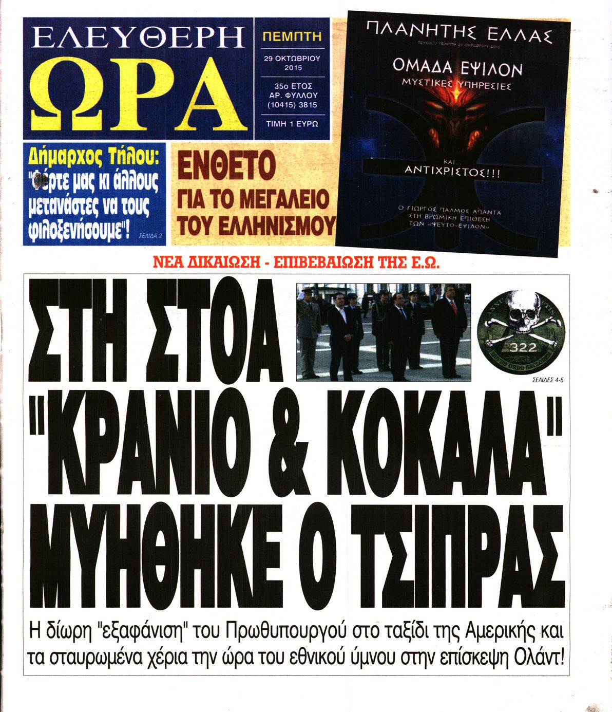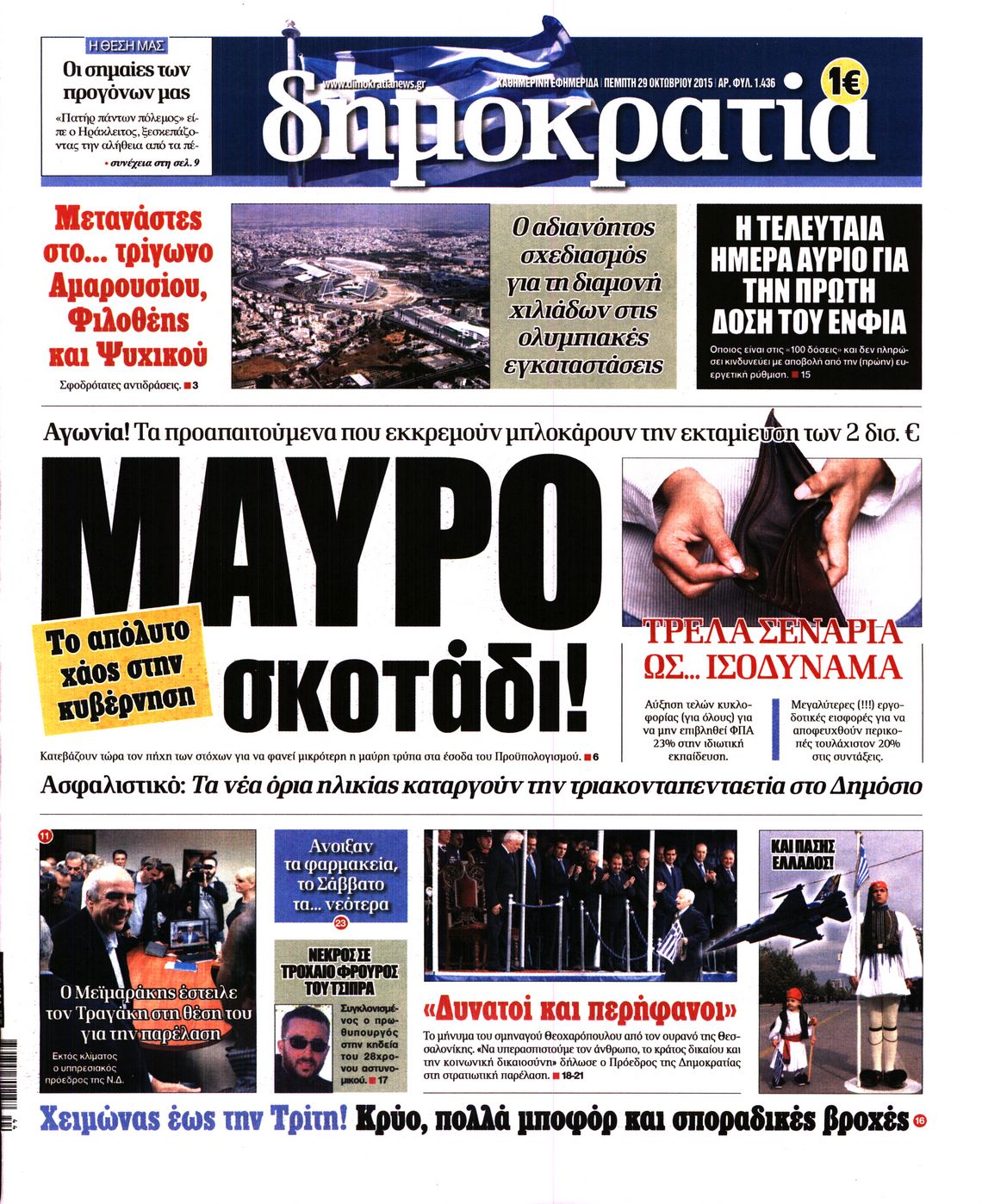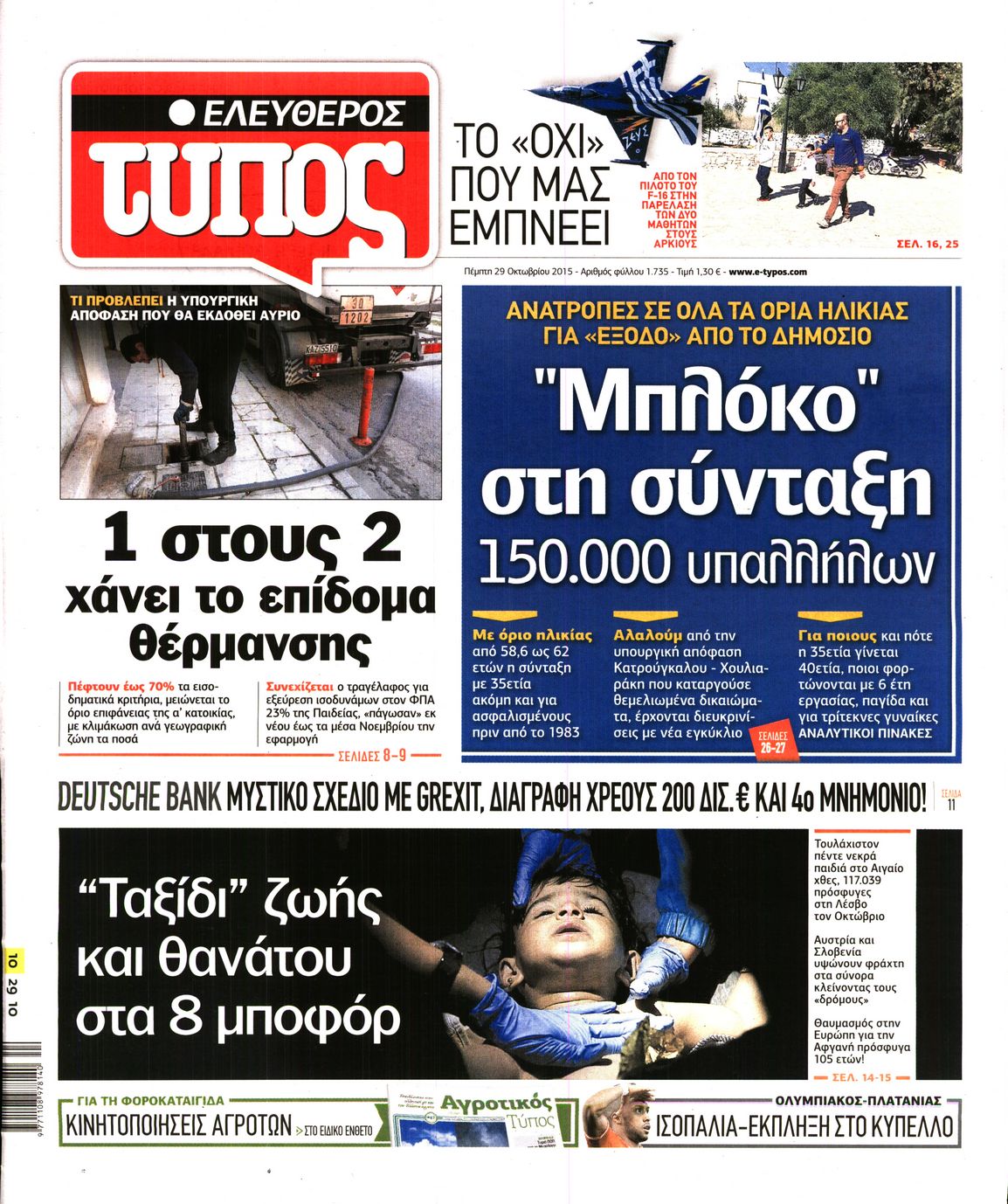 Οι πολιτικές εφημερίδες 29/10/2015 Enikos Newsroom 06:28, Πέμπτη 29 Οκτωβρίου 2015 Media Διαβάστε τα σημερινά πρωτοσέλιδα των πολιτικών εφημερίδων: ΠΟΛΙΤΙΚΕΣ ΕΦΗΜΕΡΙΔΕΣ ΠΡΩΤΟΣΕΛΙΔΑ Μοιράσου το: σχολίασε κι εσύ (0 σχόλια) Ακολουθήστε το enikos.gr στο Google News και μάθετε πρώτοι όλες τις ειδήσεις Δείτε όλες τις τελευταίες ειδήσεις από την Ελλάδα και τον Κόσμο στο enikos.gr Ειδήσεις Ροή Ειδήσεων 5 ώρες πριν Χριστούγεννα στα μπλόκα: Επιμένουν στις κινητοποιήσεις τους οι αγρότες – Ανοίγουν τα διόδια το Σαββατοκύριακο 5 ώρες πριν Ουκρανία: Η άνευ προηγουμένου επίθεση σε ρωσικό τάνκερ στη Μεσόγειο και το μήνυμα προς στον Πούτιν – Το «μακρύ χέρι» του Κιέβου 4 ώρες πριν Πούτιν: Τα μηνύματα σε Ευρώπη και ΝΑΤΟ από το μαραθώνιο «σόου» του – Η απαίτηση για «σεβασμό» και η ειρήνη «με τους όρους» της Μόσχας 5 ώρες πριν Τραμπ: Δεν αποκλείει την πιθανότητα ενός πολέμου στη Βενεζουέλα – «Ο Μαδούρο ξέρει καλύτερα από τον καθένα τι ακριβώς θέλω» 6 ώρες πριν Συνεχίζει να προκαλεί ο Μίτσκοσκι: «Για μένα το όνομα Μακεδονία είναι ιερό» 4 ώρες πριν Ανακαλύφθηκαν αρχαία χρυσά νομίσματα 2.200 ετών που απεικονίζουν τον θεό Απόλλωνα – Η άγνωστη σύνδεση με τον Φίλιππο Β΄ της Μακεδονίας 5 ώρες πριν Ύπνος: Μια κρυφή κατάσταση του εγκεφάλου πριν από τον ύπνο μπορεί να είναι το “κλειδί” για υψηλή ευφυΐα και δημιουργικότητα 6 ώρες πριν Αριθμολογία: Οι άνθρωποι που έχουν γεννηθεί αυτές τις 4 ημερομηνίες, συχνά παρεξηγούνται – «Η καλοσύνη τους κρύβει τεράστια δύναμη» 7 ώρες πριν Ξεχάστε το καθάρισμα το Σαββατοκύριακο: Ο «κανόνας των 20 λεπτών» που θα σας λύσει τα χέρια 2 λεπτά πριν Ταμίλα Κουλίεβα: «Δεν θέλω να είμαι κάποια που πορεύεται συνεχώς με τις ίδιες αναφορές» 17 λεπτά πριν Η Ελλάδα προσχωρεί στη Διεθνή Επιτροπή Αποζημιώσεων για την Ουκρανία 32 λεπτά πριν GNTM: Η Ξένια Τσίρκοβα αναδείχθηκε μεγάλη νικήτρια και πήρε τις 50.000 ευρώ – Ποιος βρέθηκε σε απόσταση αναπνοής; 47 λεπτά πριν Θεσσαλονίκη: Εξαφανίστηκε 13χρονος από χώρο φιλοξενίας ασυνόδευτων ανηλίκων στο Ωραιόκαστρο 57 λεπτά πριν Ντόναλντ Τραμπ: «Πολύ βαριά αντίποινα» στη Συρία – «Πλήττουμε πολύ δυνατά οχυρά του Ισλαμικού Κράτους» ENIKOS NETWORK Το ΕΚΑΒ τιμήθηκε από την Ακαδημία Αθηνών για τα 40 χρόνια προσφοράς του Έχετε πραγματικά μεγάλη καρδιά; 10 χαρακτηριστικά όσων έχουν καλοσύνη Αναστολή μέτρων αναγκαστικής εκτέλεσης για κτηνοτρόφους που πλήττονται από την ευλογιά των αιγοπροβάτων Πλήρης επάρκεια προϊόντων στις λαϊκές της Αττικής, παρά τις αγροτικές κινητοποιήσεις – Τι απαντούν οι πωλητές Χαρτογραφώντας το «σημείο χωρίς επιστροφή»: Για πρώτη φορά αποκαλύπτεται με λεπτομέρεια το ακανθώδες όριο της ατμόσφαιρας τ... Η Google καταργεί τη λειτουργία «dark web report» – Πώς θα μπορούν οι χρήστες να διαγράφουν τα δεδομένα τους περισσότερα 02:50 , Σάββατο 20 Δεκεμβρίου 2025 GNTM: Η Ξένια Τσίρκοβα αναδείχθηκε μεγάλη νικήτρια και πήρε τις 50.000 ευρώ – Ποιος βρέθηκε σε απόσταση αναπνοής; Με φαντασμαγορικό τρόπο ολοκληρώθηκε το βράδυ της Παρασκευής ο μεγάλος τελικός του GNTM, μέσα ... 22:42 , Παρασκευή 19 Δεκεμβρίου 2025 Γιώργος Γιαννόπουλος για “Το σόι σου”: “Είναι ευτυχία και ευλογία αυτή η σειρά” «Είναι ευτυχία και ευλογία η συγκυρία αυτής της σειράς», θα πει ο Γιώργος Γιαννόπουλος -ο αγαπ... 20:37 , Παρασκευή 19 Δεκεμβρίου 2025 Don’t Forget The Lyrics: Η Έλλη Κοκκίνου υποδέχεται 4 παίκτες που θα κάνουν τα πάντα για να μη χάσουν ούτε… μισή λέξη από τους στίχους Το «Don’t Forget The Lyrics» επιστρέφει απόψ