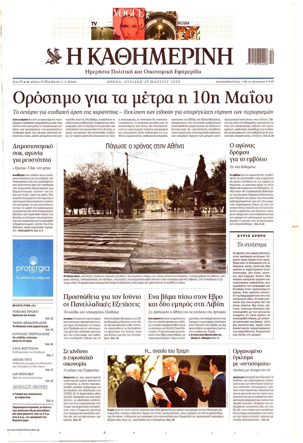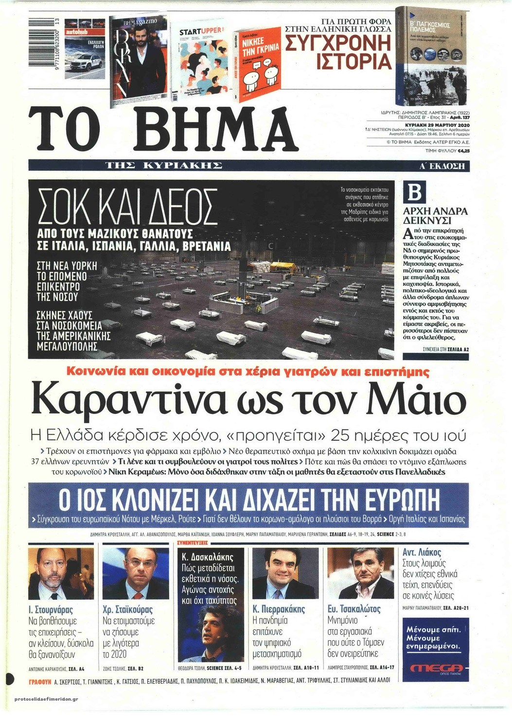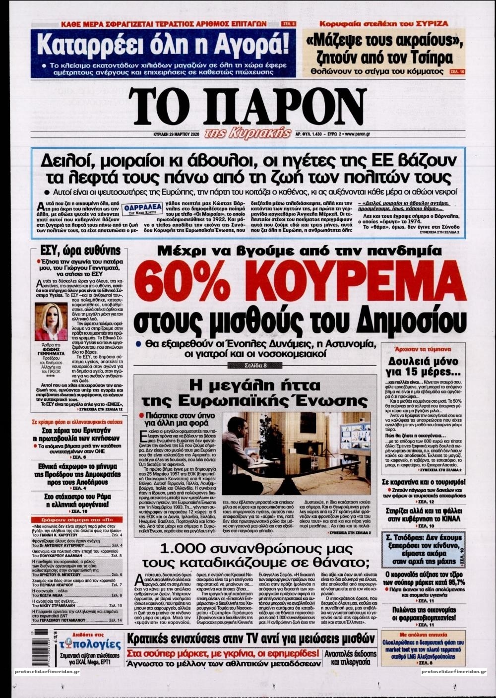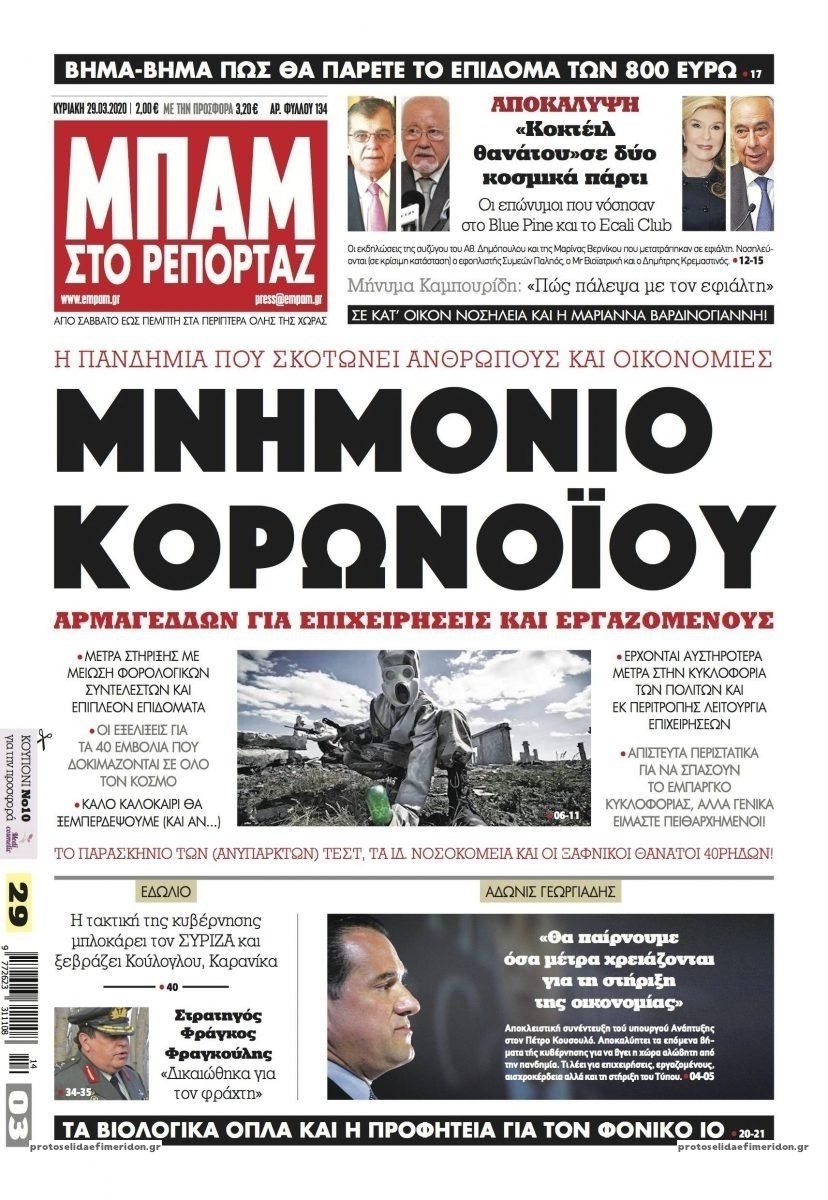 Οι πολιτικές εφημερίδες 29/3/2020 Σήφης Γαρυφαλάκης 07:20, Κυριακή 29 Μαρτίου 2020 Media Διαβάστε τα πρωτοσέλιδα των πολιτικών εφημερίδων… ΕΦΗΜΕΡΙΔΕΣ ΠΟΛΙΤΙΚΕΣ ΕΦΗΜΕΡΙΔΕΣ ΠΡΩΤΟΣΕΛΙΔΑ ΠΡΩΤΟΣΕΛΙΔΑ ΕΦΗΜΕΡΙΔΩΝ Μοιράσου το: σχολίασε κι εσύ (0 σχόλια) Ακολουθήστε το enikos.gr στο Google News και μάθετε πρώτοι όλες τις ειδήσεις Δείτε όλες τις τελευταίες ειδήσεις από την Ελλάδα και τον Κόσμο στο enikos.gr Ειδήσεις Ροή Ειδήσεων 55 λεπτά πριν Ευρωπαϊκή Ένωση: Συμφωνία για δάνειο 90 δισ. ευρώ στην Ουκρανία τη διετία 2026-2027 5 ώρες πριν ΟΠΕΚΕΠΕ: Προφυλακιστέος ο φερόμενος αρχηγός και ο λογιστής της εγκληματικής οργάνωσης 7 ώρες πριν Αυξάνουν την πίεση προς την κυβέρνηση οι αγρότες: Κλείνουν παρακαμπτήριους και ανοίγουν διόδια – Τι θα γίνει τις γιορτές 6 ώρες πριν Φοινικούντα: Το Σάββατο απολογείται ο 30χρονος γιος γνωστού επιχειρηματία της Πλάκας που παραδόθηκε – Όσα είπε στους αστυνομικούς και ο ρόλος του στο έγκλημα 5 ώρες πριν ΑΕΚ – Κραϊόβα 3-2: Επική ανατροπή και πρόκριση στους «16» του Conference League η Ένωση 6 ώρες πριν Αρχαιολόγοι ανακάλυψαν ρωμαϊκά τεχνουργήματα από μια πόλη που δεν υπήρξε ποτέ – Τα τρία εντυπωσιακά κτίρια και ο αμφορέας με τις… σαρδέλες 7 ώρες πριν Ύπνος: Η απλή βραδινή ρουτίνα για να προστατεύσετε τα μαλλιά σας από το κρύο κατά τη διάρκεια του χειμώνα 8 ώρες πριν Manifesting: Πώς να συναντήσετε τον σύντροφο της ζωής σας, ανάλογα με τον μήνα γέννησής σας 2 ημέρες πριν 20 χρόνια τα Χριστούγεννα ξεκινούν στα Public με μεγάλη ποικιλία σε δώρα! 4 λεπτά πριν Αλεξάντερ Λουκασένκο: Η Λευκορωσία βρίσκεται κοντά στην αποκατάσταση των σχέσεών της με τις ΗΠΑ 19 λεπτά πριν Αυστραλία: Κήρυξε την Κυριακή (21/12) ημέρα εθνικού πένθους για τη φονική επίθεση στην παραλία Μπόνταϊ 29 λεπτά πριν Ρόδος: Δάσκαλος καράτε καταδικάστηκε για ασέλγεια σε ανήλικες αθλήτριες – Μαρτυρίες για αγγίγματα σε ευαίσθητα σημεία 43 λεπτά πριν Γουατεμάλα: Εξαρθρώθηκε κύκλωμα διακίνησης μεταναστών προς τις ΗΠΑ – Συνελήφθησαν 14 άτομα 48 λεπτά πριν Βουλγαρία: Χιλιάδες πολίτες στους δρόμους κατά της απερχόμενης κυβέρνησης και της διαφθοράς ENIKOS NETWORK Σε περίοδο αυξημένης δραστηριότητας η γρίπη στην Ελλάδα-Μέτρα προστασίας από τον ΕΟΔΥ Σκέφτεστε συνέχεια συζητήσεις που έχετε κάνει; Τι σημαίνει αυτό, σύμφωνα με ειδικό Στεγαστικό: Τι λέει η ΠΟΜΙΔΑ για τα νέα μέτρα που ανακοίνωσε ο Κυριάκος Μητσοτάκης Λαγκάρντ: Αισιόδοξη για την ανάπτυξη της Ευρωζώνης, αβέβαιη για τον πληθωρισμό Χαρτογραφώντας το «σημείο χωρίς επιστροφή»: Για πρώτη φορά αποκαλύπτεται με λεπτομέρεια το ακανθώδες όριο της ατμόσφαιρας τ... Η Google καταργεί τη λειτουργία «dark web report» – Πώς θα μπορούν οι χρήστες να διαγράφουν τα δεδομένα τους περισσότερα 02:50 , Παρασκευή 19 Δεκεμβρίου 2025 GNTM: «Κλείδωσαν» οι τέσσερις φιναλίστ – Μεγάλη ανατροπή στις τελευταίες αποχωρήσεις Για προτελευταία φορά εμφανίστηκαν στο πλατό του GNTM οι φιναλίστ του φετινού κύκλου, το βράδυ... 17:45 , Πέμπτη 18 Δεκεμβρίου 2025 ROUK ZOUK: Εορταστικό επεισόδιο με καλεσμένους τους πρωταγωνιστές του «Γιατί ρε πατέρα» Το Σάββατο 20 Δεκεμβρίου στις 21:00, η Ζέτα Μακρυπούλια υποδέχεται εκλεκτούς ηθοποιούς που όλο... 17:20 , Πέμπτη 18 Δεκεμβρίου 2025 Άγιος έρωτας: Η Χριστίνα εξομολογείται στον πατέρα Νικόλαο, απόψε στις 21:00 στον Alpha Η Νότα αποφασίζει να εκδικηθεί τον Πέτρο και τον Στέφανο, για χάρη του Λούη, όμως τα πράγματα ... 16:50 , Πέμπτη 18 Δεκεμβρίου 2025 Να μ’ αγαπάς: Ζωή και Φωτεινή συμφιλιώνονται ως μάνα με κόρη, από