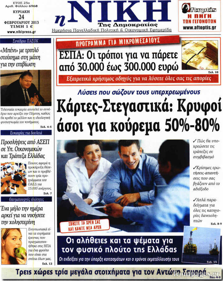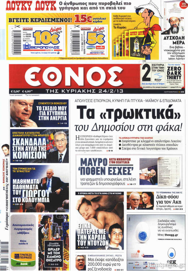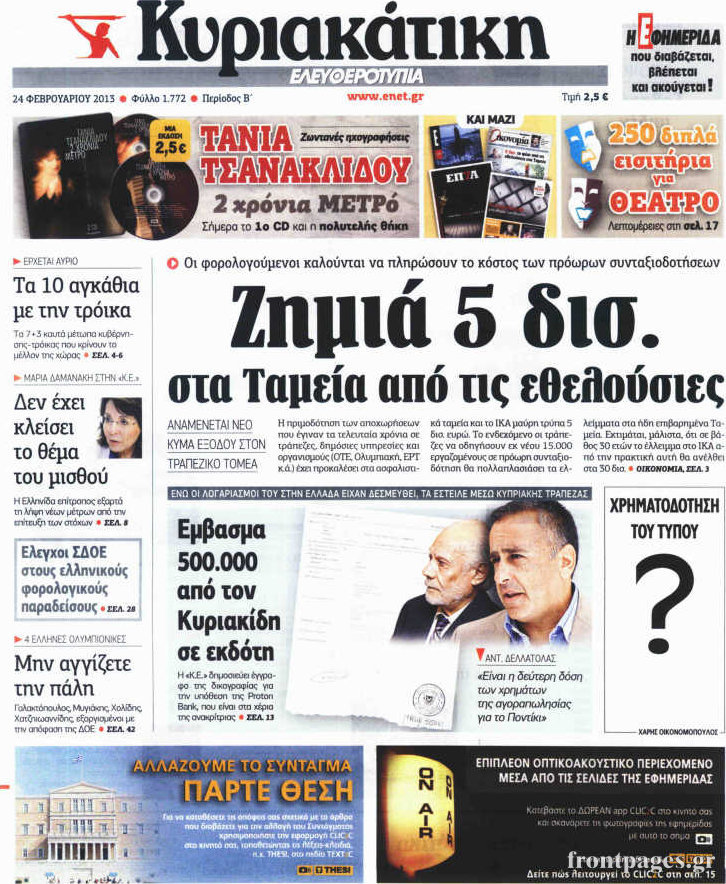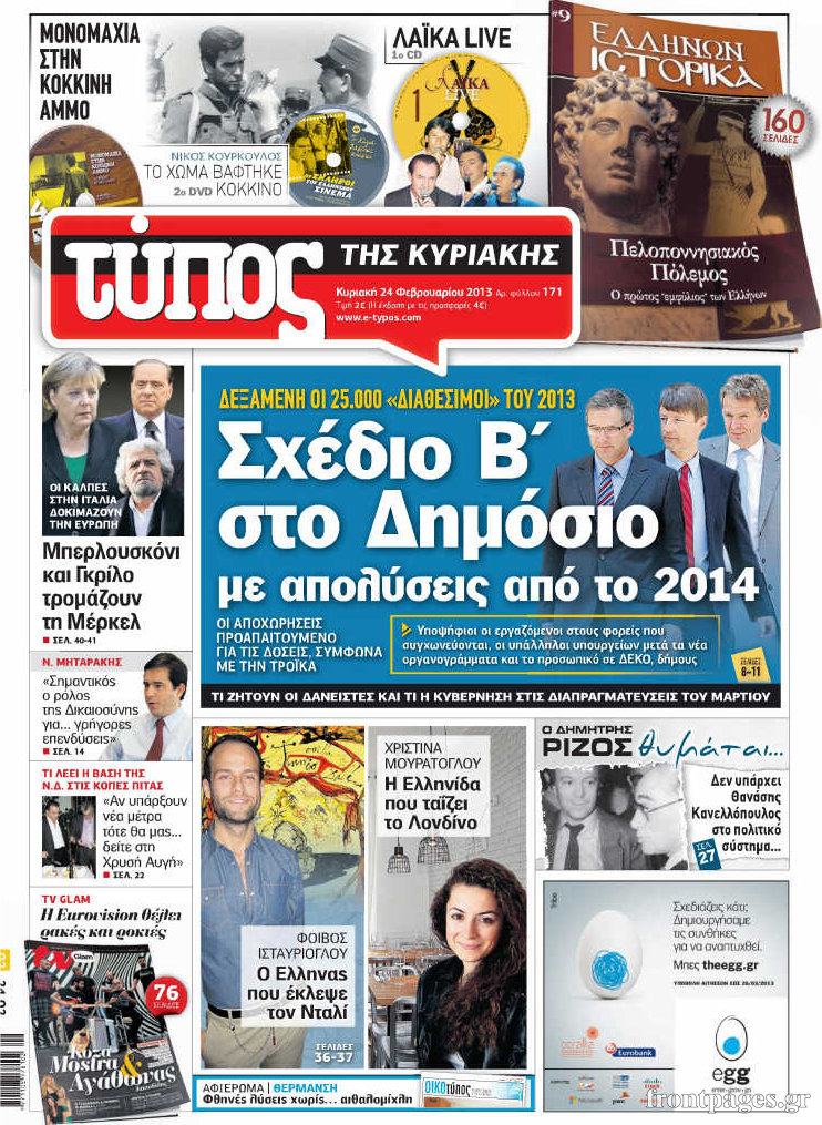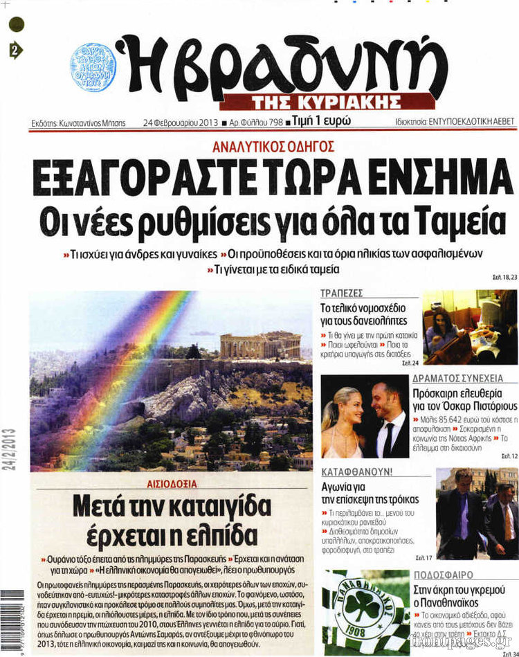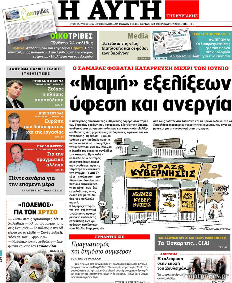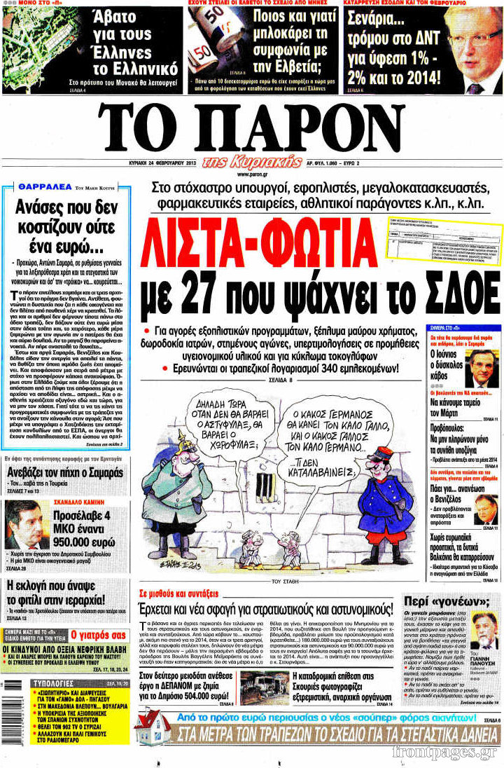 Οι πολιτικές εφημερίδες Enikos Newsroom 08:48, Κυριακή 24 Φεβρουαρίου 2013 Media Οι πολιτικές εφημερίδες Τα πρωτοσέλιδα των πολιτικών εφημερίδων. ΕΦΗΜΕΡΙΔΕΣ ΠΟΛΙΤΙΚΕΣ ΕΦΗΜΕΡΙΔΕΣ ΠΡΩΤΟΣΕΛΙΔΑ Μοιράσου το: σχολίασε κι εσύ (0 σχόλια) Ακολουθήστε το enikos.gr στο Google News και μάθετε πρώτοι όλες τις ειδήσεις Δείτε όλες τις τελευταίες ειδήσεις από την Ελλάδα και τον Κόσμο στο enikos.gr Ειδήσεις Ροή Ειδήσεων 4 ώρες πριν Υπόθεση Έπσταϊν: Το Υπουργείο Δικαιοσύνης δημοσιοποίησε μια σειρά από εξαιρετικά επεξεργασμένα αρχεία – «Λείπουν τα πιο σημαντικά έγγραφα», λένε οι Δημοκρατικοί 1 ώρα πριν Γιορτές με μπλόκα για τους αγρότες: Ανοίγουν διόδια και μοιράζουν προϊόντα στους ταξιδιώτες 2 ώρες πριν Εξαφάνιση 33χρονου γιατρού στην Κρήτη: «Άναψα τα φώτα, τρόμαξε και άρχισε να τρέχει στα χωράφια» – Η τελευταία διαδρομή και η μαρτυρία «κλειδί» 3 ώρες πριν Ο «χάρτης» με τις αυξήσεις και τις φοροελαφρύνσεις του 2026 – Ποιοι και πόσα κερδίζουν 1 ώρα πριν Τα αρχεία του Έπσταϊν αποκαλύπτουν φωτογραφία του έκπτωτου πρίγκιπα Άντριου – Είναι ξαπλωμένος στην αγκαλιά 5 γυναικών 1 ώρα πριν Μία νέα «χρυσή» περίοδος αρχίζει για 3 ζώδια από σήμερα – «Μία αναπάντεχη ευκαιρία οδηγεί στην επιτυχία» 6 ώρες πριν Αυγά: Πόσα μπορείτε να τρώτε την ημέρα με ασφάλεια για μέγιστη πρόσληψη πρωτεΐνης 4 ώρες πριν Αρχαιολόγοι ανακάλυψαν σε χωράφι απεικόνιση 600 ετών ενός Αγίου – Τα στοιχεία που δείχνουν ότι μαρτύρησε 3 ώρες πριν Αγχώνεται για το χριστουγεννιάτικο δώρο που πήρε στην πλούσια σύντροφό του – «Φοβάμαι πως θα το βρει φθηνιάρικο, φοράει βραχιόλια Cartier» 5 λεπτά πριν Στέφανος Παπαδόπουλος: Η συνέντευξη μετά τη μήνυση στον Γιώργο Μαζωνάκη – «Δεν θέλω να τα βρούμε εξωδικαστικά» 12 λεπτά πριν Τραγωδία στην άσφαλτο στα Χανιά: Νεκρός 37χρονος οδηγός ΙΧ – Τον βρήκαν ώρες μετά το τροχαίο 21 λεπτά πριν Τα Labubu «μετακομίζουν» στο Χόλιγουντ: Η Sony Pictures ετοιμάζει live-action ταινία με τον σκηνοθέτη του «Wonka» 28 λεπτά πριν Νέες ταυτότητες: Μεγάλη αναμονή για ραντεβού στην Αττική – Τέλος τα ταξίδια εκτός Ελλάδος από τον Αύγουστο για όσους δεν έχουν αλλάξει 37 λεπτά πριν Οι 7 φράσεις που δεν λένε ποτέ οι συναισθηματικά έξυπνοι άνθρωποι κατά τη διάρκεια ενός καβγά ENIKOS NETWORK Είστε μόνιμα απρόσεκτοι; 3 σημάδια που δείχνουν ότι μπορεί να είναι σύμπτωμα πάθησης Πόσα κιλά παίρνουμε πραγματικά τα Χριστούγεννα, σύμφωνα με την επιστήμη – Πώς να το αποτρέψουμε; e-ΕΦΚΑ και ΔΥΠΑ: Έρχονται νέες πληρωμές έως τις 24 Δεκεμβρίου – Ποιοι πάνε ταμείο Επίδομα παιδιού: Τι αλλάζει από το 2026 – Το όφελος από τις φορολογικές ελαφρύνσεις Χαρτογραφώντας το «σημείο χωρίς επιστροφή»: Για πρώτη φορά αποκαλύπτεται με λεπτομέρεια το ακανθώδες όριο της ατμόσφαιρας τ... Η Google καταργεί τη λειτουργία «dark web report» – Πώς θα μπορούν οι χρήστες να διαγράφουν τα δεδομένα τους περισσότερα 09:30 , Σάββατο 20 Δεκεμβρίου 2025 «Porto Leone: Στη γειτονιά με τα κόκκινα φανάρια» – Ο Χρόνης αποκαλύπτει στην Αλεξάνδρα το μυστικό για το παιδί της Λένας Η μεγάλη δραματική σειρά του Apha «Porto Leone: Στη γειτονιά με τα κόκκινα φανάρια» μας μεταφέ... 08:14 , Σάββατο 20 Δεκεμβρίου 2025 Τρομεροί γονείς: Η Μαρία Καβογιάννη εισβάλλει στο σπίτι της οικογένειας Στεφανίδη Όσα θα δούμε στο νέο διπλό επεισόδιο της σειράς «Τρομεροί γονείς», σήμερα Σάββατο 20 Δεκεμβρίο... 05:48 , Σάββατο 20 Δεκεμβρίου 2025 Οι οικονομικές εφημερίδες 20/12/2025 Διαβάστε τα πρωτοσέλιδα από τις οικονομικές εφημερίδες, σήμερα 20/12/2025. 05:43 , Σάββατο 20 Δ