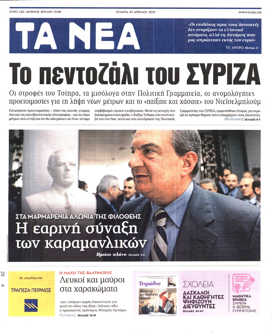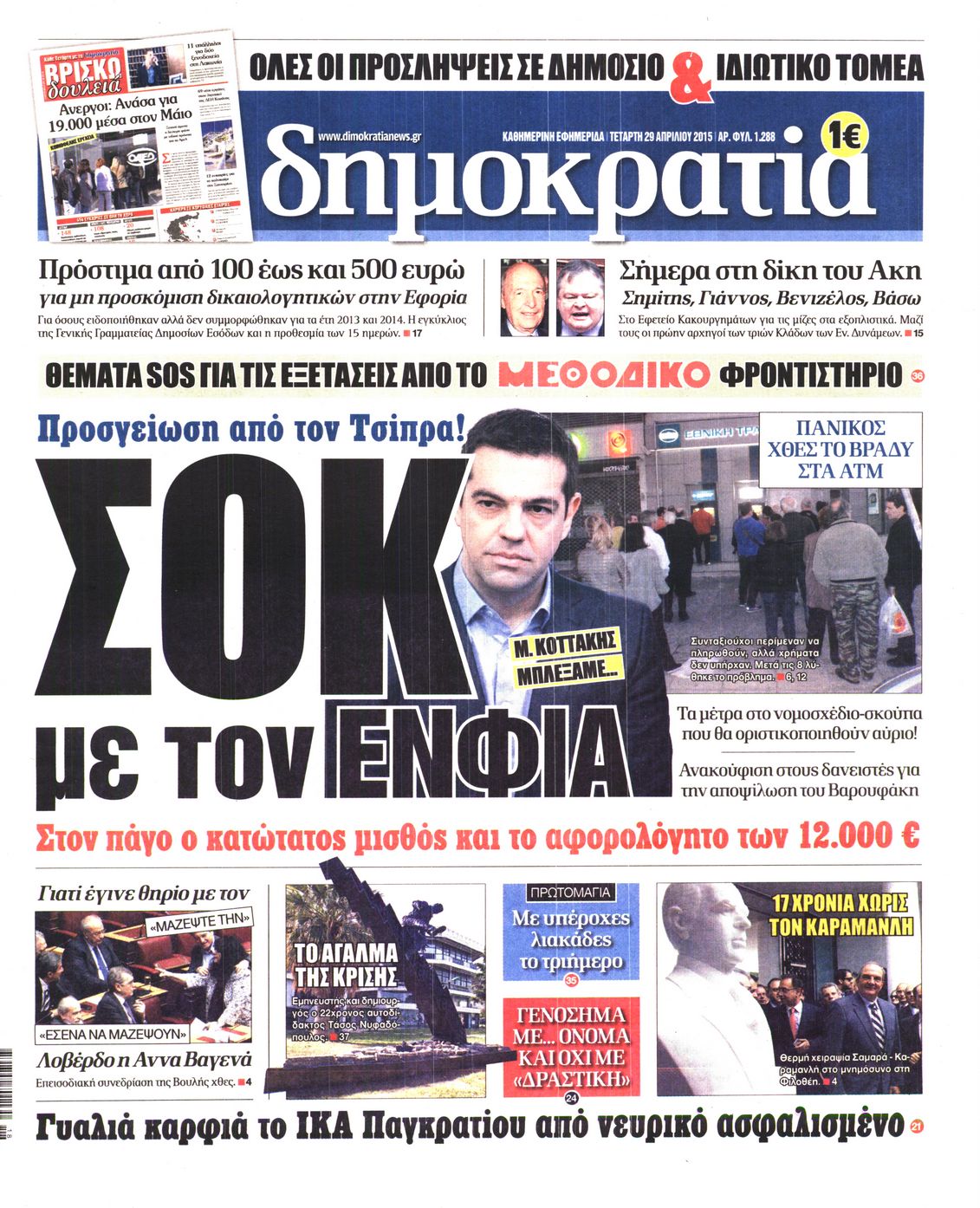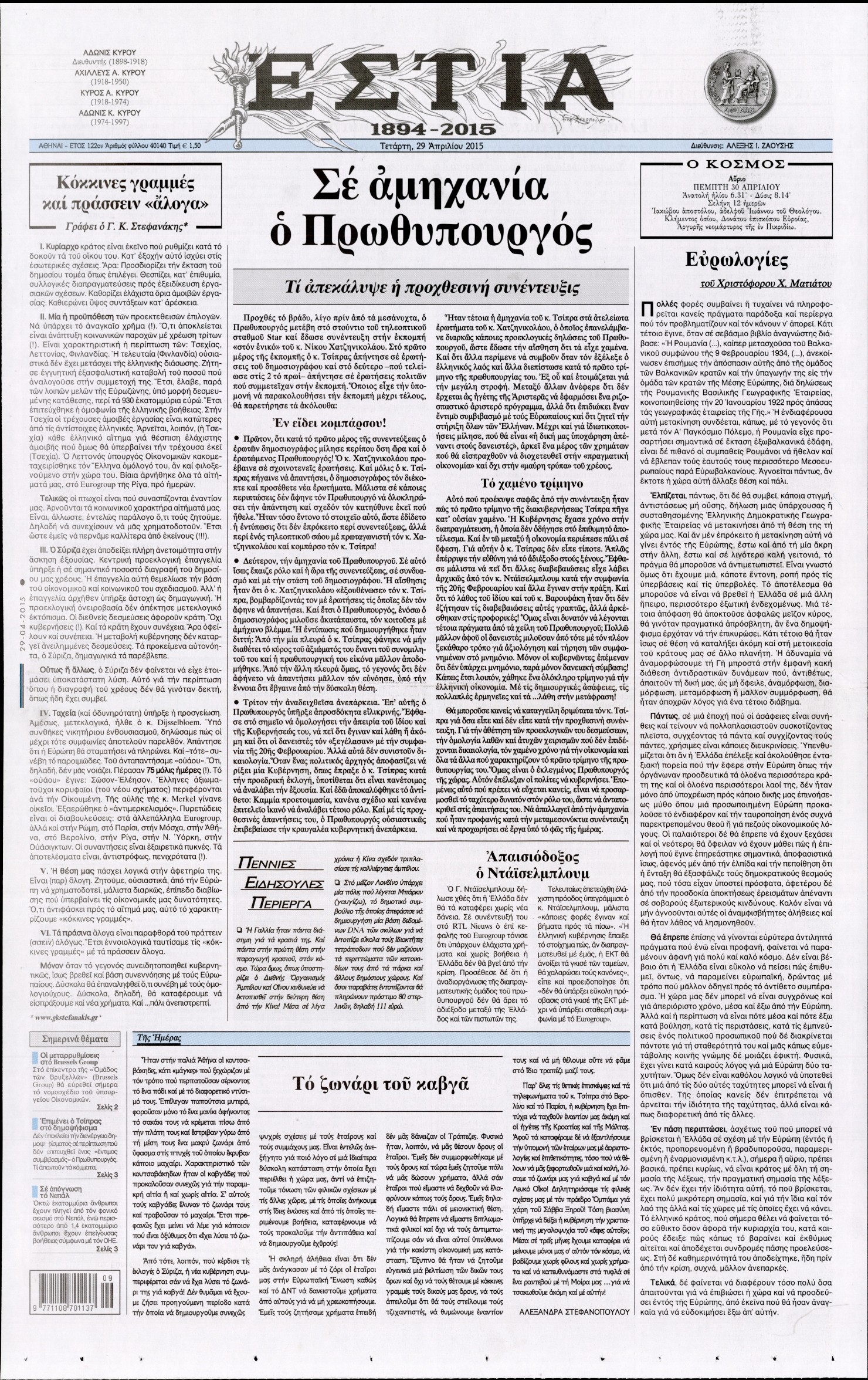 Οι πολιτικές εφημερίδες 29/4/2015 Enikos Newsroom 07:22, Τετάρτη 29 Απριλίου 2015 Media Διαβάστε τα σημερινά πρωτοσέλιδα των πολιτικών εφημερίδων: ΠΟΛΙΤΙΚΕΣ ΕΦΗΜΕΡΙΔΕΣ ΠΡΩΤΟΣΕΛΙΔΑ Μοιράσου το: σχολίασε κι εσύ (0 σχόλια) Ακολουθήστε το enikos.gr στο Google News και μάθετε πρώτοι όλες τις ειδήσεις Δείτε όλες τις τελευταίες ειδήσεις από την Ελλάδα και τον Κόσμο στο enikos.gr Ειδήσεις Ροή Ειδήσεων 1 ώρα πριν Υπόθεση Έπσταϊν: Το Υπουργείο Δικαιοσύνης δημοσιοποίησε μια σειρά από εξαιρετικά επεξεργασμένα αρχεία – «Λείπουν τα πιο σημαντικά έγγραφα», λένε οι Δημοκρατικοί 33 λεπτά πριν Ο «χάρτης» με τις αυξήσεις και τις φοροελαφρύνσεις του 2026 – Ποιοι και πόσα κερδίζουν 11 ώρες πριν Χριστούγεννα στα μπλόκα: Επιμένουν στις κινητοποιήσεις τους οι αγρότες – Ανοίγουν τα διόδια το Σαββατοκύριακο 2 ώρες πριν ΟΝΕΧ – MEGATUGS: Ξεκίνησε η ναυπήγηση ρυμουλκών στην Ελλάδα – Προθάλαμος πολεμικών πλοίων – Δείτε φωτογραφίες και βίντεο 1 ώρα πριν Καιρός: Αλλαγή σκηνικού σήμερα με βροχές και πτώση της θερμοκρασίας – Οι προβλέψεις των μετεωρολόγων για τα Χριστούγεννα 3 ώρες πριν Αυγά: Πόσα μπορείτε να τρώτε την ημέρα με ασφάλεια για μέγιστη πρόσληψη πρωτεΐνης 4 ώρες πριν Τα ζώδια σήμερα, Σάββατο 20 Δεκεμβρίου: Παρθένοι, το σύμπαν σας δίνει το κλειδί 3 ώρες πριν Οπτική ψευδαίσθηση: Μόνο αν είσαι ο Σέρλοκ Χολμς θα βρεις τον αριθμό «87» σε 7 δευτερόλεπτα 1 ώρα πριν Αρχαιολόγοι ανακάλυψαν σε χωράφι απεικόνιση 600 ετών ενός Αγίου – Τα στοιχεία που δείχνουν ότι μαρτύρησε 5 λεπτά πριν Παιδική υπέρταση: Μια σιωπηλή απειλή που αυξάνεται διεθνώς 5 λεπτά πριν Αγχώνεται για το χριστουγεννιάτικο δώρο που πήρε στην πλούσια σύντροφό του – «Φοβάμαι πως θα το βρει φθηνιάρικο, φοράει βραχιόλια Cartier» 12 λεπτά πριν Enerwave: Το νέο «ρεύμα» στη λιανική ενέργειας που αλλάζει την εμπειρία του καταναλωτή 17 λεπτά πριν Γιώργος Μαζωνάκης: Τη Δευτέρα η μήνυση του τραγουδιστή κατά του 22χρονου 26 λεπτά πριν Αμαλία Κωστοπούλου: Το μήνυμα για το χειρουργείο στο γόνατο – «Αυτός ο τραυματισμός μού στέρησε πολλά…» ENIKOS NETWORK Πόσα κιλά παίρνουμε πραγματικά τα Χριστούγεννα, σύμφωνα με την επιστήμη – Πώς να το αποτρέψουμε; Το δημοφιλές ρόφημα που αυξάνει την πίεση πιο γρήγορα και από το αλάτι Mega χριστουγεννιάτικη φορολοταρία: «Κλείδωσε» η ημερομηνία για την κλήρωση – Ερωτήσεις και απαντήσεις Αναστολή μέτρων αναγκαστικής εκτέλεσης για κτηνοτρόφους που πλήττονται από την ευλογιά των αιγοπροβάτων Χαρτογραφώντας το «σημείο χωρίς επιστροφή»: Για πρώτη φορά αποκαλύπτεται με λεπτομέρεια το ακανθώδες όριο της ατμόσφαιρας τ... Η Google καταργεί τη λειτουργία «dark web report» – Πώς θα μπορούν οι χρήστες να διαγράφουν τα δεδομένα τους περισσότερα 08:14 , Σάββατο 20 Δεκεμβρίου 2025 Τρομεροί γονείς: Η Μαρία Καβογιάννη εισβάλλει στο σπίτι της οικογένειας Στεφανίδη Όσα θα δούμε στο νέο διπλό επεισόδιο της σειράς «Τρομεροί γονείς», σήμερα Σάββατο 20 Δεκεμβρίο... 05:48 , Σάββατο 20 Δεκεμβρίου 2025 Οι οικονομικές εφημερίδες 20/12/2025 Διαβάστε τα πρωτοσέλιδα από τις οικονομικές εφημερίδες, σήμερα 20/12/2025. 05:43 , Σάββατο 20 Δεκεμβρίου 2025 Οι αθλητικές εφημερίδες 20/12/2025 Διαβάστε τα πρωτοσέλιδα από τις αθλητικές εφημερίδες, σήμερα 20/12/2025. 05:38 , Σάββατο 20 Δεκεμβρίου 2025 Οι πολιτικές εφημερίδες 20/12/2025 Διαβάστε τα πρωτοσέλιδα από τις πολιτικές εφημερίδες, σήμερα 20/12/2025. ΤΕΛΕΥΤΑΙΕΣ ΕΙΔΗΣΕΙΣ 5 λεπτά πριν Παιδική υπέρταση: Μια σιωπηλή απειλή που αυξάνεται... 5 λεπτά πριν Αγχώνεται για το χριστουγε