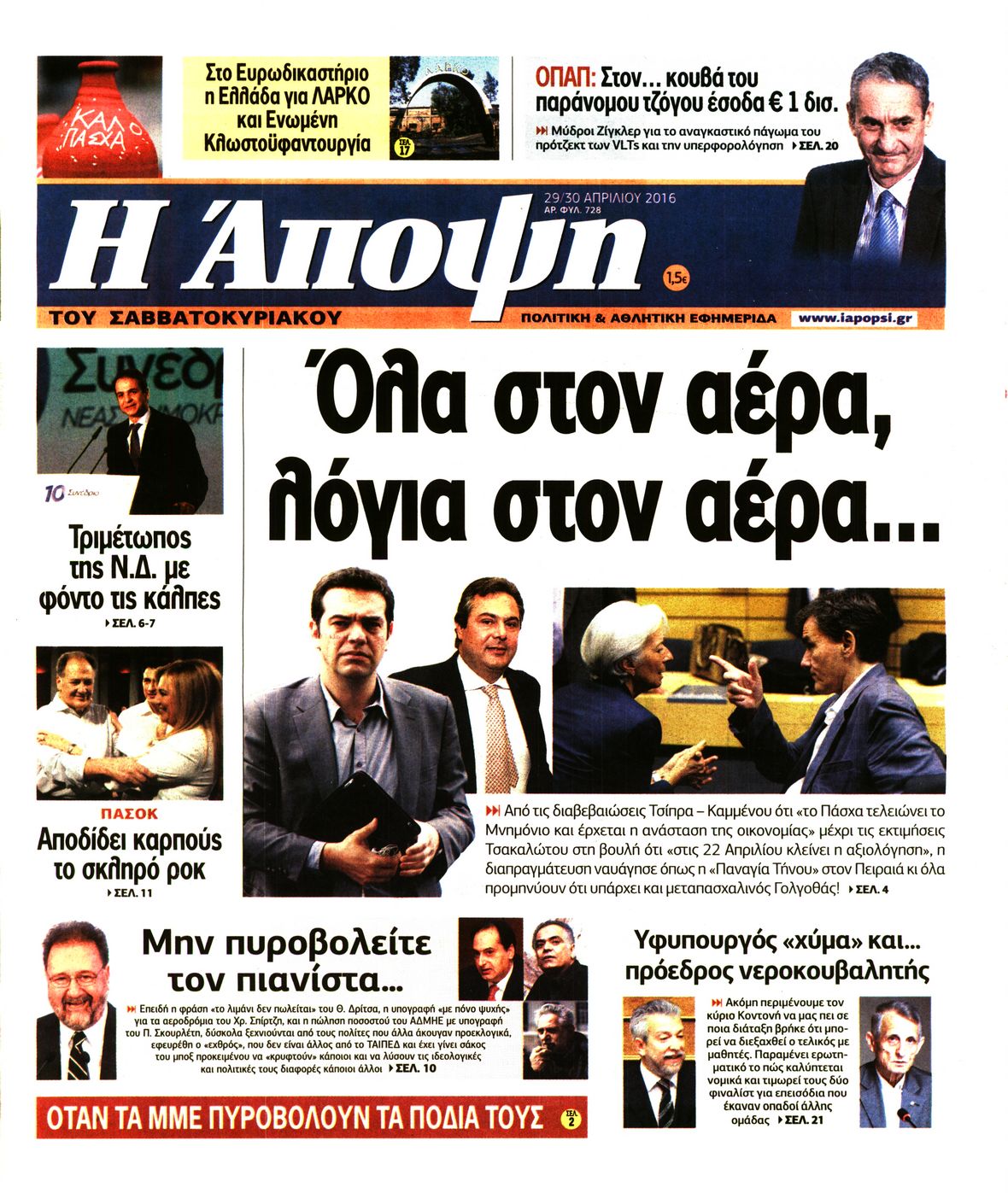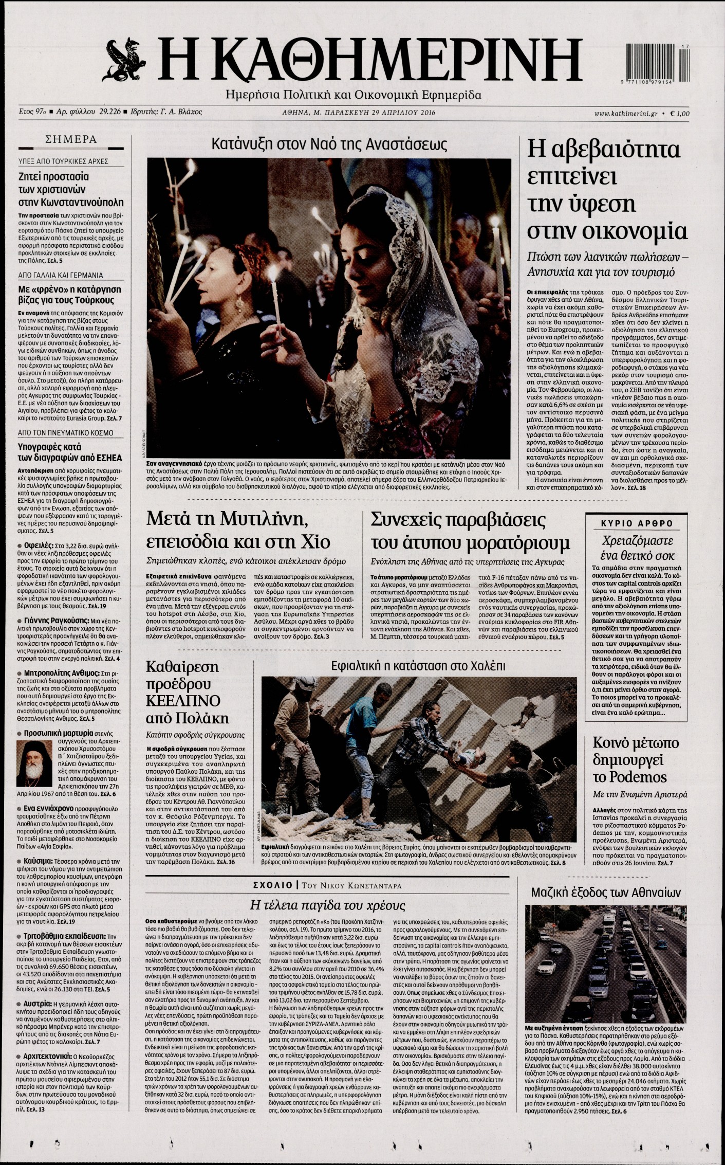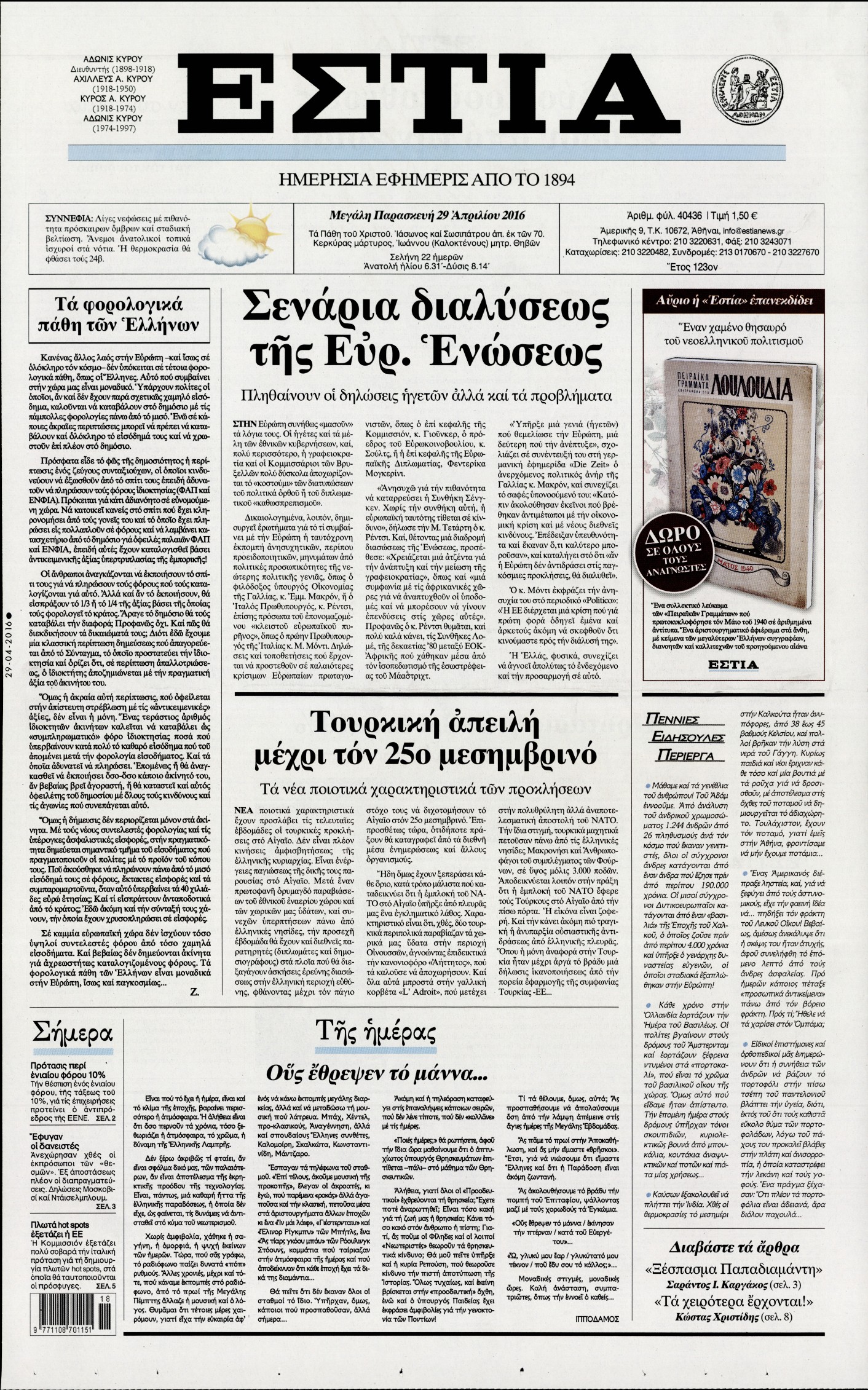 Oι πολιτικές εφημερίδες 29/4/2016 Enikos Newsroom 05:53, Παρασκευή 29 Απριλίου 2016 Media Διαβάστε τα σημερινά πρωτοσέλιδα των πολιτικών εφημερίδων: ΠΟΛΙΤΙΚΕΣ ΕΦΗΜΕΡΙΔΕΣ ΠΡΩΤΟΣΕΛΙΔΑ Μοιράσου το: σχολίασε κι εσύ (0 σχόλια) Ακολουθήστε το enikos.gr στο Google News και μάθετε πρώτοι όλες τις ειδήσεις Δείτε όλες τις τελευταίες ειδήσεις από την Ελλάδα και τον Κόσμο στο enikos.gr Ειδήσεις Ροή Ειδήσεων 23 λεπτά πριν Τραμπ: Δεν αποκλείει την πιθανότητα ενός πολέμου στη Βενεζουέλα – «Ο Μαδούρο ξέρει καλύτερα από τον καθένα τι ακριβώς θέλω» 17 λεπτά πριν Ουκρανία: Η άνευ προηγουμένου επίθεση σε ρωσικό τάνκερ στη Μεσόγειο και το μήνυμα προς στον Πούτιν – Το «μακρύ χέρι» του Κιέβου 3 ώρες πριν Εμπλοκή και αερομαχίες με οπλισμένα τουρκικά F-16 στο Αιγαίο 3 ώρες πριν Πούτιν: «Ναι, είμαι ερωτευμένος» – Βίντεο από τη σπάνια προσωπική παραδοχή του 1 ώρα πριν Ανδρέας Λυκουρέντζος: Υπέβαλε την παραίτησή του ο πρόεδρος του ΕΛΓΑ, αλλά δεν έγινε δεκτή – Όλο το παρασκήνιο 2 ώρες πριν Αριθμολογία: Οι άνθρωποι που έχουν γεννηθεί αυτές τις 4 ημερομηνίες, συχνά παρεξηγούνται – «Η καλοσύνη τους κρύβει τεράστια δύναμη» 4 ώρες πριν Μήπως έχετε χάσει τον εαυτό σας στη σχέση σας; 7 «αθόρυβες» υποχωρήσεις που μάλλον κάνατε, χωρίς να το συνειδητοποιήσετε 3 ώρες πριν Ξεχάστε το καθάρισμα το Σαββατοκύριακο: Ο «κανόνας των 20 λεπτών» που θα σας λύσει τα χέρια 32 λεπτά πριν Ύπνος: Μια κρυφή κατάσταση του εγκεφάλου πριν από τον ύπνο μπορεί να είναι το “κλειδί” για υψηλή ευφυΐα και δημιουργικότητα 6 λεπτά πριν Χάρι και Μέγκαν: Η σπάνια οικογενειακή φωτογραφία με τον Άρτσι και τη Λίλιμπετ – Τι σχεδιάζουν για τα Χριστούγεννα 13 λεπτά πριν Βασίλης Καρράς: «Είναι πάντα δίπλα μου, δεν έφυγε…», λέει ο αδελφός του 17 λεπτά πριν Ουκρανία: Η άνευ προηγουμένου επίθεση σε ρωσικό τάνκερ στη Μεσόγειο και το μήνυμα προς στον Πούτιν – Το «μακρύ χέρι» του Κιέβου 23 λεπτά πριν Τραμπ: Δεν αποκλείει την πιθανότητα ενός πολέμου στη Βενεζουέλα – «Ο Μαδούρο ξέρει καλύτερα από τον καθένα τι ακριβώς θέλω» 24 λεπτά πριν Κηφισιά: Με πολλές απουσίες κόντρα στον Ολυμπιακό – «Last dance» για τον Τεττέη ENIKOS NETWORK Το ΕΚΑΒ τιμήθηκε από την Ακαδημία Αθηνών για τα 40 χρόνια προσφοράς του Έχετε πραγματικά μεγάλη καρδιά; 10 χαρακτηριστικά όσων έχουν καλοσύνη ΑΑΔΕ: Νέες αναβαθμίσεις στο Ψηφιακό Πελατολόγιο και την εφαρμογή myDATAapp – Τι πρέπει να γνωρίζετε Όμιλος ΔΕΗ: Νέα ορόσημα και ενισχυμένη διαφάνεια στην ετήσια Έκθεση Βιώσιμης Ανάπτυξης Χαρτογραφώντας το «σημείο χωρίς επιστροφή»: Για πρώτη φορά αποκαλύπτεται με λεπτομέρεια το ακανθώδες όριο της ατμόσφαιρας τ... Η Google καταργεί τη λειτουργία «dark web report» – Πώς θα μπορούν οι χρήστες να διαγράφουν τα δεδομένα τους περισσότερα 20:37 , Παρασκευή 19 Δεκεμβρίου 2025 Don’t Forget The Lyrics: Η Έλλη Κοκκίνου υποδέχεται 4 παίκτες που θα κάνουν τα πάντα για να μη χάσουν ούτε… μισή λέξη από τους στίχους Το «Don’t Forget The Lyrics» επιστρέφει απόψε, Παρασκευή 19 Δεκεμβρίου, στις 21:00 με νέο επει... 19:31 , Παρασκευή 19 Δεκεμβρίου 2025 GNTM: Απόψε ο μεγάλος τελικός για τους 4 φιναλίστ Έπειτα από μήνες γεμάτους μόδα, δημιουργία και έντονες αναμετρήσεις, το GNTM 2025 κορυφώνεται,... 18:11 , Παρασκευή 19 Δεκεμβρίου 2025 Το σόι σου: Ο Άρης έρχεται στην Ελλάδα για τις γιορτές των Χριστουγέννων – Τι θα δούμε στο αποψινό εορταστικό επεισόδιο Ένα απολαυστικό, εορταστικό επεισόδιο της σειράς “Το σόι σου”, γεμάτο ευτράπελα αλ... 15:15 , Παρασκευή 19 Δεκεμβρίου 2025 Την Κυριακή με τη Realnews
