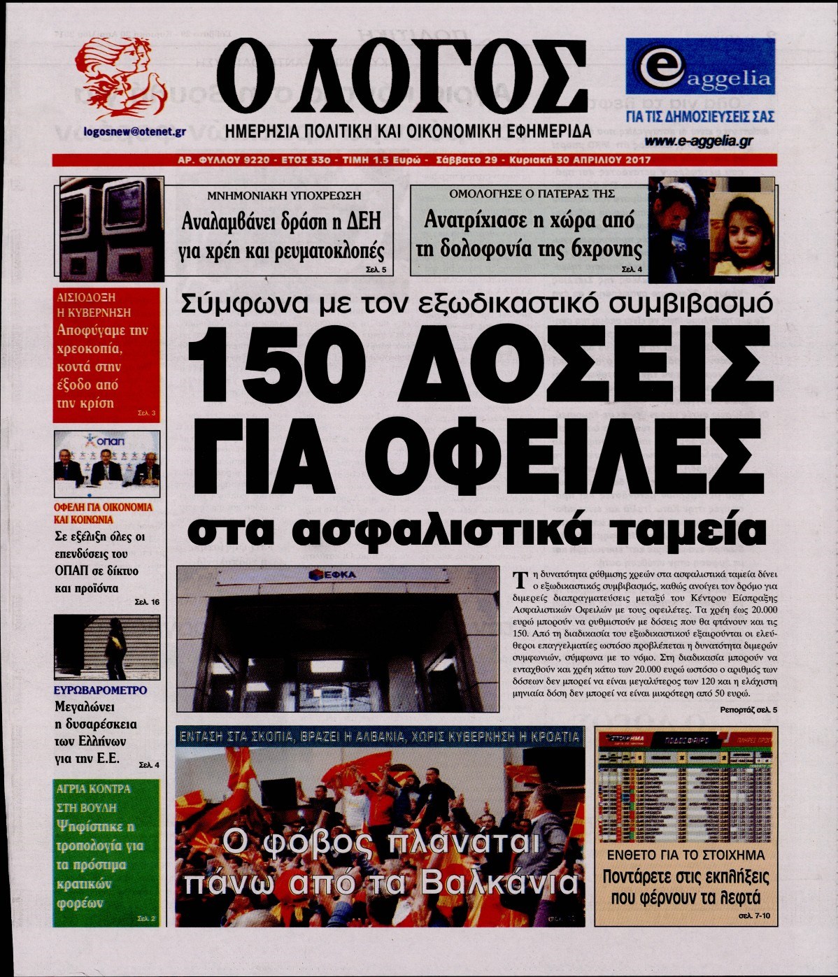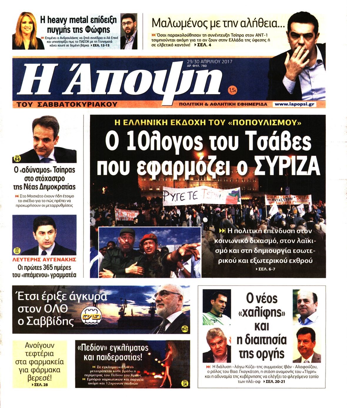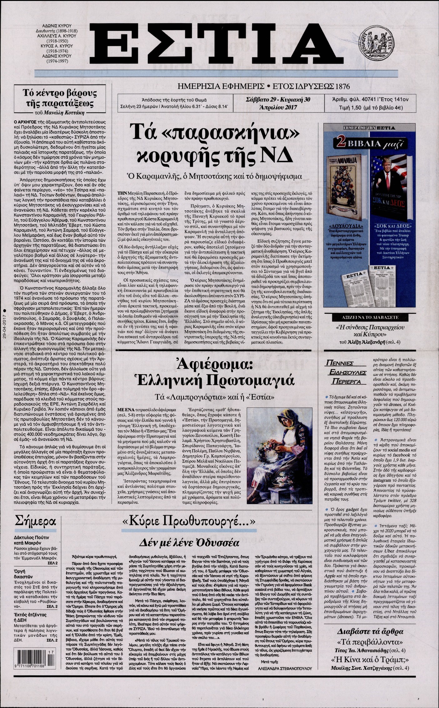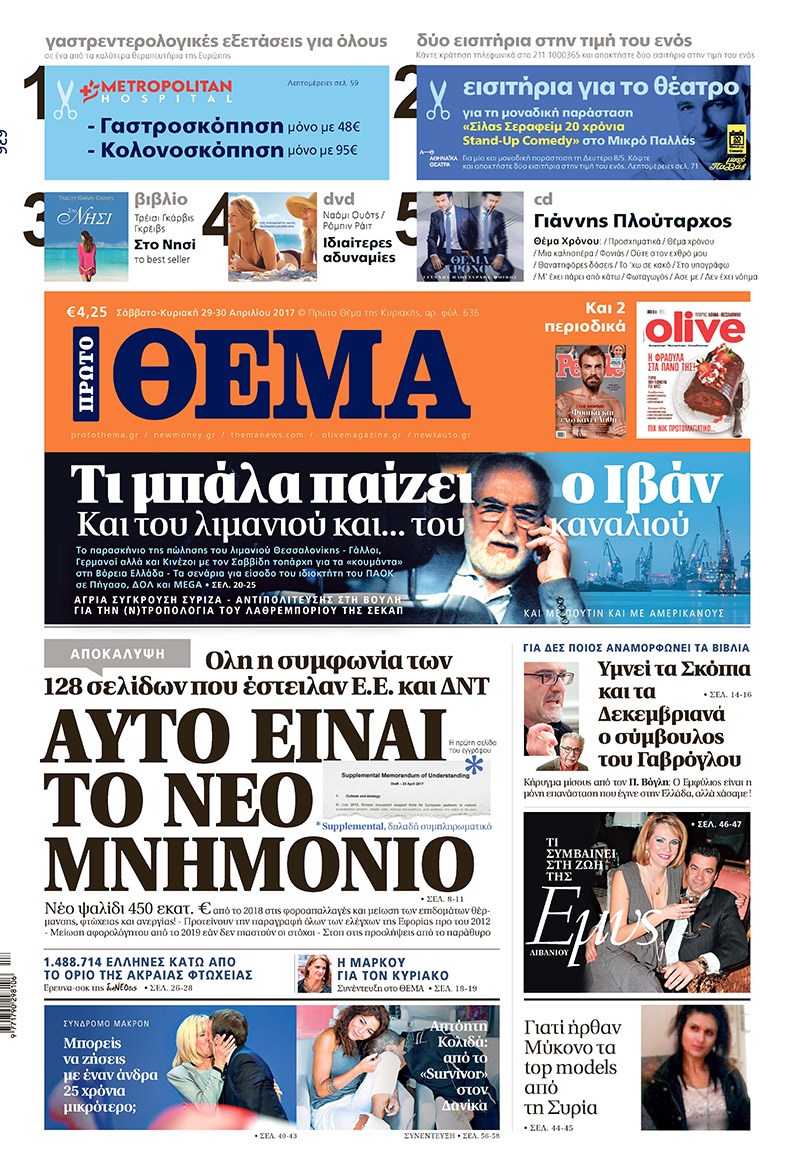 Οι πολιτικές εφημερίδες 29/4/2017 Enikos Newsroom 07:17, Σάββατο 29 Απριλίου 2017 Media Διαβάστε τα σημερινά πρωτοσέλιδα των πολιτικών εφημερίδων: ΠΟΛΙΤΙΚΕΣ ΕΦΗΜΕΡΙΔΕΣ ΠΡΩΤΟΣΕΛΙΔΑ Μοιράσου το: σχολίασε κι εσύ (0 σχόλια) Ακολουθήστε το enikos.gr στο Google News και μάθετε πρώτοι όλες τις ειδήσεις Δείτε όλες τις τελευταίες ειδήσεις από την Ελλάδα και τον Κόσμο στο enikos.gr Ειδήσεις Ροή Ειδήσεων 4 ώρες πριν Χριστούγεννα στα μπλόκα: Επιμένουν στις κινητοποιήσεις τους οι αγρότες – Ανοίγουν τα διόδια το Σαββατοκύριακο 5 ώρες πριν Ουκρανία: Η άνευ προηγουμένου επίθεση σε ρωσικό τάνκερ στη Μεσόγειο και το μήνυμα προς στον Πούτιν – Το «μακρύ χέρι» του Κιέβου 4 ώρες πριν Πούτιν: Τα μηνύματα σε Ευρώπη και ΝΑΤΟ από το μαραθώνιο «σόου» του – Η απαίτηση για «σεβασμό» και η ειρήνη «με τους όρους» της Μόσχας 5 ώρες πριν Τραμπ: Δεν αποκλείει την πιθανότητα ενός πολέμου στη Βενεζουέλα – «Ο Μαδούρο ξέρει καλύτερα από τον καθένα τι ακριβώς θέλω» 5 ώρες πριν Συνεχίζει να προκαλεί ο Μίτσκοσκι: «Για μένα το όνομα Μακεδονία είναι ιερό» 4 ώρες πριν Ανακαλύφθηκαν αρχαία χρυσά νομίσματα 2.200 ετών που απεικονίζουν τον θεό Απόλλωνα – Η άγνωστη σύνδεση με τον Φίλιππο Β΄ της Μακεδονίας 5 ώρες πριν Ύπνος: Μια κρυφή κατάσταση του εγκεφάλου πριν από τον ύπνο μπορεί να είναι το “κλειδί” για υψηλή ευφυΐα και δημιουργικότητα 6 ώρες πριν Αριθμολογία: Οι άνθρωποι που έχουν γεννηθεί αυτές τις 4 ημερομηνίες, συχνά παρεξηγούνται – «Η καλοσύνη τους κρύβει τεράστια δύναμη» 7 ώρες πριν Ξεχάστε το καθάρισμα το Σαββατοκύριακο: Ο «κανόνας των 20 λεπτών» που θα σας λύσει τα χέρια 24 λεπτά πριν Θεσσαλονίκη: Εξαφανίστηκε 13χρονος από χώρο φιλοξενίας ασυνόδευτων ανηλίκων στο Ωραιόκαστρο 34 λεπτά πριν Ντόναλντ Τραμπ: «Πολύ βαριά αντίποινα» στη Συρία – «Πλήττουμε πολύ δυνατά οχυρά του Ισλαμικού Κράτους» 49 λεπτά πριν Εξάρχεια: Ένταση με μολότοφ, χημικά και κρότου λάμψης 1 ώρα πριν ΗΠΑ: Τραγωδία στην Αλαμπάμα – Σκότωσε την δημοσιογράφο σύζυγό του και αυτοκτόνησε μπροστά στον 3χρονο γιο τους 1 ώρα πριν Πρόταση γάμου στο ΣΕΦ κατά την διάρκεια του αγώνα Ολυμπιακός-Βιλερμπάν – Δείτε βίντεο ENIKOS NETWORK Το ΕΚΑΒ τιμήθηκε από την Ακαδημία Αθηνών για τα 40 χρόνια προσφοράς του Έχετε πραγματικά μεγάλη καρδιά; 10 χαρακτηριστικά όσων έχουν καλοσύνη Αναστολή μέτρων αναγκαστικής εκτέλεσης για κτηνοτρόφους που πλήττονται από την ευλογιά των αιγοπροβάτων Πλήρης επάρκεια προϊόντων στις λαϊκές της Αττικής, παρά τις αγροτικές κινητοποιήσεις – Τι απαντούν οι πωλητές Χαρτογραφώντας το «σημείο χωρίς επιστροφή»: Για πρώτη φορά αποκαλύπτεται με λεπτομέρεια το ακανθώδες όριο της ατμόσφαιρας τ... Η Google καταργεί τη λειτουργία «dark web report» – Πώς θα μπορούν οι χρήστες να διαγράφουν τα δεδομένα τους περισσότερα 22:42 , Παρασκευή 19 Δεκεμβρίου 2025 Γιώργος Γιαννόπουλος για “Το σόι σου”: “Είναι ευτυχία και ευλογία αυτή η σειρά” «Είναι ευτυχία και ευλογία η συγκυρία αυτής της σειράς», θα πει ο Γιώργος Γιαννόπουλος -ο αγαπ... 20:37 , Παρασκευή 19 Δεκεμβρίου 2025 Don’t Forget The Lyrics: Η Έλλη Κοκκίνου υποδέχεται 4 παίκτες που θα κάνουν τα πάντα για να μη χάσουν ούτε… μισή λέξη από τους στίχους Το «Don’t Forget The Lyrics» επιστρέφει απόψε, Παρασκευή 19 Δεκεμβρίου, στις 21:00 με νέο επει... 19:31 , Παρασκευή 19 Δεκεμβρίου 2025 GNTM: Απόψε ο μεγάλος τελικός για τους 4 φιναλίστ Έπειτα από μήνες γεμάτους μόδα, δημιουργία και έντονες αναμετρήσεις, το GNTM 2025 κορυφώνεται,... 18:11 , Παρασκευή 19 Δεκεμβρίου 2025 Το σό