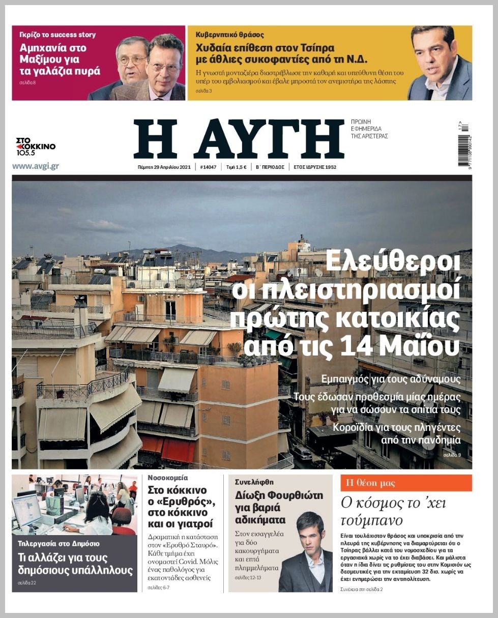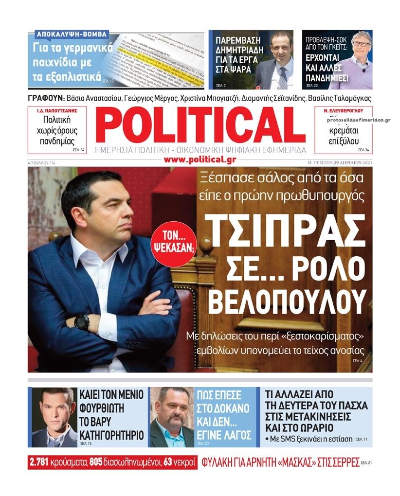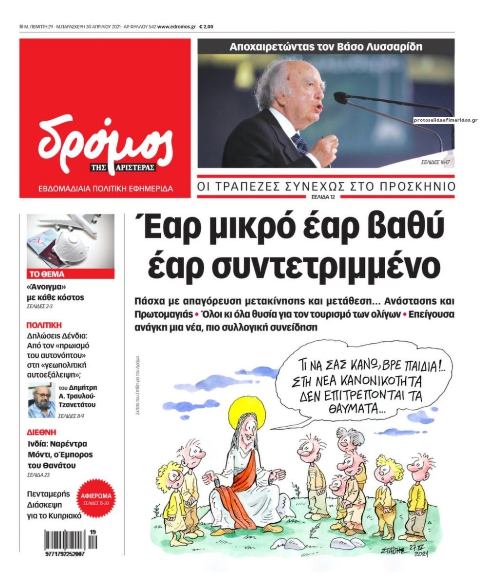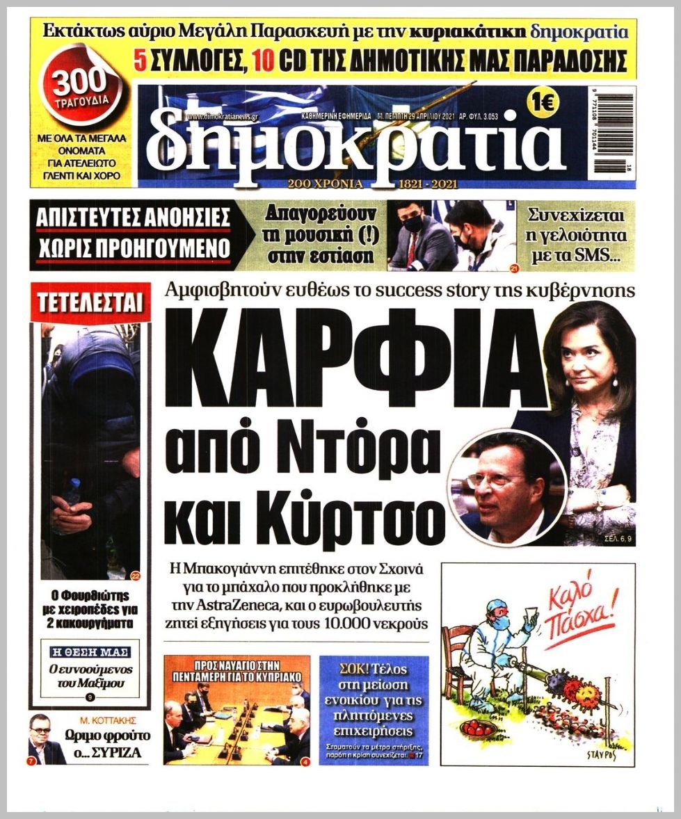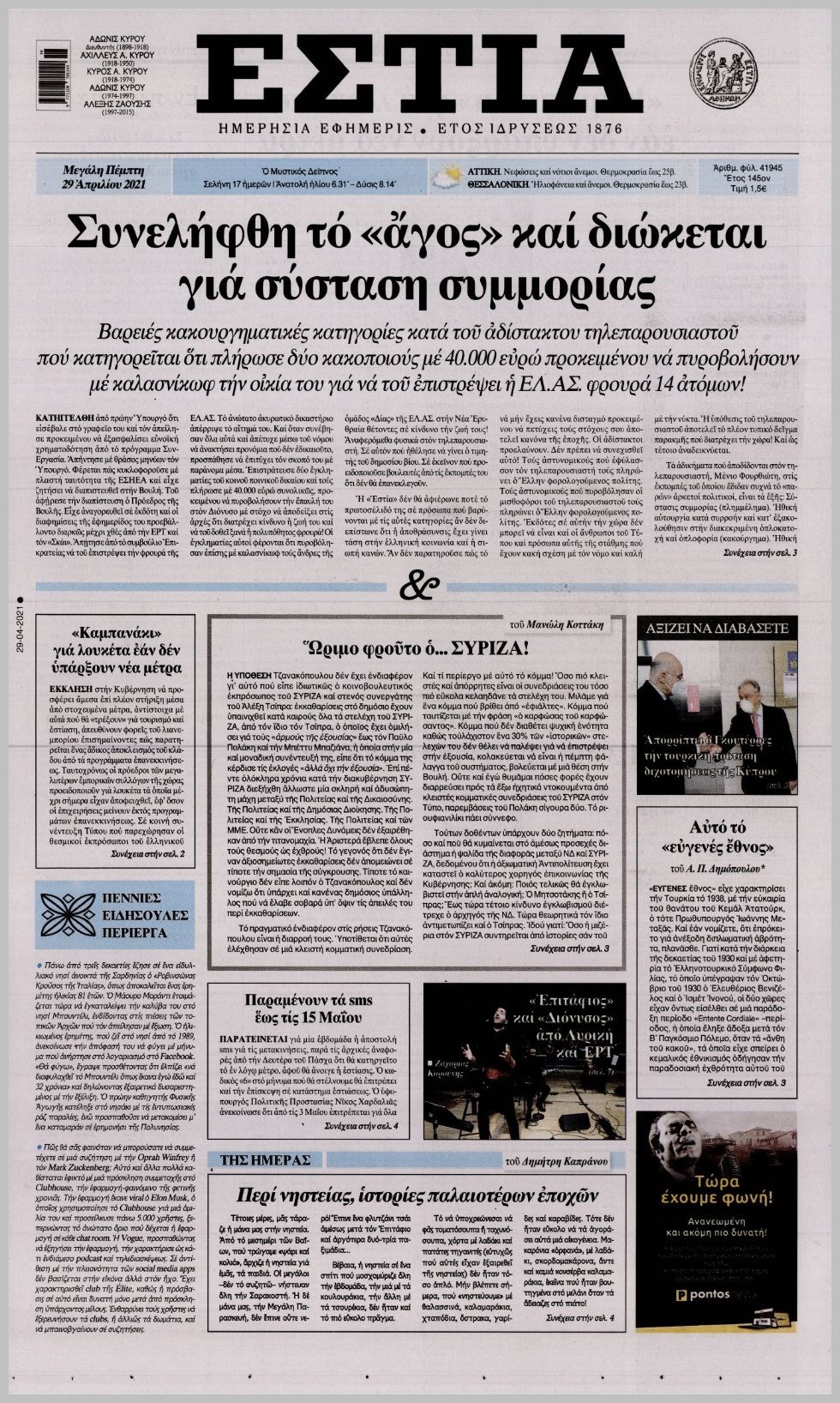 Οι πολιτικές εφημερίδες 29/4/2021 Διονύσης Νίκκας 06:00, Πέμπτη 29 Απριλίου 2021 Media Διαβάστε τα πρωτοσέλιδα των πολιτικών εφημερίδων… ΕΦΗΜΕΡΙΔΕΣ ΠΡΩΤΟΣΕΛΙΔΑ Μοιράσου το: σχολίασε κι εσύ (0 σχόλια) Ακολουθήστε το enikos.gr στο Google News και μάθετε πρώτοι όλες τις ειδήσεις Δείτε όλες τις τελευταίες ειδήσεις από την Ελλάδα και τον Κόσμο στο enikos.gr Ειδήσεις Ροή Ειδήσεων 4 ώρες πριν Υπόθεση Έπσταϊν: Το Υπουργείο Δικαιοσύνης δημοσιοποίησε μια σειρά από εξαιρετικά επεξεργασμένα αρχεία – «Λείπουν τα πιο σημαντικά έγγραφα», λένε οι Δημοκρατικοί 51 λεπτά πριν Γιορτές με μπλόκα για τους αγρότες: Ανοίγουν διόδια και μοιράζουν προϊόντα στους ταξιδιώτες 1 ώρα πριν Εξαφάνιση 33χρονου γιατρού στην Κρήτη: «Άναψα τα φώτα, τρόμαξε και άρχισε να τρέχει στα χωράφια» – Η τελευταία διαδρομή και η μαρτυρία «κλειδί» 3 ώρες πριν Ο «χάρτης» με τις αυξήσεις και τις φοροελαφρύνσεις του 2026 – Ποιοι και πόσα κερδίζουν 1 ώρα πριν Τα αρχεία του Έπσταϊν αποκαλύπτουν φωτογραφία του έκπτωτου πρίγκιπα Άντριου – Είναι ξαπλωμένος στην αγκαλιά 5 γυναικών 1 ώρα πριν Μία νέα «χρυσή» περίοδος αρχίζει για 3 ζώδια από σήμερα – «Μία αναπάντεχη ευκαιρία οδηγεί στην επιτυχία» 5 ώρες πριν Αυγά: Πόσα μπορείτε να τρώτε την ημέρα με ασφάλεια για μέγιστη πρόσληψη πρωτεΐνης 3 ώρες πριν Αρχαιολόγοι ανακάλυψαν σε χωράφι απεικόνιση 600 ετών ενός Αγίου – Τα στοιχεία που δείχνουν ότι μαρτύρησε 2 ώρες πριν Αγχώνεται για το χριστουγεννιάτικο δώρο που πήρε στην πλούσια σύντροφό του – «Φοβάμαι πως θα το βρει φθηνιάρικο, φοράει βραχιόλια Cartier» 9 λεπτά πριν Τα Labubu «μετακομίζουν» στο Χόλιγουντ: Η Sony Pictures ετοιμάζει live-action ταινία με τον σκηνοθέτη του «Wonka» 16 λεπτά πριν Νέες ταυτότητες: Μεγάλη αναμονή για ραντεβού στην Αττική – Τέλος τα ταξίδια εκτός Ελλάδος από τον Αύγουστο για όσους δεν έχουν αλλάξει 25 λεπτά πριν Οι 7 φράσεις που δεν λένε ποτέ οι συναισθηματικά έξυπνοι άνθρωποι κατά τη διάρκεια ενός καβγά 28 λεπτά πριν Τηλεθέαση (19/12): Ανατροπές και πρωτιές στην πρωινή ζώνη 36 λεπτά πριν Πώς η κλιματική αλλαγή επηρεάζει εγκύους και βρέφη – Οι επιπτώσεις των υψηλών θερμοκρασιών ENIKOS NETWORK Είστε μόνιμα απρόσεκτοι; 3 σημάδια που δείχνουν ότι μπορεί να είναι σύμπτωμα πάθησης Πόσα κιλά παίρνουμε πραγματικά τα Χριστούγεννα, σύμφωνα με την επιστήμη – Πώς να το αποτρέψουμε; e-ΕΦΚΑ και ΔΥΠΑ: Έρχονται νέες πληρωμές έως τις 24 Δεκεμβρίου – Ποιοι πάνε ταμείο Επίδομα παιδιού: Τι αλλάζει από το 2026 – Το όφελος από τις φορολογικές ελαφρύνσεις Χαρτογραφώντας το «σημείο χωρίς επιστροφή»: Για πρώτη φορά αποκαλύπτεται με λεπτομέρεια το ακανθώδες όριο της ατμόσφαιρας τ... Η Google καταργεί τη λειτουργία «dark web report» – Πώς θα μπορούν οι χρήστες να διαγράφουν τα δεδομένα τους περισσότερα 09:30 , Σάββατο 20 Δεκεμβρίου 2025 «Porto Leone: Στη γειτονιά με τα κόκκινα φανάρια» – Ο Χρόνης αποκαλύπτει στην Αλεξάνδρα το μυστικό για το παιδί της Λένας Η μεγάλη δραματική σειρά του Apha «Porto Leone: Στη γειτονιά με τα κόκκινα φανάρια» μας μεταφέ... 08:14 , Σάββατο 20 Δεκεμβρίου 2025 Τρομεροί γονείς: Η Μαρία Καβογιάννη εισβάλλει στο σπίτι της οικογένειας Στεφανίδη Όσα θα δούμε στο νέο διπλό επεισόδιο της σειράς «Τρομεροί γονείς», σήμερα Σάββατο 20 Δεκεμβρίο... 05:48 , Σάββατο 20 Δεκεμβρίου 2025 Οι οικονομικές εφημερίδες 20/12/2025 Διαβάστε τα πρωτοσέλιδα από τις οικονομικές εφημερίδες, σήμερα 20/12/2025. 05:43 , Σάββατο 20 Δεκεμβρίου 2025 Οι αθλητικές εφημερίδες 20/12/2025 Διαβάστε τα πρωτοσέλιδα από τις αθλητι