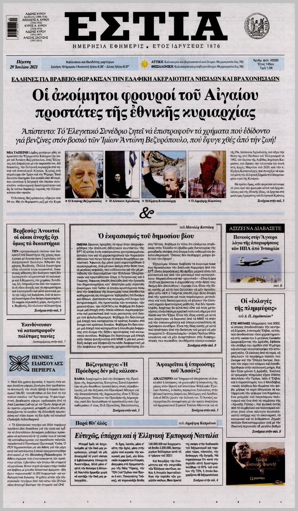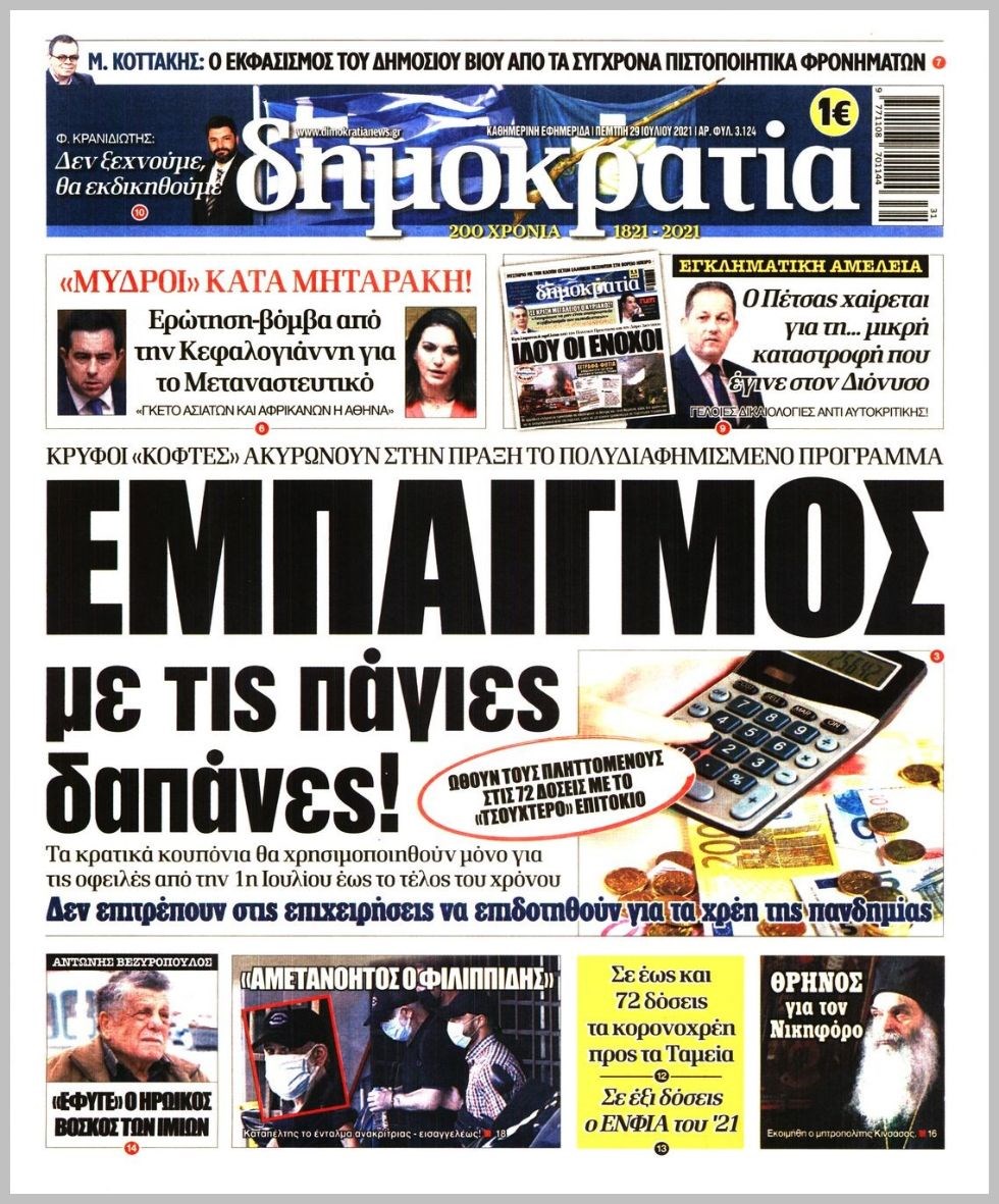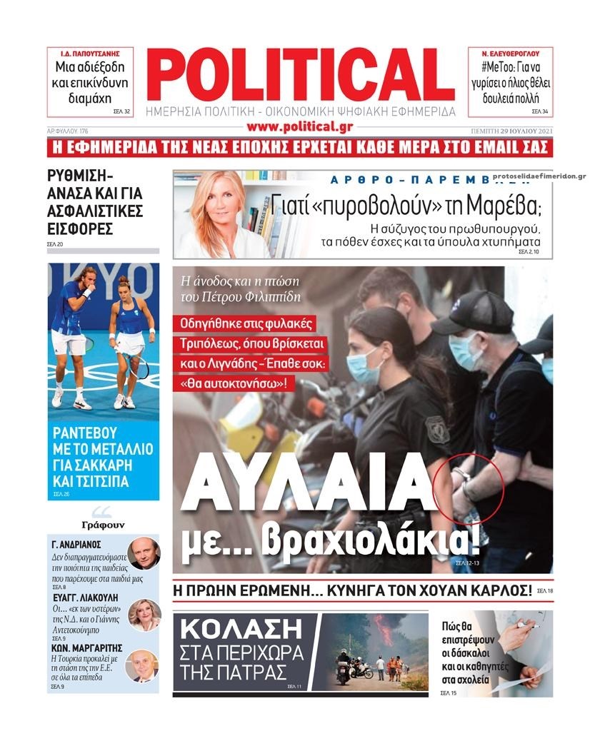 Οι πολιτικές εφημερίδες 29/7/2021 Διονύσης Νίκκας 06:24, Πέμπτη 29 Ιουλίου 2021 Media Διαβάστε τα πρωτοσέλιδα των πολιτικών εφημερίδων… ΕΦΗΜΕΡΙΔΕΣ ΠΡΩΤΟΣΕΛΙΔΑ Μοιράσου το: σχολίασε κι εσύ (0 σχόλια) Ακολουθήστε το enikos.gr στο Google News και μάθετε πρώτοι όλες τις ειδήσεις Δείτε όλες τις τελευταίες ειδήσεις από την Ελλάδα και τον Κόσμο στο enikos.gr Ειδήσεις Ροή Ειδήσεων 4 ώρες πριν Θετικοί οι αγρότες στη νέα πρόσκληση για διάλογο με τον Πρωθυπουργό – Αποφασίζουν την Παρασκευή εάν θα «σπάσουν» τον 48ωρο αποκλεισμό 4 ώρες πριν Πάτρα: Την Παρασκευή οι απολογίες των 4 εμπλεκομένων για τον θανάσιμο ξυλοδαρμό του 30χρονου – Το ξέσπασμα της μητέρας του θύματος και το βίντεο-σοκ 4 ώρες πριν Μινεάπολη: Η εκτέλεση της 37χρονης Ρενέ Γκουντ αποκαλύπτει δύο εντελώς αντίθετες διαχωριστικές γραμμές στην αμερικανική πολιτική 6 ώρες πριν Κύπρος: Πολιτικές αντιδράσεις μετά την διαρροή του βίντεο με «χρηματοδοτήσεις» και «επενδυτές» – Κυβέρνηση: Υβριδική επίθεση με κακόβουλο μοντάζ 44 λεπτά πριν Χρήστος Πολίτης: Το πραγματικό του όνομα, η καριέρα και το… φαινόμενο «Γιάγκος Δράκος» 6 ώρες πριν Αριθμολογία 2026: Οι άτυχοι μήνες της χρονιάς, με βάση την ημερομηνία γέννησής σας 7 ώρες πριν Περιορίστε τη σκόνη στο σπίτι σας με μια απλή και οικονομική λύση – Ο ρόλος της υγρασίας 5 ώρες πριν Ύπνος: Δυσκολεύεστε να κοιμηθείτε; Γιατρός μοιράζεται ένα «μυστικό» συστατικό που βοηθάει στη χαλάρωση 4 ώρες πριν Ανακαλύφθηκε εντυπωσιακός τάφος 1.300 ετών – Τα τεχνουργήματα που περιείχε ρίχνουν φως στη ζωή των ελίτ της δυναστείας Τανγκ 29 λεπτά πριν Συναγερμός στο Πόρτλαντ: Πράκτορες της Υπηρεσίας Μετανάστευσης πυροβόλησαν δύο άτομα 44 λεπτά πριν Χρήστος Πολίτης: Το πραγματικό του όνομα, η καριέρα και το… φαινόμενο «Γιάγκος Δράκος» 60 λεπτά πριν Super Cup Ισπανίας: Στον τελικό με Μπαρτσελόνα η Ρεάλ, που κέρδισε 2-1 την Ατλέτικο – Δείτε τα γκολ 1 ώρα πριν Νέα ισραηλινά πλήγματα στη Λωρίδα της Γάζας: Τουλάχιστον εννέα νεκροί, ανάμεσά τους πέντε παιδιά 1 ώρα πριν Ταραχές στο Ιράν: Στους δρόμους οι πολίτες – Κόπηκε η πρόσβαση στο διαδίκτυο και οι τηλεπικοινωνίες – Δείτε βίντεο ENIKOS NETWORK Γιατί κάποιοι κρεμάνε φύλλα δάφνης στην πόρτα της κρεβατοκάμαρας; Το μυστικό για καλύτερο ύπνο ΠΟΕΔΗΝ: Σήμα κινδύνου εκπέμπει η Πνευμονολογική Κλινική του Νοσοκομείου Άρτας ΣΑΤΑ: 48ωρη απεργία για τις 13 και 14 Ιανουαρίου αποφάσισαν οι αυτοκινητιστές των ταξί στην Αττική ΔΥΠΑ: Αρχίζει η υποβολή προγραμμάτων κατάρτισης για άνεργους δικαιούχους του Ελάχιστου Εγγυημένου Εισοδήματος – Όλες οι λεπ... Ο Google Assistant θα παραμείνει λίγο περισσότερο για ορισμένους χρήστες Android Τεστ προσωπικότητας: Το βάζο που θα επιλέξετε αποκαλύπτει πώς λύνετε προβλήματα στη ζωή σας περισσότερα 18:15 , Πέμπτη 08 Ιανουαρίου 2026 Άγιος Έρωτας: Ο πατήρ Νικόλαος σώζει τη μικρή Ελευθερία και ο Παύλος παθαίνει καρδιακή προσβολή – Καθηλώνουν τα επόμενα επεισόδια Η αγαπημένη δραματική σειρά “Άγιος ‘Ερωτας” επιστρέφει στις οθόνες μας με νέ... 17:43 , Πέμπτη 08 Ιανουαρίου 2026 Οι Αθώοι: Η μουσική της μεγάλης παραγωγής του Mega – Νέο lyrics video Η σειρά εποχής, που έχει ήδη κλέψει τις εντυπώσεις από τις πρώτες κιόλας εικόνες των τρέιλερ π... 17:04 , Πέμπτη 08 Ιανουαρίου 2026 Νέα δυναμική διεθνής επένδυση του Θοδωρή Κυριακού στις ΗΠΑ Ο Πρόεδρος του Ομίλου Antenna, Θοδωρής Κυριακού, συνεχίζει να ενισχύει δυναμικά την παγκόσμια ... 12:40 , Πέμπτη 08 Ιανουαρίου 2026 Ακούστε την εκπομπή του Νίκου Χατ