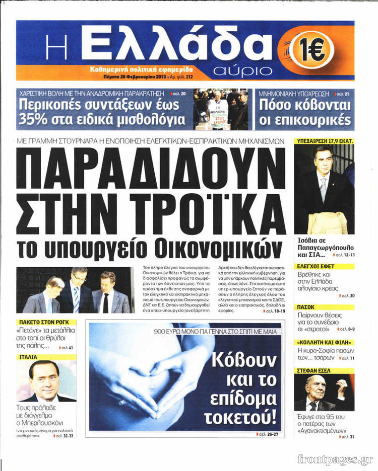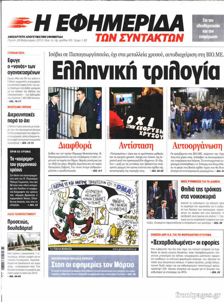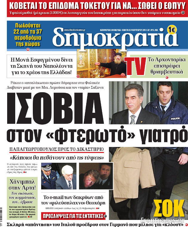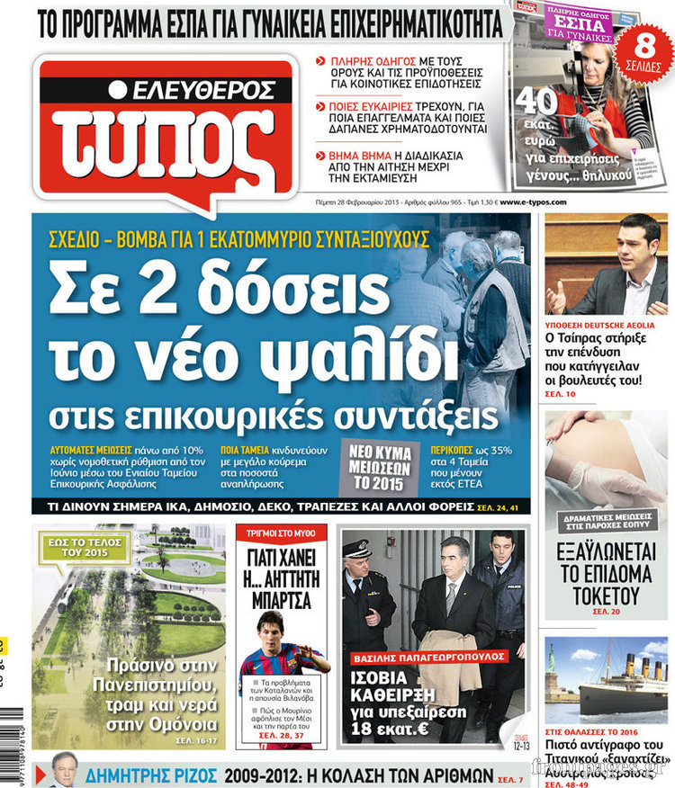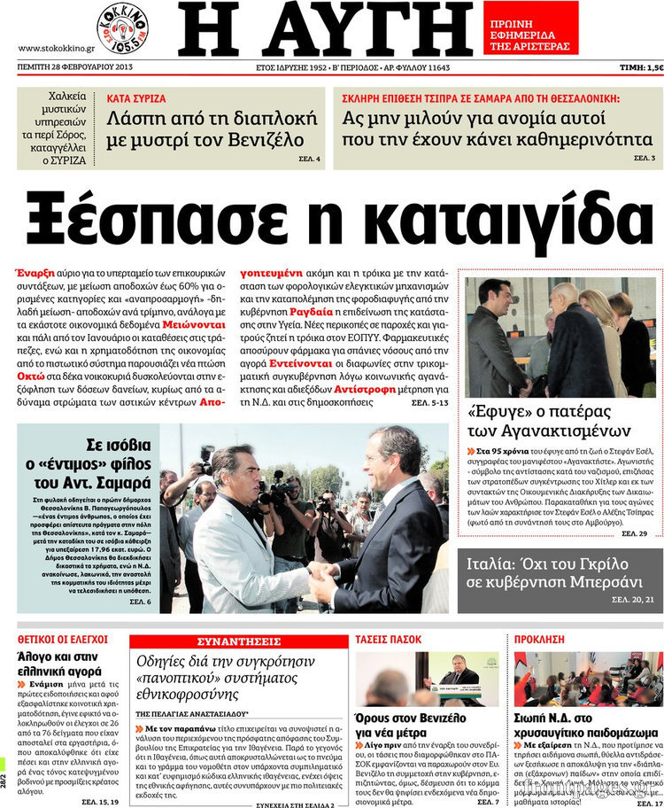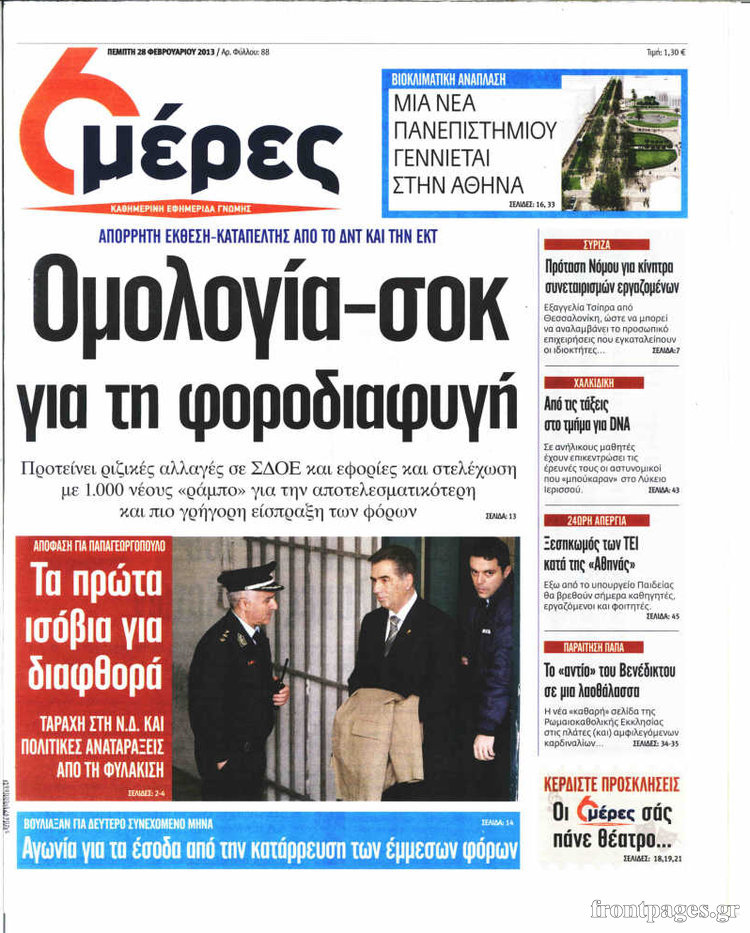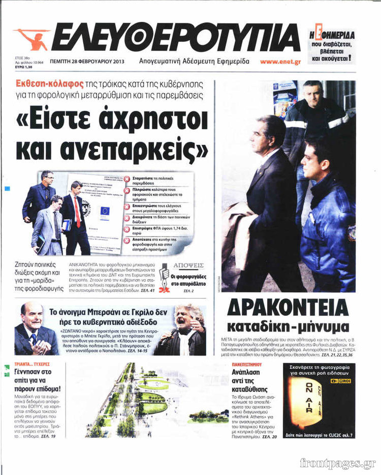 Οι πολιτικές εφημερίδες Enikos Newsroom 08:47, Πέμπτη 28 Φεβρουαρίου 2013 Media Οι πολιτικές εφημερίδες Δείτε τα πρωτοσέλιδα των πολιτικών εφημερίδων. ΕΦΗΜΕΡΙΔΕΣ ΠΟΛΙΤΙΚΕΣ ΕΦΗΜΕΡΙΔΕΣ ΠΡΩΤΟΣΕΛΙΔΑ Μοιράσου το: σχολίασε κι εσύ (0 σχόλια) Ακολουθήστε το enikos.gr στο Google News και μάθετε πρώτοι όλες τις ειδήσεις Δείτε όλες τις τελευταίες ειδήσεις από την Ελλάδα και τον Κόσμο στο enikos.gr Ειδήσεις Ροή Ειδήσεων 8 ώρες πριν Χριστούγεννα στα μπλόκα: Επιμένουν στις κινητοποιήσεις τους οι αγρότες – Ανοίγουν τα διόδια το Σαββατοκύριακο 9 ώρες πριν Ουκρανία: Η άνευ προηγουμένου επίθεση σε ρωσικό τάνκερ στη Μεσόγειο και το μήνυμα προς στον Πούτιν – Το «μακρύ χέρι» του Κιέβου 8 ώρες πριν Πούτιν: Τα μηνύματα σε Ευρώπη και ΝΑΤΟ από το μαραθώνιο «σόου» του – Η απαίτηση για «σεβασμό» και η ειρήνη «με τους όρους» της Μόσχας 7 ώρες πριν ΗΠΑ: Η κυβέρνηση του Ντόναλντ Τραμπ άρχισε να δημοσιοποιεί τα αρχεία Έπσταϊν 7 ώρες πριν Άνω Λιόσια: Πυροβολισμοί σε επιχείρηση με χαλιά – Εντοπίστηκαν 10 κάλυκες 55 λεπτά πριν Αυγά: Πόσα μπορείτε να τρώτε την ημέρα με ασφάλεια για μέγιστη πρόσληψη πρωτεΐνης 1 ώρα πριν Τα ζώδια σήμερα, Σάββατο 20 Δεκεμβρίου: Παρθένοι, το σύμπαν σας δίνει το κλειδί 8 ώρες πριν Ανακαλύφθηκαν αρχαία χρυσά νομίσματα 2.200 ετών που απεικονίζουν τον θεό Απόλλωνα – Η άγνωστη σύνδεση με τον Φίλιππο Β΄ της Μακεδονίας 9 ώρες πριν Ύπνος: Μια κρυφή κατάσταση του εγκεφάλου πριν από τον ύπνο μπορεί να είναι το “κλειδί” για υψηλή ευφυΐα και δημιουργικότητα 16 λεπτά πριν Κίριλ Ντμίτριεφ: Στις ΗΠΑ ο απεσταλμένος της Ρωσίας για συνομιλίες με τους ομολόγους του, Γουίτκοφ και Κούσνερ 23 λεπτά πριν ΔΕΔΔΗΕ: Διακοπές ρεύματος σήμερα (20/12) στην Αθήνα και σε άλλες 7 περιοχές της Αττικής 32 λεπτά πριν Κολομβία: Είκοσι χρόνια κάθειρξη σε πρώην ανώτερο αξιωματικό για 72 εκτελέσεις αμάχων 39 λεπτά πριν Οπτική ψευδαίσθηση: Μόνο αν είσαι ο Σέρλοκ Χολμς θα βρεις τον αριθμό «87» σε 7 δευτερόλεπτα 47 λεπτά πριν Σαρωτικοί οι έλεγχοι στους δρόμους ενόψει εορτών – Μπλόκα της τροχαίας σε κεντρικές αρτηρίες της Αττικής ENIKOS NETWORK Πρέπει να αποδέχεστε ή να απορρίπτετε όλα τα cookies; Ένας ειδικός εξηγεί Η αγαπημένη λιχουδιά των πόνι που μπορεί να ενισχύσει όραση, εγκέφαλο και ανοσοποιητικό Αναστολή μέτρων αναγκαστικής εκτέλεσης για κτηνοτρόφους που πλήττονται από την ευλογιά των αιγοπροβάτων Πλήρης επάρκεια προϊόντων στις λαϊκές της Αττικής, παρά τις αγροτικές κινητοποιήσεις – Τι απαντούν οι πωλητές Χαρτογραφώντας το «σημείο χωρίς επιστροφή»: Για πρώτη φορά αποκαλύπτεται με λεπτομέρεια το ακανθώδες όριο της ατμόσφαιρας τ... Η Google καταργεί τη λειτουργία «dark web report» – Πώς θα μπορούν οι χρήστες να διαγράφουν τα δεδομένα τους περισσότερα 05:48 , Σάββατο 20 Δεκεμβρίου 2025 Οι οικονομικές εφημερίδες 20/12/2025 Διαβάστε τα πρωτοσέλιδα από τις οικονομικές εφημερίδες, σήμερα 20/12/2025. 05:43 , Σάββατο 20 Δεκεμβρίου 2025 Οι αθλητικές εφημερίδες 20/12/2025 Διαβάστε τα πρωτοσέλιδα από τις αθλητικές εφημερίδες, σήμερα 20/12/2025. 05:38 , Σάββατο 20 Δεκεμβρίου 2025 Οι πολιτικές εφημερίδες 20/12/2025 Διαβάστε τα πρωτοσέλιδα από τις πολιτικές εφημερίδες, σήμερα 20/12/2025. 04:20 , Σάββατο 20 Δεκεμβρίου 2025 Αγγελική Νικολούλη: Τα συλλυπητήρια για την απώλεια της Ειρήνης Μαρινάκη Τα συλληπητήρια στον πρόεδρο του Mega, τον Βαγγέλη Μαρινάκη, για την απώλεια της μητέρας του Ε... ΤΕΛΕΥΤΑΙΕΣ ΕΙΔΗΣΕΙΣ 16 λεπτά πριν Κίριλ Ντμίτριεφ: Στις ΗΠΑ ο απεσταλμένος της Ρωσίας... 23 λεπτά πριν ΔΕΔΔΗΕ: Δι