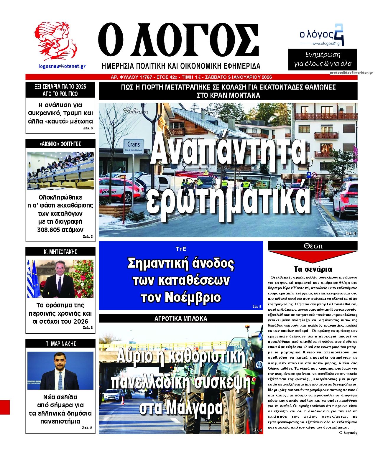 Διαβάστε τα πρωτοσέλιδα από τις πολιτικές εφημερίδες, σήμερα 3/1/2026.