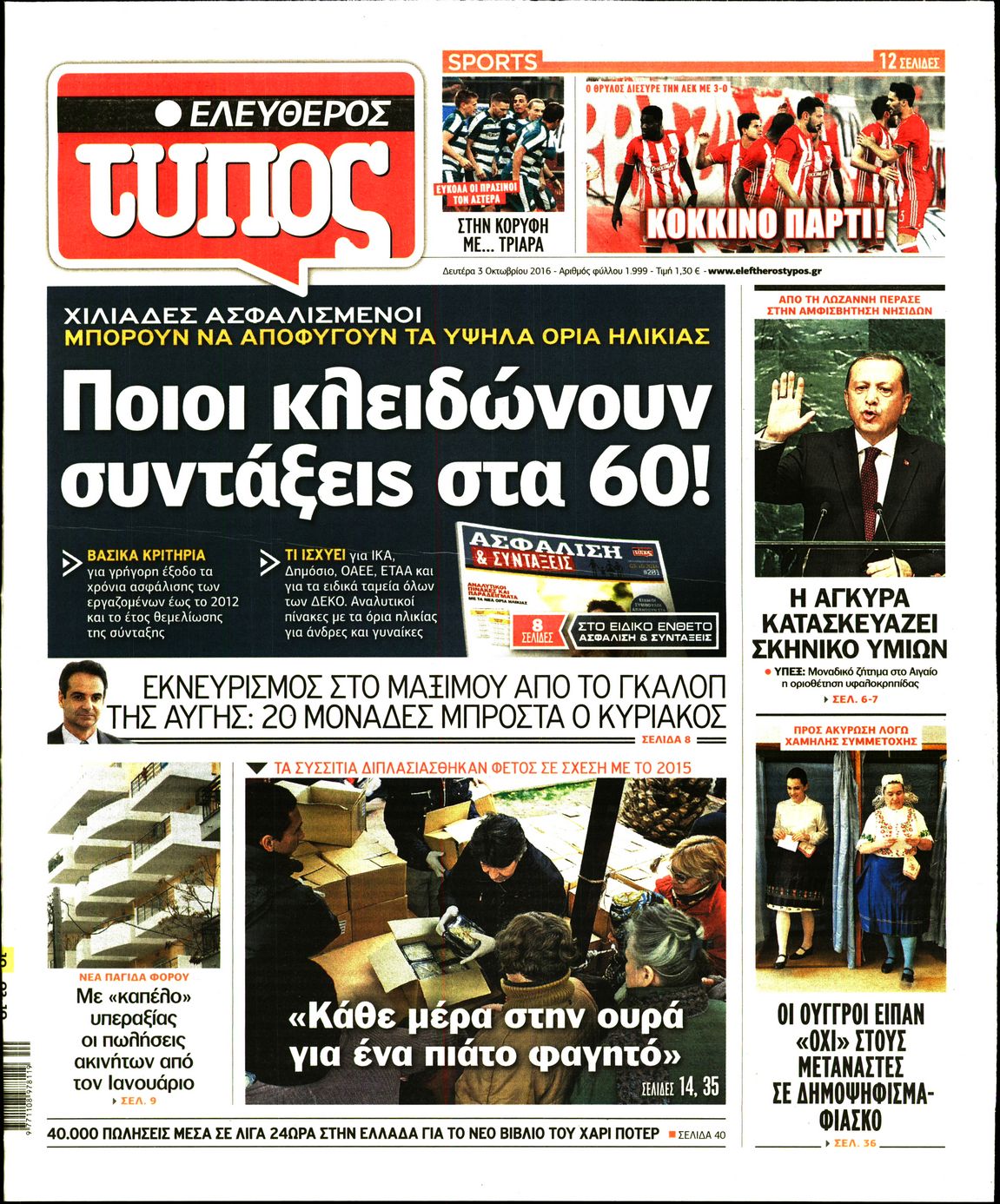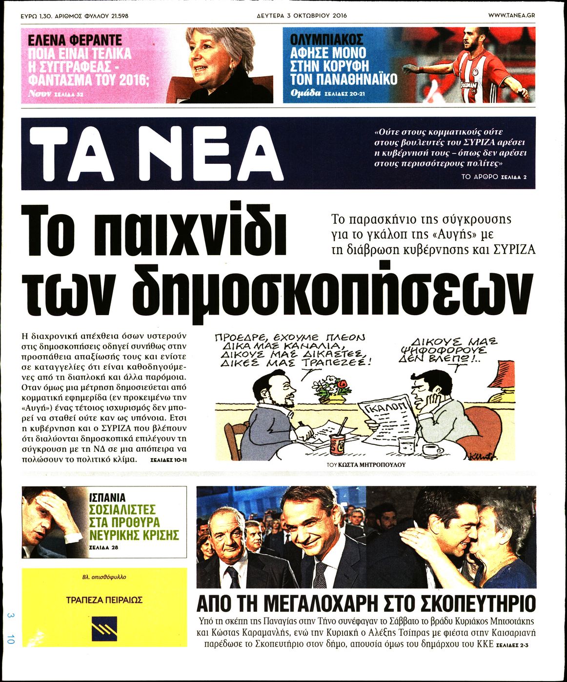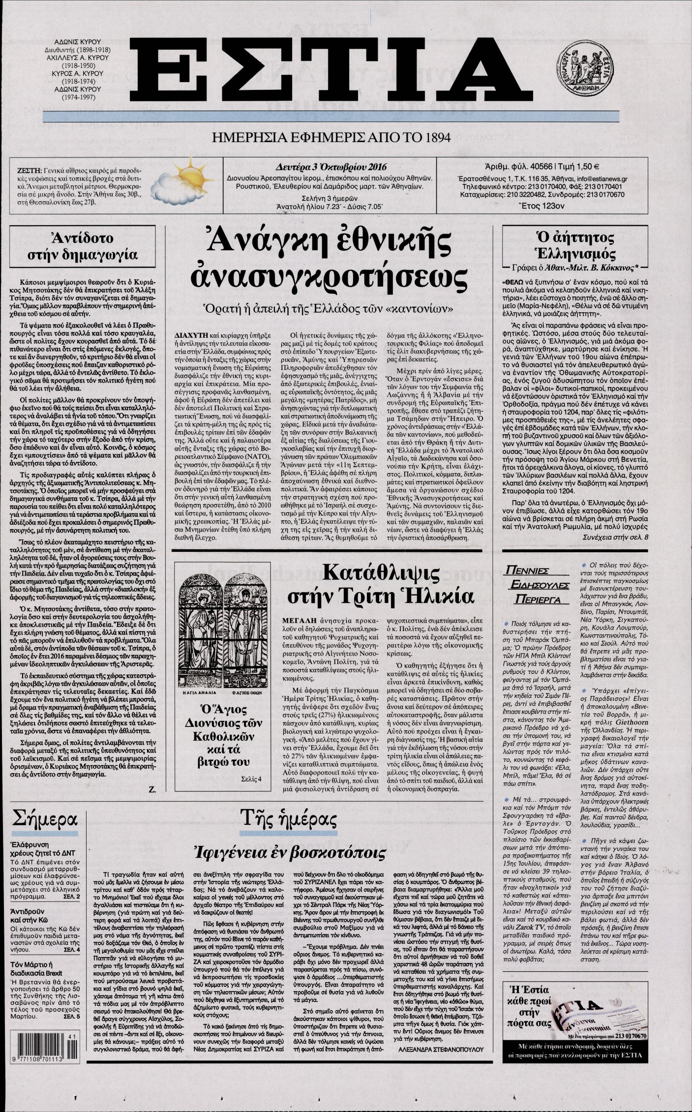 Οι πολιτικές εφημερίδες 3-10-2016 Enikos Newsroom 05:58, Δευτέρα 03 Οκτωβρίου 2016 Media Διαβάστε τα σημερινά πρωτοσέλιδα των πολιτικών εφημερίδων: ΠΟΛΙΤΙΚΕΣ ΕΦΗΜΕΡΙΔΕΣ ΠΡΩΤΟΣΕΛΙΔΑ Μοιράσου το: σχολίασε κι εσύ (0 σχόλια) Ακολουθήστε το enikos.gr στο Google News και μάθετε πρώτοι όλες τις ειδήσεις Δείτε όλες τις τελευταίες ειδήσεις από την Ελλάδα και τον Κόσμο στο enikos.gr Ειδήσεις Ροή Ειδήσεων 4 ώρες πριν Χριστούγεννα στα μπλόκα: Επιμένουν στις κινητοποιήσεις τους οι αγρότες – Ανοίγουν τα διόδια το Σαββατοκύριακο 4 ώρες πριν Ουκρανία: Η άνευ προηγουμένου επίθεση σε ρωσικό τάνκερ στη Μεσόγειο και το μήνυμα προς στον Πούτιν – Το «μακρύ χέρι» του Κιέβου 3 ώρες πριν Πούτιν: Τα μηνύματα σε Ευρώπη και ΝΑΤΟ από το μαραθώνιο «σόου» του – Η απαίτηση για «σεβασμό» και η ειρήνη «με τους όρους» της Μόσχας 4 ώρες πριν Τραμπ: Δεν αποκλείει την πιθανότητα ενός πολέμου στη Βενεζουέλα – «Ο Μαδούρο ξέρει καλύτερα από τον καθένα τι ακριβώς θέλω» 5 ώρες πριν Συνεχίζει να προκαλεί ο Μίτσκοσκι: «Για μένα το όνομα Μακεδονία είναι ιερό» 3 ώρες πριν Ανακαλύφθηκαν αρχαία χρυσά νομίσματα 2.200 ετών που απεικονίζουν τον θεό Απόλλωνα – Η άγνωστη σύνδεση με τον Φίλιππο Β΄ της Μακεδονίας 4 ώρες πριν Ύπνος: Μια κρυφή κατάσταση του εγκεφάλου πριν από τον ύπνο μπορεί να είναι το “κλειδί” για υψηλή ευφυΐα και δημιουργικότητα 5 ώρες πριν Αριθμολογία: Οι άνθρωποι που έχουν γεννηθεί αυτές τις 4 ημερομηνίες, συχνά παρεξηγούνται – «Η καλοσύνη τους κρύβει τεράστια δύναμη» 6 ώρες πριν Ξεχάστε το καθάρισμα το Σαββατοκύριακο: Ο «κανόνας των 20 λεπτών» που θα σας λύσει τα χέρια 4 λεπτά πριν Ντόναλντ Τραμπ: «Πολύ βαριά αντίποινα» στη Συρία – «Πλήττουμε πολύ δυνατά οχυρά του Ισλαμικού Κράτους» 19 λεπτά πριν Εξάρχεια: Ένταση με μολότοφ, χημικά και κρότου λάμψης 34 λεπτά πριν ΗΠΑ: Τραγωδία στην Αλαμπάμα – Σκότωσε την δημοσιογράφο σύζυγό του και αυτοκτόνησε μπροστά στον 3χρονο γιο τους 49 λεπτά πριν Πρόταση γάμου στο ΣΕΦ κατά την διάρκεια του αγώνα Ολυμπιακός-Βιλερμπάν – Δείτε βίντεο 1 ώρα πριν Euroleague: Επέστρεψε στις νίκες ο Ολυμπιακός, πήρε την ματσάρα της χρονιάς η Μπάρτσα – Τα αποτελέσματα και η βαθμολογία ENIKOS NETWORK Το ΕΚΑΒ τιμήθηκε από την Ακαδημία Αθηνών για τα 40 χρόνια προσφοράς του Έχετε πραγματικά μεγάλη καρδιά; 10 χαρακτηριστικά όσων έχουν καλοσύνη Αναστολή μέτρων αναγκαστικής εκτέλεσης για κτηνοτρόφους που πλήττονται από την ευλογιά των αιγοπροβάτων Πλήρης επάρκεια προϊόντων στις λαϊκές της Αττικής, παρά τις αγροτικές κινητοποιήσεις – Τι απαντούν οι πωλητές Χαρτογραφώντας το «σημείο χωρίς επιστροφή»: Για πρώτη φορά αποκαλύπτεται με λεπτομέρεια το ακανθώδες όριο της ατμόσφαιρας τ... Η Google καταργεί τη λειτουργία «dark web report» – Πώς θα μπορούν οι χρήστες να διαγράφουν τα δεδομένα τους περισσότερα 22:42 , Παρασκευή 19 Δεκεμβρίου 2025 Γιώργος Γιαννόπουλος για “Το σόι σου”: “Είναι ευτυχία και ευλογία αυτή η σειρά” «Είναι ευτυχία και ευλογία η συγκυρία αυτής της σειράς», θα πει ο Γιώργος Γιαννόπουλος -ο αγαπ... 20:37 , Παρασκευή 19 Δεκεμβρίου 2025 Don’t Forget The Lyrics: Η Έλλη Κοκκίνου υποδέχεται 4 παίκτες που θα κάνουν τα πάντα για να μη χάσουν ούτε… μισή λέξη από τους στίχους Το «Don’t Forget The Lyrics» επιστρέφει απόψε, Παρασκευή 19 Δεκεμβρίου, στις 21:00 με νέο επει... 19:31 , Παρασκευή 19 Δεκεμβρίου 2025 GNTM: Απόψε ο μεγάλος τελικός για τους 4 φιναλίστ Έπειτα από μήνες γεμάτους μόδα, δημιουργία και έντονες αναμετρήσεις, το GNTM 2025 κορυφώνεται,... 18:11 , Παρασ