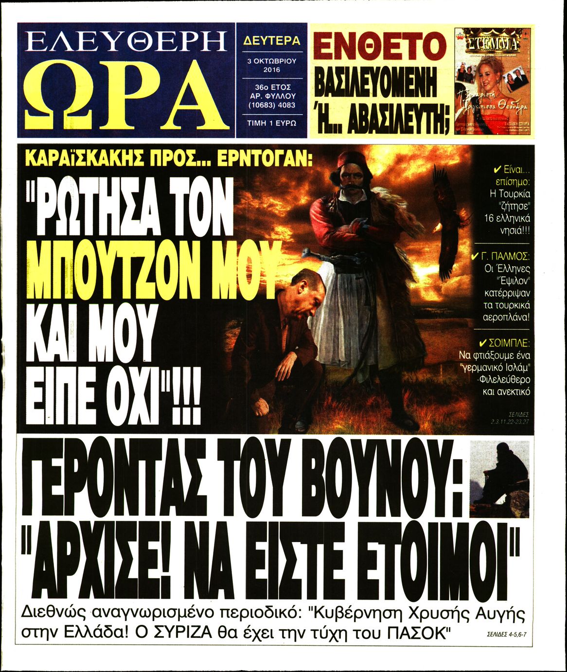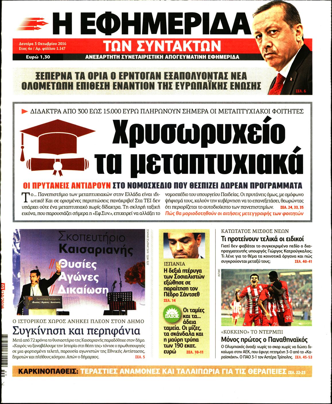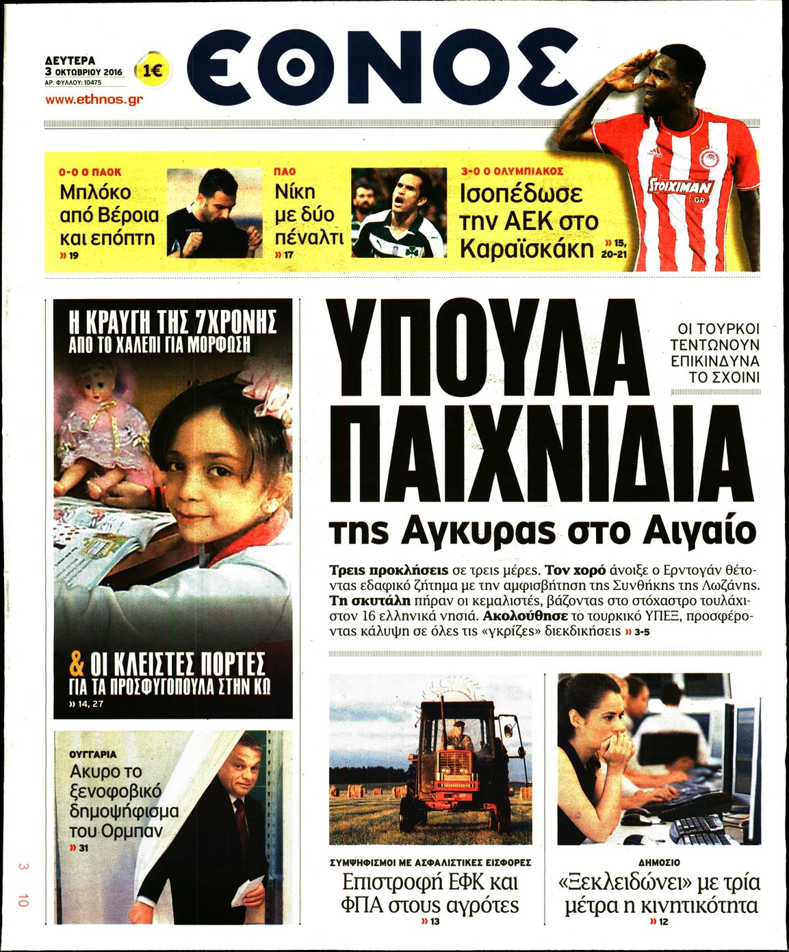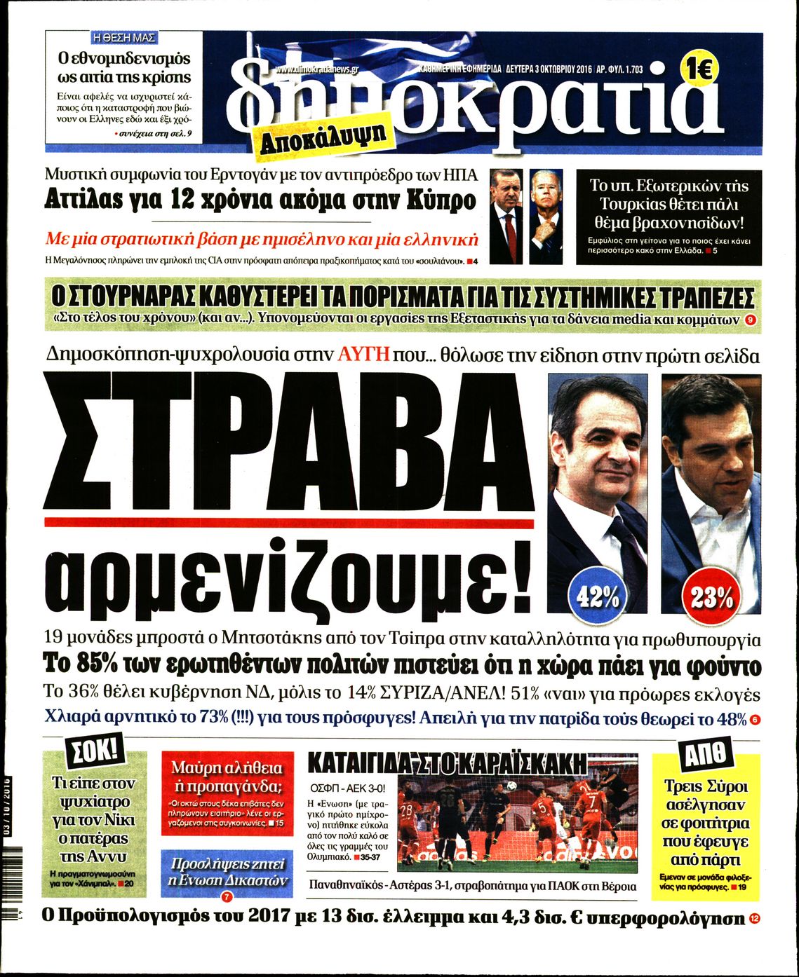 Οι πολιτικές εφημερίδες 3-10-2016 Enikos Newsroom 05:58, Δευτέρα 03 Οκτωβρίου 2016 Media Διαβάστε τα σημερινά πρωτοσέλιδα των πολιτικών εφημερίδων: ΠΟΛΙΤΙΚΕΣ ΕΦΗΜΕΡΙΔΕΣ ΠΡΩΤΟΣΕΛΙΔΑ Μοιράσου το: σχολίασε κι εσύ (0 σχόλια) Ακολουθήστε το enikos.gr στο Google News και μάθετε πρώτοι όλες τις ειδήσεις Δείτε όλες τις τελευταίες ειδήσεις από την Ελλάδα και τον Κόσμο στο enikos.gr Ειδήσεις Ροή Ειδήσεων 4 ώρες πριν Χριστούγεννα στα μπλόκα: Επιμένουν στις κινητοποιήσεις τους οι αγρότες – Ανοίγουν τα διόδια το Σαββατοκύριακο 4 ώρες πριν Ουκρανία: Η άνευ προηγουμένου επίθεση σε ρωσικό τάνκερ στη Μεσόγειο και το μήνυμα προς στον Πούτιν – Το «μακρύ χέρι» του Κιέβου 3 ώρες πριν Πούτιν: Τα μηνύματα σε Ευρώπη και ΝΑΤΟ από το μαραθώνιο «σόου» του – Η απαίτηση για «σεβασμό» και η ειρήνη «με τους όρους» της Μόσχας 4 ώρες πριν Τραμπ: Δεν αποκλείει την πιθανότητα ενός πολέμου στη Βενεζουέλα – «Ο Μαδούρο ξέρει καλύτερα από τον καθένα τι ακριβώς θέλω» 5 ώρες πριν Συνεχίζει να προκαλεί ο Μίτσκοσκι: «Για μένα το όνομα Μακεδονία είναι ιερό» 3 ώρες πριν Ανακαλύφθηκαν αρχαία χρυσά νομίσματα 2.200 ετών που απεικονίζουν τον θεό Απόλλωνα – Η άγνωστη σύνδεση με τον Φίλιππο Β΄ της Μακεδονίας 4 ώρες πριν Ύπνος: Μια κρυφή κατάσταση του εγκεφάλου πριν από τον ύπνο μπορεί να είναι το “κλειδί” για υψηλή ευφυΐα και δημιουργικότητα 5 ώρες πριν Αριθμολογία: Οι άνθρωποι που έχουν γεννηθεί αυτές τις 4 ημερομηνίες, συχνά παρεξηγούνται – «Η καλοσύνη τους κρύβει τεράστια δύναμη» 6 ώρες πριν Ξεχάστε το καθάρισμα το Σαββατοκύριακο: Ο «κανόνας των 20 λεπτών» που θα σας λύσει τα χέρια 4 λεπτά πριν Ντόναλντ Τραμπ: «Πολύ βαριά αντίποινα» στη Συρία – «Πλήττουμε πολύ δυνατά οχυρά του Ισλαμικού Κράτους» 19 λεπτά πριν Εξάρχεια: Ένταση με μολότοφ, χημικά και κρότου λάμψης 34 λεπτά πριν ΗΠΑ: Τραγωδία στην Αλαμπάμα – Σκότωσε την δημοσιογράφο σύζυγό του και αυτοκτόνησε μπροστά στον 3χρονο γιο τους 49 λεπτά πριν Πρόταση γάμου στο ΣΕΦ κατά την διάρκεια του αγώνα Ολυμπιακός-Βιλερμπάν – Δείτε βίντεο 1 ώρα πριν Euroleague: Επέστρεψε στις νίκες ο Ολυμπιακός, πήρε την ματσάρα της χρονιάς η Μπάρτσα – Τα αποτελέσματα και η βαθμολογία ENIKOS NETWORK Το ΕΚΑΒ τιμήθηκε από την Ακαδημία Αθηνών για τα 40 χρόνια προσφοράς του Έχετε πραγματικά μεγάλη καρδιά; 10 χαρακτηριστικά όσων έχουν καλοσύνη Αναστολή μέτρων αναγκαστικής εκτέλεσης για κτηνοτρόφους που πλήττονται από την ευλογιά των αιγοπροβάτων Πλήρης επάρκεια προϊόντων στις λαϊκές της Αττικής, παρά τις αγροτικές κινητοποιήσεις – Τι απαντούν οι πωλητές Χαρτογραφώντας το «σημείο χωρίς επιστροφή»: Για πρώτη φορά αποκαλύπτεται με λεπτομέρεια το ακανθώδες όριο της ατμόσφαιρας τ... Η Google καταργεί τη λειτουργία «dark web report» – Πώς θα μπορούν οι χρήστες να διαγράφουν τα δεδομένα τους περισσότερα 22:42 , Παρασκευή 19 Δεκεμβρίου 2025 Γιώργος Γιαννόπουλος για “Το σόι σου”: “Είναι ευτυχία και ευλογία αυτή η σειρά” «Είναι ευτυχία και ευλογία η συγκυρία αυτής της σειράς», θα πει ο Γιώργος Γιαννόπουλος -ο αγαπ... 20:37 , Παρασκευή 19 Δεκεμβρίου 2025 Don’t Forget The Lyrics: Η Έλλη Κοκκίνου υποδέχεται 4 παίκτες που θα κάνουν τα πάντα για να μη χάσουν ούτε… μισή λέξη από τους στίχους Το «Don’t Forget The Lyrics» επιστρέφει απόψε, Παρασκευή 19 Δεκεμβρίου, στις 21:00 με νέο επει... 19:31 , Παρασκευή 19 Δεκεμβρίου 2025 GNTM: Απόψε ο μεγάλος τελικός για τους 4 φιναλίστ Έπειτα από μήνες γεμάτους μόδα, δημιουργία και έντονες αναμετρήσεις, το GNTM 2025 κορυφώνεται,... 18:11 , Παρασ