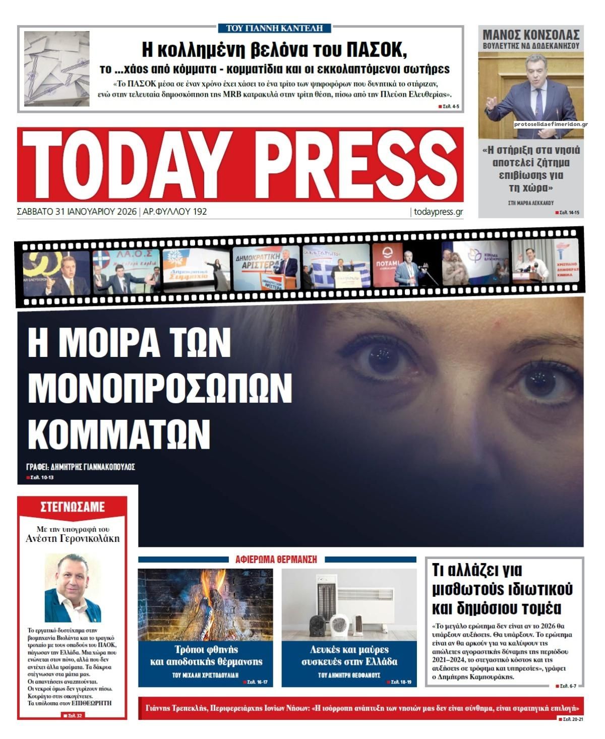 Οι πολιτικές εφημερίδες 31/1/2026 Enikos Newsroom 05:38, Σάββατο 31 Ιανουαρίου 2026 Media Διαβάστε τα πρωτοσέλιδα από τις πολιτικές εφημερίδες, σήμερα 31/1/2026. ΕΦΗΜΕΡΙΔΕΣ ΠΟΛΙΤΙΚΕΣ ΕΦΗΜΕΡΙΔΕΣ ΠΡΩΤΟΣΕΛΙΔΑ Μοιράσου το: «Όχι στο χάος»: Παρεμβάσεις από Τουρκία και αραβικό κόσμο για αποκλιμάκωση της πολεμικής έντασης μεταξύ ΗΠΑ – Ιράν ΗΠΑ: Παράταση δυο εβδομάδων ενέκρινε η Γερουσία για την χρηματοδότηση της ICE ώστε να αποτραπεί νέο shutdown Κίμπερλι Γκίλφοϊλ: «Η Ελλάδα δεν είναι παθητικός θεατής στο ενεργειακό μέλλον της Ευρώπης, είναι πρωταγωνιστής» σχολίασε κι εσύ (0 σχόλια) Ακολουθήστε το enikos.gr στο Google News και μάθετε πρώτοι όλες τις ειδήσεις Δείτε όλες τις τελευταίες ειδήσεις από την Ελλάδα και τον Κόσμο στο enikos.gr Ειδήσεις Ροή Ειδήσεων 11 ώρες πριν «Βιολάντα»: Αυτά είναι τα κρίσιμα σχέδια των εγκαταστάσεων που κατέθεσε η επιχείρηση στις αρμόδιες υπηρεσίες – Αποκάλυψη enikos.gr 8 ώρες πριν Αρχεία Επστάιν: Σάλος με τις αποκαλύψεις για τους φίλους του καταδικασμένου χρηματιστή – Οι Ρωσίδες, ο Γκέιτς, τα ΣΜΝ, τα ελικόπτερα και ο Μασκ 9 ώρες πριν Τροχαίο δυστύχημα στη Ρουμανία: Θρήνος στις κηδείες των 2 φιλάθλων του ΠΑΟΚ – Το Σάββατο η εξόδιος ακολουθία για τους 3 νέους από την Αλεξάνδρεια Ημαθίας 8 ώρες πριν Βιολάντα: Διευρυμένη εισαγγελική έρευνα για τα αίτια της τραγωδίας στα Τρίκαλα – Οι αποκαλύψεις για το αδήλωτο υπόγειο, οι καταθέσεις-«φωτιά» και το νέο βίντεο 12 ώρες πριν Νίκος Κούρκουλος: Η συνέντευξη στο «Ενώπιος Ενωπίω» και τον Νίκο Χατζηνικολάου το 1994 – Τι είχε πει για τα παιδικά του χρόνια, το θέατρο και την προσωπική του ζωή 1 ώρα πριν Υγεία του εντέρου: Το δημοφιλές ρόφημα που μπορεί να βλάψει το πεπτικό σας σύστημα, σύμφωνα με ειδικούς 1 ώρα πριν Οπτική ψευδαίσθηση: Μόνο αν είσαι ο Σέρλοκ Χολμς θα βρεις το airpod σε 10 δευτερόλεπτα 4 ώρες πριν Τα ζώδια σήμερα, Σάββατο 31 Ιανουαρίου 2026: Δίδυμοι, δοκιμάστε νέα πράγματα και διασκεδάστε χωρίς να σκέφτεστε το αποτέλεσμα 10 ώρες πριν Αριθμολογία: Οι 3 πιο ανιδιοτελείς ημερομηνίες γέννησης – «Είναι οι πιο γενναιόδωροι και δοτικοί άνθρωποι» 16 ώρες πριν Allwyn: Η νέα εποχή του ΟΠΑΠ – Νέο brand, περισσότερη διασκέδαση και σύγχρονες εμπειρίες ψυχαγωγίας για τους πελάτες 5 λεπτά πριν Εορτολόγιο: Ποιοι γιορτάζουν σήμερα 31 Ιανουαρίου 47 λεπτά πριν ΔΕΔΔΗΕ: Διακοπές ρεύματος σήμερα (31/1) στην Αθήνα και σε άλλες 15 περιοχές της Αττικής 48 λεπτά πριν Ίμια 1996 – 2026: 30 χρόνια από μια εθνική καμπή 55 λεπτά πριν Ο Aντόνιο Γκουτέρες προειδοποιεί για οικονομική κατάρρευση του ΟΗΕ μέχρι τον Ιούλιο λόγω εξάντλησης της ρευστότητας 1 ώρα πριν Οπτική ψευδαίσθηση: Μόνο αν είσαι ο Σέρλοκ Χολμς θα βρεις το airpod σε 10 δευτερόλεπτα ENIKOS NETWORK Το Νο1 πράγμα που πρέπει να κάνετε μετά από κάθε πτήση για να μην αρρωστήσετε Το νέκταρ των θνητών που μπορεί να ενισχύσει την υγεία της καρδιάς και να προστατεύσει από λίθους στα νεφρά ΗΠΑ: Πέφτει κατακόρυφα η τιμή του χρυσού και του ασημιού, μετά την επιλογή του Κέβιν Γουόρς για την ηγεσία της Fed Τράπεζα της Ελλάδας: Αύξηση πάνω από 80 δισ. ευρώ στις καταθέσεις νοικοκυριών από το 2019 – Σε υψηλό 15ετίας τον Δεκέμβριο Google Search: Αναβαθμίζει τις δυνατότητες AI με Gemini 3 και Follow-up ερωτήσεις Κουίζ: Πόσο καλός είσαι στην ελληνική μυθολογία; Δοκίμασε τις γνώσεις σου και κάνε το 3 στα 3 περισσότερα 05:48 , Σάββατο 31 Ιανουαρίου 2026 Οι οικονομικές εφημερίδες 31/1/2026 Διαβάστε τα πρωτοσέλιδα από τις οικονομικές εφημερίδες, σήμερα 31/1/2026. 21:42 , Παρασκευή 30 Ιανου