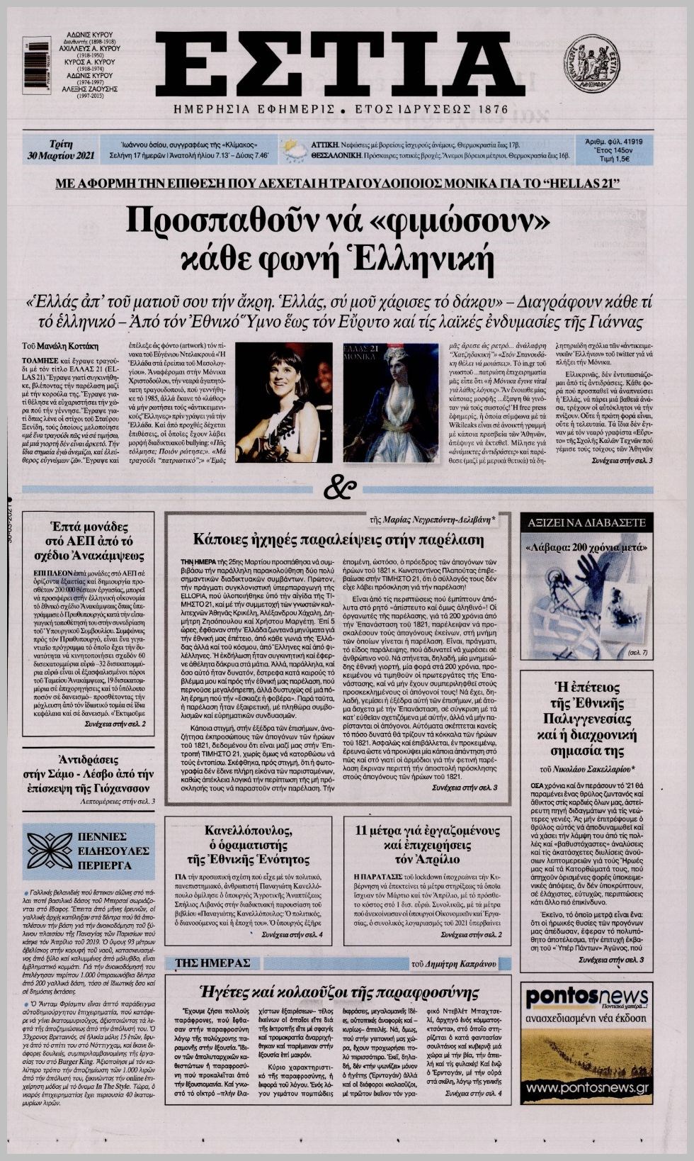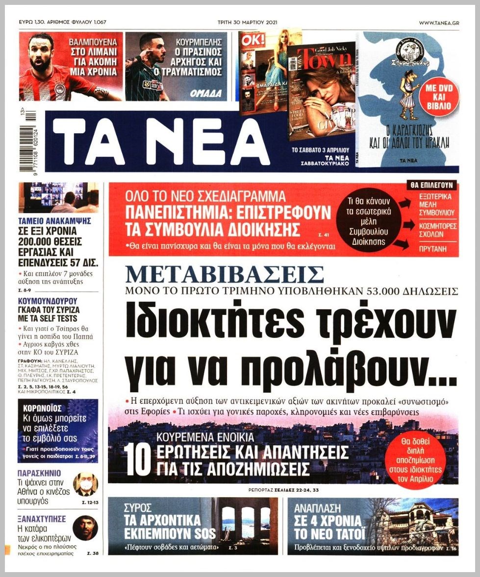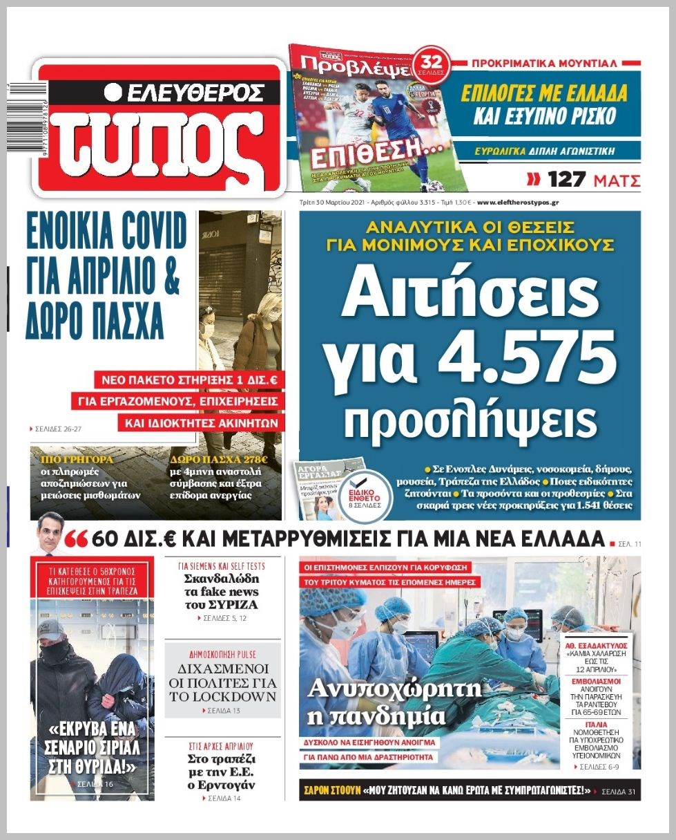 Οι πολιτικές εφημερίδες 30/3/2021 Διονύσης Νίκκας 06:13, Τρίτη 30 Μαρτίου 2021 Media Διαβάστε τα πρωτοσέλιδα των πολιτικών εφημερίδων… ΕΦΗΜΕΡΙΔΕΣ ΠΡΩΤΟΣΕΛΙΔΑ Μοιράσου το: σχολίασε κι εσύ (0 σχόλια) Ακολουθήστε το enikos.gr στο Google News και μάθετε πρώτοι όλες τις ειδήσεις Δείτε όλες τις τελευταίες ειδήσεις από την Ελλάδα και τον Κόσμο στο enikos.gr Ειδήσεις Ροή Ειδήσεων 4 ώρες πριν Υπόθεση Έπσταϊν: Το Υπουργείο Δικαιοσύνης δημοσιοποίησε μια σειρά από εξαιρετικά επεξεργασμένα αρχεία – «Λείπουν τα πιο σημαντικά έγγραφα», λένε οι Δημοκρατικοί 54 λεπτά πριν Γιορτές με μπλόκα για τους αγρότες: Ανοίγουν διόδια και μοιράζουν προϊόντα στους ταξιδιώτες 1 ώρα πριν Εξαφάνιση 33χρονου γιατρού στην Κρήτη: «Άναψα τα φώτα, τρόμαξε και άρχισε να τρέχει στα χωράφια» – Η τελευταία διαδρομή και η μαρτυρία «κλειδί» 3 ώρες πριν Ο «χάρτης» με τις αυξήσεις και τις φοροελαφρύνσεις του 2026 – Ποιοι και πόσα κερδίζουν 1 ώρα πριν Τα αρχεία του Έπσταϊν αποκαλύπτουν φωτογραφία του έκπτωτου πρίγκιπα Άντριου – Είναι ξαπλωμένος στην αγκαλιά 5 γυναικών 1 ώρα πριν Μία νέα «χρυσή» περίοδος αρχίζει για 3 ζώδια από σήμερα – «Μία αναπάντεχη ευκαιρία οδηγεί στην επιτυχία» 5 ώρες πριν Αυγά: Πόσα μπορείτε να τρώτε την ημέρα με ασφάλεια για μέγιστη πρόσληψη πρωτεΐνης 3 ώρες πριν Αρχαιολόγοι ανακάλυψαν σε χωράφι απεικόνιση 600 ετών ενός Αγίου – Τα στοιχεία που δείχνουν ότι μαρτύρησε 2 ώρες πριν Αγχώνεται για το χριστουγεννιάτικο δώρο που πήρε στην πλούσια σύντροφό του – «Φοβάμαι πως θα το βρει φθηνιάρικο, φοράει βραχιόλια Cartier» 4 λεπτά πριν Τραγωδία στην άσφαλτο στα Χανιά: Νεκρός 37χρονος οδηγός ΙΧ – Τον βρήκαν ώρες μετά το τροχαίο 12 λεπτά πριν Τα Labubu «μετακομίζουν» στο Χόλιγουντ: Η Sony Pictures ετοιμάζει live-action ταινία με τον σκηνοθέτη του «Wonka» 19 λεπτά πριν Νέες ταυτότητες: Μεγάλη αναμονή για ραντεβού στην Αττική – Τέλος τα ταξίδια εκτός Ελλάδος από τον Αύγουστο για όσους δεν έχουν αλλάξει 28 λεπτά πριν Οι 7 φράσεις που δεν λένε ποτέ οι συναισθηματικά έξυπνοι άνθρωποι κατά τη διάρκεια ενός καβγά 31 λεπτά πριν Τηλεθέαση (19/12): Ανατροπές και πρωτιές στην πρωινή ζώνη ENIKOS NETWORK Είστε μόνιμα απρόσεκτοι; 3 σημάδια που δείχνουν ότι μπορεί να είναι σύμπτωμα πάθησης Πόσα κιλά παίρνουμε πραγματικά τα Χριστούγεννα, σύμφωνα με την επιστήμη – Πώς να το αποτρέψουμε; e-ΕΦΚΑ και ΔΥΠΑ: Έρχονται νέες πληρωμές έως τις 24 Δεκεμβρίου – Ποιοι πάνε ταμείο Επίδομα παιδιού: Τι αλλάζει από το 2026 – Το όφελος από τις φορολογικές ελαφρύνσεις Χαρτογραφώντας το «σημείο χωρίς επιστροφή»: Για πρώτη φορά αποκαλύπτεται με λεπτομέρεια το ακανθώδες όριο της ατμόσφαιρας τ... Η Google καταργεί τη λειτουργία «dark web report» – Πώς θα μπορούν οι χρήστες να διαγράφουν τα δεδομένα τους περισσότερα 09:30 , Σάββατο 20 Δεκεμβρίου 2025 «Porto Leone: Στη γειτονιά με τα κόκκινα φανάρια» – Ο Χρόνης αποκαλύπτει στην Αλεξάνδρα το μυστικό για το παιδί της Λένας Η μεγάλη δραματική σειρά του Apha «Porto Leone: Στη γειτονιά με τα κόκκινα φανάρια» μας μεταφέ... 08:14 , Σάββατο 20 Δεκεμβρίου 2025 Τρομεροί γονείς: Η Μαρία Καβογιάννη εισβάλλει στο σπίτι της οικογένειας Στεφανίδη Όσα θα δούμε στο νέο διπλό επεισόδιο της σειράς «Τρομεροί γονείς», σήμερα Σάββατο 20 Δεκεμβρίο... 05:48 , Σάββατο 20 Δεκεμβρίου 2025 Οι οικονομικές εφημερίδες 20/12/2025 Διαβάστε τα πρωτοσέλιδα από τις οικονομικές εφημερίδες, σήμερα 20/12/2025. 05:43 , Σάββατο 20 Δεκεμβρίου 2025 Οι αθλητικές εφημερίδες 20/12/2025 Διαβάστε τα πρωτοσέλιδα από τις αθλητικές