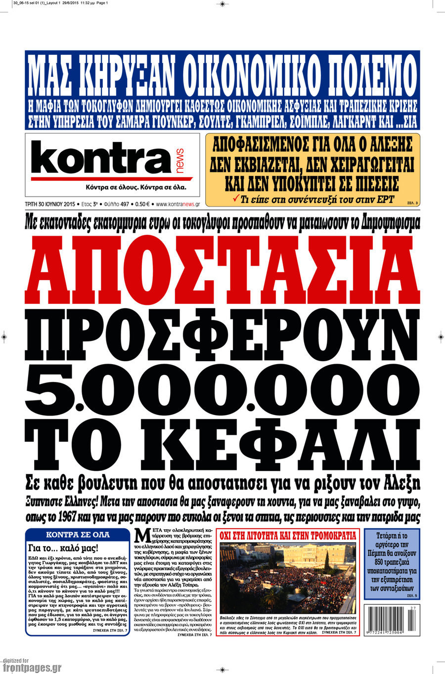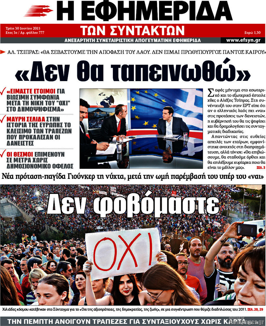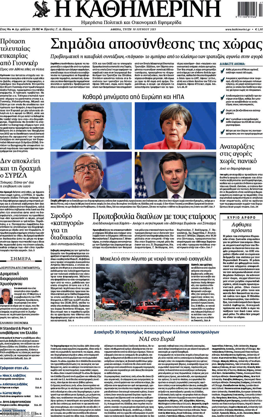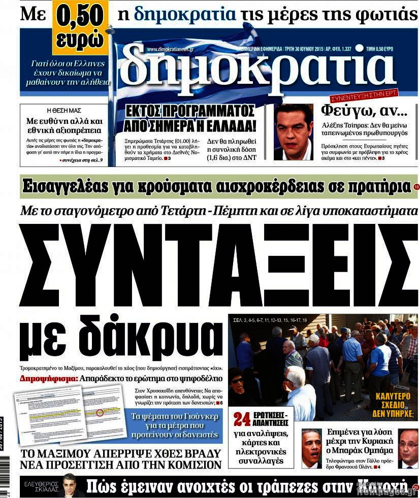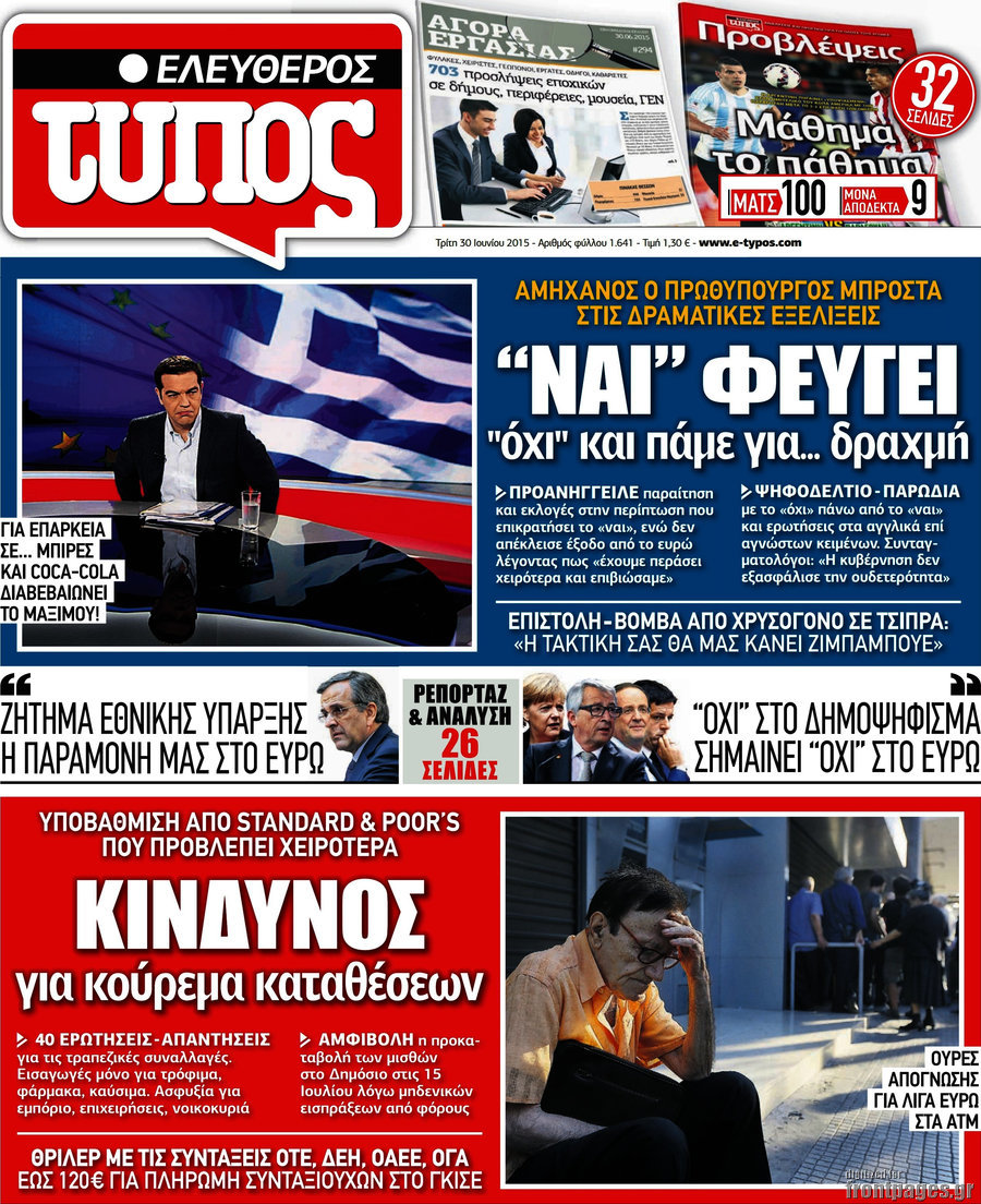 Οι πολιτικές εφημερίδες 30/6/2015 Enikos Newsroom 07:46, Τρίτη 30 Ιουνίου 2015 Media Διαβάστε τα σημερινά πρωτοσέλιδα των πολιτικών εφημερίδων: ΠΟΛΙΤΙΚΕΣ ΕΦΗΜΕΡΙΔΕΣ ΠΡΩΤΟΣΕΛΙΔΑ Μοιράσου το: σχολίασε κι εσύ (0 σχόλια) Ακολουθήστε το enikos.gr στο Google News και μάθετε πρώτοι όλες τις ειδήσεις Δείτε όλες τις τελευταίες ειδήσεις από την Ελλάδα και τον Κόσμο στο enikos.gr Ειδήσεις Ροή Ειδήσεων 2 ώρες πριν Χριστούγεννα στα μπλόκα: Επιμένουν στις κινητοποιήσεις τους οι αγρότες – Ανοίγουν τα διόδια το Σαββατοκύριακο 3 ώρες πριν Ουκρανία: Η άνευ προηγουμένου επίθεση σε ρωσικό τάνκερ στη Μεσόγειο και το μήνυμα προς στον Πούτιν – Το «μακρύ χέρι» του Κιέβου 2 ώρες πριν Πούτιν: Τα μηνύματα σε Ευρώπη και ΝΑΤΟ από το μαραθώνιο «σόου» του – Η απαίτηση για «σεβασμό» και η ειρήνη «με τους όρους» της Μόσχας 3 ώρες πριν Τραμπ: Δεν αποκλείει την πιθανότητα ενός πολέμου στη Βενεζουέλα – «Ο Μαδούρο ξέρει καλύτερα από τον καθένα τι ακριβώς θέλω» 3 ώρες πριν Συνεχίζει να προκαλεί ο Μίτσκοσκι: «Για μένα το όνομα Μακεδονία είναι ιερό» 2 ώρες πριν Ανακαλύφθηκαν αρχαία χρυσά νομίσματα 2.200 ετών που απεικονίζουν τον θεό Απόλλωνα – Η άγνωστη σύνδεση με τον Φίλιππο Β΄ της Μακεδονίας 3 ώρες πριν Ύπνος: Μια κρυφή κατάσταση του εγκεφάλου πριν από τον ύπνο μπορεί να είναι το “κλειδί” για υψηλή ευφυΐα και δημιουργικότητα 4 ώρες πριν Αριθμολογία: Οι άνθρωποι που έχουν γεννηθεί αυτές τις 4 ημερομηνίες, συχνά παρεξηγούνται – «Η καλοσύνη τους κρύβει τεράστια δύναμη» 5 ώρες πριν Ξεχάστε το καθάρισμα το Σαββατοκύριακο: Ο «κανόνας των 20 λεπτών» που θα σας λύσει τα χέρια 18 λεπτά πριν Φαίη Σκορδά: «Παλιότερα τα κομπλιμέντα τα προσπερνούσα, τώρα τα έχω ανάγκη» 34 λεπτά πριν Βασίλης Σπανούλης: Δεν εμφανίστηκε ούτε ένας δημοσιογράφος στην συνέντευξη Τύπου – «Καλησπέρα στον… κανέναν», δείτε βίντεο 45 λεπτά πριν Πόλεμος στην Ουκρανία: Εφτά νεκροί από ρωσική πυραυλική επίθεση στο λιμάνι της Οδησσού 49 λεπτά πριν ΗΠΑ: Η κυβέρνηση του Ντόναλντ Τραμπ άρχισε να δημοσιοποιεί τα αρχεία Έπσταϊν 1 ώρα πριν Σάμος: Άνοιξε το μπλόκο των αγροτών στον κόμβο Κοκκαρίου – Σε νέα συνεδρίαση θα καθορίσουν την στάση τους ENIKOS NETWORK Το ΕΚΑΒ τιμήθηκε από την Ακαδημία Αθηνών για τα 40 χρόνια προσφοράς του Έχετε πραγματικά μεγάλη καρδιά; 10 χαρακτηριστικά όσων έχουν καλοσύνη Αναστολή μέτρων αναγκαστικής εκτέλεσης για κτηνοτρόφους που πλήττονται από την ευλογιά των αιγοπροβάτων Πλήρης επάρκεια προϊόντων στις λαϊκές της Αττικής, παρά τις αγροτικές κινητοποιήσεις – Τι απαντούν οι πωλητές Χαρτογραφώντας το «σημείο χωρίς επιστροφή»: Για πρώτη φορά αποκαλύπτεται με λεπτομέρεια το ακανθώδες όριο της ατμόσφαιρας τ... Η Google καταργεί τη λειτουργία «dark web report» – Πώς θα μπορούν οι χρήστες να διαγράφουν τα δεδομένα τους περισσότερα 22:42 , Παρασκευή 19 Δεκεμβρίου 2025 Γιώργος Γιαννόπουλος για “Το σόι σου”: “Είναι ευτυχία και ευλογία αυτή η σειρά” «Είναι ευτυχία και ευλογία η συγκυρία αυτής της σειράς», θα πει ο Γιώργος Γιαννόπουλος -ο αγαπ... 20:37 , Παρασκευή 19 Δεκεμβρίου 2025 Don’t Forget The Lyrics: Η Έλλη Κοκκίνου υποδέχεται 4 παίκτες που θα κάνουν τα πάντα για να μη χάσουν ούτε… μισή λέξη από τους στίχους Το «Don’t Forget The Lyrics» επιστρέφει απόψε, Παρασκευή 19 Δεκεμβρίου, στις 21:00 με νέο επει... 19:31 , Παρασκευή 19 Δεκεμβρίου 2025 GNTM: Απόψε ο μεγάλος τελικός για τους 4 φιναλίστ Έπειτα από μήνες γεμάτους μόδα, δημιουργία και έντονες αναμετρήσεις, το GNTM 2025 κορυφώνεται,... 18:11 , Παρασκευ
