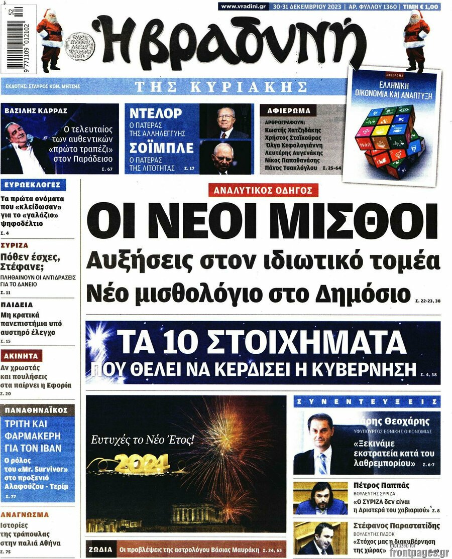 Οι πολιτικές εφημερίδες 31/12/2023 Σταύρος Ιωακείμ 07:26, Κυριακή 31 Δεκεμβρίου 2023 Media πολιτικές εφημερίδες Διαβάστε τα πρωτοσέλιδα από τις πολιτικές εφημερίδες, σήμερα 31/12/2023. ΕΦΗΜΕΡΙΔΕΣ ΠΟΛΙΤΙΚΕΣ ΕΦΗΜΕΡΙΔΕΣ ΠΡΩΤΟΣΕΛΙΔΑ Μοιράσου το: Η Νο1 τροφή που πρέπει να φάτε το πρωί για να αντιμετωπίσετε το φούσκωμα Εορταστικό ωράριο: Πώς θα λειτουργήσουν τα καταστήματα σήμερα παραμονή της Πρωτοχρονιάς Φωτιά σε λεωφορείο που εκτελούσε το δρομολόγιο Αθήνα-Θεσσαλονίκη – Ταλαιπωρία για δεκάδες επιβάτες σχολίασε κι εσύ (0 σχόλια) Ακολουθήστε το enikos.gr στο Google News και μάθετε πρώτοι όλες τις ειδήσεις Δείτε όλες τις τελευταίες ειδήσεις από την Ελλάδα και τον Κόσμο στο enikos.gr Ειδήσεις Ροή Ειδήσεων 2 ώρες πριν Πόλεμος στην Ουκρανία: Γιατί η Ρωσία αναμένεται να απορρίψει το νέο ειρηνευτικό σχέδιο – Τα 2 σημεία που δεν κάνει πίσω ο Πούτιν 3 ώρες πριν Τροχαίο στην Ημαθία: Θρήνος για τον θάνατο του 22χρονου – Συγκλονίζουν οι εικόνες από το σημείο της τραγωδίας 4 ώρες πριν Έκρηξη σε υποκατάστημα τράπεζας στη Θεσσαλονίκη: Ερευνάται ο ακριβής στόχος της επίθεσης και αναζητείται βιντεοληπτικό υλικό – Τι αναφέρουν οι κάτοικοι 6 ώρες πριν Μητροπολίτης Κοζάνης: «Μαχαίρωσες έναν άνθρωπο και δεν τρέχει τίποτα, σκότωσες ένα σκυλί, 30.000 εκείνη την ώρα και μετά δικαστήριο – Εκεί κατάντησε η Ελλάδα» 3 ώρες πριν Φρικτός θάνατος για 2χρονη: Έπεσε σε ποτάμι και την κατασπάραξαν πιράνχας 6 ώρες πριν Τα 3 ζώδια που θα νιώσουν ξανά ευτυχισμένα ύστερα από καιρό – «Οι μάχες τελειώνουν και όλα γίνονται πιο εύκολα» 5 ώρες πριν Νιώθετε περισσότερη μοναξιά τα Χριστούγεννα; Η ψυχολογία αποκαλύπτει τα 7 χαρακτηριστικά που μάλλον διαθέτετε 4 ώρες πριν Γυναίκα που διαγνώστηκε με καρκίνο του παχέος εντέρου προειδοποιεί: «Αυτή είναι η πιο ύπουλη πτυχή της νόσου» 1 ώρα πριν Το μυστικό του Αϊνστάιν σε ένα μικροτσίπ: Ανακαλύφθηκε η κρυφή γεωμετρία που «δαμάζει» τα ηλεκτρόνια όπως η βαρύτητα 3 λεπτά πριν Ελεύθερος υπό όρους ο πρόεδρος της Φενερμπαχτσέ – «Δεν είμαι τέλειος αλλά δεν έχω διαπράξει έγκλημα» 19 λεπτά πριν Τουρκία: Τι υποστηρίζει εμπειρογνώμονας σχετικά με τα αίτια του δυστυχήματος – Σαρώνουν την περιοχή στο σημείο της συντριβής του Falcon 26 λεπτά πριν Ιουλία Καλλιμάνη: Πελάτης της πέταξε λουλούδια με νερό – Η αντίδραση της τραγουδίστριας 35 λεπτά πριν Βελόπουλος: Είναι αδιανόητο για να χτυπήσεις τα μπλόκα των αγροτών, να χτυπάς όλη την κοινωνία 43 λεπτά πριν Αττική: Σαρωτικοί έλεγχοι της Τροχαίας για αλκοτέστ – Σε 7.000 ελέγχους εντοπίστηκαν 87 παραβάτες ENIKOS NETWORK 12 Χριστουγεννιάτικες υπερτροφές που πρέπει να συμπεριλάβετε στο γιορτινό τραπέζι – Είναι νόστιμες και θα σας χορτάσουν Οι επιστήμονες βρήκαν το μυστικό της μακροζωίας – Ποιοι μπορεί να ξεπεράσουν τα 100, σύμφωνα με μελέτη Κοινοί τραπεζικοί λογαριασμοί: Τα SOS που πρέπει να γνωρίζετε για να μην πληρώσετε έξτρα φόρο στην Εφορία Τέλη κυκλοφορίας 2026: Έως τις 31 Δεκεμβρίου η εξόφληση τους – Τα SOS της τελευταίας στιγμής που πρέπει να γνωρίζετε Ο Google Assistant θα παραμείνει λίγο περισσότερο για ορισμένους χρήστες Android Τεστ προσωπικότητας: Το βάζο που θα επιλέξετε αποκαλύπτει πώς λύνετε προβλήματα στη ζωή σας περισσότερα 14:14 , Πέμπτη 25 Δεκεμβρίου 2025 Την Κυριακή με τη Realnews: Ό,τι και αν αγοράσεις, σκανάρεις και κερδίζεις! Την Κυριακή με τη Realnews: Ό,τι και αν αγοράσεις, σκανάρεις και κερδίζεις! Με το PADU app, το... 11:58 , Πέμπτη 25 Δεκεμβρίου 2025 Ρεκόρ Γκίνες: Το White Ch