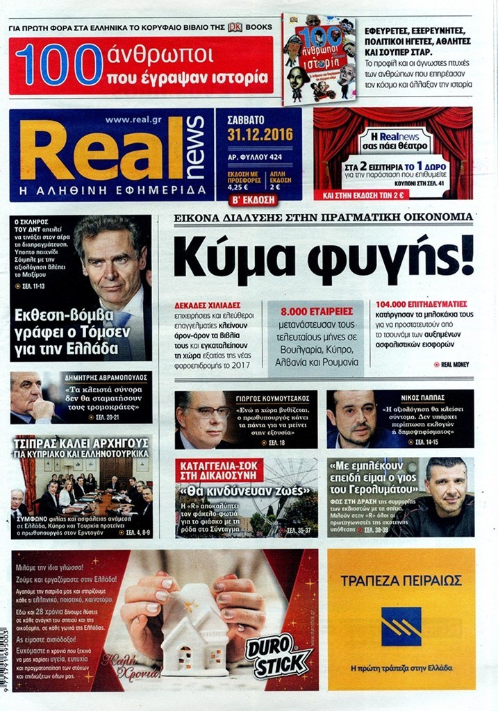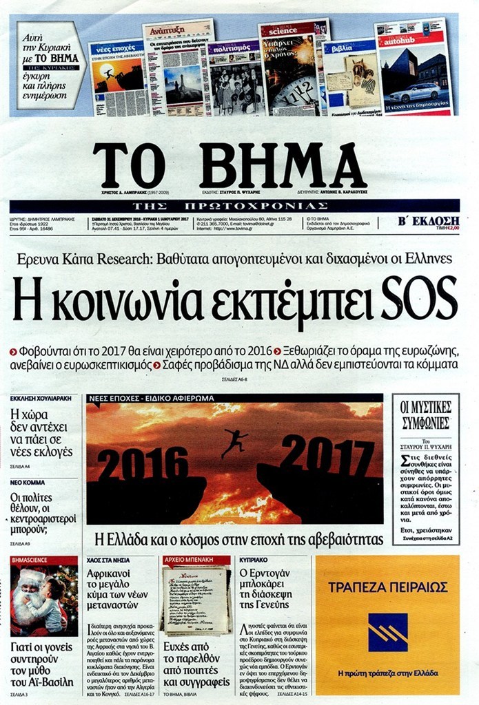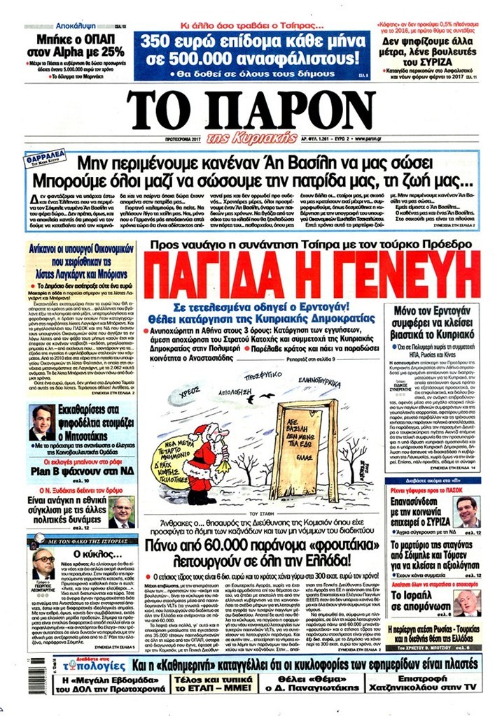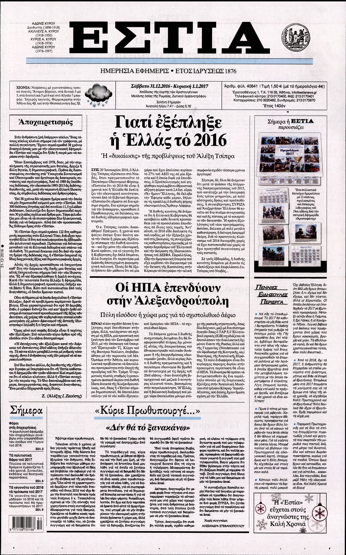 Οι πολιτικές εφημερίδες 31/12/2016 Κώστας Τεό 02:45, Σάββατο 31 Δεκεμβρίου 2016 Media Διαβάστε τα σημερινά πρωτοσέλιδα των πολιτικών εφημερίδων: ΠΟΛΙΤΙΚΕΣ ΕΦΗΜΕΡΙΔΕΣ ΠΡΩΤΟΣΕΛΙΔΑ Μοιράσου το: σχολίασε κι εσύ (0 σχόλια) Ακολουθήστε το enikos.gr στο Google News και μάθετε πρώτοι όλες τις ειδήσεις Δείτε όλες τις τελευταίες ειδήσεις από την Ελλάδα και τον Κόσμο στο enikos.gr Ειδήσεις Ροή Ειδήσεων 2 ώρες πριν Μπλόκα: Οι αγρότες σηκώνουν τις μπάρες σε διόδια για τους εκδρομείς των Χριστουγέννων και μοιράζουν προϊόντα – Βίντεο 2 ώρες πριν Τσιάρας προς αγρότες: Τα μπλόκα και τα πείσματα δεν ωφελούν – Οι λύσεις περνούν μέσα από τον διάλογο 3 ώρες πριν Αρχεία Έπσταϊν: Οι συγκλονιστικές φωτογραφίες – Ο Μάικλ Τζάκσον, ο Μικ Τζάγκερ και ο Κέβιν Σπέισι ανάμεσα στους διάσημους που απεικονίζονται 1 ώρα πριν Μαθητές διακινούσαν κοκαΐνη και χασίς σε σχολείο της Αττικής – 12 συλλήψεις 1 ώρα πριν Βέλγιο: Άγνωστοι έριξαν κόκκινη μπογιά στο προξενείο της Πολωνίας στις Βρυξέλλες 5 ώρες πριν Μία νέα «χρυσή» περίοδος αρχίζει για 3 ζώδια από σήμερα – «Μία αναπάντεχη ευκαιρία οδηγεί στην επιτυχία» 4 ώρες πριν Διαιτολόγος αποκαλύπτει 9 πρωινές συνήθειες που «λιώνουν» το κοιλιακό λίπος – «Υποστηρίζουν την υγιεινή απώλεια βάρους» 5 ώρες πριν Οι 7 φράσεις που δεν λένε ποτέ οι συναισθηματικά έξυπνοι άνθρωποι κατά τη διάρκεια ενός καβγά 7 ώρες πριν Enerwave: Το νέο «ρεύμα» στη λιανική ενέργειας που αλλάζει την εμπειρία του καταναλωτή 8 λεπτά πριν Πακιστάν: Σε κάθειρξη 17 ετών καταδικάστηκαν ο πρώην πρωθυπουργός Ίμραν Χαν και η σύζυγός του 16 λεπτά πριν Μαρινάκης στον Realfm 97,8: Η κυβέρνηση σέβεται κάθε λογική διεκδίκηση των αγροτών, αλλά και το αίτημα των πολιτών να μην ταλαιπωρούνται 23 λεπτά πριν O Πάντερ MVP της 17ης αγωνιστικής στην Euroleague 31 λεπτά πριν Πέθανε η τραγουδίστρια Κλαούντια Ντελμέρ 39 λεπτά πριν Μία ανεκμετάλλευτη πηγή θα μπορούσε να προσφέρει ανεξάντλητη ενέργεια – Οι επιστήμονες ίσως γνωρίζουν πώς να την ξεκλειδώσουν ENIKOS NETWORK Η αποχή από την αναπαραγωγή παρατείνει τη ζωή στα ζώα, σύμφωνα με μελέτη – Τι ισχύει για τους ανθρώπους; Σημαντικές επαφές στις ΗΠΑ είχε ο υπουργός Υγείας Άδωνις Γεωργιάδης Ευλογιά αιγοπροβάτων: Παρατεταμένη επιζωοτία, αυστηρά μέτρα – Τι ισχύει για τον εμβολιασμό και την ανασύσταση του ζωικού κε... Τσιάρας προς αγρότες: Έχει ικανοποιηθεί το 74% των αιτημάτων – Τα μπλόκα και τα πείσματα δεν ωφελούν Χαρτογραφώντας το «σημείο χωρίς επιστροφή»: Για πρώτη φορά αποκαλύπτεται με λεπτομέρεια το ακανθώδες όριο της ατμόσφαιρας τ... Η Google καταργεί τη λειτουργία «dark web report» – Πώς θα μπορούν οι χρήστες να διαγράφουν τα δεδομένα τους περισσότερα 14:04 , Σάββατο 20 Δεκεμβρίου 2025 Η Realnews αυτής της Κυριακής (21/12/2025) Με τίτλο: «Ασπίδα προστασίας για την Ελλάδα» κυκλοφορεί, αυτήν την Κυριακή, η Realnews. Σημαντ... 12:53 , Σάββατο 20 Δεκεμβρίου 2025 Να μ’ αγαπάς: Το παρελθόν έρχεται στο φως – Καταιγιστικές εξελίξεις στα τελευταία επεισόδια του 2025 Ο Άγγελος αποκαλύπτεται, η Φωτεινή ανησυχεί για τον Λευτέρη και η Ζωή έρχεται αντιμέτωπη με το... 11:41 , Σάββατο 20 Δεκεμβρίου 2025 «Η αγάπη δεν χάνεται ποτέ»: Η μικρού μήκους ταινία κινουμένων σχεδίων που θέτει ερωτήματα για τη ζωή και τον θάνατο Ο θάνατος είναι ένα από τα πιο σκληρά θέματα που καλείται να διαχειριστεί κάποιος στη διάρκεια... 09:30 , Σάββατο 20 Δεκεμβρίου 2025 «Porto Leone: Στη γειτονιά με τα κόκκινα φανάρια» – Ο Χρόνης αποκαλύπτει στην Αλεξάνδρα το μυστικό για το