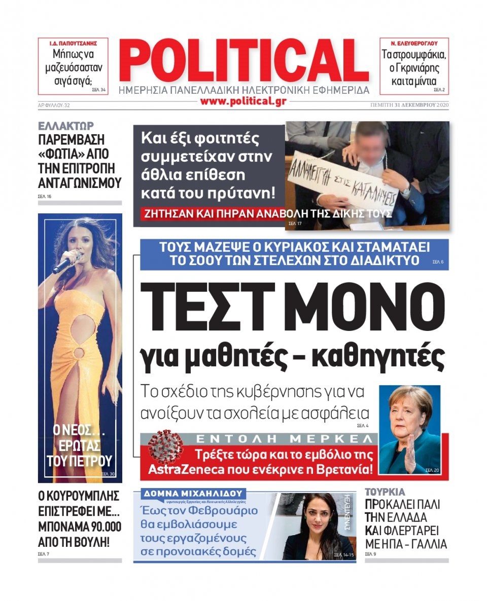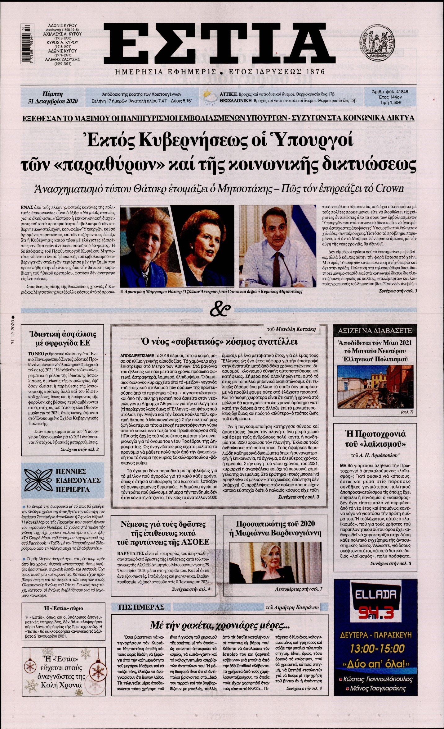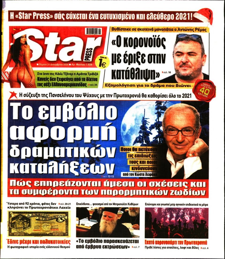 Οι πολιτικές εφημερίδες 31/12/2020 Διονύσης Νίκκας 07:00, Πέμπτη 31 Δεκεμβρίου 2020 Media Διαβάστε τα πρωτοσέλιδα των πολιτικών εφημερίδων… ΕΦΗΜΕΡΙΔΕΣ ΠΟΛΙΤΙΚΕΣ ΕΦΗΜΕΡΙΔΕΣ ΠΡΩΤΟΣΕΛΙΔΑ Μοιράσου το: σχολίασε κι εσύ (0 σχόλια) Ακολουθήστε το enikos.gr στο Google News και μάθετε πρώτοι όλες τις ειδήσεις Δείτε όλες τις τελευταίες ειδήσεις από την Ελλάδα και τον Κόσμο στο enikos.gr Ειδήσεις Ροή Ειδήσεων 6 ώρες πριν Χριστούγεννα στα μπλόκα: Επιμένουν στις κινητοποιήσεις τους οι αγρότες – Ανοίγουν τα διόδια το Σαββατοκύριακο 7 ώρες πριν Ουκρανία: Η άνευ προηγουμένου επίθεση σε ρωσικό τάνκερ στη Μεσόγειο και το μήνυμα προς στον Πούτιν – Το «μακρύ χέρι» του Κιέβου 6 ώρες πριν Πούτιν: Τα μηνύματα σε Ευρώπη και ΝΑΤΟ από το μαραθώνιο «σόου» του – Η απαίτηση για «σεβασμό» και η ειρήνη «με τους όρους» της Μόσχας 7 ώρες πριν Τραμπ: Δεν αποκλείει την πιθανότητα ενός πολέμου στη Βενεζουέλα – «Ο Μαδούρο ξέρει καλύτερα από τον καθένα τι ακριβώς θέλω» 8 ώρες πριν Συνεχίζει να προκαλεί ο Μίτσκοσκι: «Για μένα το όνομα Μακεδονία είναι ιερό» 6 ώρες πριν Ανακαλύφθηκαν αρχαία χρυσά νομίσματα 2.200 ετών που απεικονίζουν τον θεό Απόλλωνα – Η άγνωστη σύνδεση με τον Φίλιππο Β΄ της Μακεδονίας 7 ώρες πριν Ύπνος: Μια κρυφή κατάσταση του εγκεφάλου πριν από τον ύπνο μπορεί να είναι το “κλειδί” για υψηλή ευφυΐα και δημιουργικότητα 8 ώρες πριν Αριθμολογία: Οι άνθρωποι που έχουν γεννηθεί αυτές τις 4 ημερομηνίες, συχνά παρεξηγούνται – «Η καλοσύνη τους κρύβει τεράστια δύναμη» 9 ώρες πριν Ξεχάστε το καθάρισμα το Σαββατοκύριακο: Ο «κανόνας των 20 λεπτών» που θα σας λύσει τα χέρια 11 δευτερόλεπτα πριν ΟΗΕ: Το Συμβούλιο Ασφαλείας παρατείνει για έναν χρόνο την εντολή της ειρηνευτικής δύναμης στο Κονγκό 15 λεπτά πριν Μοχάμεντ Σαλάχ: Ζήτησε «συγγνώμη» από τους συμπαίκτες του στη Λίβερπουλ για το ξέσπασμά του 30 λεπτά πριν Μάρκο Ρούμπιο: Ανθρωπιστική κατάπαυση του πυρός στο Σουδάν ζητά ο Αμερικανός υπουργός Εξωτερικών 45 λεπτά πριν Αγγελική Νικολούλη: Τα συλλυπητήρια για την απώλεια της Ειρήνης Μαρινάκη 60 λεπτά πριν Βολιβία: Μαζική διαδηλώσεις εναντίον της κατάργησης των επιδοτήσεων των τιμών των καυσίμων ENIKOS NETWORK Το ΕΚΑΒ τιμήθηκε από την Ακαδημία Αθηνών για τα 40 χρόνια προσφοράς του Έχετε πραγματικά μεγάλη καρδιά; 10 χαρακτηριστικά όσων έχουν καλοσύνη Αναστολή μέτρων αναγκαστικής εκτέλεσης για κτηνοτρόφους που πλήττονται από την ευλογιά των αιγοπροβάτων Πλήρης επάρκεια προϊόντων στις λαϊκές της Αττικής, παρά τις αγροτικές κινητοποιήσεις – Τι απαντούν οι πωλητές Χαρτογραφώντας το «σημείο χωρίς επιστροφή»: Για πρώτη φορά αποκαλύπτεται με λεπτομέρεια το ακανθώδες όριο της ατμόσφαιρας τ... Η Google καταργεί τη λειτουργία «dark web report» – Πώς θα μπορούν οι χρήστες να διαγράφουν τα δεδομένα τους περισσότερα 04:20 , Σάββατο 20 Δεκεμβρίου 2025 Αγγελική Νικολούλη: Τα συλλυπητήρια για την απώλεια της Ειρήνης Μαρινάκη Τα συλληπητήρια στον πρόεδρο του Mega, τον Βαγγέλη Μαρινάκη, για την απώλεια της μητέρας του Ε... 02:50 , Σάββατο 20 Δεκεμβρίου 2025 GNTM: Η Ξένια Τσίρκοβα αναδείχθηκε μεγάλη νικήτρια και πήρε τις 50.000 ευρώ – Ποιος βρέθηκε σε απόσταση αναπνοής; Με φαντασμαγορικό τρόπο ολοκληρώθηκε το βράδυ της Παρασκευής ο μεγάλος τελικός του GNTM, μέσα ... 22:42 , Παρασκευή 19 Δεκεμβρίου 2025 Γιώργος Γιαννόπουλος για “Το σόι σου”: “Είναι ευτυχία και ευλογία αυτή η σειρά” «Είναι ευτυχία και ευλογία η συγκυρία αυτής της σειράς», θα πει ο Γιώργος Γι