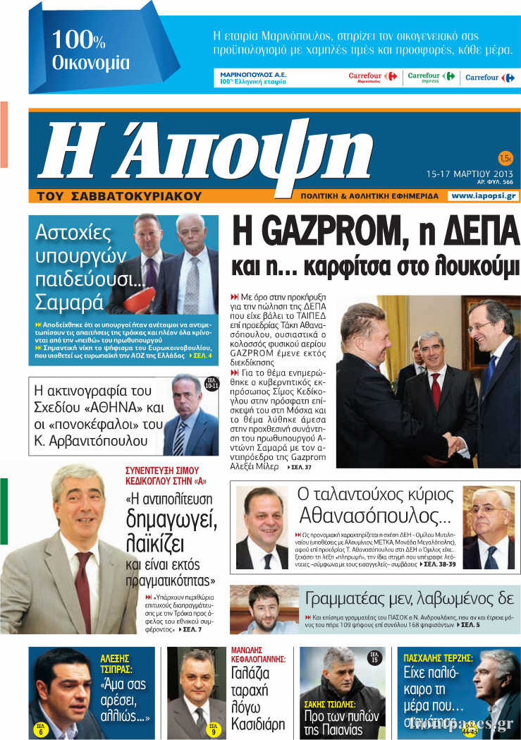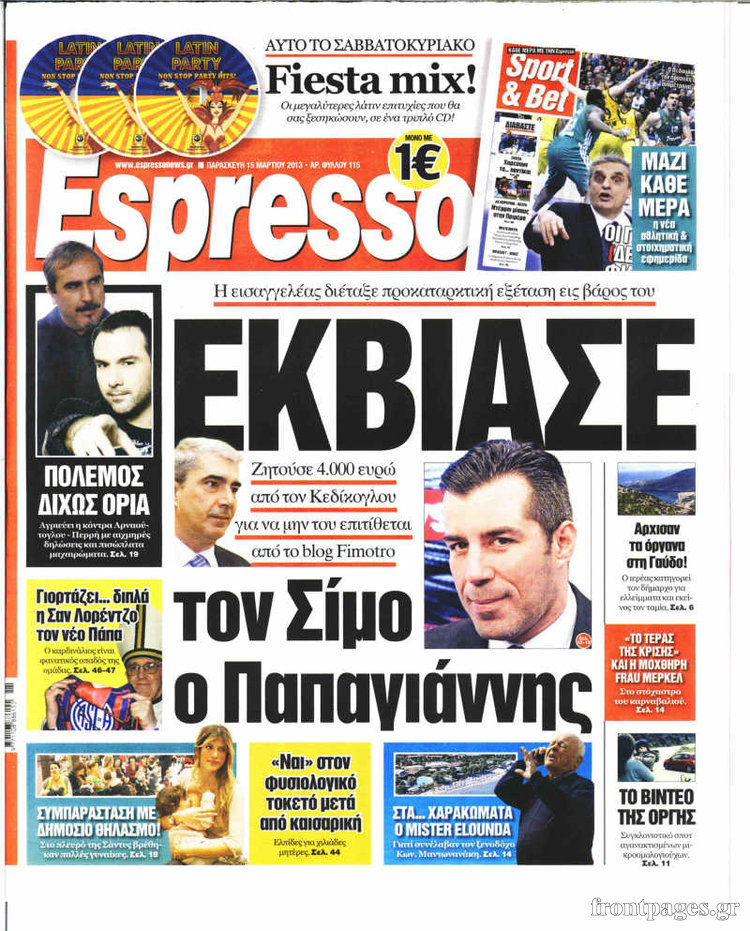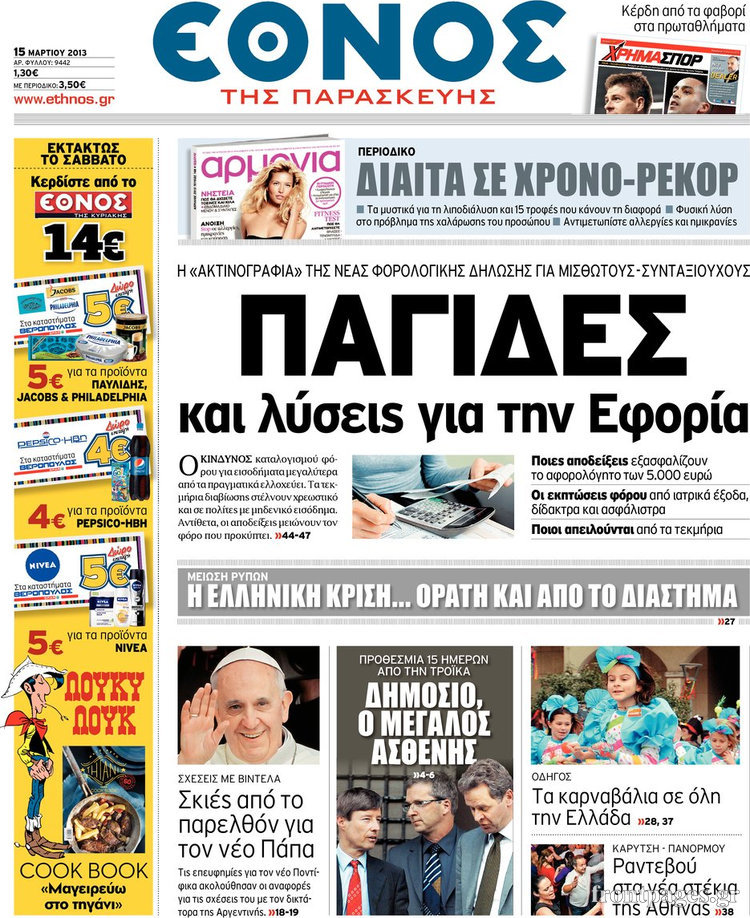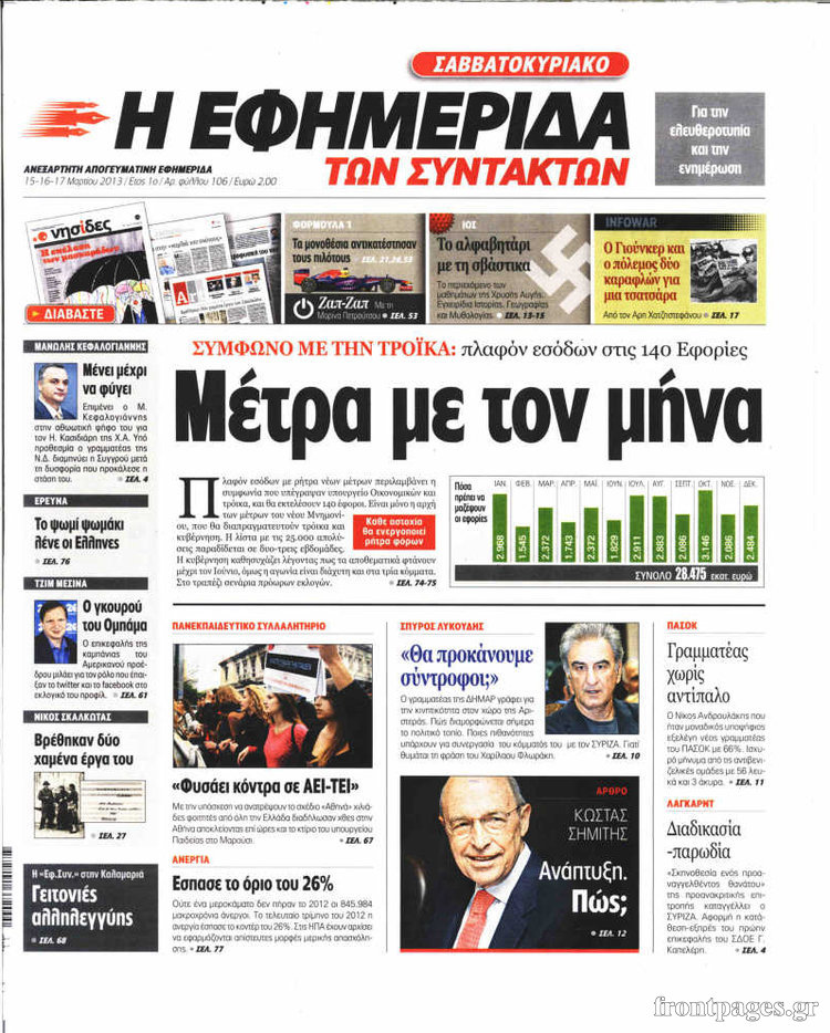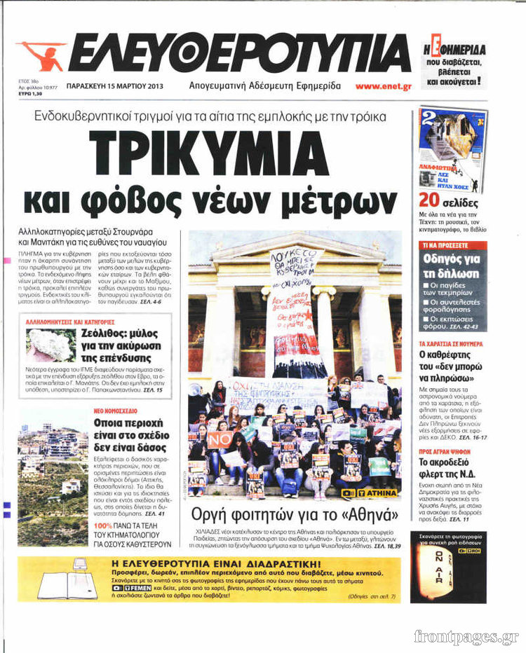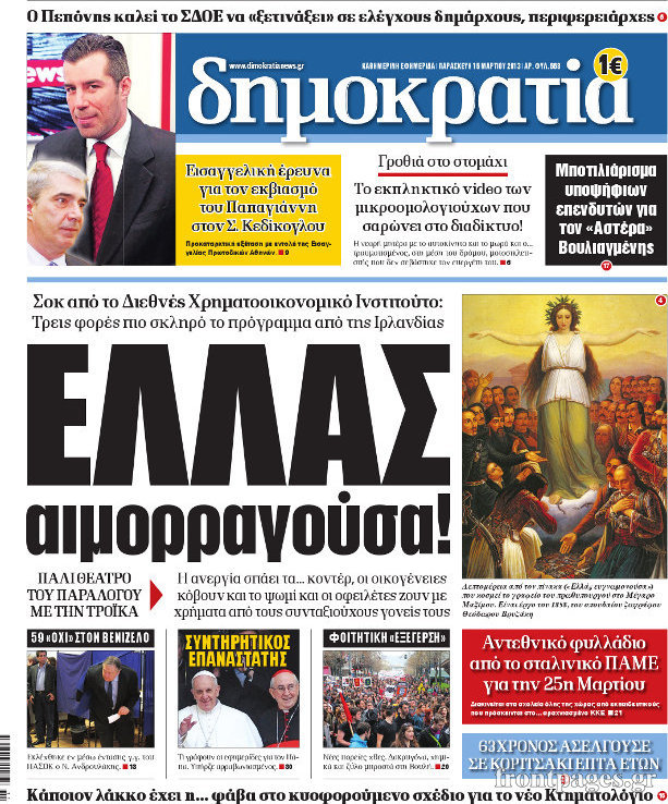 Οι πολιτικές εφημερίδες Enikos Newsroom 09:39, Παρασκευή 15 Μαρτίου 2013 Media Οι πολιτικές εφημερίδες ΕΦΗΜΕΡΙΔΕΣ ΟΙ ΠΟΛΙΤΙΚΕΣ ΕΦΗΜΕΡΙΔΕΣ ΠΡΩΤΟΣΕΛΙΔΑ Μοιράσου το: σχολίασε κι εσύ (0 σχόλια) Ακολουθήστε το enikos.gr στο Google News και μάθετε πρώτοι όλες τις ειδήσεις Δείτε όλες τις τελευταίες ειδήσεις από την Ελλάδα και τον Κόσμο στο enikos.gr Ειδήσεις Ροή Ειδήσεων 59 λεπτά πριν Αγρότες: Την Τρίτη η απόφαση για διάλογο ή κλιμάκωση των κινητοποιήσεών τους – Πώς χαρακτηρίζουν τις ανακοινώσεις Τσιάρα και οι επόμενες κινήσεις 34 λεπτά πριν Τραμπ για Ουκρανία: «Είμαστε πιο κοντά σε συμφωνία από ποτέ» – «Πολυεθνική δύναμη» προτείνουν οι Ευρωπαίοι 52 λεπτά πριν Κυψέλη: Η 16χρονη που μαχαίρωσε την 14χρονη είχε συλληφθεί 3 φορές στο παρελθόν – Έβριζε καθηγητές, έβαζε φωτιές σε κάδους και εκβίαζε συμμαθητές της 1 ώρα πριν Χαλκιδική: Πώς δρούσαν οι αστυνομικοί που συνελήφθησαν για κλήσεις που δεν έκοβαν – Η «ετήσια συνδρομή» για τα μπλόκα της Τροχαίας και οι «δωρεές» 17 λεπτά πριν Τρομοκρατική επίθεση στο Σίδνεϊ: Θλίψη για τα 15 θύματα – Οργή στην εβραϊκή κοινότητα που προειδοποιούσε επί δύο χρόνια 2 ώρες πριν Ύπνος: Η αρχαία μορφή άσκησης που αποδεικνύεται αποτελεσματική στην αντιμετώπιση της αϋπνίας, σύμφωνα με μελέτη 3 ώρες πριν Αριθμολογία: Ο τυχερός σας αριθμός, ανάλογα με τον μήνα γέννησής σας 4 ώρες πριν Πώς να μην μαραίνονται γρήγορα τα κομμένα λουλούδια: Το λάθος στην τοποθέτηση του βάζου που πρέπει να αποφεύγετε 37 λεπτά πριν Επιστήμονες ίσως έλυσαν το μυστήριο γύρω από τα Χόμπιτ – Νέα έρευνα αποκαλύπτει πώς εξαφανίστηκαν 11 λεπτά πριν ΚΚΕ: Το νομοσχέδιο – «λαιμητόμος» του υπουργείου Άμυνας δεν πρέπει να περάσει 17 λεπτά πριν Τρομοκρατική επίθεση στο Σίδνεϊ: Θλίψη για τα 15 θύματα – Οργή στην εβραϊκή κοινότητα που προειδοποιούσε επί δύο χρόνια 21 λεπτά πριν Ινστιτούτο Prolepsis: Κρίσιμα εμπόδια και βασικές προϋποθέσεις για την ενίσχυση της υγείας στα σωφρονιστικά ιδρύματα – Ευρήματα από το έργο PARTNER 27 λεπτά πριν Χανιά: Ηλικιωμένες μητέρες κρατουμένων προσπάθησαν να περάσουν ναρκωτικά στις φυλακές 34 λεπτά πριν Τραμπ για Ουκρανία: «Είμαστε πιο κοντά σε συμφωνία από ποτέ» – «Πολυεθνική δύναμη» προτείνουν οι Ευρωπαίοι ENIKOS NETWORK Πότε το χρόνιο ροχαλητό να αποτελέσει ένδειξη κινδύνου για την καρδιά; Τι λένε οι ειδικοί Μάριος Θεμιστοκλέους: Το ΕΣΥ ενισχύεται, εκσυγχρονίζεται, αλλάζει ΕΒΕΠ για αγροτικές κινητοποιήσεις: Κάθε επιπλέον εβδομάδα προσθέτει περίπου 200 εκατ. ευρώ ζημιά Τι προβλέπει το νομοσχέδιο του υπουργείου Εθνικής Άμυνας – Oι αλλαγές στους μισθούς Σύγχρονος Νοστράδαμος: Προειδοποιεί για «μεγάλο γεγονός» τους επόμενους μήνες που θα συγκλονίσει τη Βρετανία και τον κόσμο Τεστ παρατηρητικότητας: Μπορείτε να βρείτε τις 3 διαφορές στις εικόνες με έναν πιγκουίνο σε 14 δευτερόλεπτα περισσότερα 21:35 , Δευτέρα 15 Δεκεμβρίου 2025 Το Σπίτι Δίπλα Στο Ποτάμι: Η Ιουλία και ο Φωκάς μετακομίζουν στη Ρόδο – Δύο νέοι χαρακτήρες μπαίνουν στη σειρά Δύο νέοι, κομβικοί χαρακτήρες κάνουν την εμφάνισή τους αυτή την εβδομάδα στην αγαπημένη σειρά ... 19:46 , Δευτέρα 15 Δεκεμβρίου 2025 Άγιος έρωτας: Η Χριστίνα λέει την αλήθεια στον Αντρέα Ο Βασίλης δέχεται επίθεση από τους συμμαθητές του, η Αναστασία είναι συντετριμμένη με την απώλ... 18:45 , Δευτέρα 15 Δεκεμβρίου 2025 Συνέδριο «Ελληνικός Τουρισμός 2025, Μια εθνική υπόθεση!» – «Ο Θαλάσσιος Πυλώνας ως Ενιαία Στρατηγική: Συνέργειες σε Λιμάνια, Μαρίνες, Ακτοπλο