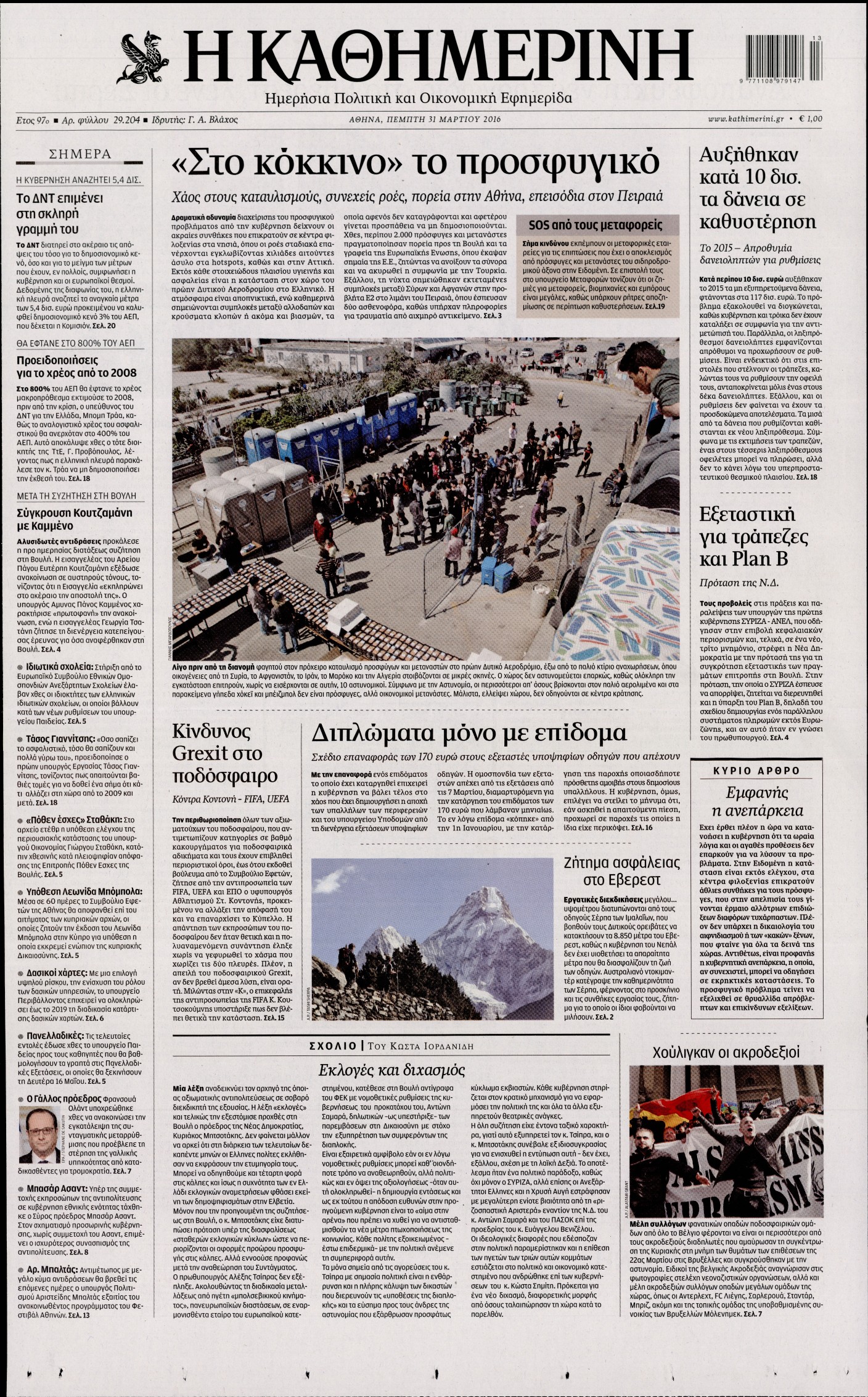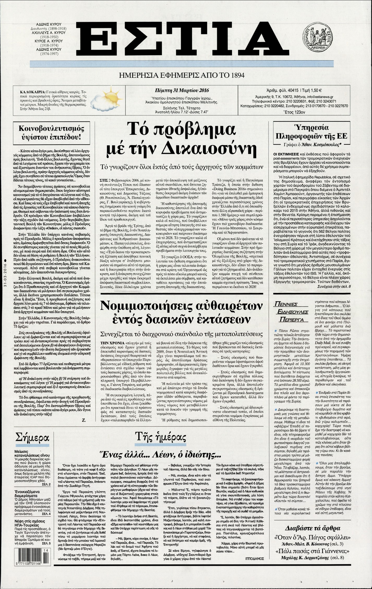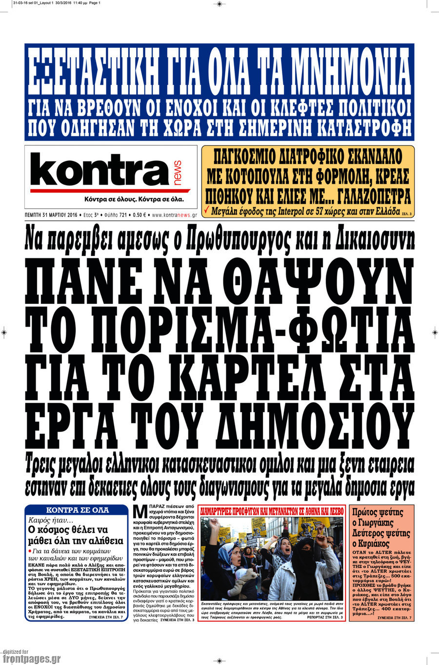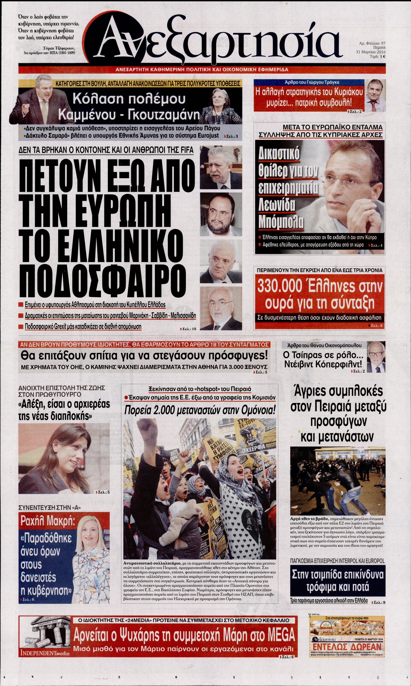 Οι πολιτικές εφημερίδες 31/3/2016 Enikos Newsroom 07:29, Πέμπτη 31 Μαρτίου 2016 Media Διαβάστε τα σημερινά πρωτοσέλιδα των πολιτικών εφημερίδων: ΠΟΛΙΤΙΚΕΣ ΕΦΗΜΕΡΙΔΕΣ ΠΡΩΤΟΣΕΛΙΔΑ Μοιράσου το: σχολίασε κι εσύ (0 σχόλια) Ακολουθήστε το enikos.gr στο Google News και μάθετε πρώτοι όλες τις ειδήσεις Δείτε όλες τις τελευταίες ειδήσεις από την Ελλάδα και τον Κόσμο στο enikos.gr Ειδήσεις Ροή Ειδήσεων 3 ώρες πριν Χριστούγεννα στα μπλόκα: Επιμένουν στις κινητοποιήσεις τους οι αγρότες – Ανοίγουν τα διόδια το Σαββατοκύριακο 3 ώρες πριν Ουκρανία: Η άνευ προηγουμένου επίθεση σε ρωσικό τάνκερ στη Μεσόγειο και το μήνυμα προς στον Πούτιν – Το «μακρύ χέρι» του Κιέβου 2 ώρες πριν Πούτιν: Τα μηνύματα σε Ευρώπη και ΝΑΤΟ από το μαραθώνιο «σόου» του – Η απαίτηση για «σεβασμό» και η ειρήνη «με τους όρους» της Μόσχας 3 ώρες πριν Τραμπ: Δεν αποκλείει την πιθανότητα ενός πολέμου στη Βενεζουέλα – «Ο Μαδούρο ξέρει καλύτερα από τον καθένα τι ακριβώς θέλω» 4 ώρες πριν Συνεχίζει να προκαλεί ο Μίτσκοσκι: «Για μένα το όνομα Μακεδονία είναι ιερό» 2 ώρες πριν Ανακαλύφθηκαν αρχαία χρυσά νομίσματα 2.200 ετών που απεικονίζουν τον θεό Απόλλωνα – Η άγνωστη σύνδεση με τον Φίλιππο Β΄ της Μακεδονίας 3 ώρες πριν Ύπνος: Μια κρυφή κατάσταση του εγκεφάλου πριν από τον ύπνο μπορεί να είναι το “κλειδί” για υψηλή ευφυΐα και δημιουργικότητα 4 ώρες πριν Αριθμολογία: Οι άνθρωποι που έχουν γεννηθεί αυτές τις 4 ημερομηνίες, συχνά παρεξηγούνται – «Η καλοσύνη τους κρύβει τεράστια δύναμη» 5 ώρες πριν Ξεχάστε το καθάρισμα το Σαββατοκύριακο: Ο «κανόνας των 20 λεπτών» που θα σας λύσει τα χέρια 5 λεπτά πριν Συρία: Μαζικά πλήγματα των ΗΠΑ σε θέσεις του Ισλαμικού Κράτους – Χέγκσεθ: «Δεν είναι αρχή πολέμου, είναι μια δήλωση εκδίκησης» για το θάνατο των στρατιωτών μας 18 λεπτά πριν Ουκρανία: Ολοκληρώθηκαν οι συνομιλίες με τους Αμερικανούς κι Ευρωπαίους διαπραγματευτές 33 λεπτά πριν Μπαρτσελόνα – Μπασκόνια 134-124: Οι «μπλαουγκράνα» πήραν το ματς της χρονιάς ύστερα από τρεις παρατάσεις 48 λεπτά πριν Φαίη Σκορδά: «Παλιότερα τα κομπλιμέντα τα προσπερνούσα, τώρα τα έχω ανάγκη» 1 ώρα πριν Βασίλης Σπανούλης: Δεν εμφανίστηκε ούτε ένας δημοσιογράφος στην συνέντευξη Τύπου – «Καλησπέρα στον… κανέναν», δείτε βίντεο ENIKOS NETWORK Το ΕΚΑΒ τιμήθηκε από την Ακαδημία Αθηνών για τα 40 χρόνια προσφοράς του Έχετε πραγματικά μεγάλη καρδιά; 10 χαρακτηριστικά όσων έχουν καλοσύνη Αναστολή μέτρων αναγκαστικής εκτέλεσης για κτηνοτρόφους που πλήττονται από την ευλογιά των αιγοπροβάτων Πλήρης επάρκεια προϊόντων στις λαϊκές της Αττικής, παρά τις αγροτικές κινητοποιήσεις – Τι απαντούν οι πωλητές Χαρτογραφώντας το «σημείο χωρίς επιστροφή»: Για πρώτη φορά αποκαλύπτεται με λεπτομέρεια το ακανθώδες όριο της ατμόσφαιρας τ... Η Google καταργεί τη λειτουργία «dark web report» – Πώς θα μπορούν οι χρήστες να διαγράφουν τα δεδομένα τους περισσότερα 22:42 , Παρασκευή 19 Δεκεμβρίου 2025 Γιώργος Γιαννόπουλος για “Το σόι σου”: “Είναι ευτυχία και ευλογία αυτή η σειρά” «Είναι ευτυχία και ευλογία η συγκυρία αυτής της σειράς», θα πει ο Γιώργος Γιαννόπουλος -ο αγαπ... 20:37 , Παρασκευή 19 Δεκεμβρίου 2025 Don’t Forget The Lyrics: Η Έλλη Κοκκίνου υποδέχεται 4 παίκτες που θα κάνουν τα πάντα για να μη χάσουν ούτε… μισή λέξη από τους στίχους Το «Don’t Forget The Lyrics» επιστρέφει απόψε, Παρασκευή 19 Δεκεμβρίου, στις 21:00 με νέο επει... 19:31 , Παρασκευή 19 Δεκεμβρίου 2025 GNTM: Απόψε ο μεγάλος τελικός για τους 4 φιναλίστ Έπειτα από μήνες γεμάτο