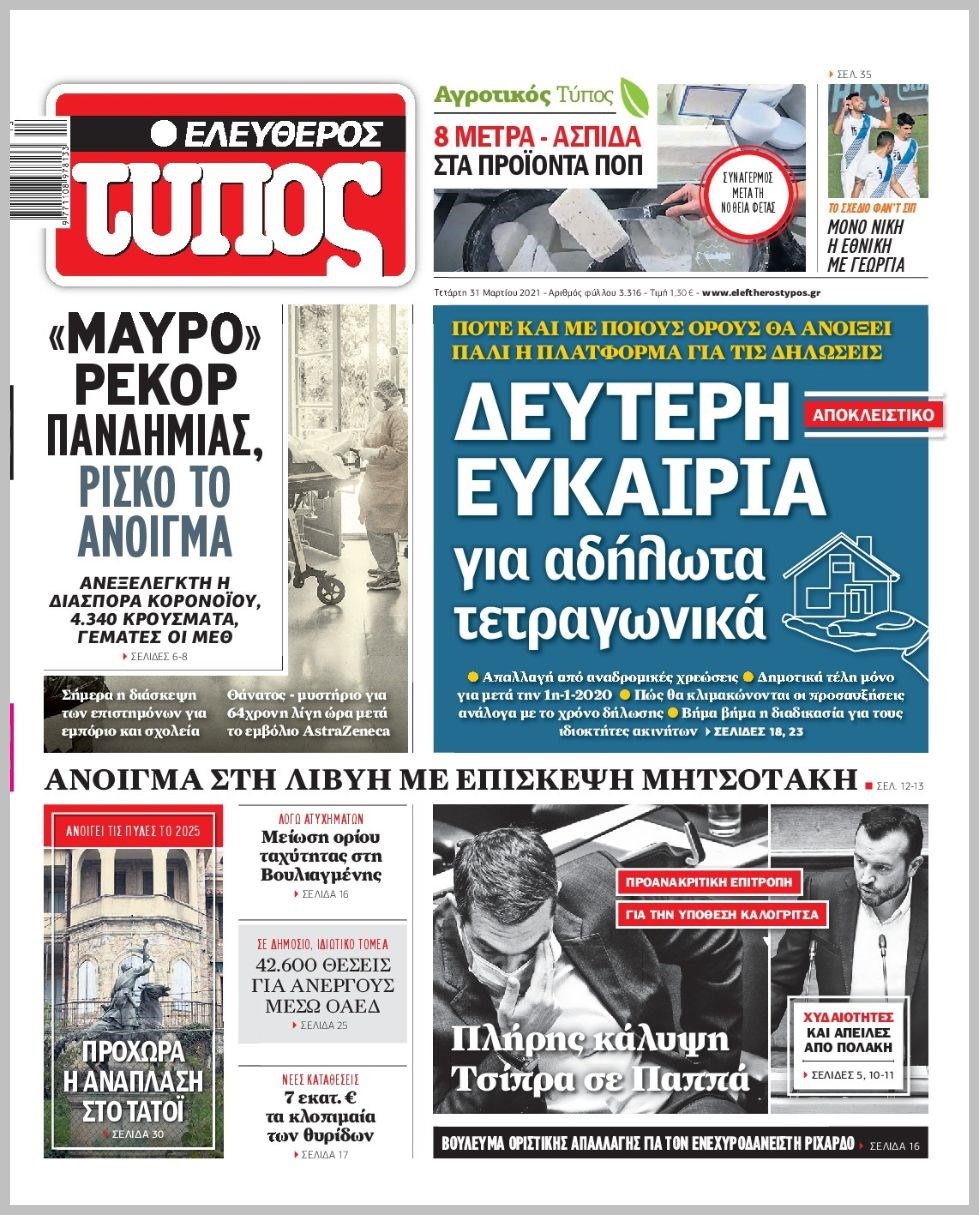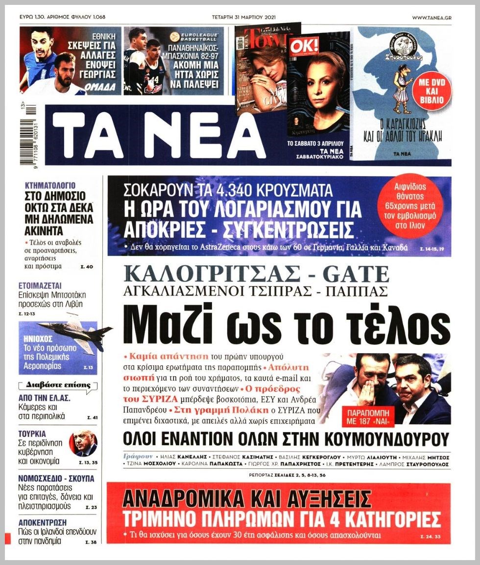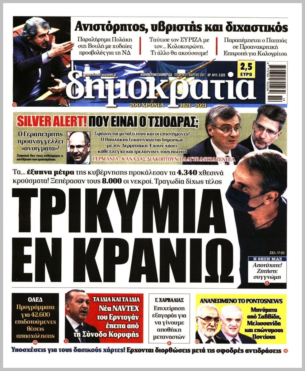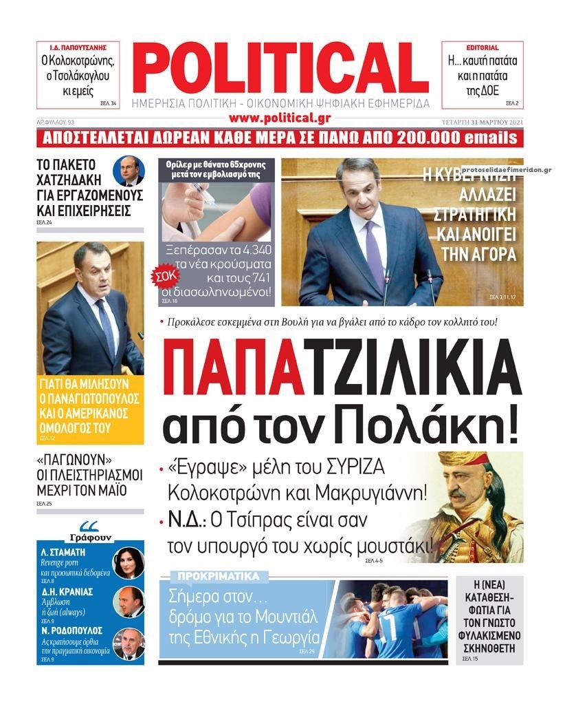 Οι πολιτικές εφημερίδες 31/3/2021 Διονύσης Νίκκας 06:11, Τετάρτη 31 Μαρτίου 2021 Media Διαβάστε τα πρωτοσέλιδα των πολιτικών εφημερίδων… ΕΦΗΜΕΡΙΔΕΣ ΠΡΩΤΟΣΕΛΙΔΑ Μοιράσου το: σχολίασε κι εσύ (0 σχόλια) Ακολουθήστε το enikos.gr στο Google News και μάθετε πρώτοι όλες τις ειδήσεις Δείτε όλες τις τελευταίες ειδήσεις από την Ελλάδα και τον Κόσμο στο enikos.gr Ειδήσεις Ροή Ειδήσεων 4 ώρες πριν Υπόθεση Έπσταϊν: Το Υπουργείο Δικαιοσύνης δημοσιοποίησε μια σειρά από εξαιρετικά επεξεργασμένα αρχεία – «Λείπουν τα πιο σημαντικά έγγραφα», λένε οι Δημοκρατικοί 46 λεπτά πριν Γιορτές με μπλόκα για τους αγρότες: Ανοίγουν διόδια και μοιράζουν προϊόντα στους ταξιδιώτες 1 ώρα πριν Εξαφάνιση 33χρονου γιατρού στην Κρήτη: «Άναψα τα φώτα, τρόμαξε και άρχισε να τρέχει στα χωράφια» – Η τελευταία διαδρομή και η μαρτυρία «κλειδί» 3 ώρες πριν Ο «χάρτης» με τις αυξήσεις και τις φοροελαφρύνσεις του 2026 – Ποιοι και πόσα κερδίζουν 1 ώρα πριν Τα αρχεία του Έπσταϊν αποκαλύπτουν φωτογραφία του έκπτωτου πρίγκιπα Άντριου – Είναι ξαπλωμένος στην αγκαλιά 5 γυναικών 1 ώρα πριν Μία νέα «χρυσή» περίοδος αρχίζει για 3 ζώδια από σήμερα – «Μία αναπάντεχη ευκαιρία οδηγεί στην επιτυχία» 5 ώρες πριν Αυγά: Πόσα μπορείτε να τρώτε την ημέρα με ασφάλεια για μέγιστη πρόσληψη πρωτεΐνης 3 ώρες πριν Αρχαιολόγοι ανακάλυψαν σε χωράφι απεικόνιση 600 ετών ενός Αγίου – Τα στοιχεία που δείχνουν ότι μαρτύρησε 2 ώρες πριν Αγχώνεται για το χριστουγεννιάτικο δώρο που πήρε στην πλούσια σύντροφό του – «Φοβάμαι πως θα το βρει φθηνιάρικο, φοράει βραχιόλια Cartier» 3 λεπτά πριν Τα Labubu «μετακομίζουν» στο Χόλιγουντ: Η Sony Pictures ετοιμάζει live-action ταινία με τον σκηνοθέτη του «Wonka» 11 λεπτά πριν Νέες ταυτότητες: Μεγάλη αναμονή για ραντεβού στην Αττική – Τέλος τα ταξίδια εκτός Ελλάδος από τον Αύγουστο για όσους δεν έχουν αλλάξει 19 λεπτά πριν Οι 7 φράσεις που δεν λένε ποτέ οι συναισθηματικά έξυπνοι άνθρωποι κατά τη διάρκεια ενός καβγά 23 λεπτά πριν Τηλεθέαση (19/12): Ανατροπές και πρωτιές στην πρωινή ζώνη 30 λεπτά πριν Πώς η κλιματική αλλαγή επηρεάζει εγκύους και βρέφη – Οι επιπτώσεις των υψηλών θερμοκρασιών ENIKOS NETWORK Είστε μόνιμα απρόσεκτοι; 3 σημάδια που δείχνουν ότι μπορεί να είναι σύμπτωμα πάθησης Πόσα κιλά παίρνουμε πραγματικά τα Χριστούγεννα, σύμφωνα με την επιστήμη – Πώς να το αποτρέψουμε; e-ΕΦΚΑ και ΔΥΠΑ: Έρχονται νέες πληρωμές έως τις 24 Δεκεμβρίου – Ποιοι πάνε ταμείο Επίδομα παιδιού: Τι αλλάζει από το 2026 – Το όφελος από τις φορολογικές ελαφρύνσεις Χαρτογραφώντας το «σημείο χωρίς επιστροφή»: Για πρώτη φορά αποκαλύπτεται με λεπτομέρεια το ακανθώδες όριο της ατμόσφαιρας τ... Η Google καταργεί τη λειτουργία «dark web report» – Πώς θα μπορούν οι χρήστες να διαγράφουν τα δεδομένα τους περισσότερα 09:30 , Σάββατο 20 Δεκεμβρίου 2025 «Porto Leone: Στη γειτονιά με τα κόκκινα φανάρια» – Ο Χρόνης αποκαλύπτει στην Αλεξάνδρα το μυστικό για το παιδί της Λένας Η μεγάλη δραματική σειρά του Apha «Porto Leone: Στη γειτονιά με τα κόκκινα φανάρια» μας μεταφέ... 08:14 , Σάββατο 20 Δεκεμβρίου 2025 Τρομεροί γονείς: Η Μαρία Καβογιάννη εισβάλλει στο σπίτι της οικογένειας Στεφανίδη Όσα θα δούμε στο νέο διπλό επεισόδιο της σειράς «Τρομεροί γονείς», σήμερα Σάββατο 20 Δεκεμβρίο... 05:48 , Σάββατο 20 Δεκεμβρίου 2025 Οι οικονομικές εφημερίδες 20/12/2025 Διαβάστε τα πρωτοσέλιδα από τις οικονομικές εφημερίδες, σήμερα 20/12/2025. 05:43 , Σάββατο 20 Δεκεμβρίου 2025 Οι αθλητικές εφημερίδες 20/12/2025 Διαβάστε τα πρωτοσέλιδα από τις αθλητι
