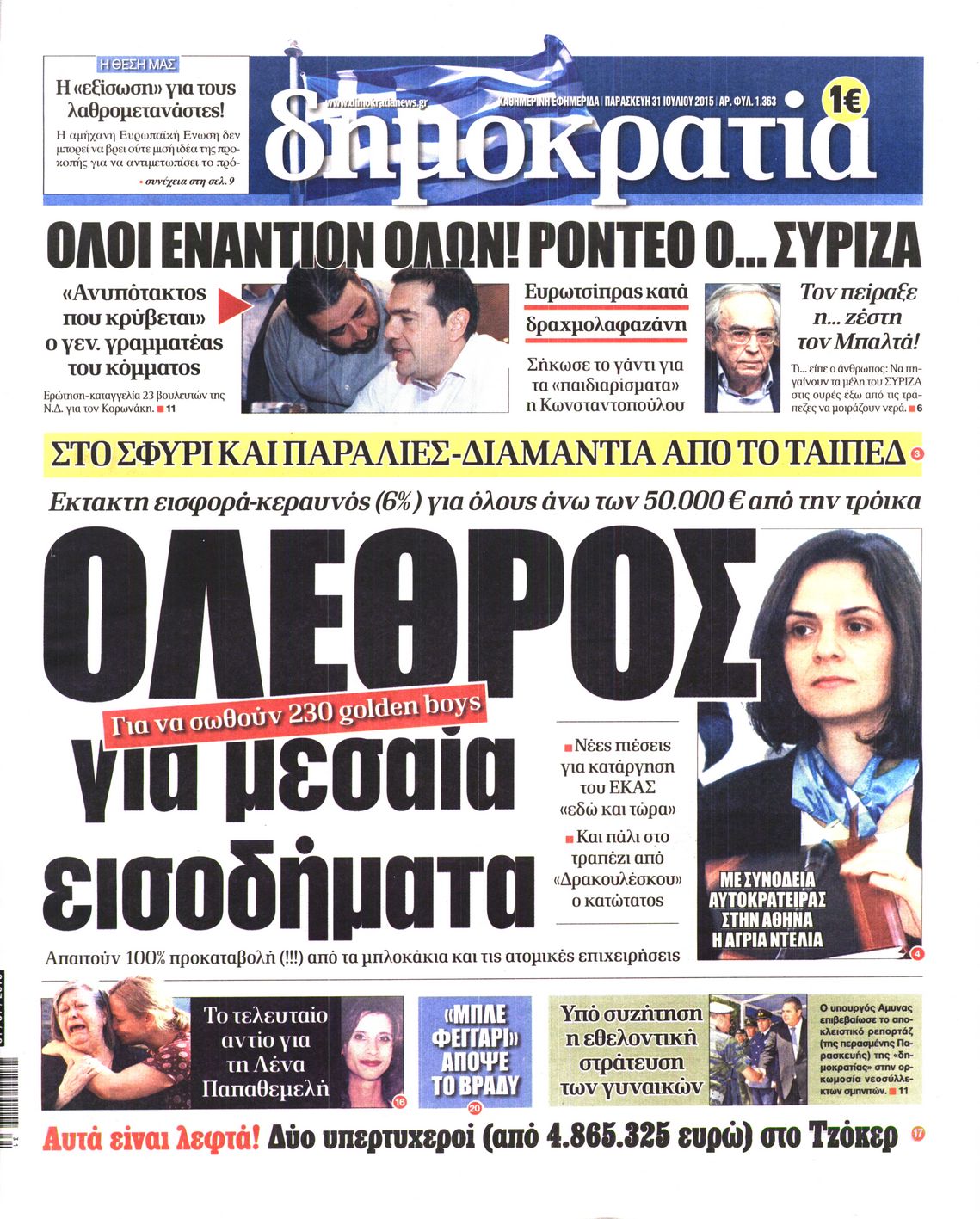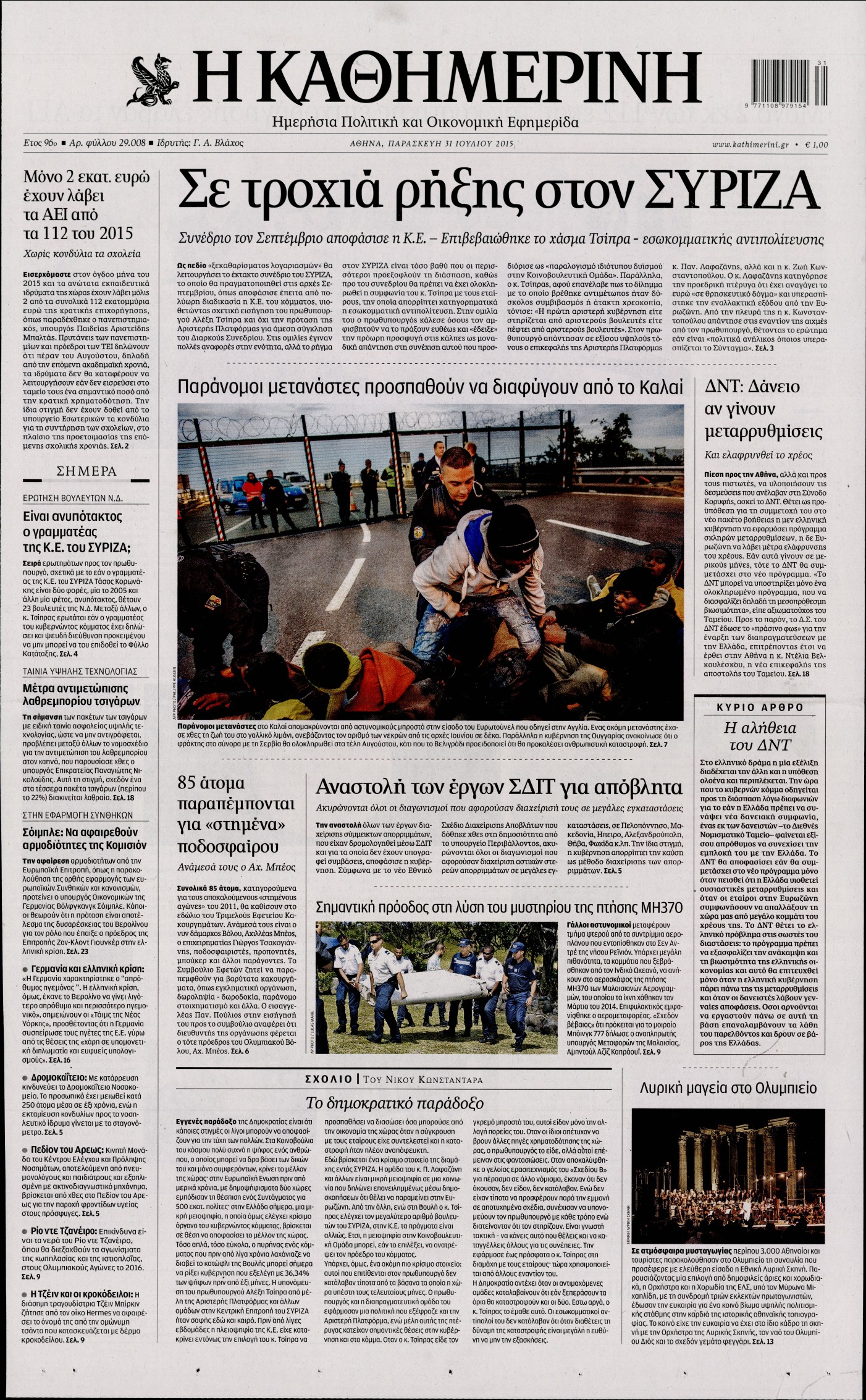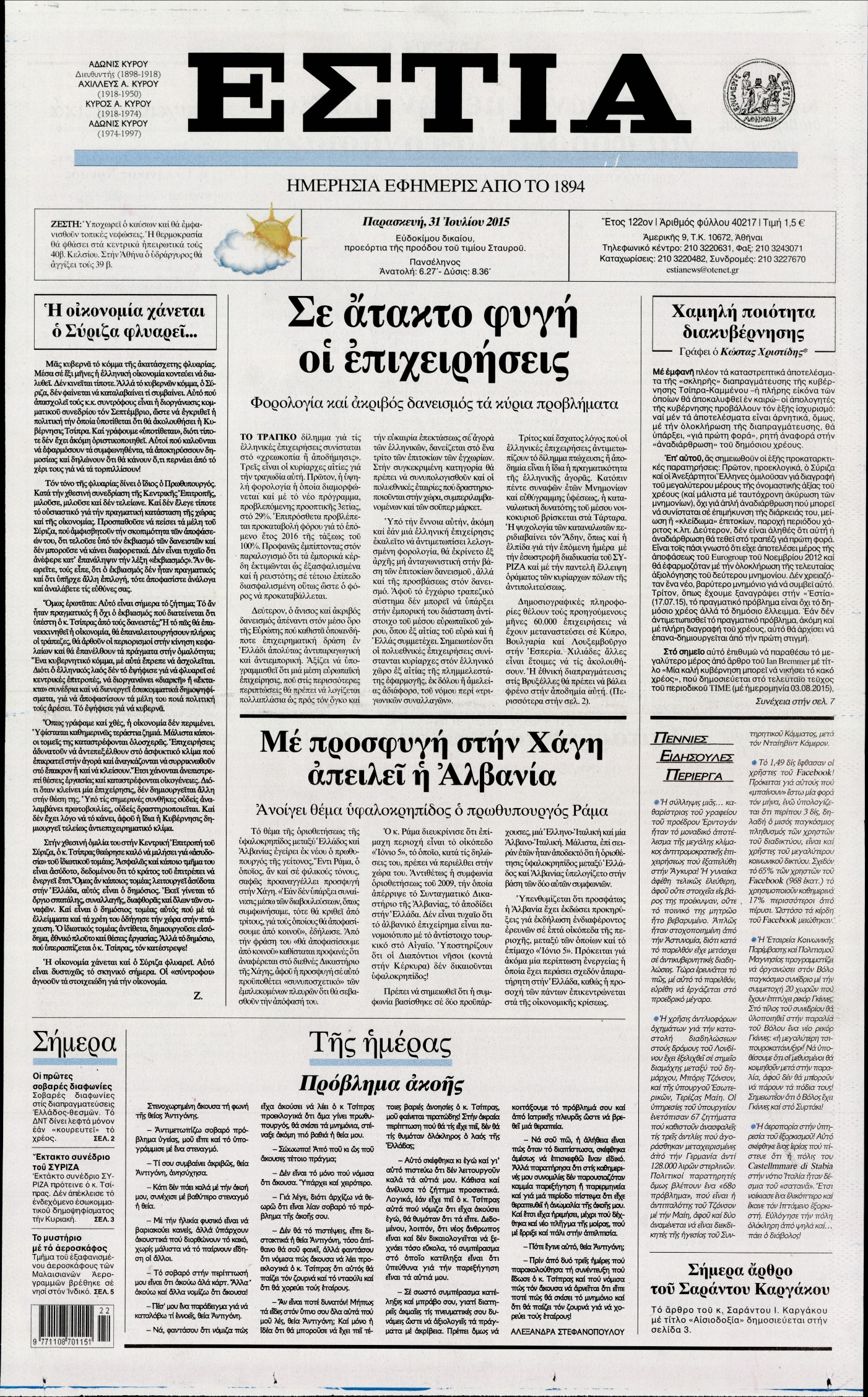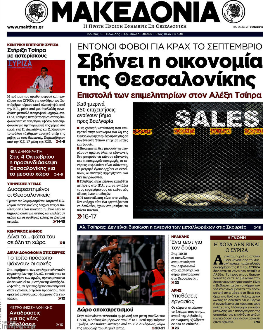 Οι πολιτικές εφημερίδες 31/7/2015 Enikos Newsroom 07:39, Παρασκευή 31 Ιουλίου 2015 Media Διαβάστε τα σημερινά πρωτοσέλιδα των πολιτικών εφημερίδων. ΕΦΗΜΕΡΙΔΕΣ ΠΟΛΙΤΙΚΕΣ ΕΦΗΜΕΡΙΔΕΣ ΠΡΩΤΟΣΕΛΙΔΑ Μοιράσου το: σχολίασε κι εσύ (0 σχόλια) Ακολουθήστε το enikos.gr στο Google News και μάθετε πρώτοι όλες τις ειδήσεις Δείτε όλες τις τελευταίες ειδήσεις από την Ελλάδα και τον Κόσμο στο enikos.gr Ειδήσεις Ροή Ειδήσεων 2 ώρες πριν Υπόθεση Έπσταϊν: Το Υπουργείο Δικαιοσύνης δημοσιοποίησε μια σειρά από εξαιρετικά επεξεργασμένα αρχεία – «Λείπουν τα πιο σημαντικά έγγραφα», λένε οι Δημοκρατικοί 1 ώρα πριν Ο «χάρτης» με τις αυξήσεις και τις φοροελαφρύνσεις του 2026 – Ποιοι και πόσα κερδίζουν 11 ώρες πριν Χριστούγεννα στα μπλόκα: Επιμένουν στις κινητοποιήσεις τους οι αγρότες – Ανοίγουν τα διόδια το Σαββατοκύριακο 2 ώρες πριν ΟΝΕΧ – MEGATUGS: Ξεκίνησε η ναυπήγηση ρυμουλκών στην Ελλάδα – Προθάλαμος πολεμικών πλοίων – Δείτε φωτογραφίες και βίντεο 2 ώρες πριν Καιρός: Αλλαγή σκηνικού σήμερα με βροχές και πτώση της θερμοκρασίας – Οι προβλέψεις των μετεωρολόγων για τα Χριστούγεννα 4 ώρες πριν Αυγά: Πόσα μπορείτε να τρώτε την ημέρα με ασφάλεια για μέγιστη πρόσληψη πρωτεΐνης 4 ώρες πριν Οπτική ψευδαίσθηση: Μόνο αν είσαι ο Σέρλοκ Χολμς θα βρεις τον αριθμό «87» σε 7 δευτερόλεπτα 2 ώρες πριν Αρχαιολόγοι ανακάλυψαν σε χωράφι απεικόνιση 600 ετών ενός Αγίου – Τα στοιχεία που δείχνουν ότι μαρτύρησε 55 λεπτά πριν Αγχώνεται για το χριστουγεννιάτικο δώρο που πήρε στην πλούσια σύντροφό του – «Φοβάμαι πως θα το βρει φθηνιάρικο, φοράει βραχιόλια Cartier» 6 λεπτά πριν Κρήτη: «Πίεση διαρκείας» με νέες αφίξεις μεταναστών – Τρεις επιχειρήσεις διάσωσης νότια του νησιού 15 λεπτά πριν Η χήνα… που πέρασαν για κλέφτη: Έσπασε την πόρτα προκαλώντας πανικό 22 λεπτά πριν Θεσσαλονίκη: 24ωρη λειτουργία σήμερα σε μετρό και 6 λεωφορειακές γραμμές 30 λεπτά πριν «Porto Leone: Στη γειτονιά με τα κόκκινα φανάρια» – Ο Χρόνης αποκαλύπτει στην Αλεξάνδρα το μυστικό για το παιδί της Λένας 38 λεπτά πριν Νέες αιτήσεις για ίδρυση μη κρατικών πανεπιστημίων στο πρώτο δίμηνο του 2026 – Τι είπε η Ζαχαράκη ENIKOS NETWORK Είστε μόνιμα απρόσεκτοι; 3 σημάδια που δείχνουν ότι μπορεί να είναι σύμπτωμα πάθησης Πόσα κιλά παίρνουμε πραγματικά τα Χριστούγεννα, σύμφωνα με την επιστήμη – Πώς να το αποτρέψουμε; Mega χριστουγεννιάτικη φορολοταρία: «Κλείδωσε» η ημερομηνία για την κλήρωση – Ερωτήσεις και απαντήσεις Αναστολή μέτρων αναγκαστικής εκτέλεσης για κτηνοτρόφους που πλήττονται από την ευλογιά των αιγοπροβάτων Χαρτογραφώντας το «σημείο χωρίς επιστροφή»: Για πρώτη φορά αποκαλύπτεται με λεπτομέρεια το ακανθώδες όριο της ατμόσφαιρας τ... Η Google καταργεί τη λειτουργία «dark web report» – Πώς θα μπορούν οι χρήστες να διαγράφουν τα δεδομένα τους περισσότερα 09:30 , Σάββατο 20 Δεκεμβρίου 2025 «Porto Leone: Στη γειτονιά με τα κόκκινα φανάρια» – Ο Χρόνης αποκαλύπτει στην Αλεξάνδρα το μυστικό για το παιδί της Λένας Η μεγάλη δραματική σειρά του Apha «Porto Leone: Στη γειτονιά με τα κόκκινα φανάρια» μας μεταφέ... 08:14 , Σάββατο 20 Δεκεμβρίου 2025 Τρομεροί γονείς: Η Μαρία Καβογιάννη εισβάλλει στο σπίτι της οικογένειας Στεφανίδη Όσα θα δούμε στο νέο διπλό επεισόδιο της σειράς «Τρομεροί γονείς», σήμερα Σάββατο 20 Δεκεμβρίο... 05:48 , Σάββατο 20 Δεκεμβρίου 2025 Οι οικονομικές εφημερίδες 20/12/2025 Διαβάστε τα πρωτοσέλιδα από τις οικονομικές εφημερίδες, σήμερα 20/12/2025. 05:43 , Σάββατο 20 Δεκεμβρίου 2025 Οι αθλητικές εφημερίδες 20/12/2025 Δι