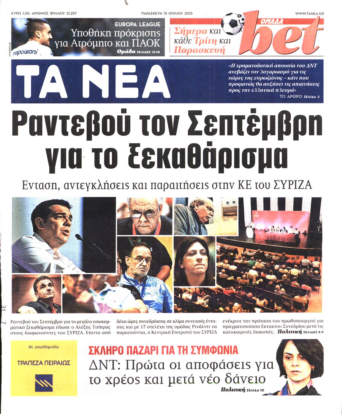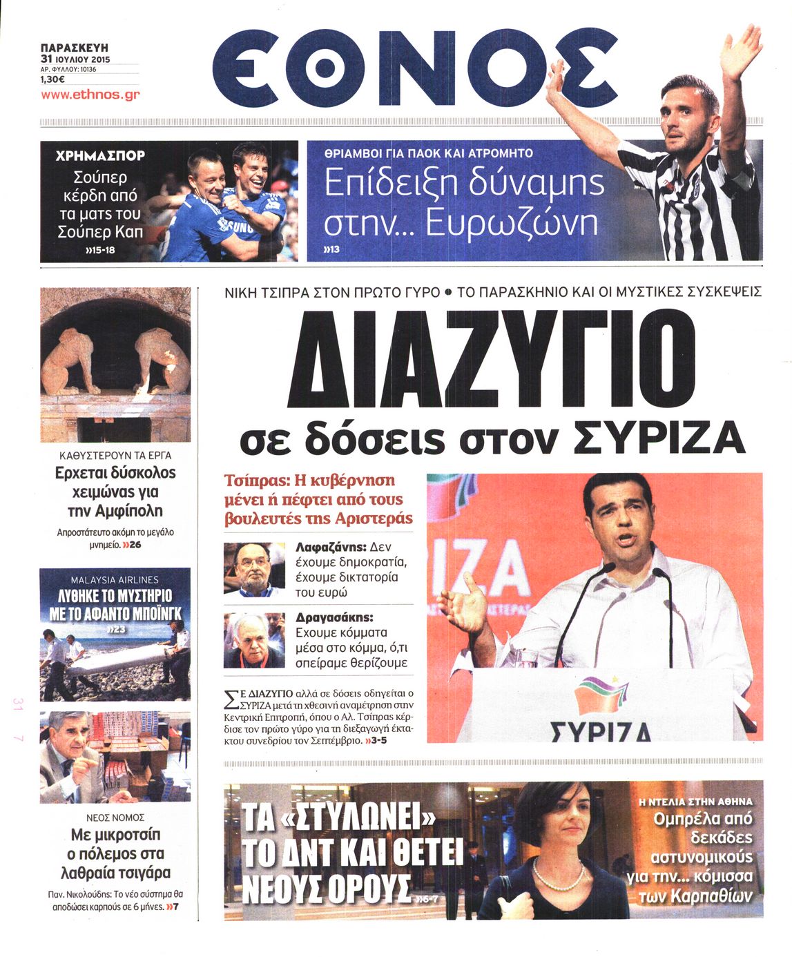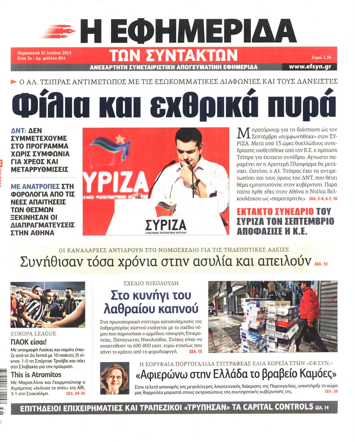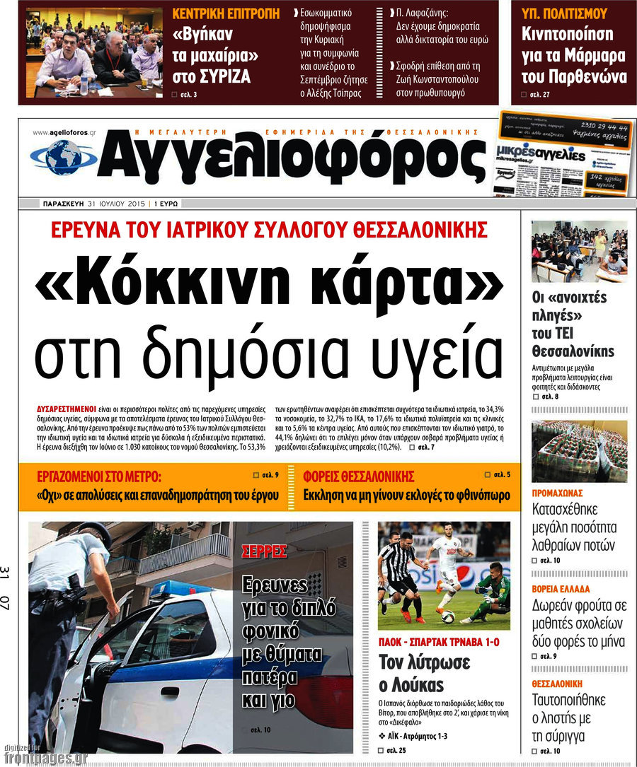 Οι πολιτικές εφημερίδες 31/7/2015 Enikos Newsroom 07:39, Παρασκευή 31 Ιουλίου 2015 Media Διαβάστε τα σημερινά πρωτοσέλιδα των πολιτικών εφημερίδων. ΕΦΗΜΕΡΙΔΕΣ ΠΟΛΙΤΙΚΕΣ ΕΦΗΜΕΡΙΔΕΣ ΠΡΩΤΟΣΕΛΙΔΑ Μοιράσου το: σχολίασε κι εσύ (0 σχόλια) Ακολουθήστε το enikos.gr στο Google News και μάθετε πρώτοι όλες τις ειδήσεις Δείτε όλες τις τελευταίες ειδήσεις από την Ελλάδα και τον Κόσμο στο enikos.gr Ειδήσεις Ροή Ειδήσεων 2 ώρες πριν Υπόθεση Έπσταϊν: Το Υπουργείο Δικαιοσύνης δημοσιοποίησε μια σειρά από εξαιρετικά επεξεργασμένα αρχεία – «Λείπουν τα πιο σημαντικά έγγραφα», λένε οι Δημοκρατικοί 1 ώρα πριν Ο «χάρτης» με τις αυξήσεις και τις φοροελαφρύνσεις του 2026 – Ποιοι και πόσα κερδίζουν 11 ώρες πριν Χριστούγεννα στα μπλόκα: Επιμένουν στις κινητοποιήσεις τους οι αγρότες – Ανοίγουν τα διόδια το Σαββατοκύριακο 2 ώρες πριν ΟΝΕΧ – MEGATUGS: Ξεκίνησε η ναυπήγηση ρυμουλκών στην Ελλάδα – Προθάλαμος πολεμικών πλοίων – Δείτε φωτογραφίες και βίντεο 2 ώρες πριν Καιρός: Αλλαγή σκηνικού σήμερα με βροχές και πτώση της θερμοκρασίας – Οι προβλέψεις των μετεωρολόγων για τα Χριστούγεννα 4 ώρες πριν Αυγά: Πόσα μπορείτε να τρώτε την ημέρα με ασφάλεια για μέγιστη πρόσληψη πρωτεΐνης 4 ώρες πριν Οπτική ψευδαίσθηση: Μόνο αν είσαι ο Σέρλοκ Χολμς θα βρεις τον αριθμό «87» σε 7 δευτερόλεπτα 2 ώρες πριν Αρχαιολόγοι ανακάλυψαν σε χωράφι απεικόνιση 600 ετών ενός Αγίου – Τα στοιχεία που δείχνουν ότι μαρτύρησε 55 λεπτά πριν Αγχώνεται για το χριστουγεννιάτικο δώρο που πήρε στην πλούσια σύντροφό του – «Φοβάμαι πως θα το βρει φθηνιάρικο, φοράει βραχιόλια Cartier» 6 λεπτά πριν Κρήτη: «Πίεση διαρκείας» με νέες αφίξεις μεταναστών – Τρεις επιχειρήσεις διάσωσης νότια του νησιού 15 λεπτά πριν Η χήνα… που πέρασαν για κλέφτη: Έσπασε την πόρτα προκαλώντας πανικό 22 λεπτά πριν Θεσσαλονίκη: 24ωρη λειτουργία σήμερα σε μετρό και 6 λεωφορειακές γραμμές 30 λεπτά πριν «Porto Leone: Στη γειτονιά με τα κόκκινα φανάρια» – Ο Χρόνης αποκαλύπτει στην Αλεξάνδρα το μυστικό για το παιδί της Λένας 38 λεπτά πριν Νέες αιτήσεις για ίδρυση μη κρατικών πανεπιστημίων στο πρώτο δίμηνο του 2026 – Τι είπε η Ζαχαράκη ENIKOS NETWORK Είστε μόνιμα απρόσεκτοι; 3 σημάδια που δείχνουν ότι μπορεί να είναι σύμπτωμα πάθησης Πόσα κιλά παίρνουμε πραγματικά τα Χριστούγεννα, σύμφωνα με την επιστήμη – Πώς να το αποτρέψουμε; Mega χριστουγεννιάτικη φορολοταρία: «Κλείδωσε» η ημερομηνία για την κλήρωση – Ερωτήσεις και απαντήσεις Αναστολή μέτρων αναγκαστικής εκτέλεσης για κτηνοτρόφους που πλήττονται από την ευλογιά των αιγοπροβάτων Χαρτογραφώντας το «σημείο χωρίς επιστροφή»: Για πρώτη φορά αποκαλύπτεται με λεπτομέρεια το ακανθώδες όριο της ατμόσφαιρας τ... Η Google καταργεί τη λειτουργία «dark web report» – Πώς θα μπορούν οι χρήστες να διαγράφουν τα δεδομένα τους περισσότερα 09:30 , Σάββατο 20 Δεκεμβρίου 2025 «Porto Leone: Στη γειτονιά με τα κόκκινα φανάρια» – Ο Χρόνης αποκαλύπτει στην Αλεξάνδρα το μυστικό για το παιδί της Λένας Η μεγάλη δραματική σειρά του Apha «Porto Leone: Στη γειτονιά με τα κόκκινα φανάρια» μας μεταφέ... 08:14 , Σάββατο 20 Δεκεμβρίου 2025 Τρομεροί γονείς: Η Μαρία Καβογιάννη εισβάλλει στο σπίτι της οικογένειας Στεφανίδη Όσα θα δούμε στο νέο διπλό επεισόδιο της σειράς «Τρομεροί γονείς», σήμερα Σάββατο 20 Δεκεμβρίο... 05:48 , Σάββατο 20 Δεκεμβρίου 2025 Οι οικονομικές εφημερίδες 20/12/2025 Διαβάστε τα πρωτοσέλιδα από τις οικονομικές εφημερίδες, σήμερα 20/12/2025. 05:43 , Σάββατο 20 Δεκεμβρίου 2025 Οι αθλητικές εφημερίδες 20/12/2025 Δι