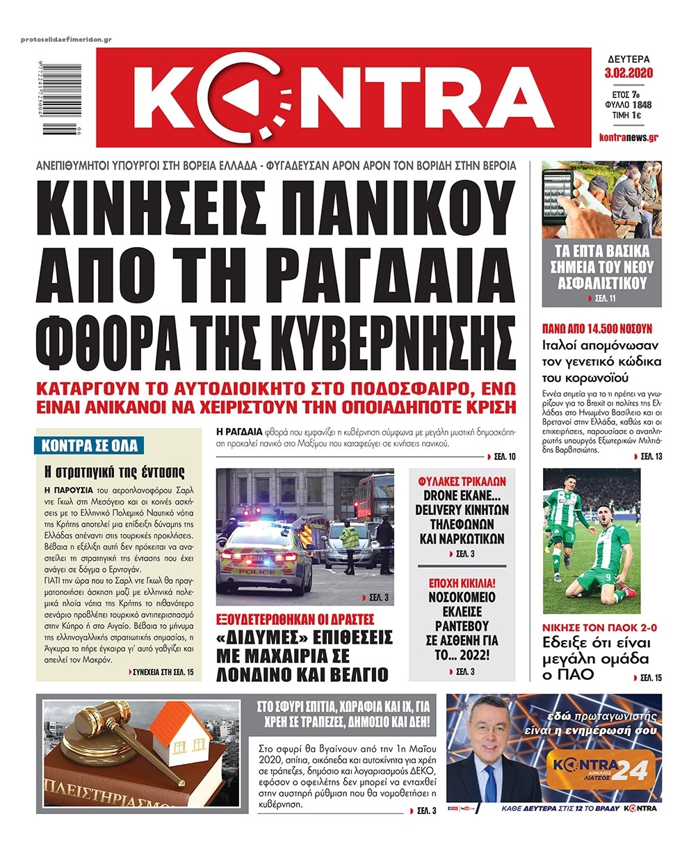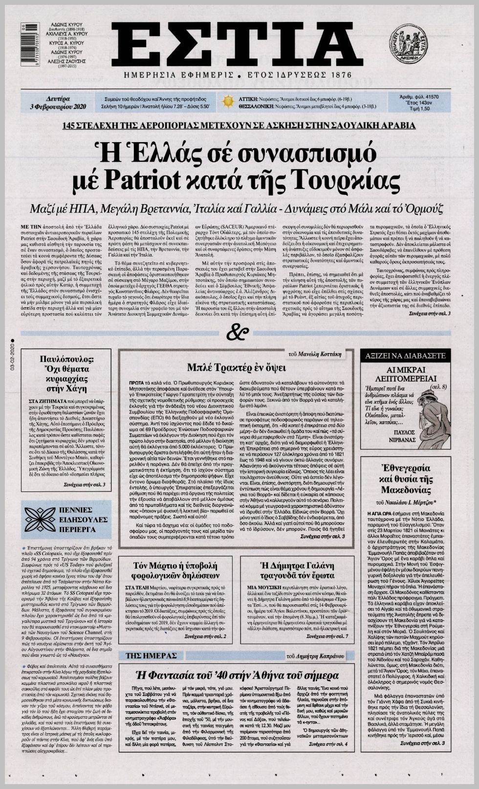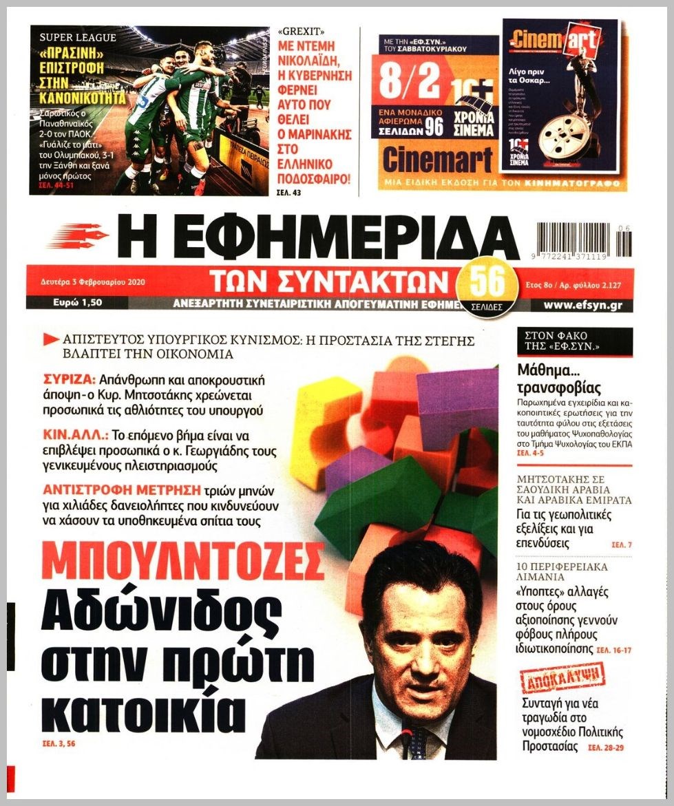 Οι πολιτικές εφημερίδες 3/2/2020 Κώστας Τεό 06:15, Δευτέρα 03 Φεβρουαρίου 2020 Media Διαβάστε τα πρωτοσέλιδα των πολιτικών εφημερίδων: ΠΟΛΙΤΙΚΕΣ ΕΦΗΜΕΡΙΔΕΣ ΠΡΩΤΟΣΕΛΙΔΑ Μοιράσου το: σχολίασε κι εσύ (0 σχόλια) Ακολουθήστε το enikos.gr στο Google News και μάθετε πρώτοι όλες τις ειδήσεις Δείτε όλες τις τελευταίες ειδήσεις από την Ελλάδα και τον Κόσμο στο enikos.gr Ειδήσεις Ροή Ειδήσεων 5 ώρες πριν Χριστούγεννα στα μπλόκα: Επιμένουν στις κινητοποιήσεις τους οι αγρότες – Ανοίγουν τα διόδια το Σαββατοκύριακο 5 ώρες πριν Ουκρανία: Η άνευ προηγουμένου επίθεση σε ρωσικό τάνκερ στη Μεσόγειο και το μήνυμα προς στον Πούτιν – Το «μακρύ χέρι» του Κιέβου 4 ώρες πριν Πούτιν: Τα μηνύματα σε Ευρώπη και ΝΑΤΟ από το μαραθώνιο «σόου» του – Η απαίτηση για «σεβασμό» και η ειρήνη «με τους όρους» της Μόσχας 5 ώρες πριν Τραμπ: Δεν αποκλείει την πιθανότητα ενός πολέμου στη Βενεζουέλα – «Ο Μαδούρο ξέρει καλύτερα από τον καθένα τι ακριβώς θέλω» 6 ώρες πριν Συνεχίζει να προκαλεί ο Μίτσκοσκι: «Για μένα το όνομα Μακεδονία είναι ιερό» 4 ώρες πριν Ανακαλύφθηκαν αρχαία χρυσά νομίσματα 2.200 ετών που απεικονίζουν τον θεό Απόλλωνα – Η άγνωστη σύνδεση με τον Φίλιππο Β΄ της Μακεδονίας 5 ώρες πριν Ύπνος: Μια κρυφή κατάσταση του εγκεφάλου πριν από τον ύπνο μπορεί να είναι το “κλειδί” για υψηλή ευφυΐα και δημιουργικότητα 6 ώρες πριν Αριθμολογία: Οι άνθρωποι που έχουν γεννηθεί αυτές τις 4 ημερομηνίες, συχνά παρεξηγούνται – «Η καλοσύνη τους κρύβει τεράστια δύναμη» 7 ώρες πριν Ξεχάστε το καθάρισμα το Σαββατοκύριακο: Ο «κανόνας των 20 λεπτών» που θα σας λύσει τα χέρια 15 λεπτά πριν Η Ελλάδα προσχωρεί στη Διεθνή Επιτροπή Αποζημιώσεων για την Ουκρανία 29 λεπτά πριν GNTM: Η Ξένια Τσίρκοβα αναδείχθηκε μεγάλη νικήτρια και πήρε τις 50.000 ευρώ – Ποιος βρέθηκε σε απόσταση αναπνοής; 44 λεπτά πριν Θεσσαλονίκη: Εξαφανίστηκε 13χρονος από χώρο φιλοξενίας ασυνόδευτων ανηλίκων στο Ωραιόκαστρο 55 λεπτά πριν Ντόναλντ Τραμπ: «Πολύ βαριά αντίποινα» στη Συρία – «Πλήττουμε πολύ δυνατά οχυρά του Ισλαμικού Κράτους» 1 ώρα πριν Εξάρχεια: Ένταση με μολότοφ, χημικά και κρότου λάμψης ENIKOS NETWORK Το ΕΚΑΒ τιμήθηκε από την Ακαδημία Αθηνών για τα 40 χρόνια προσφοράς του Έχετε πραγματικά μεγάλη καρδιά; 10 χαρακτηριστικά όσων έχουν καλοσύνη Αναστολή μέτρων αναγκαστικής εκτέλεσης για κτηνοτρόφους που πλήττονται από την ευλογιά των αιγοπροβάτων Πλήρης επάρκεια προϊόντων στις λαϊκές της Αττικής, παρά τις αγροτικές κινητοποιήσεις – Τι απαντούν οι πωλητές Χαρτογραφώντας το «σημείο χωρίς επιστροφή»: Για πρώτη φορά αποκαλύπτεται με λεπτομέρεια το ακανθώδες όριο της ατμόσφαιρας τ... Η Google καταργεί τη λειτουργία «dark web report» – Πώς θα μπορούν οι χρήστες να διαγράφουν τα δεδομένα τους περισσότερα 02:50 , Σάββατο 20 Δεκεμβρίου 2025 GNTM: Η Ξένια Τσίρκοβα αναδείχθηκε μεγάλη νικήτρια και πήρε τις 50.000 ευρώ – Ποιος βρέθηκε σε απόσταση αναπνοής; Με φαντασμαγορικό τρόπο ολοκληρώθηκε το βράδυ της Παρασκευής ο μεγάλος τελικός του GNTM, μέσα ... 22:42 , Παρασκευή 19 Δεκεμβρίου 2025 Γιώργος Γιαννόπουλος για “Το σόι σου”: “Είναι ευτυχία και ευλογία αυτή η σειρά” «Είναι ευτυχία και ευλογία η συγκυρία αυτής της σειράς», θα πει ο Γιώργος Γιαννόπουλος -ο αγαπ... 20:37 , Παρασκευή 19 Δεκεμβρίου 2025 Don’t Forget The Lyrics: Η Έλλη Κοκκίνου υποδέχεται 4 παίκτες που θα κάνουν τα πάντα για να μη χάσουν ούτε… μισή λέξη από τους στίχους Το «Don’t Forget The Lyrics» επιστρέφει απόψε, Παρασκευή 19 Δεκεμβρίου, στις 21:00 με νέο ε
